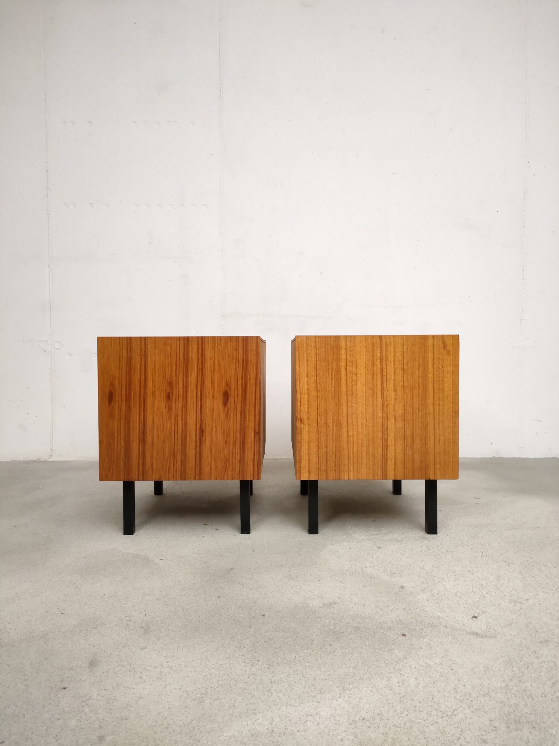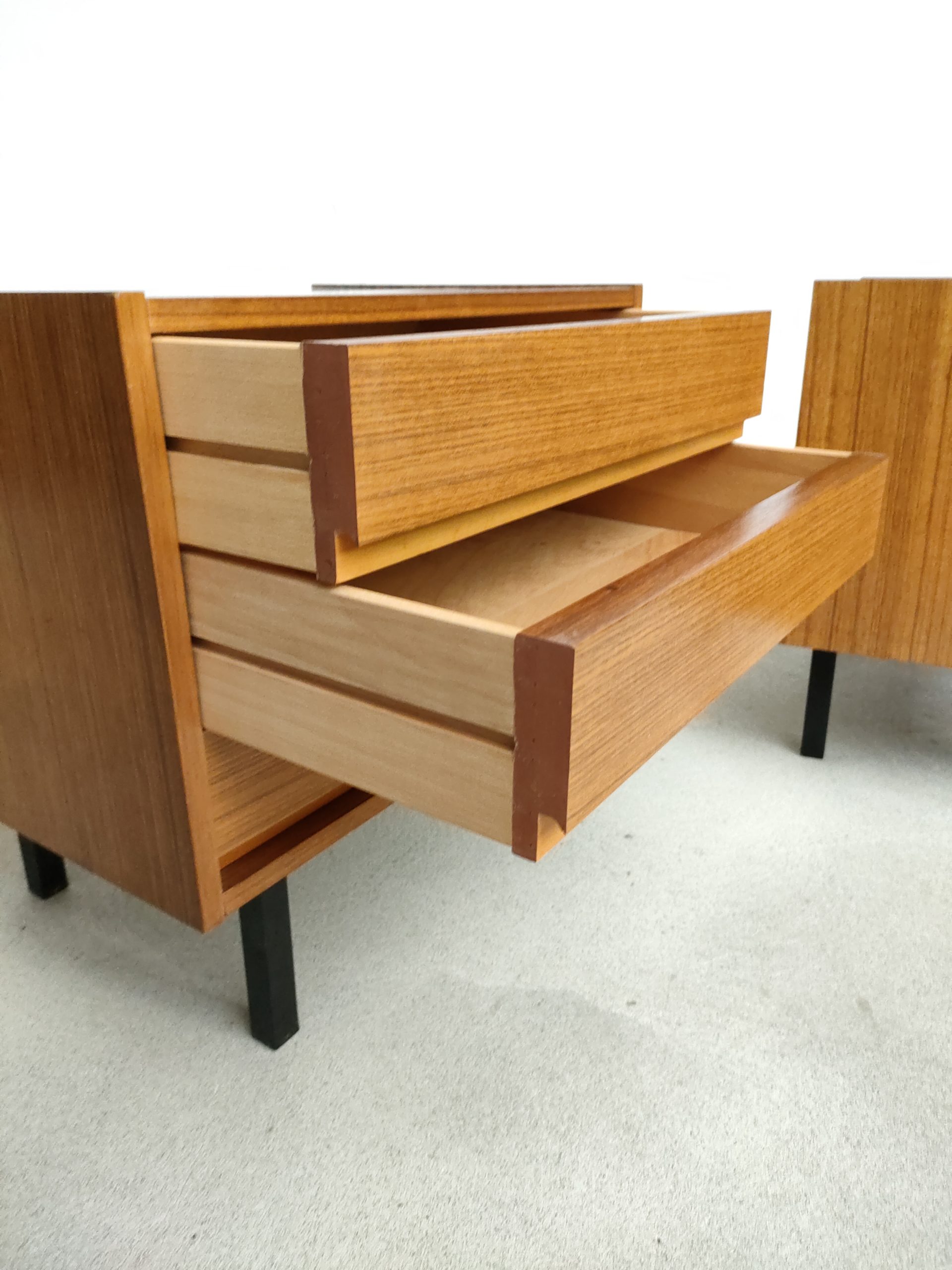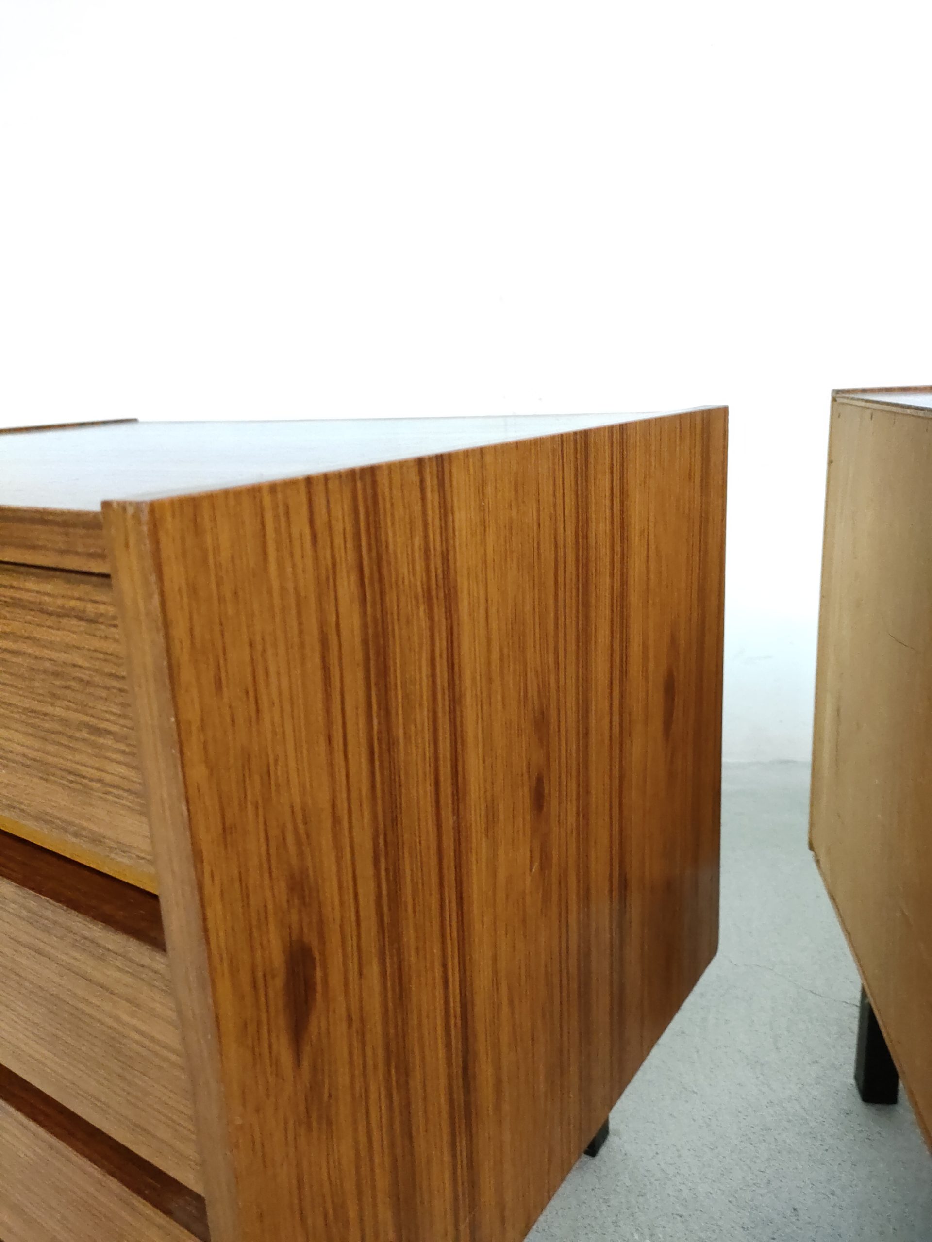 Produit venduPaire de tables de nuit vintage en bois avec pieds en métal noirs et 3 tiroirs. Quelques traces sont présentes sur le bois (voir photos). Elles sont stables et solides et très élégantes avec leurs lignes minimalistes.