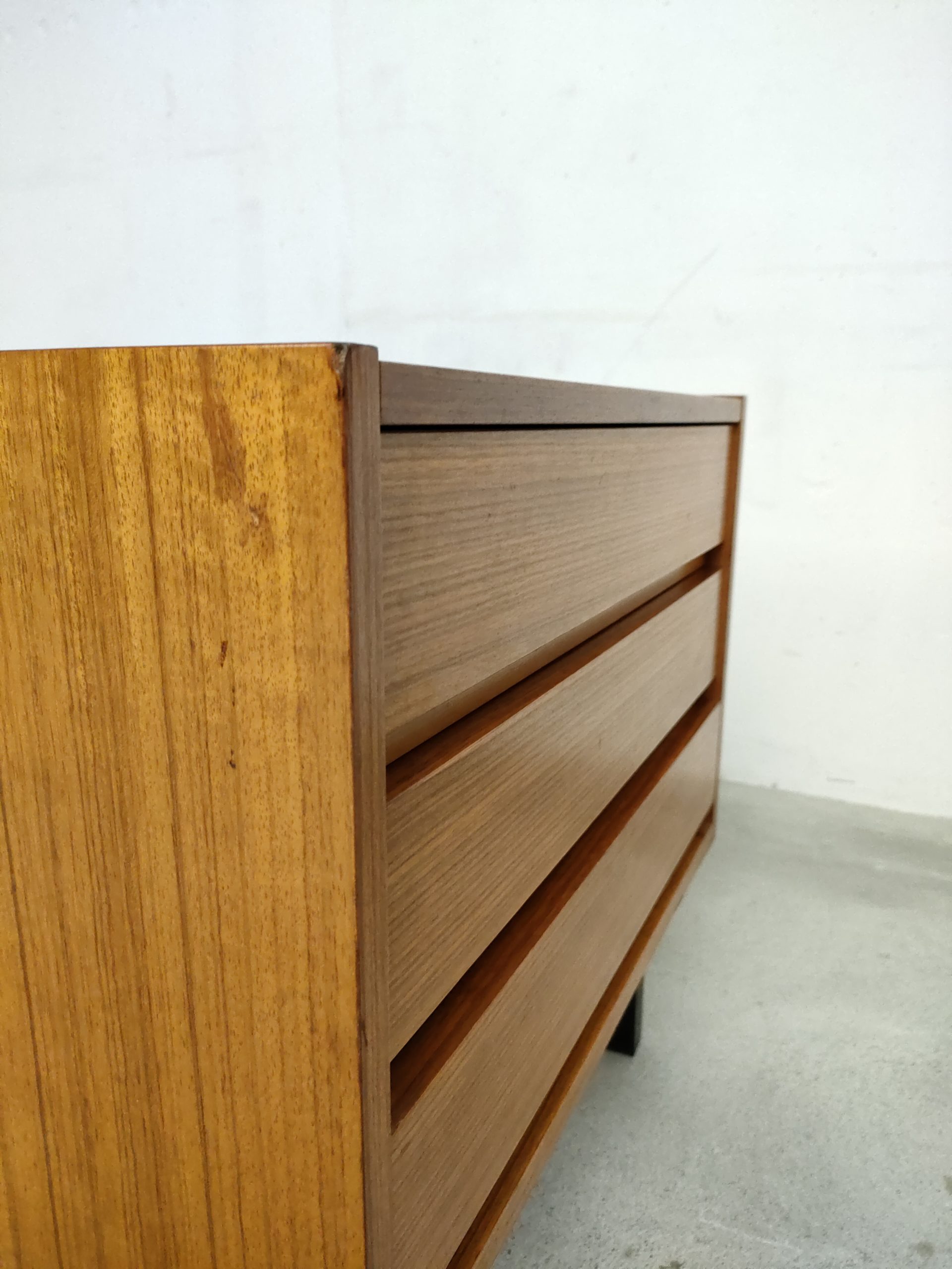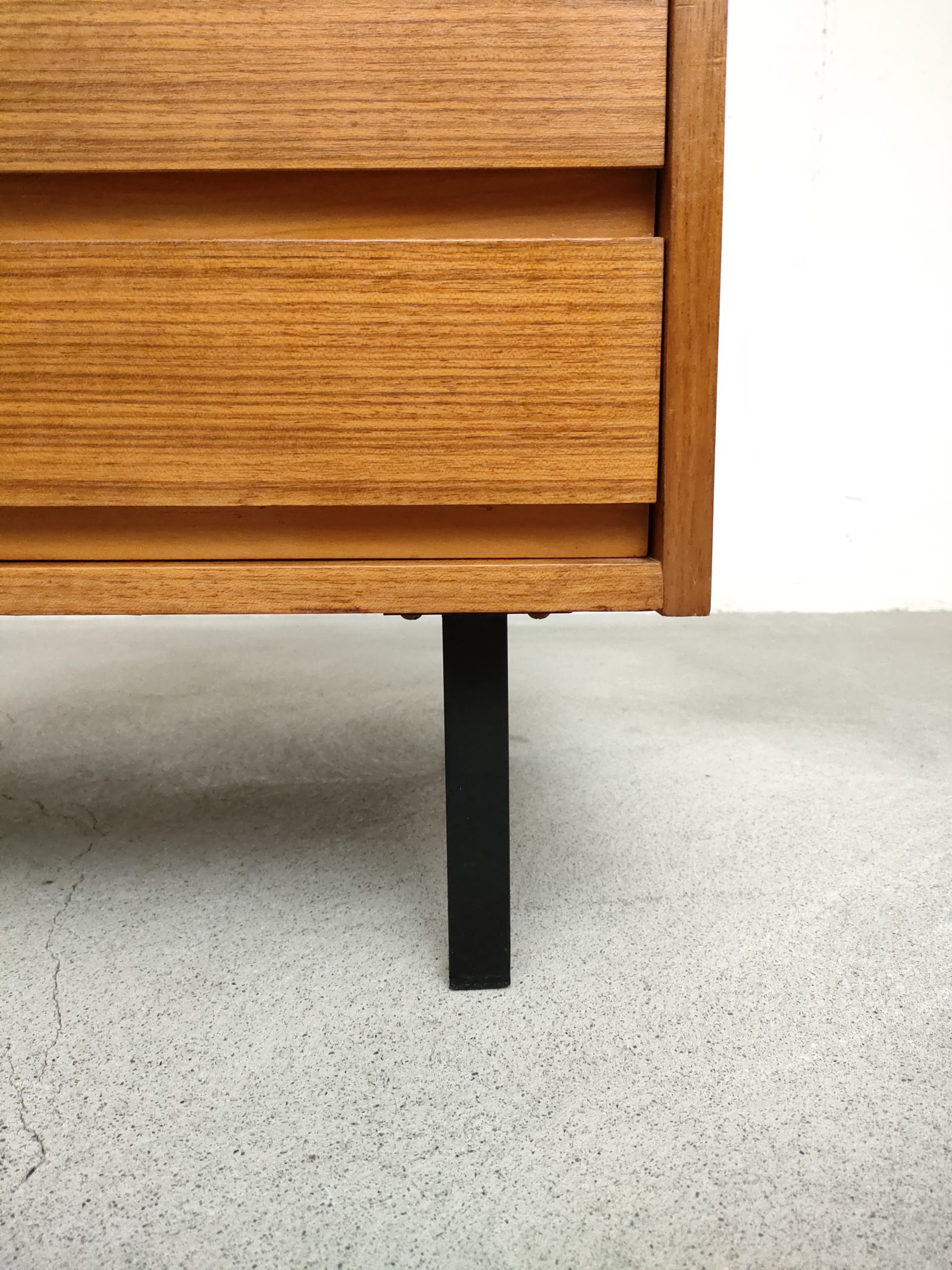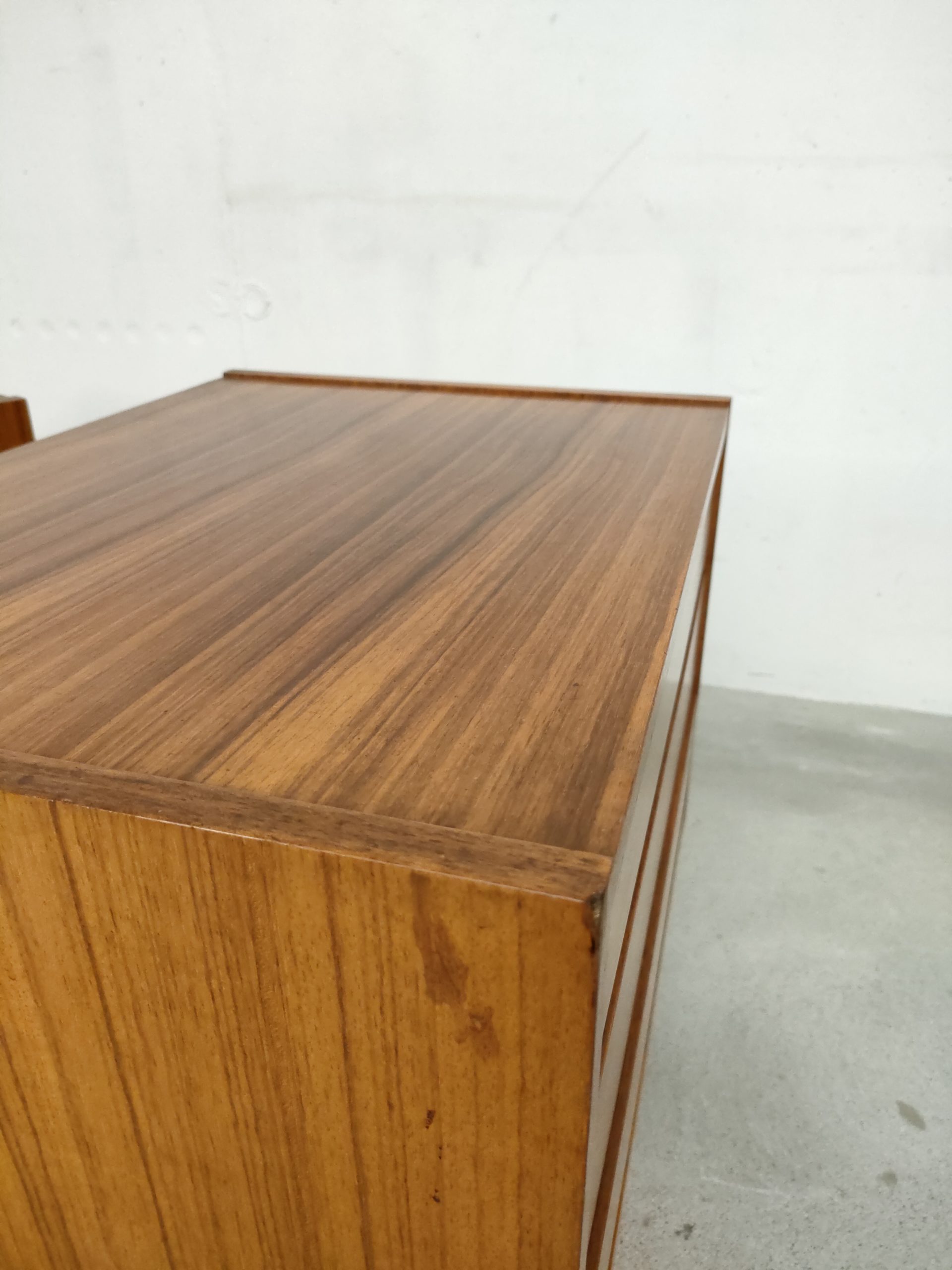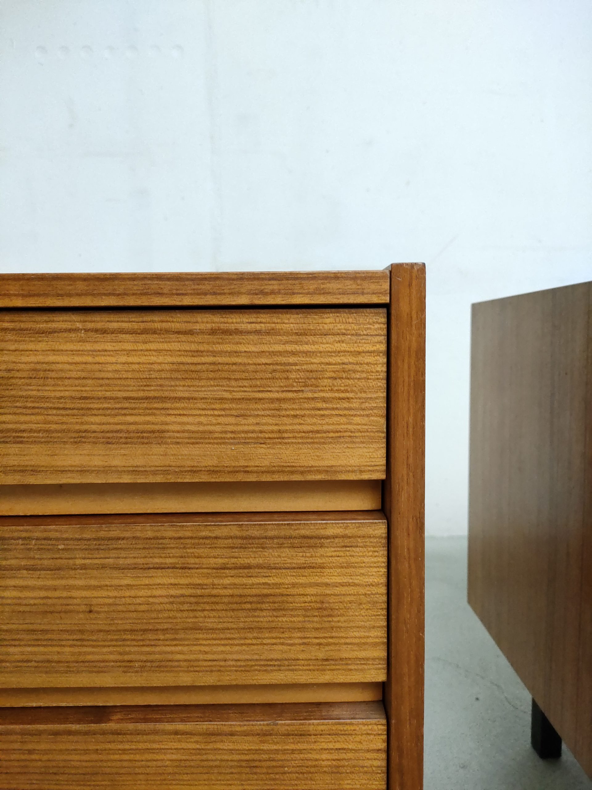 Produit venduPaire de tables de nuit vintage en bois avec pieds en métal noirs et 3 tiroirs. Quelques traces sont présentes sur le bois (voir photos). Elles sont stables et solides et très élégantes avec leurs lignes minimalistes.
