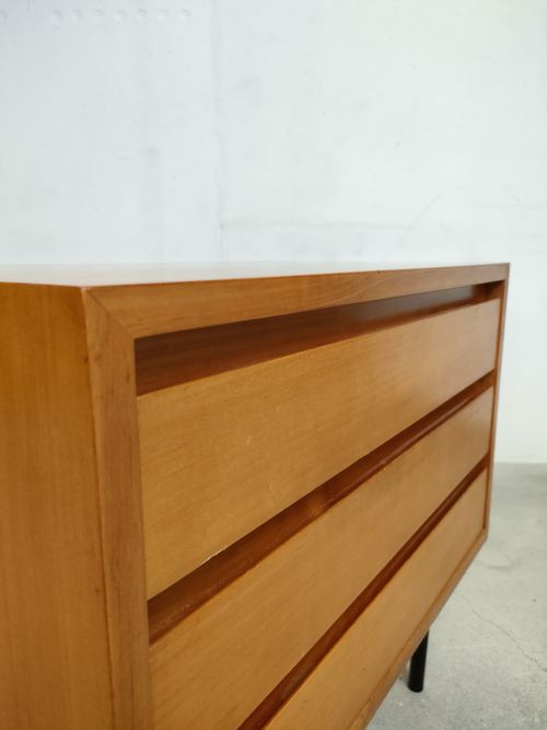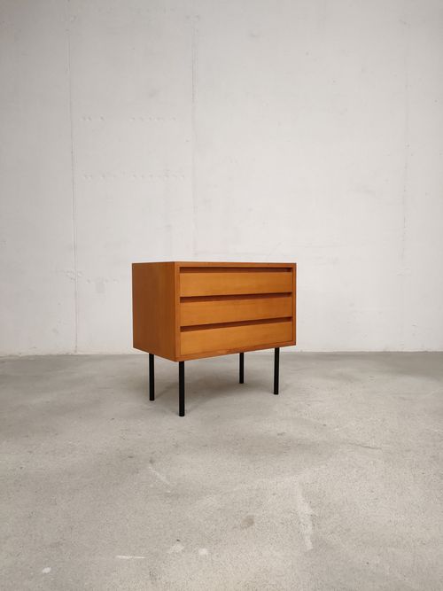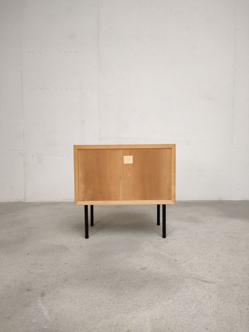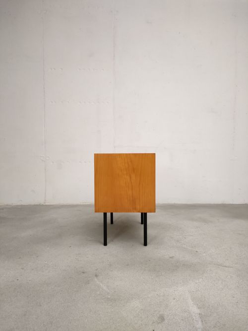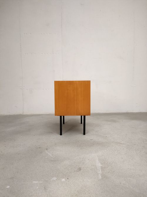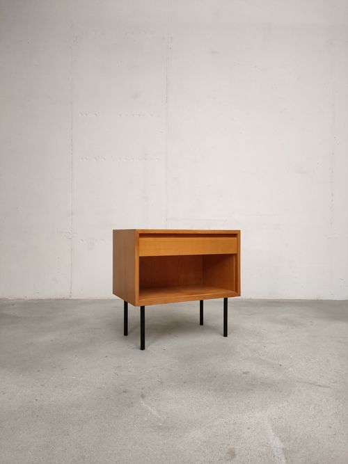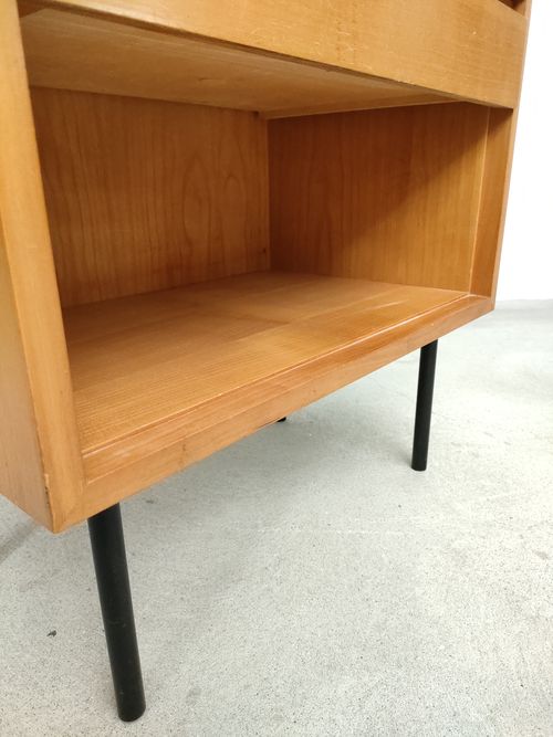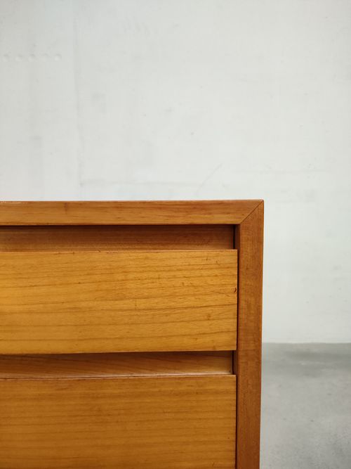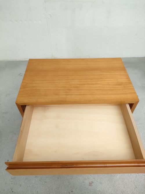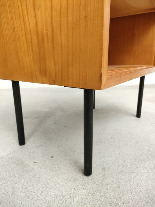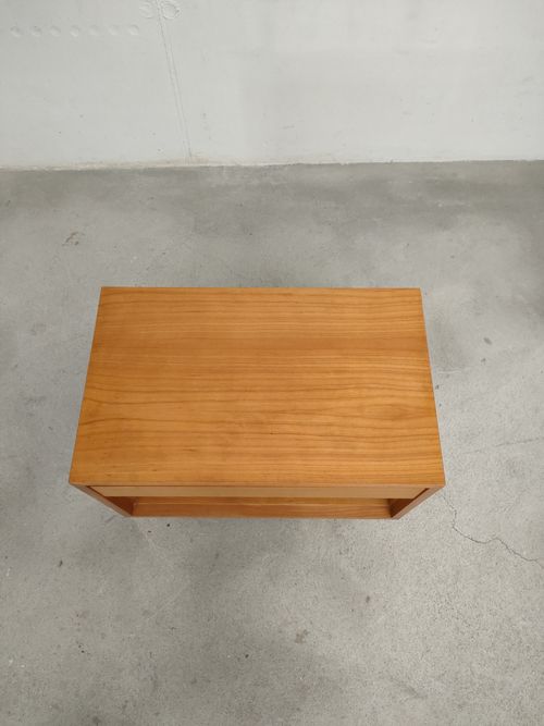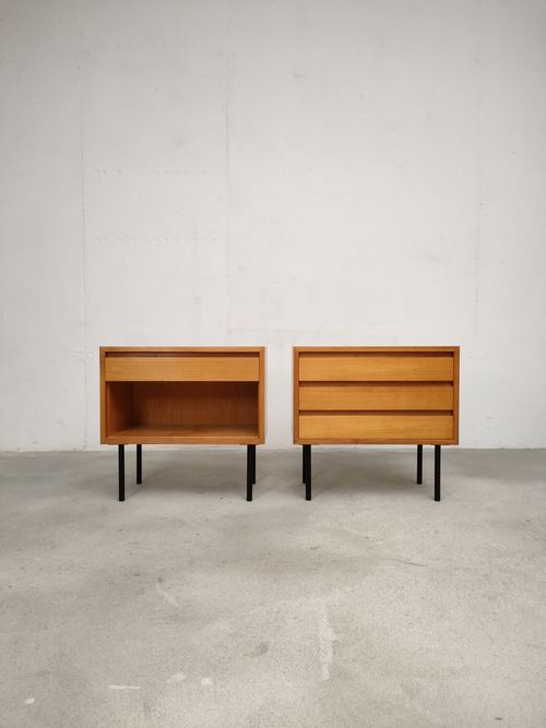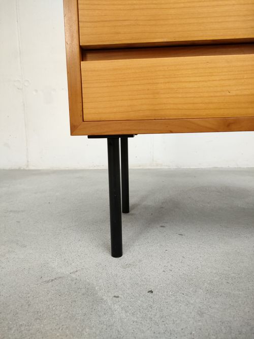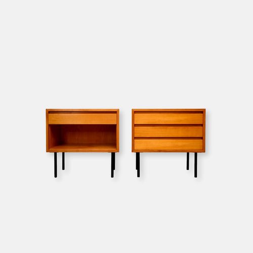 Produit venduPaire de tables de nuit en bois de cerisier dessinées dans les années 50 par le designer suisse Kurt Thut. Une est dotée de trois tiroirs, l’autre d’un tiroir et d’un espace de rangement. Très élégantes avec leurs lignes minimalistes et le piètement en métal noir. Quelques traces d’usure mais parfaitement stables et solides.