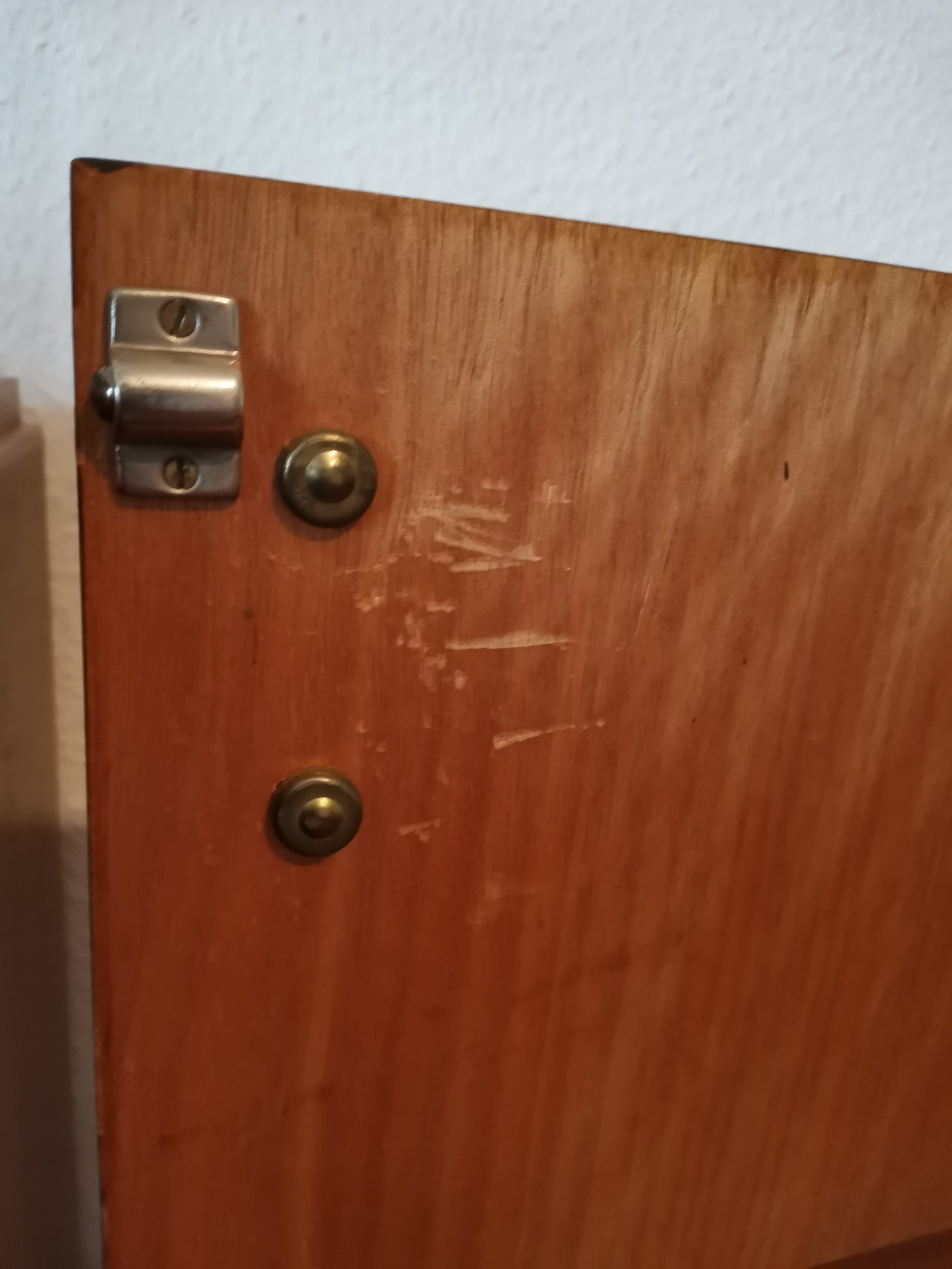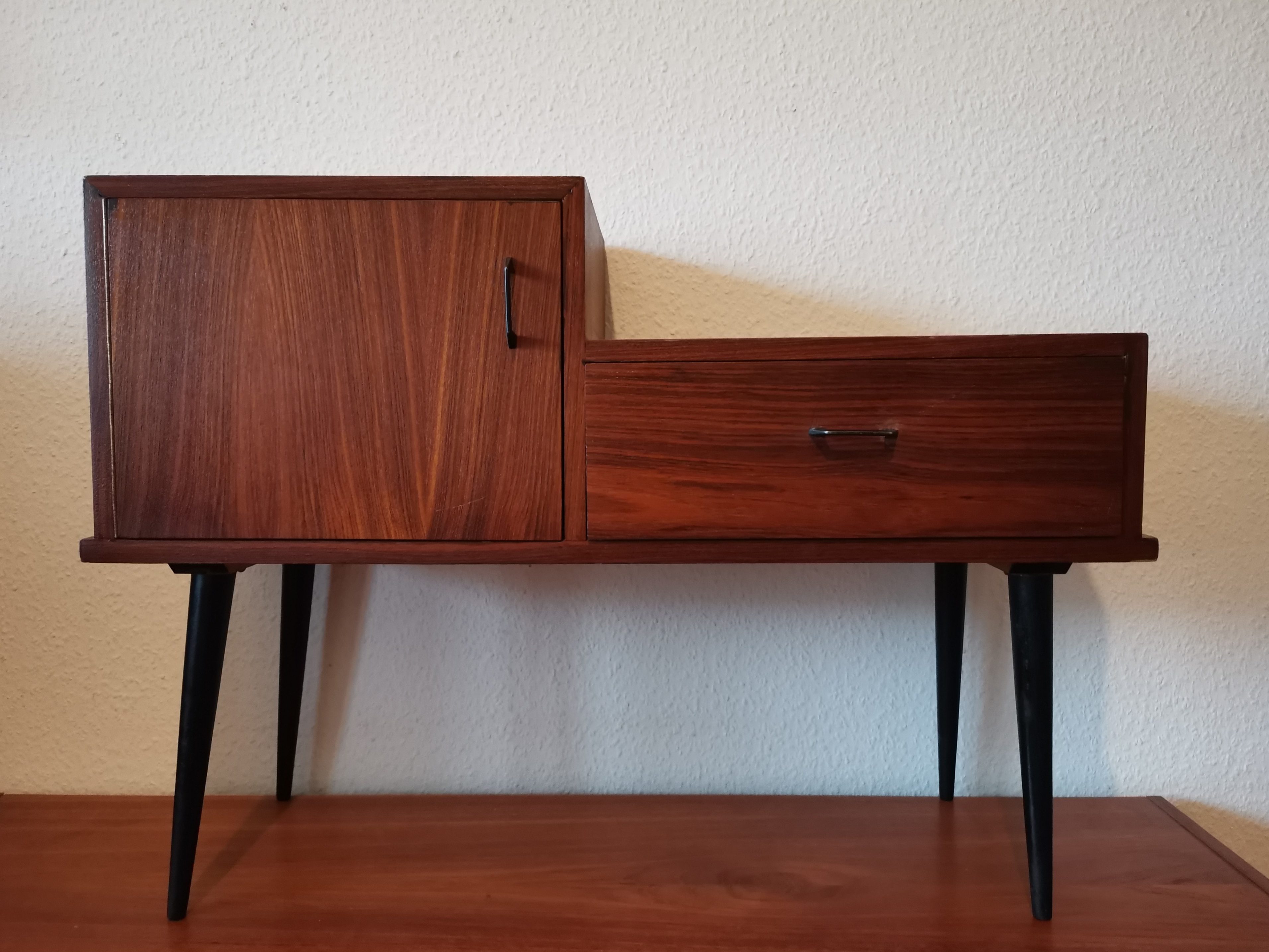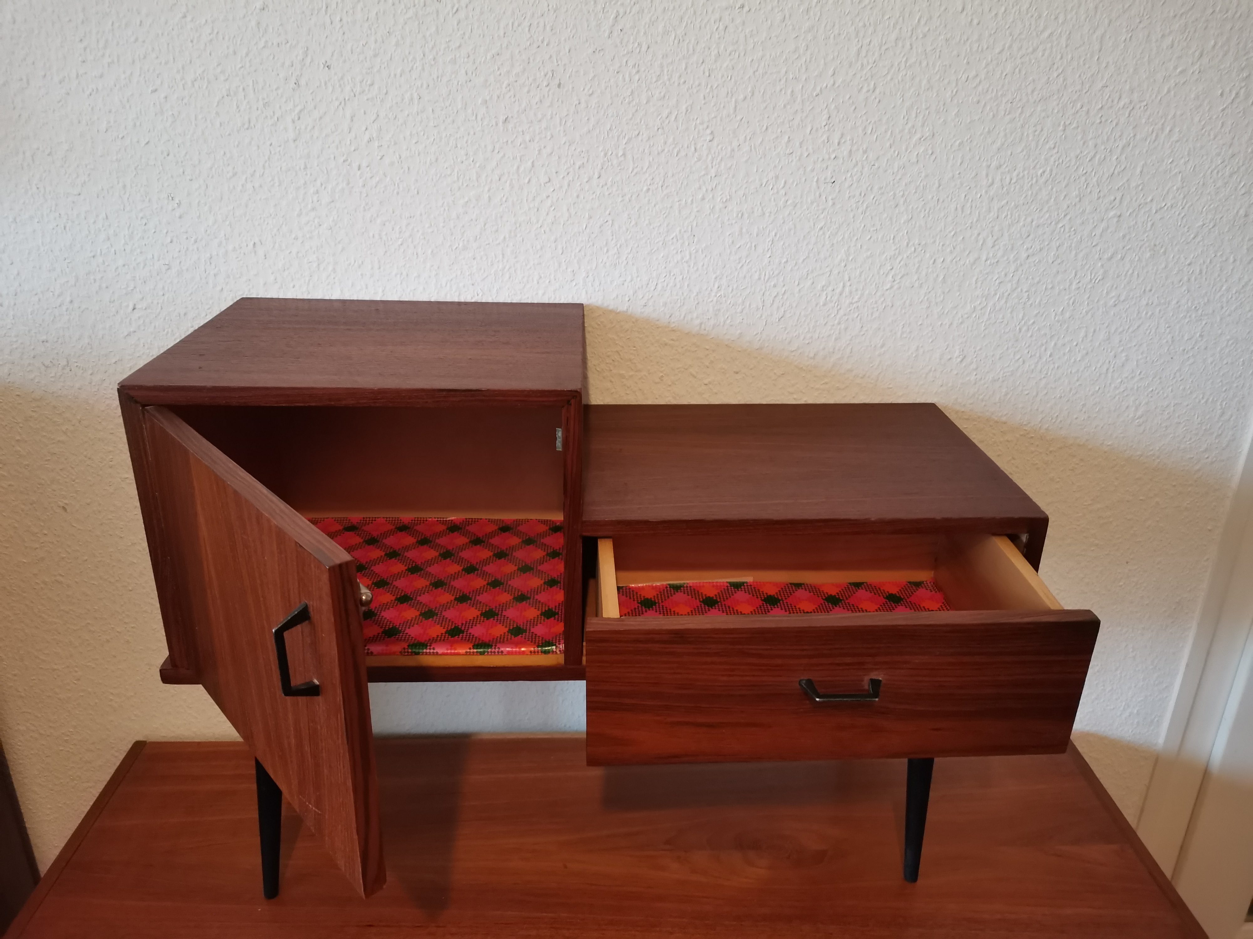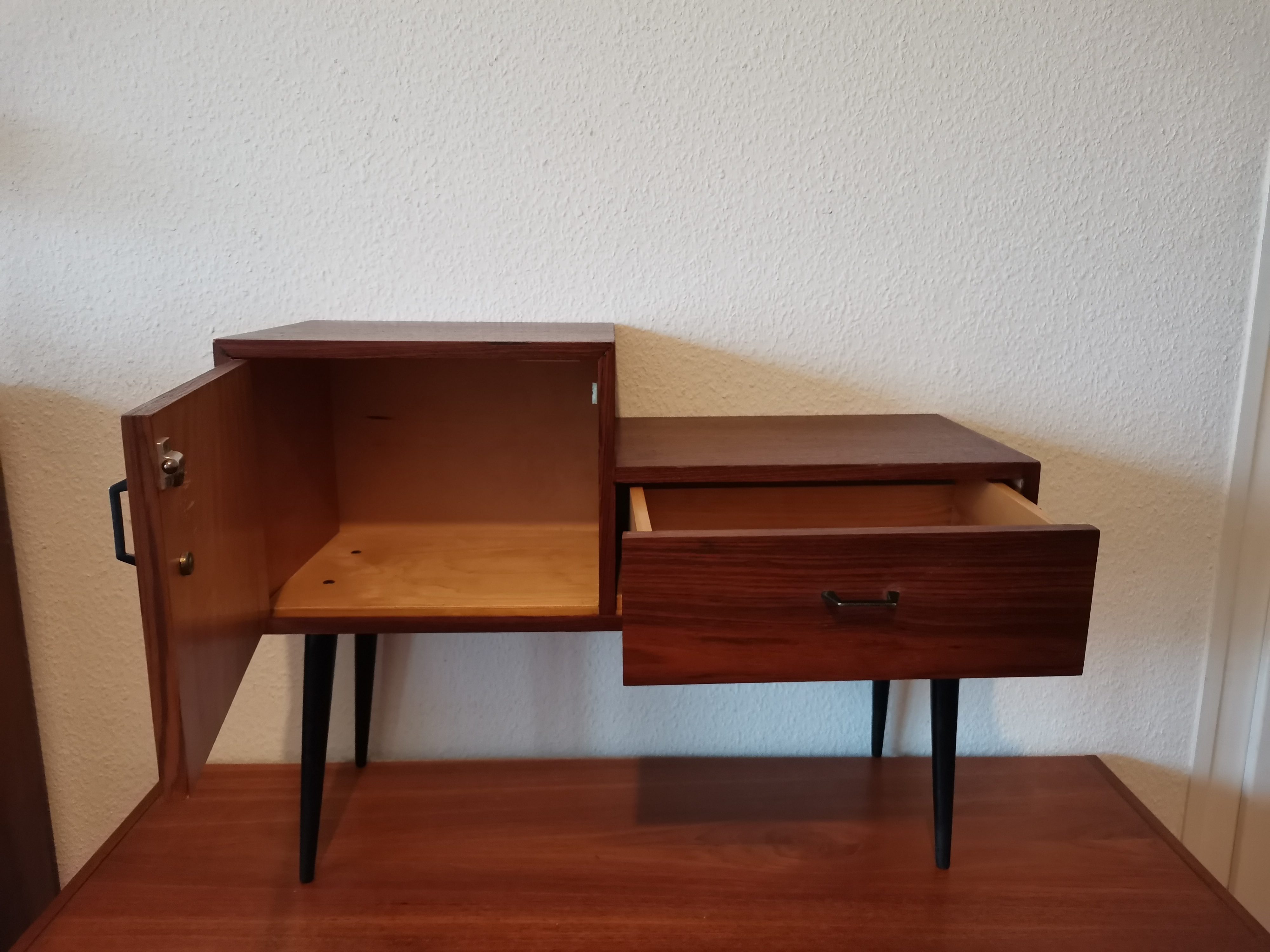Une porte à charnière et un tiroir, pieds ronds noirs en bois, poignées d’origine.
