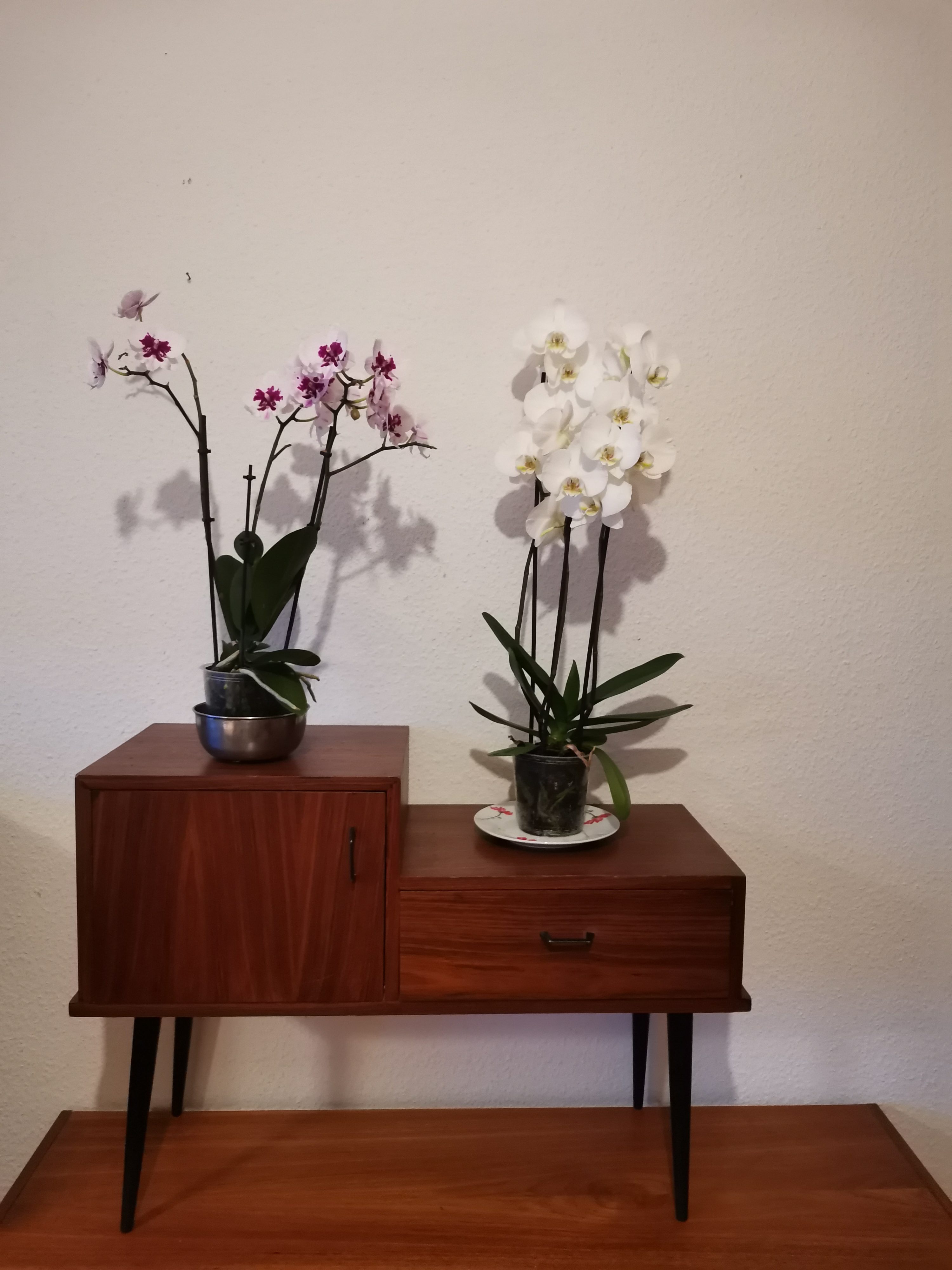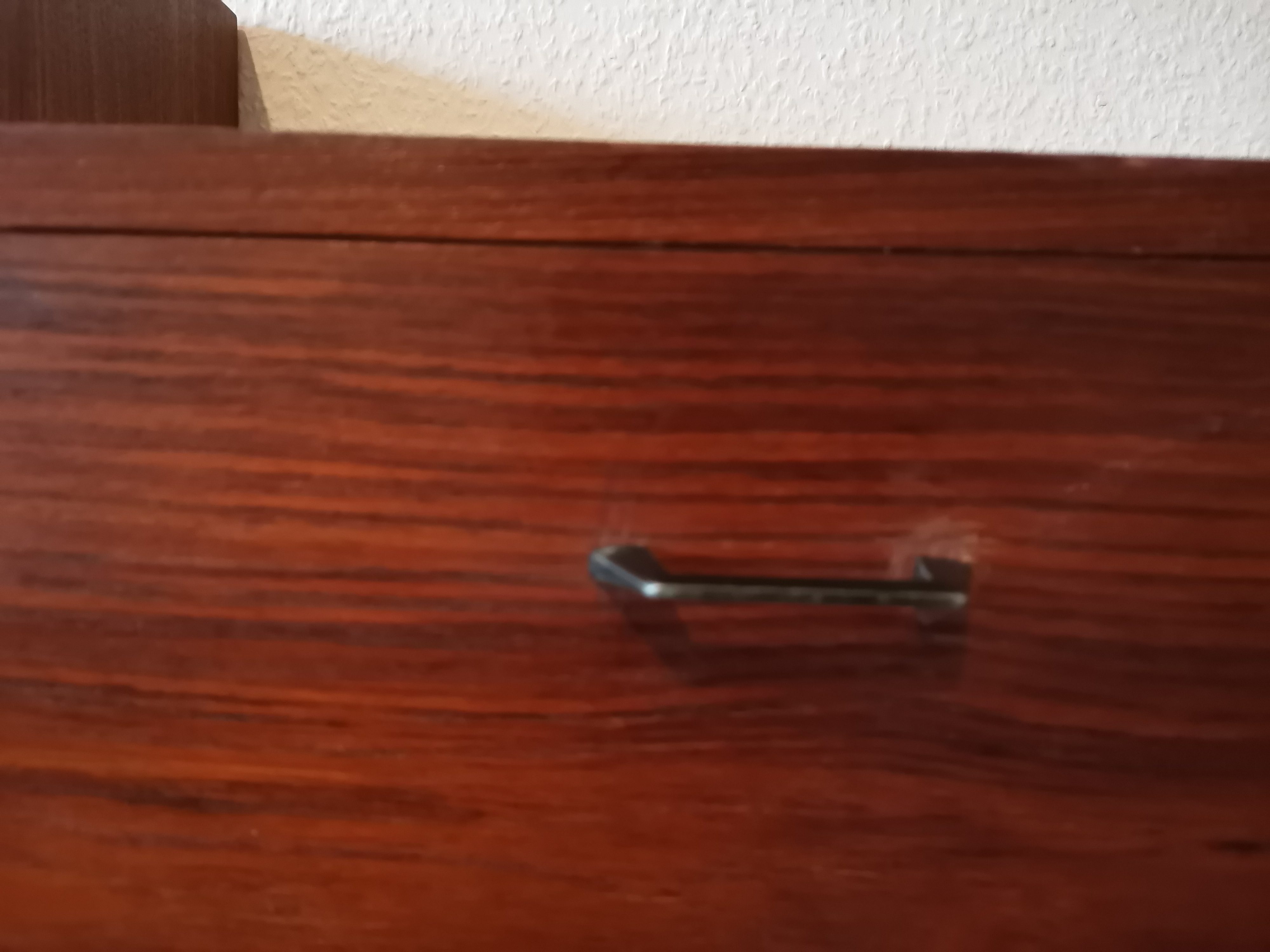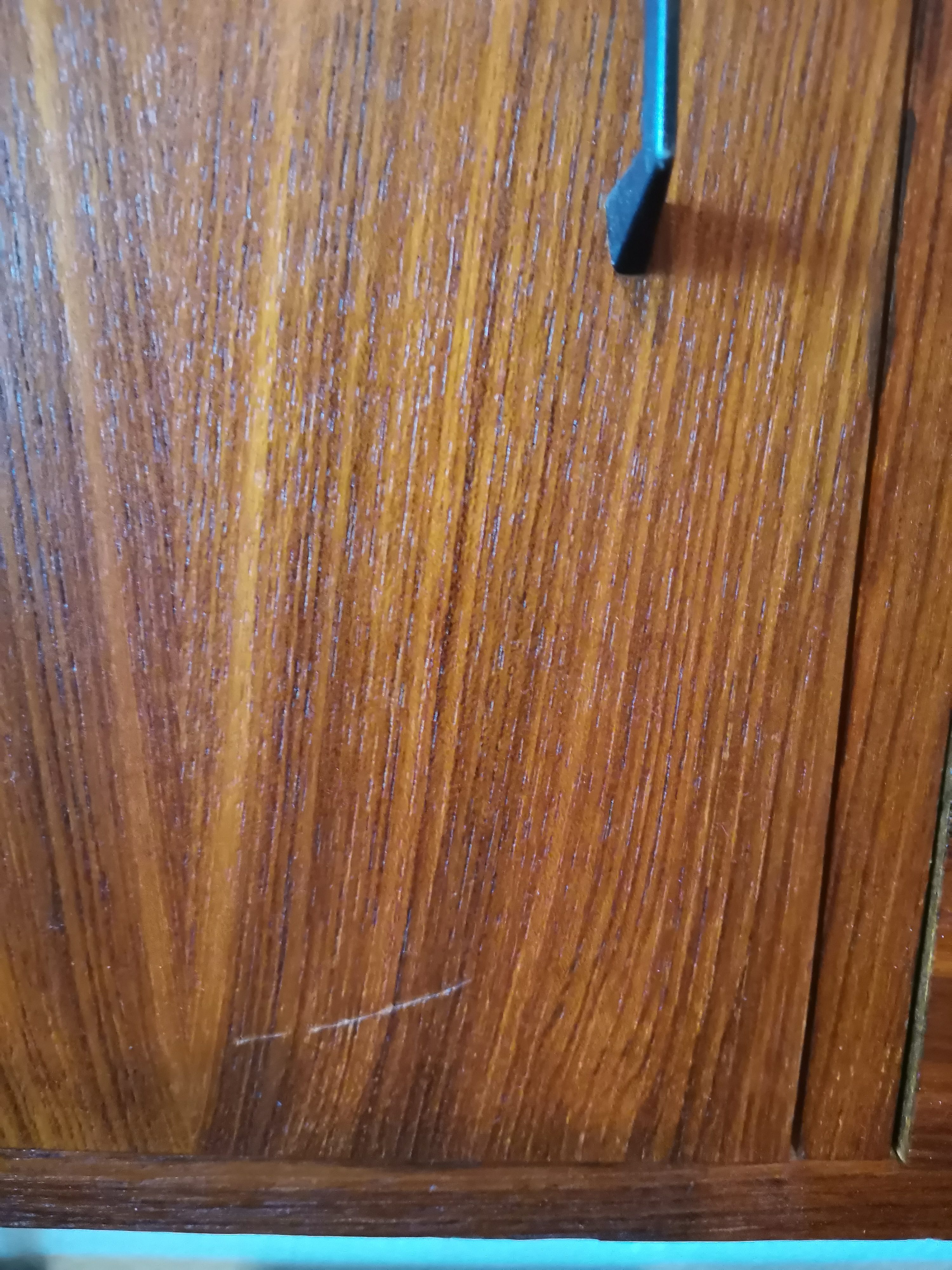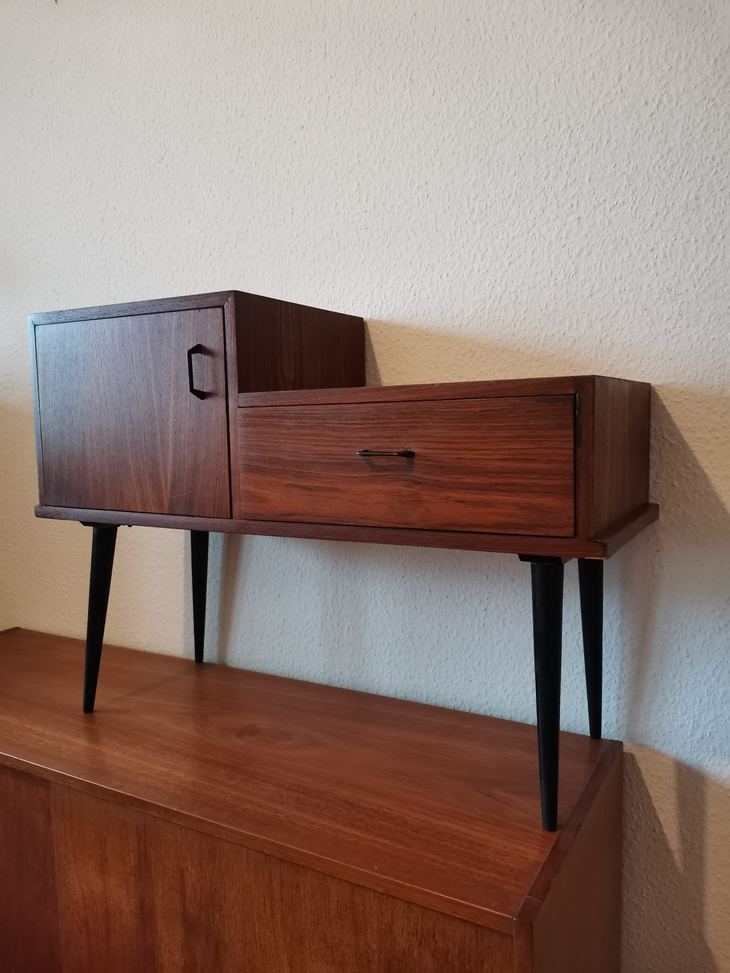 Une porte à charnière et un tiroir, pieds ronds noirs en bois, poignées d’origine.
