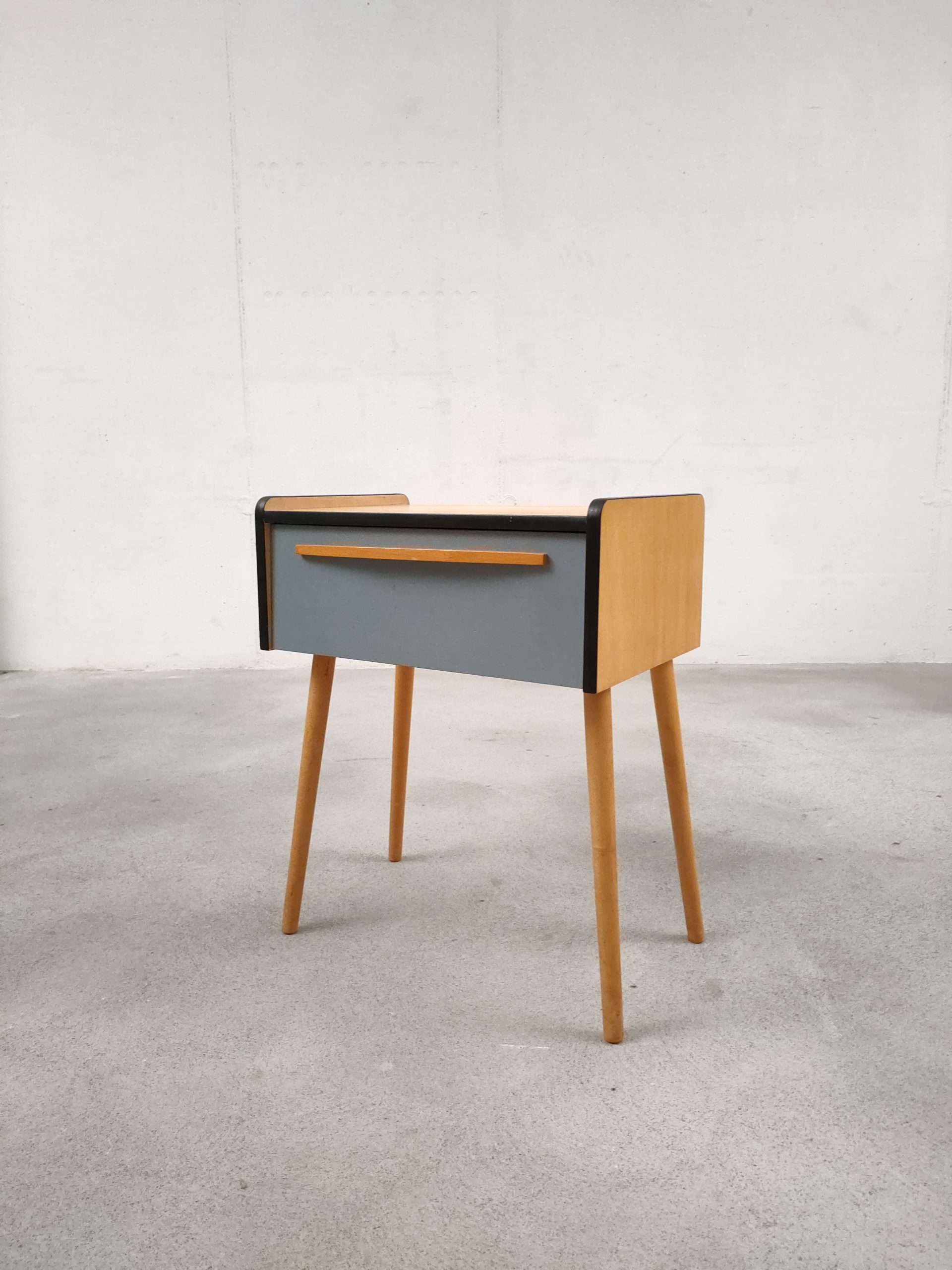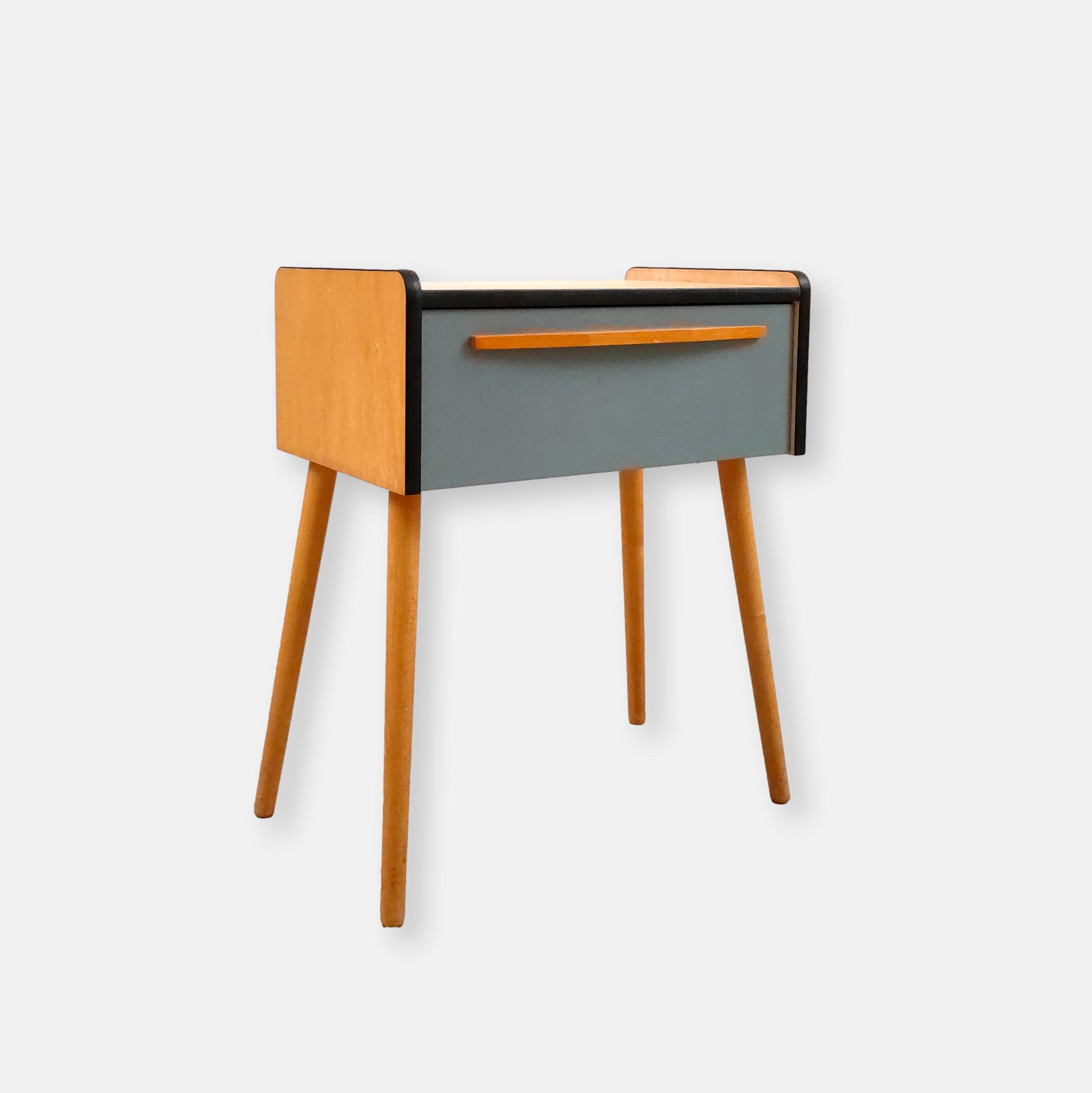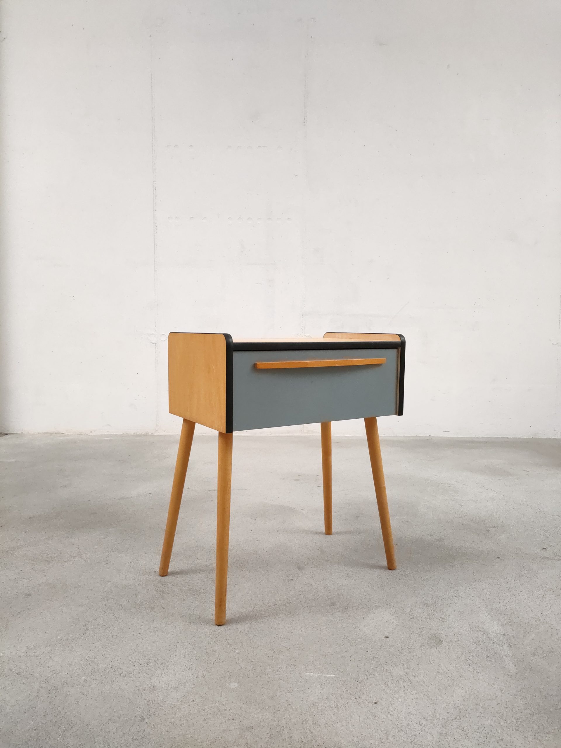 Produit venduMignon petit meuble bicolore en bois avec porte bleu clair. Peut être utilisé comme table de nuit, bout de canapé, etc.