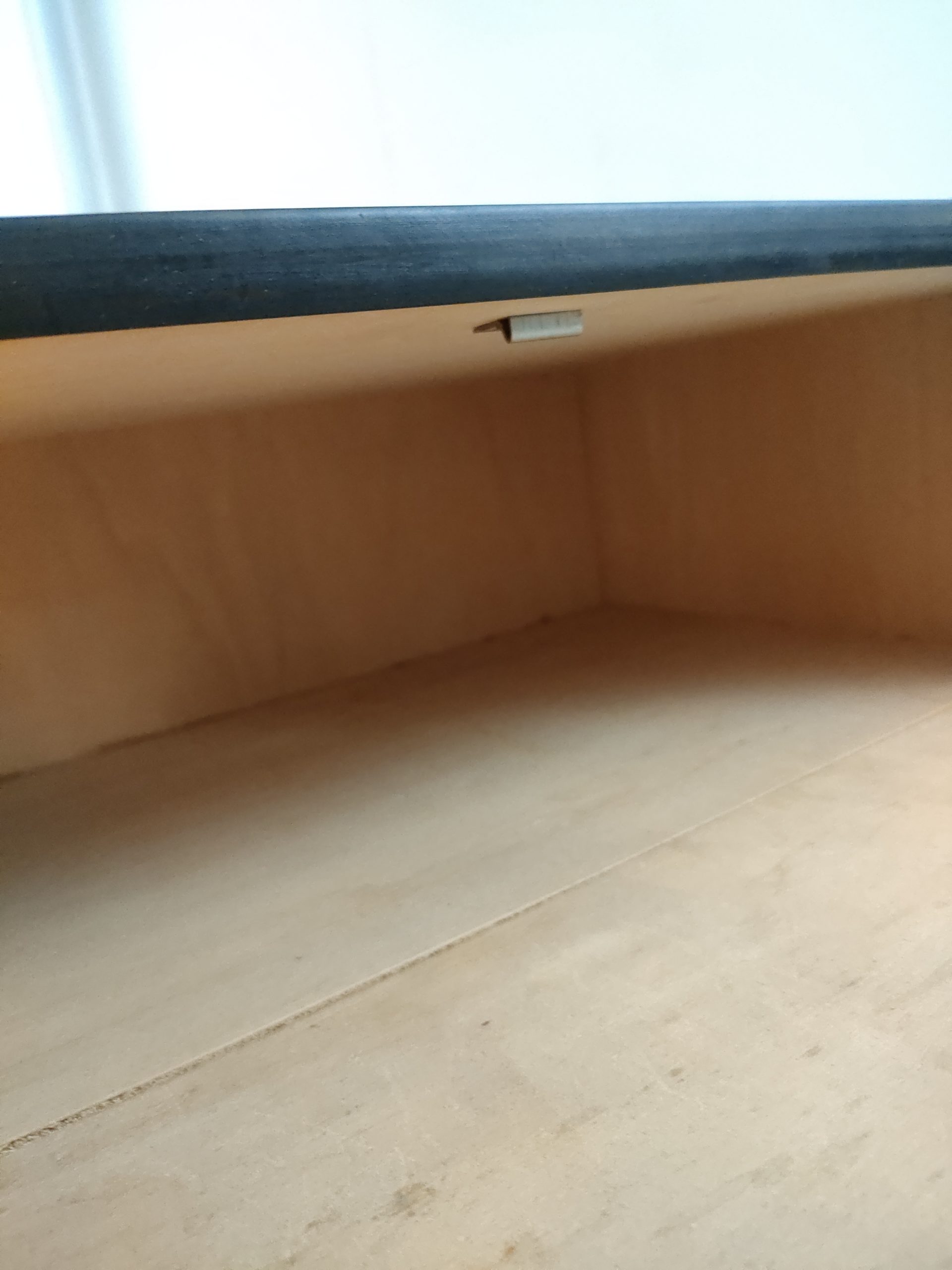 Légère décoloration du bois. Le mécanisme pour fermer la porte est usé, de ce fait la porte peut être fermée mais n’est pas bloquée. Elle s’ouvre facilement si le meuble est bougé.