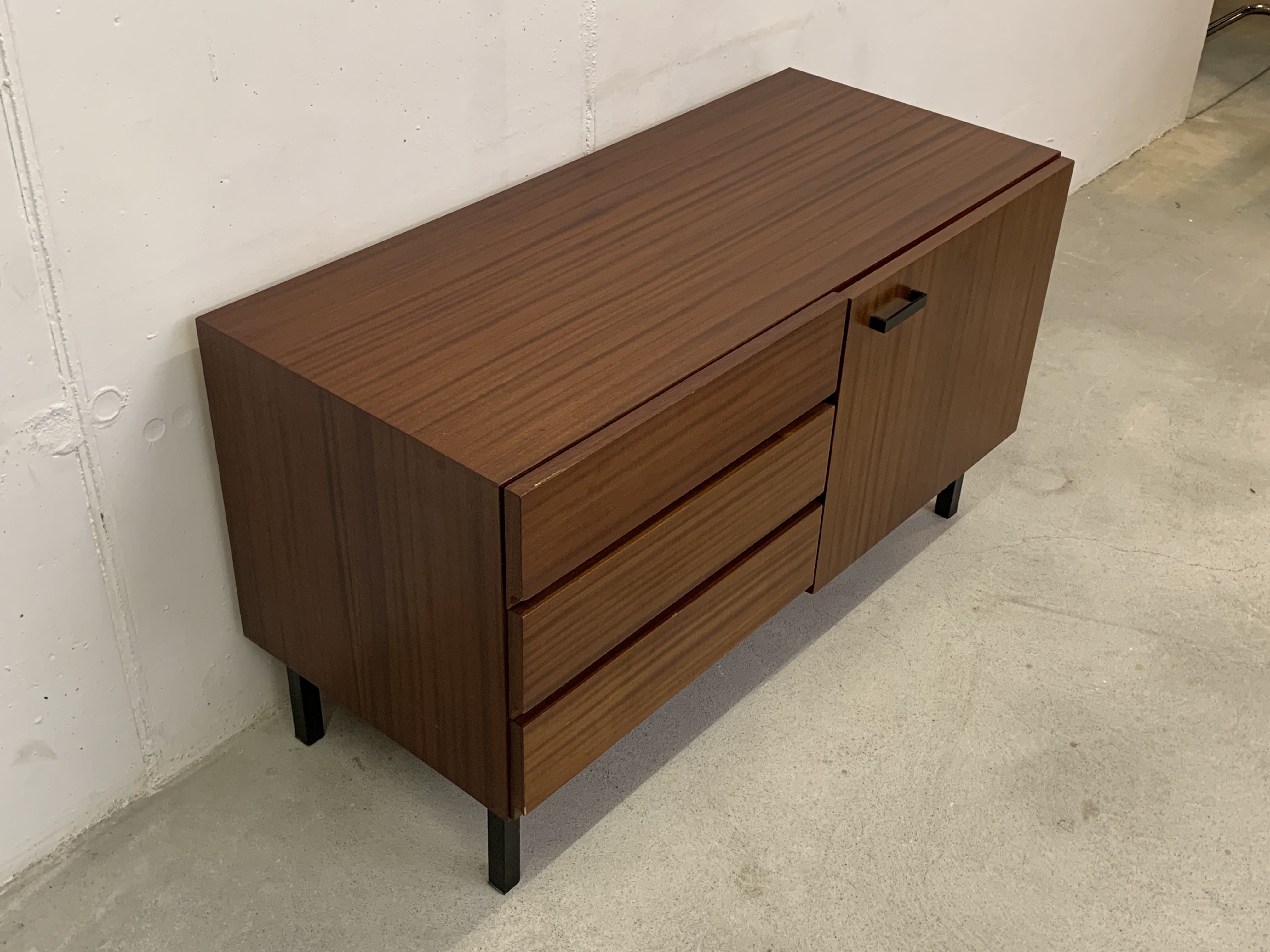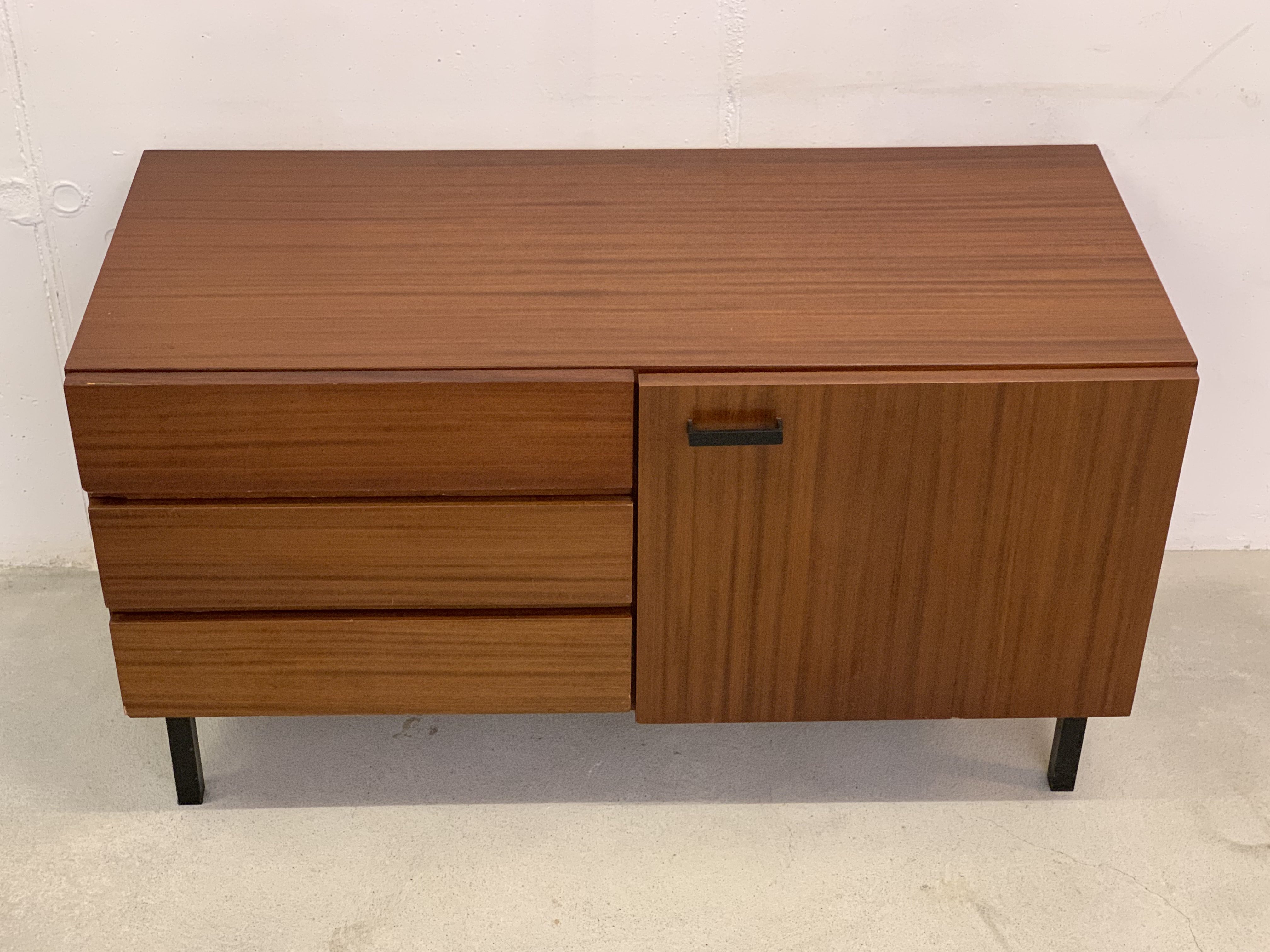 Produit venduPetit sideboard avec 3 tiroirs et une porte. Le meuble fait partie d’un ensemble (visible sur la dernière photo) mais est vendu séparément.