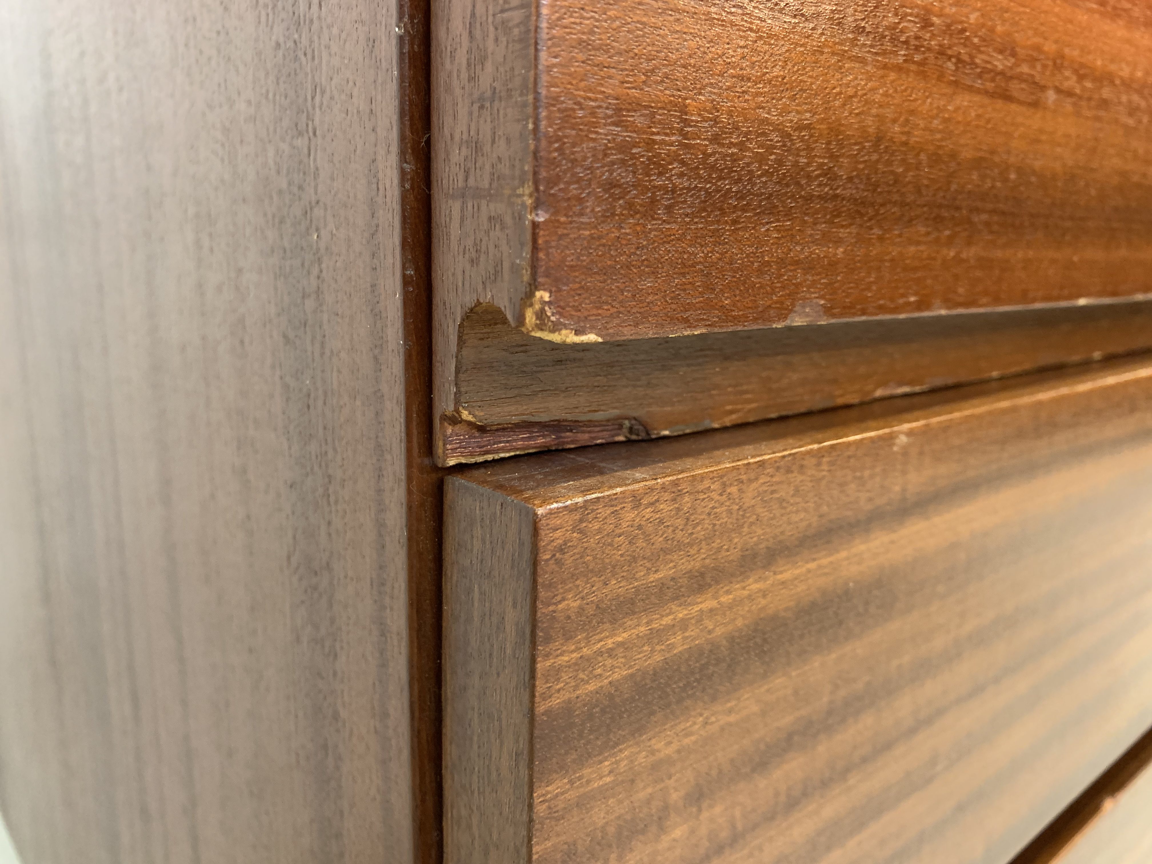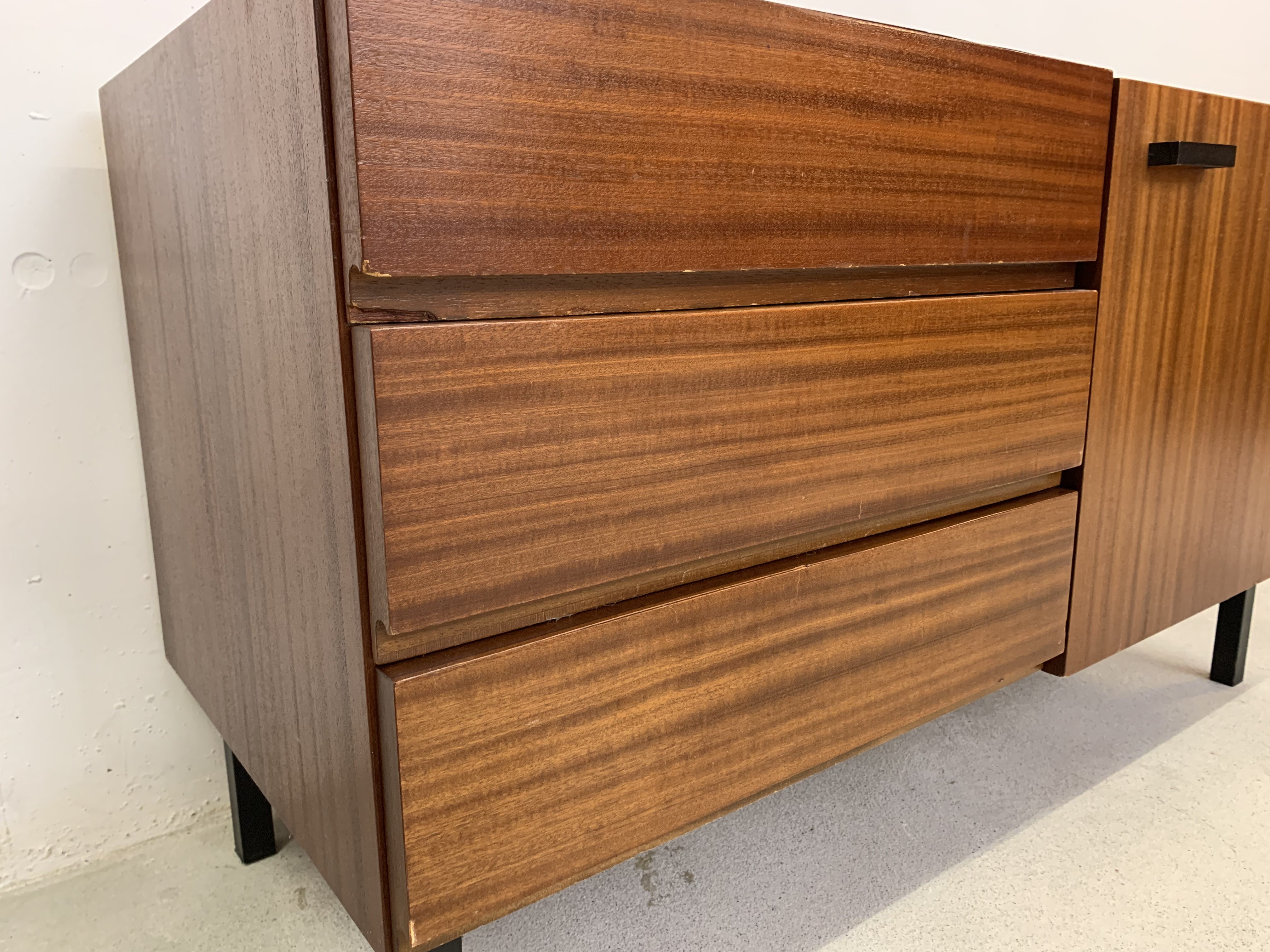 Le sideboard comporte de nombreuses marques d’utilisation. En particulier, le plaquage au bord des tiroirs est abîmé par endroits. Un des tiroirs est recouvert d’un film plastifié d’époque. La plupart des nombreux petits défauts sont visibles sur les photos. L’ensemble reste correct pour son âge.