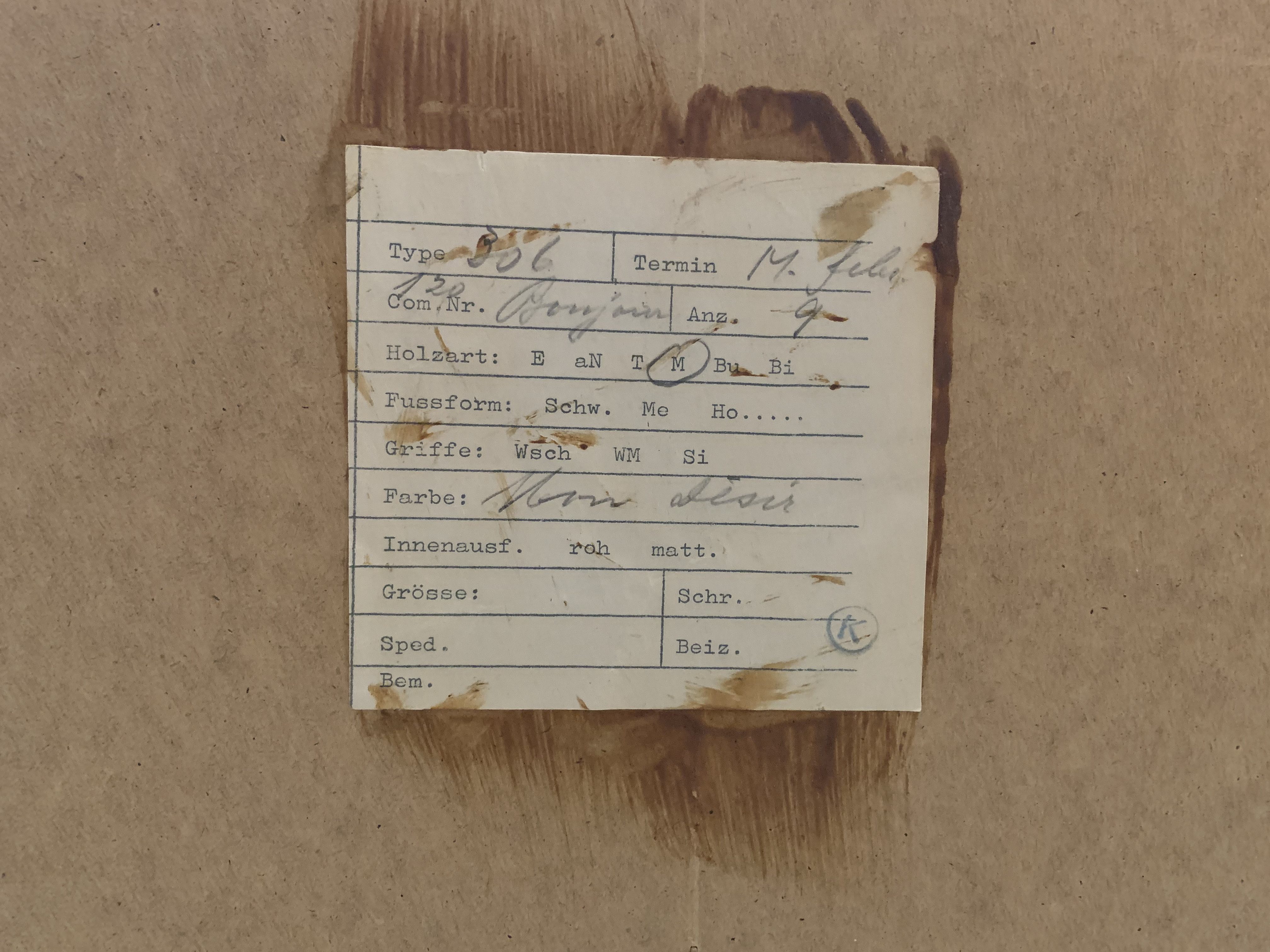 Le sideboard comporte de nombreuses marques d’utilisation. En particulier, le plaquage au bord des tiroirs est abîmé par endroits. La plupart des nombreux petits défauts sont visibles sur les photos. L’ensemble reste correct pour son âge.