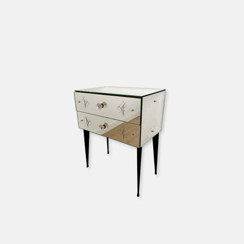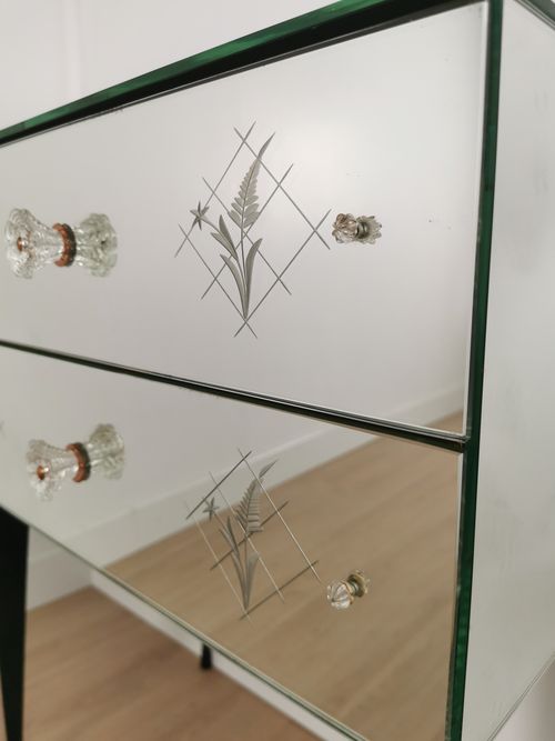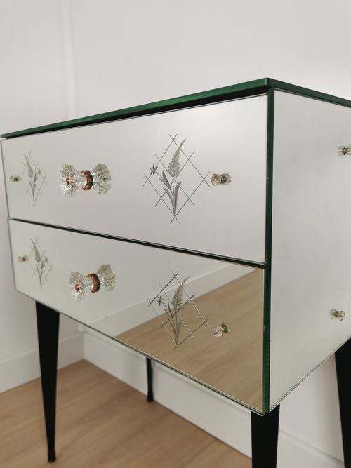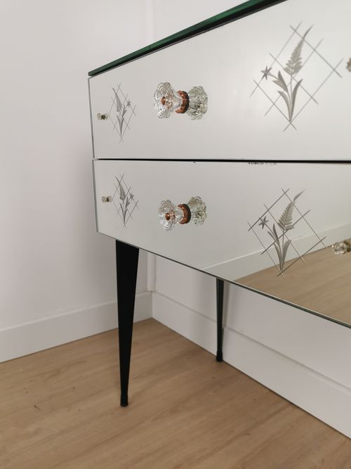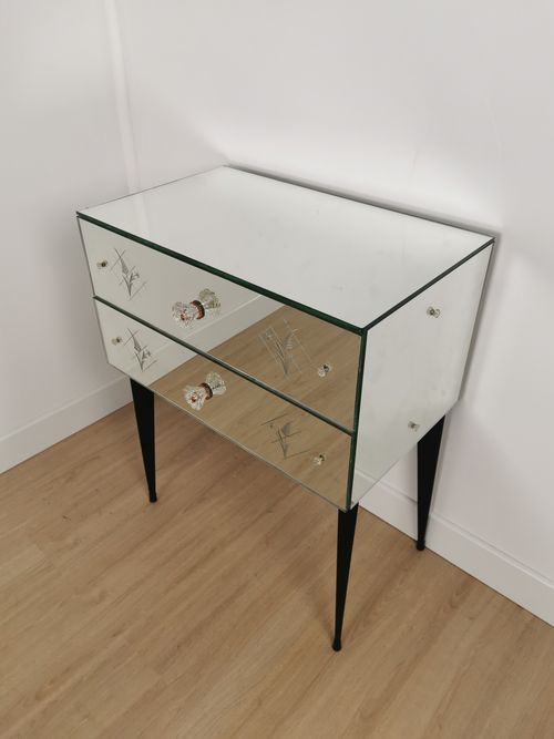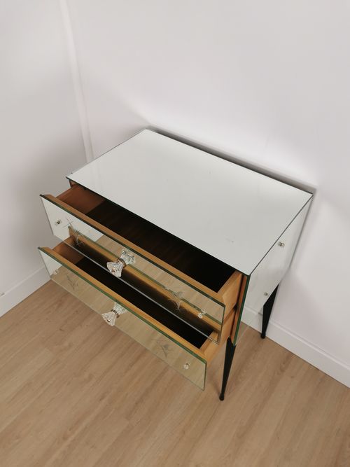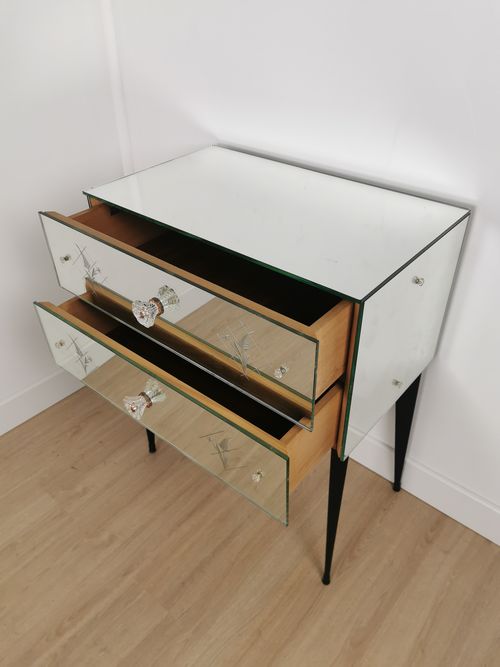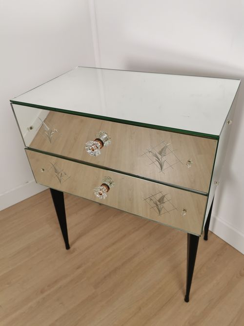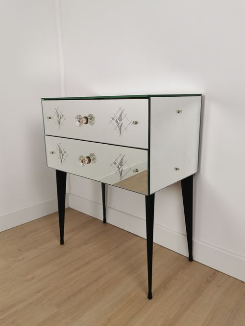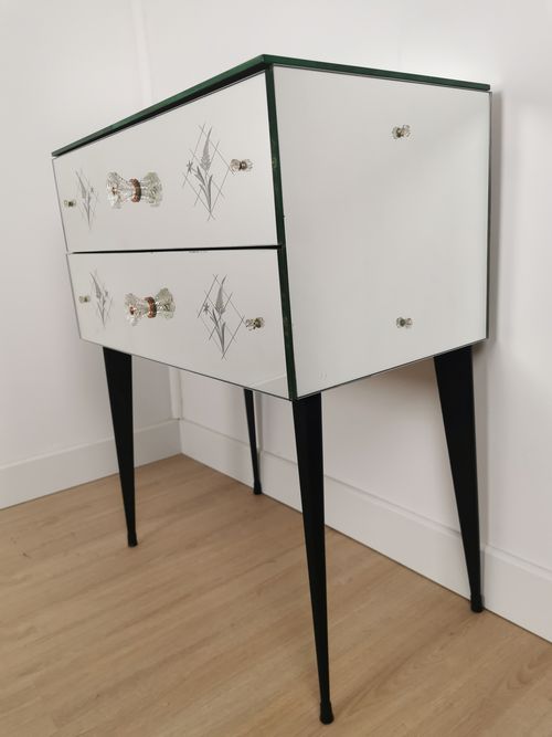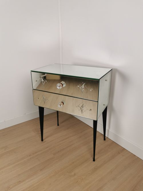 Produit venduPetite commode miroir des années 50 dotée de 2 tiroirs et de pieds fuselés.