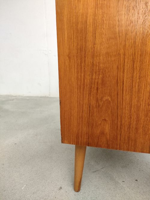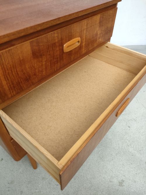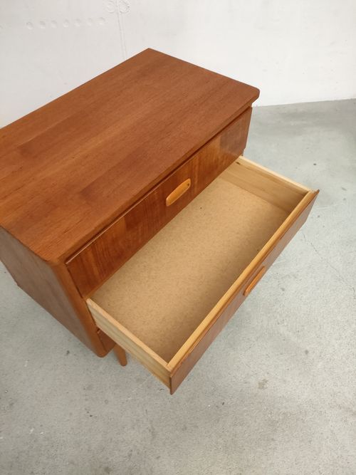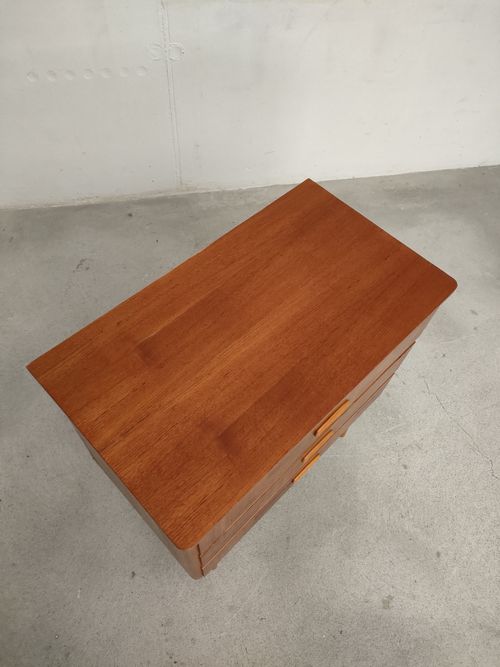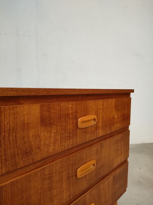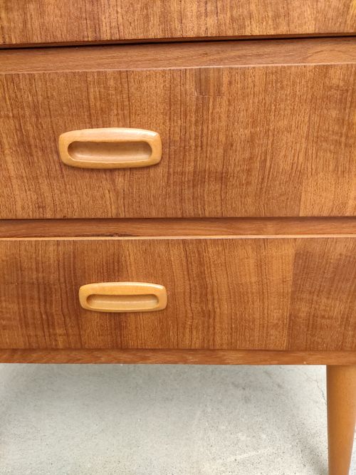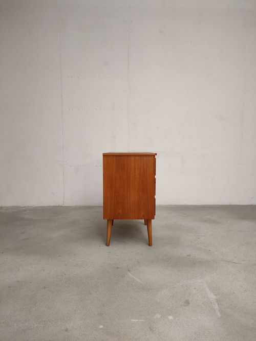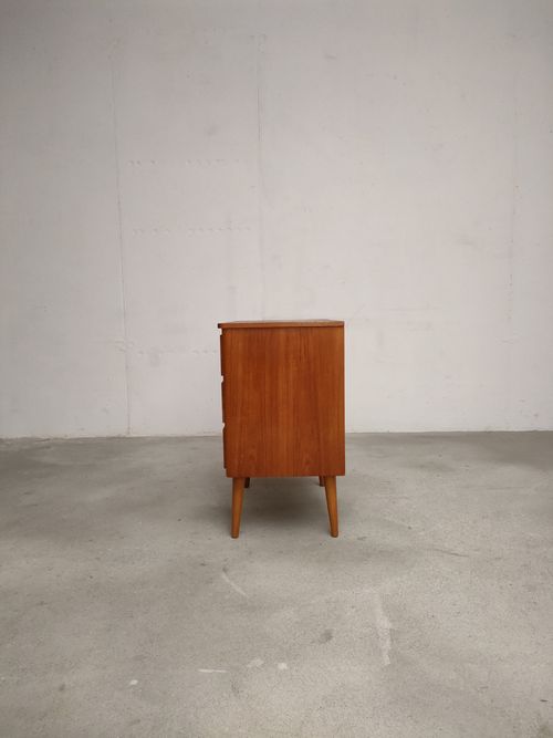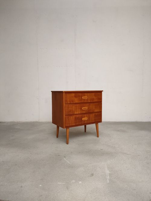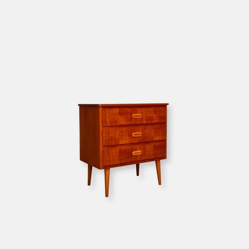 Produit venduPetite commode suédoise dotée de 3 tiroirs et de pieds fuselés. Le bois des poignées est plus clair.