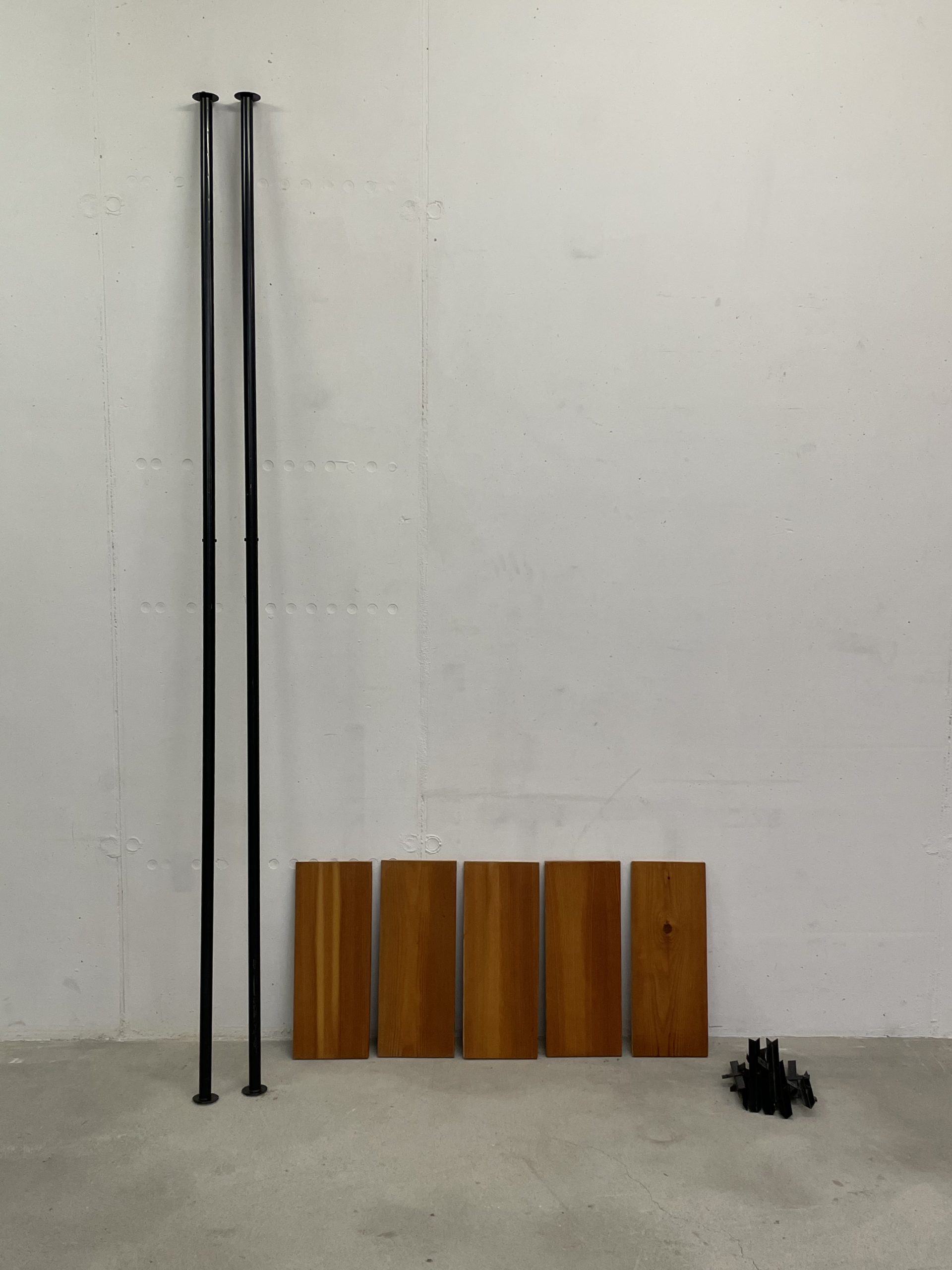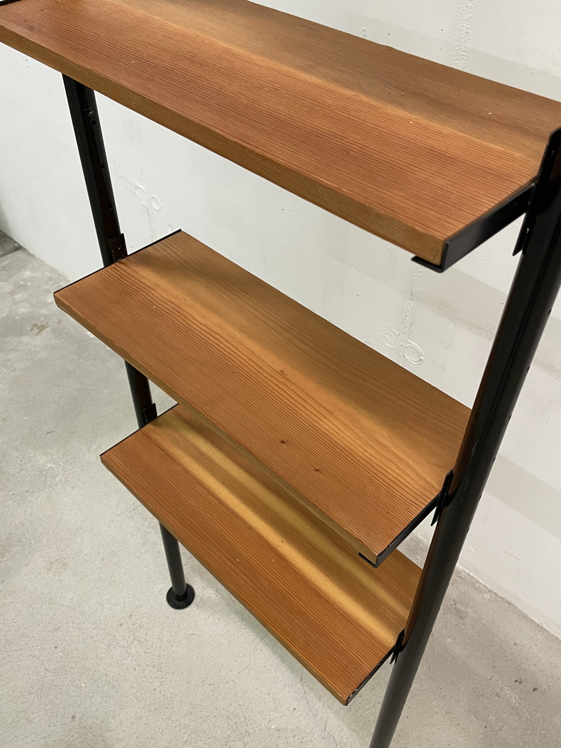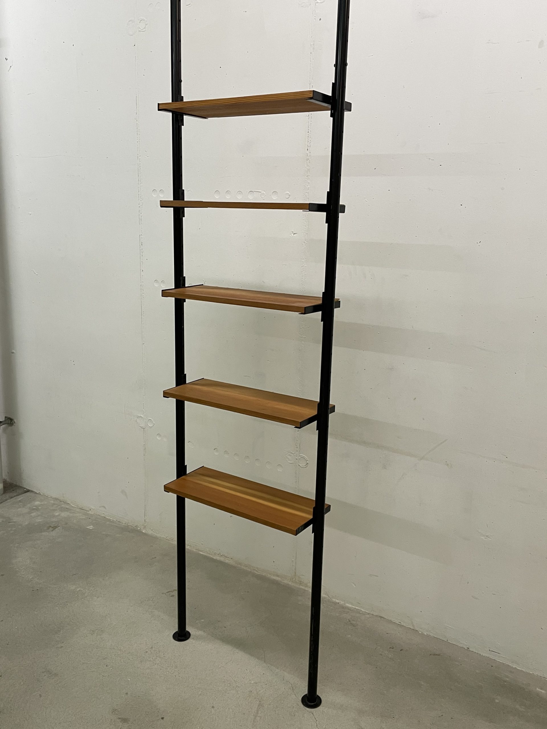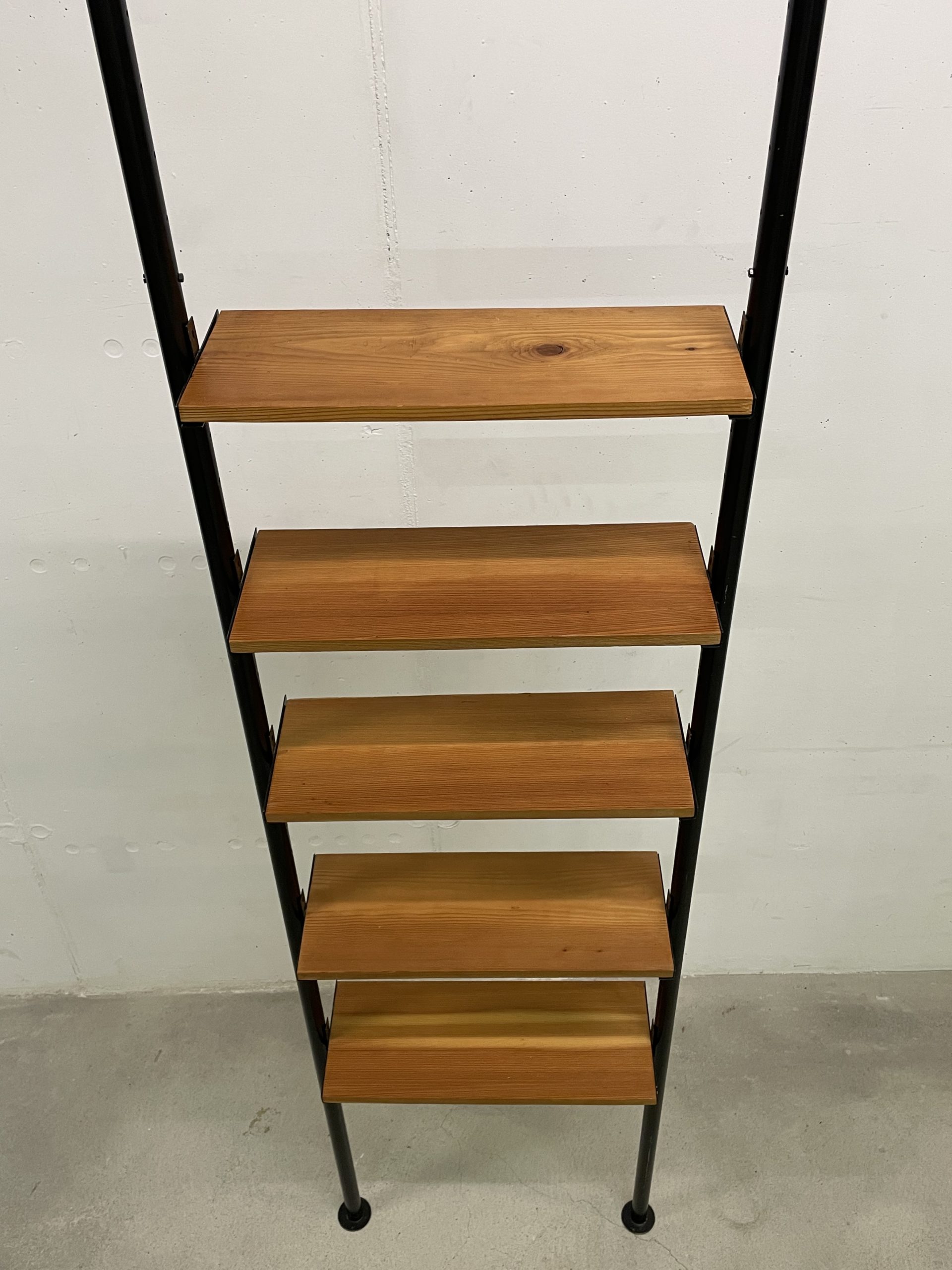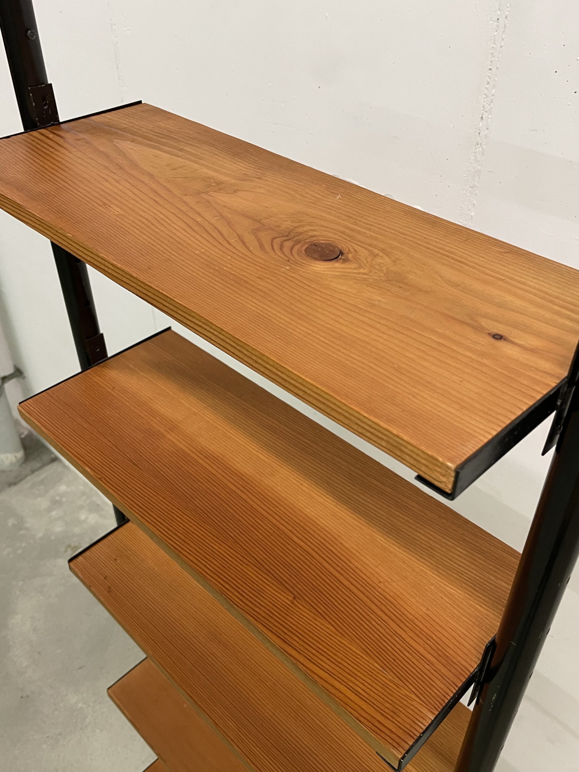 Produit venduÉtagère télescopique étroite avec 2 montants métalliques noirs et 5 tablars en bois. Convient pour des hauteurs de plafond de 2m35 à 3 mètres. Chaque tablar mesure 48 cm de large.