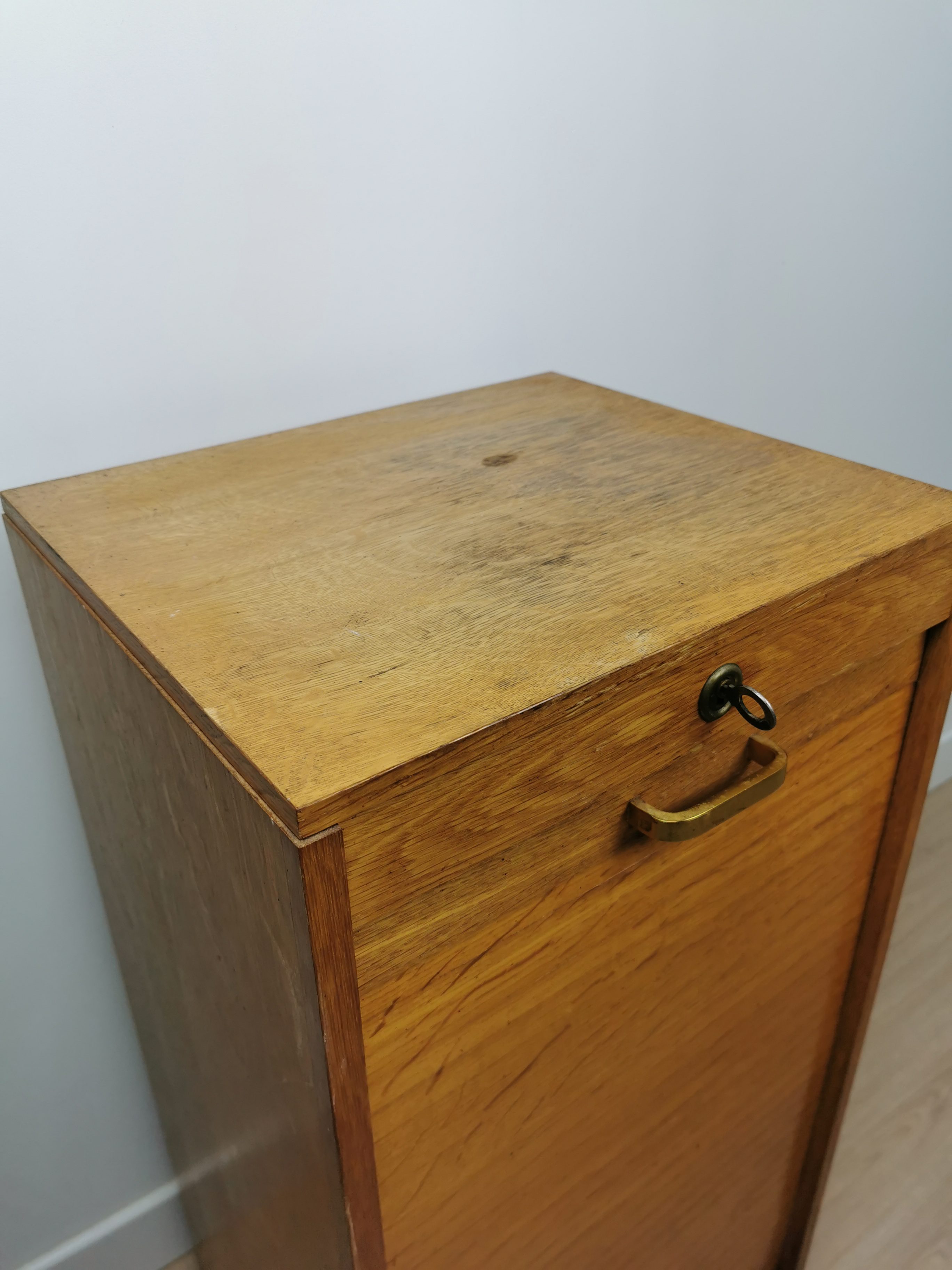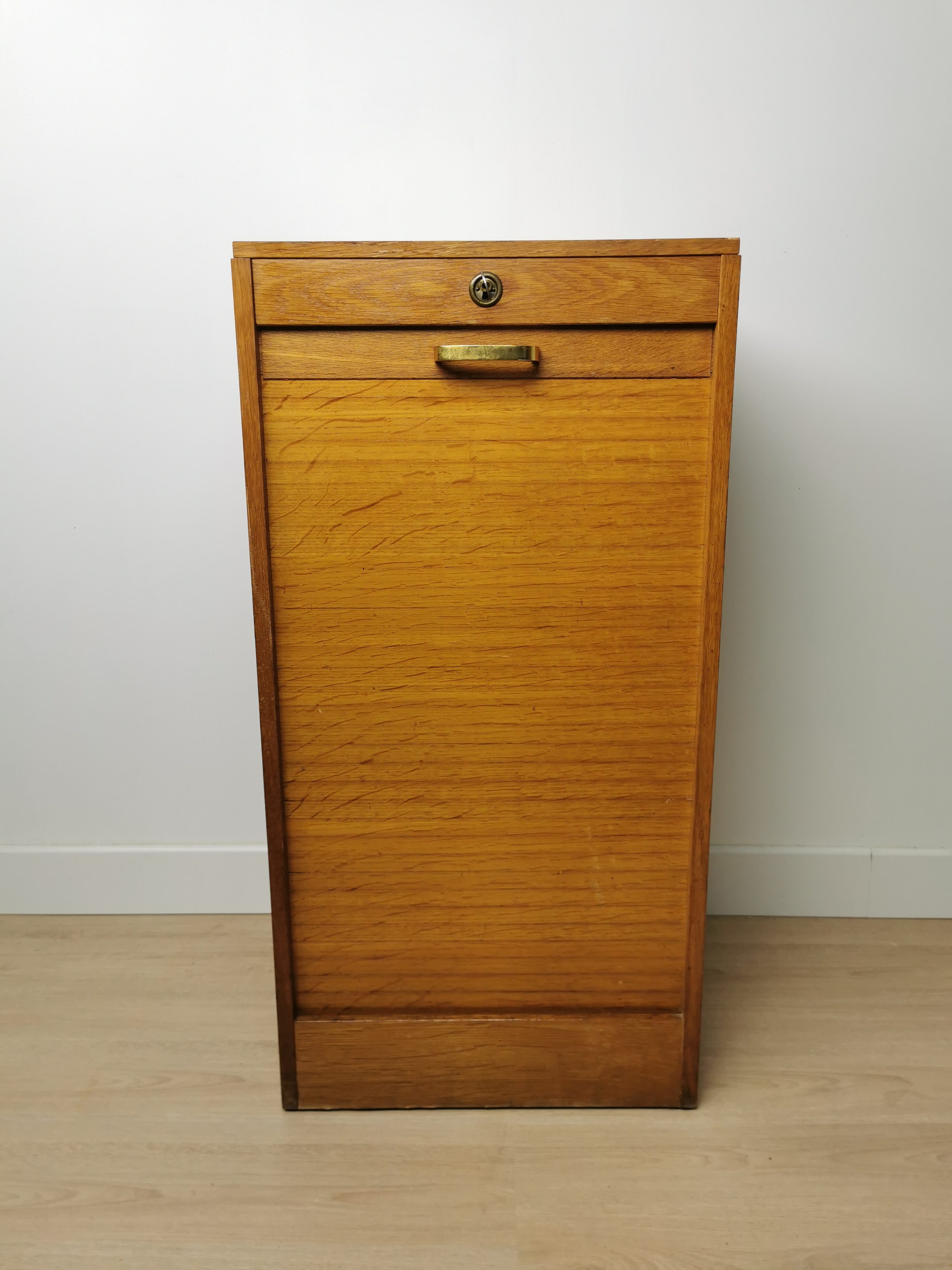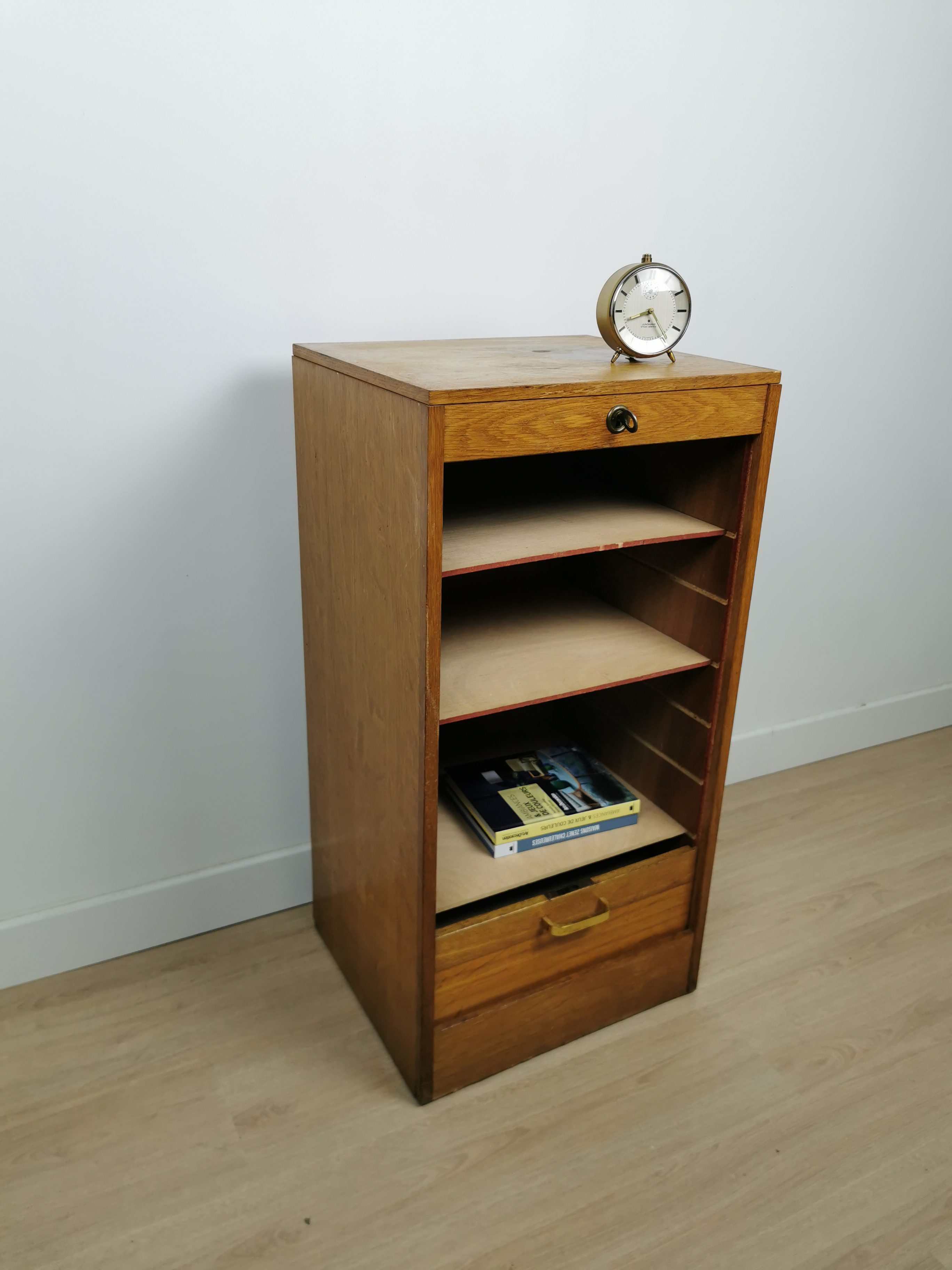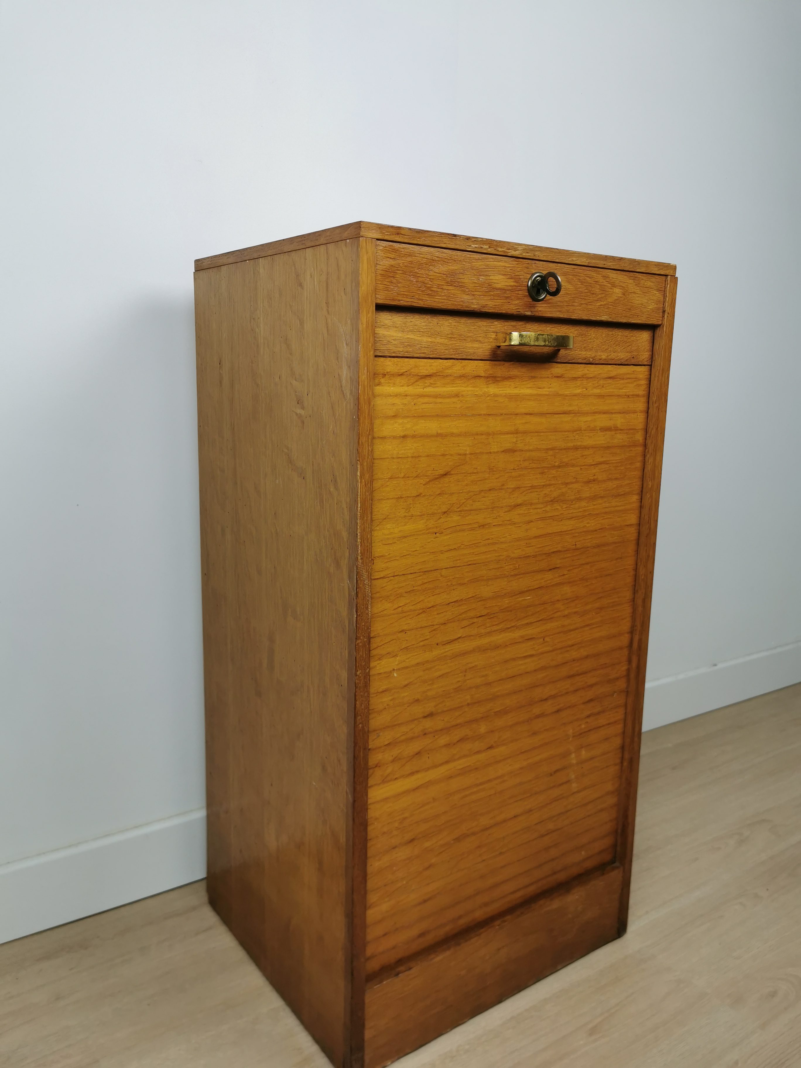 Produit venduPetite meuble a rideau des années 60 en bon état. En bois avec poignée en métal et étagères à l’intérieur du meuble.