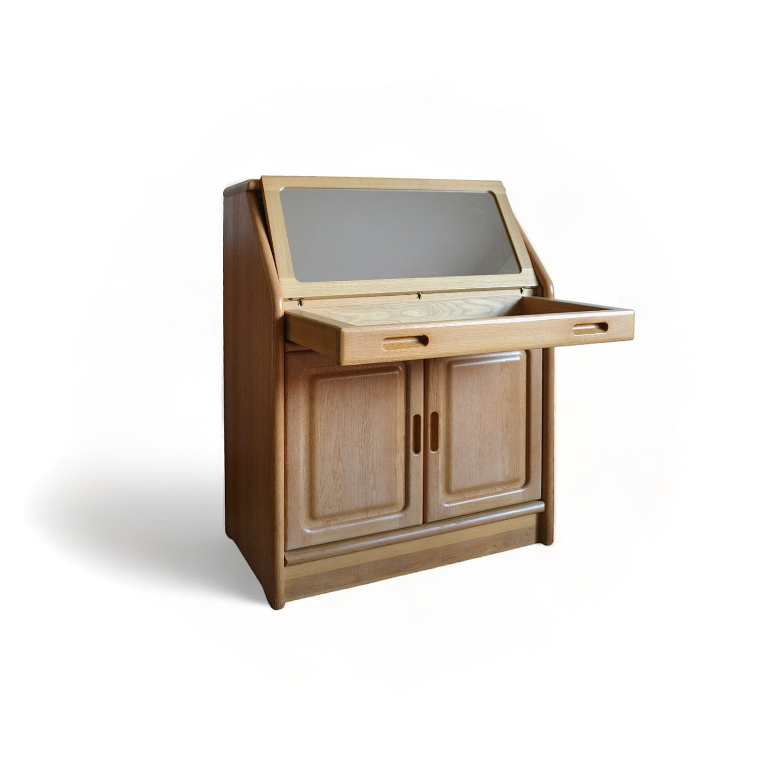 Entièrement en chêne massif clair, il bénéficie d’une multitude de jolis détails: des tiroirs assemblés à queues droites, un insert en cuir sur le plateau, ou encore la possibilité de le transformer en coiffeuse avec son grand miroir dissimulé sous la surface de travail. Notez qu’une fois le miroir relevé, un grand tiroir devient accessible pour accueillir par exemple ordinateurs portables ou autre.