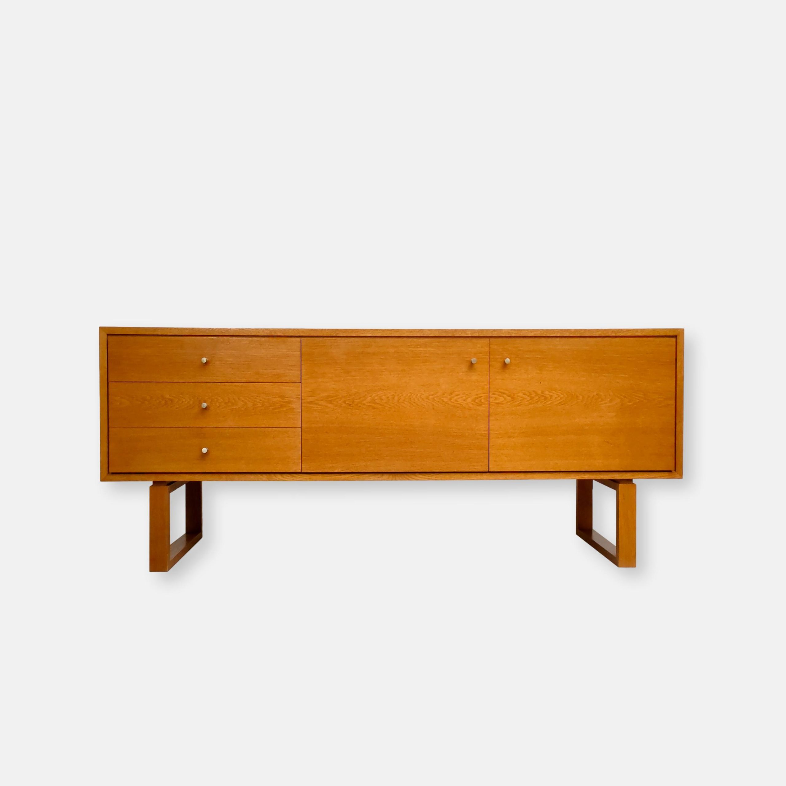 Produit venduSideboard ou enfilade vintage en bois doté de 3 tiroirs d’un coté et d’une espace de rangement avec portes avec étagère à l’intérieur de l’autre. Quelques traces d’usure sur le bois mais parfaitement stable, solide et fonctionnel. Très élégant avec ses lignes plutôt minimalistes et son piètement original.