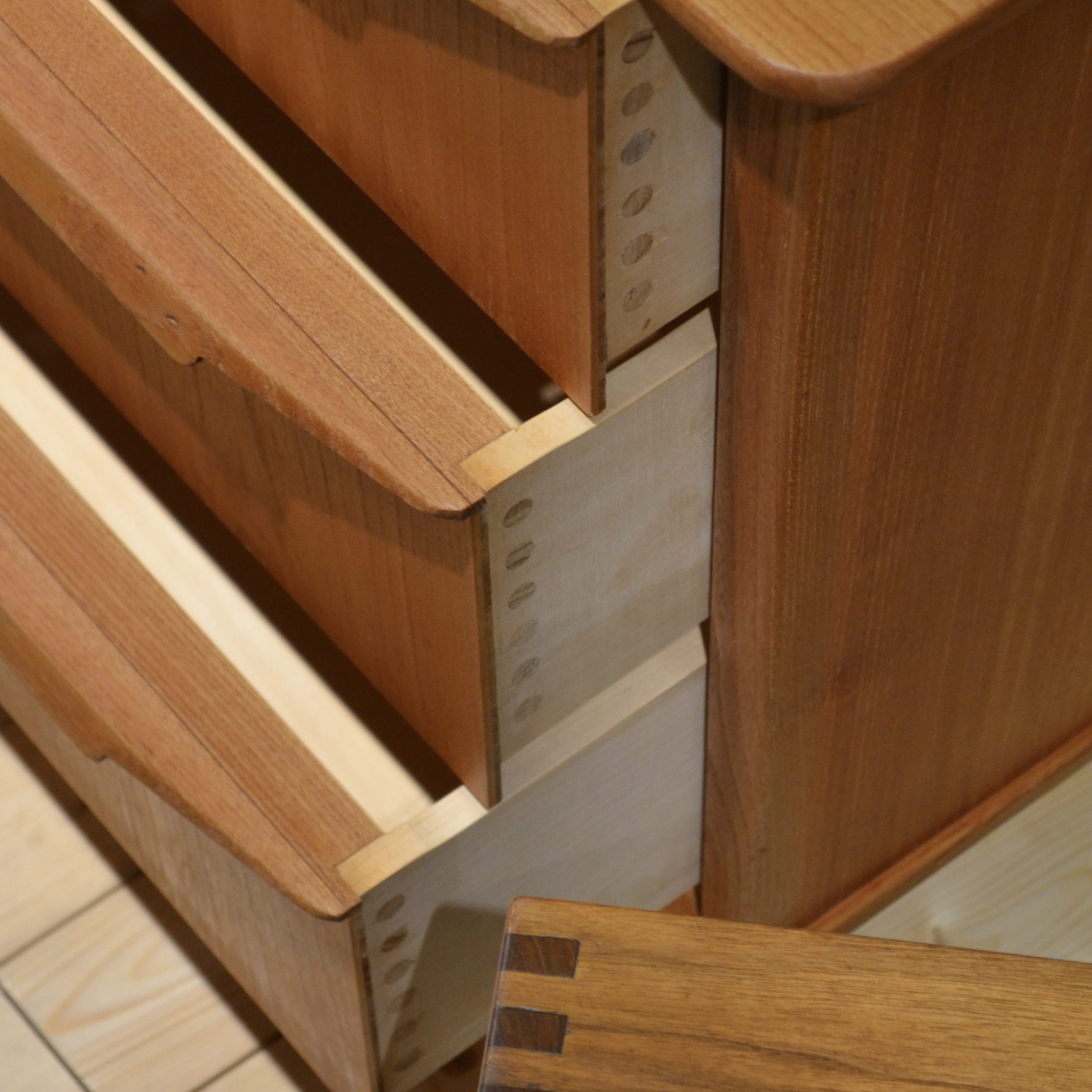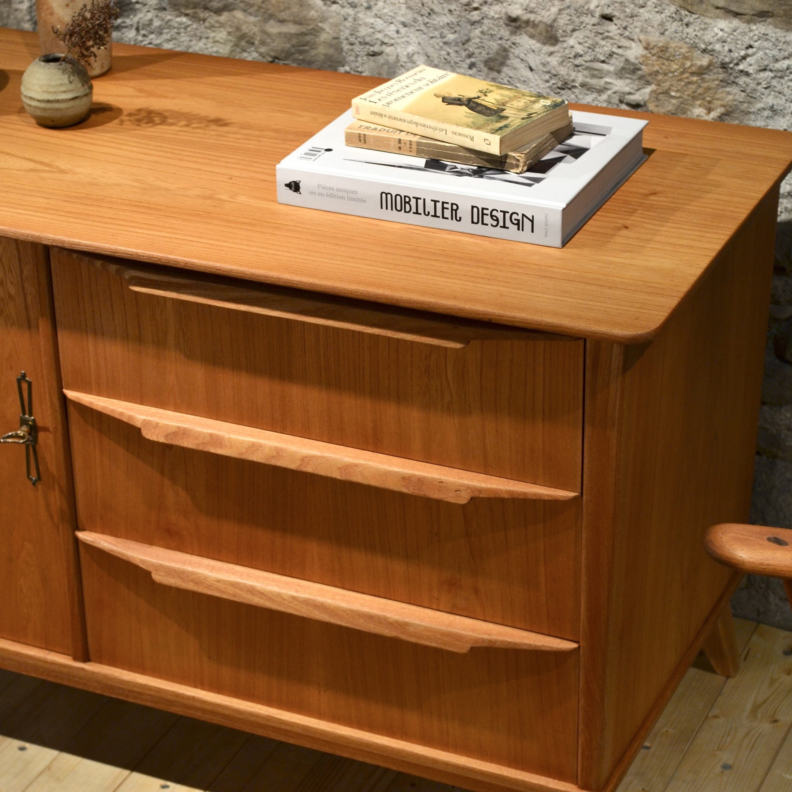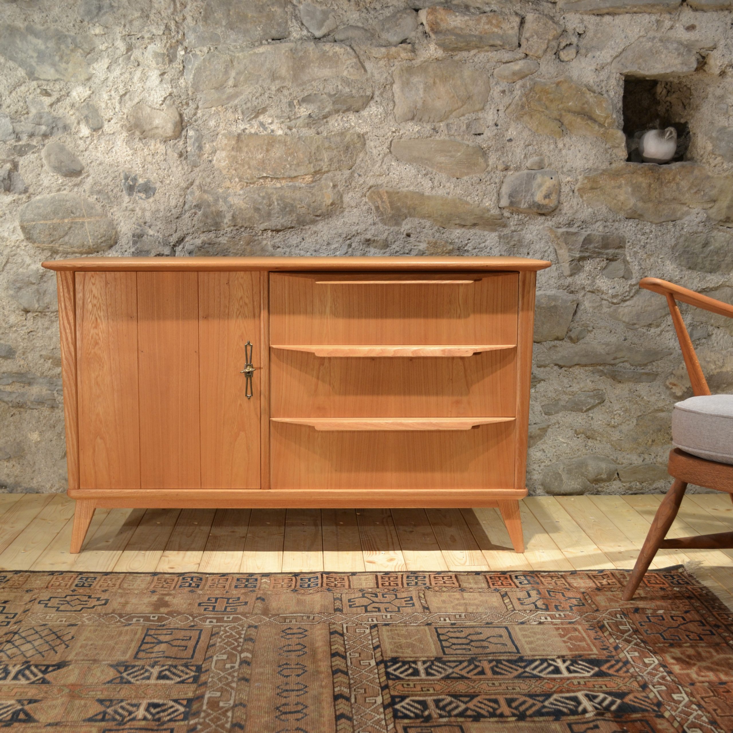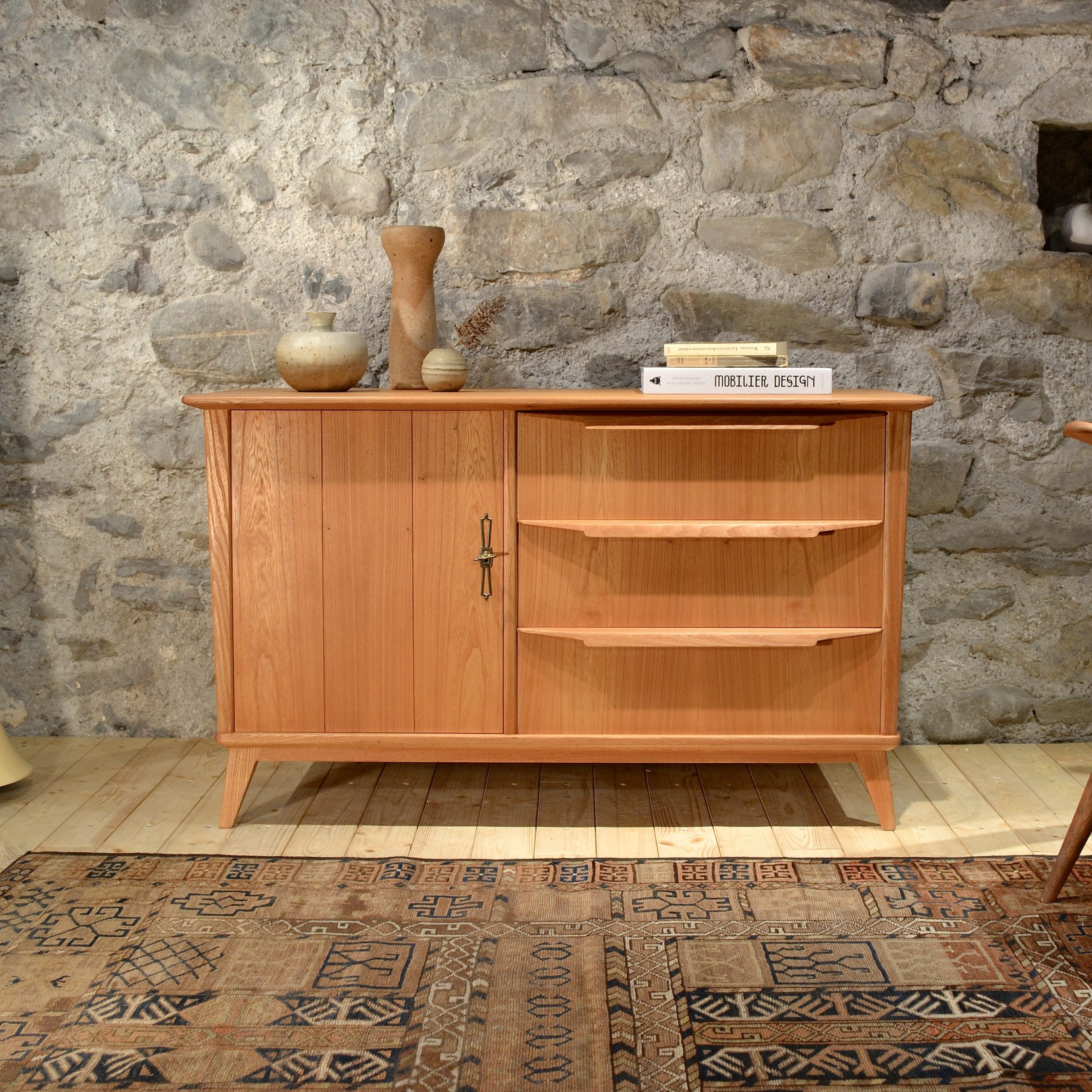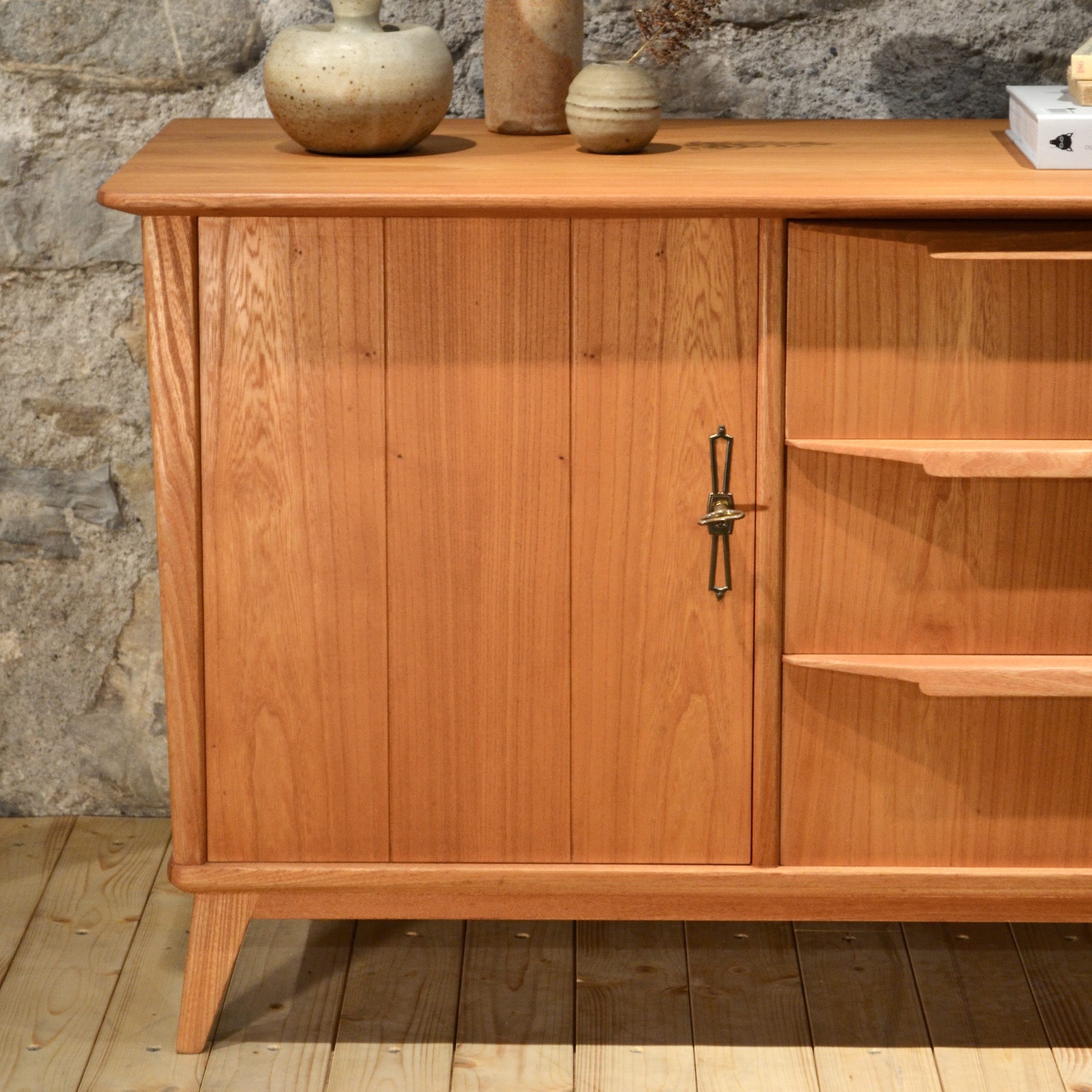 Suspendu sur ses quatres pieds compas à facettes, ce sideboard regorge de détails tous aussi croustillants les uns que les autres. Subtilement évasé depuis le sol, il expose fièrement ses trois larges poignées spécifiques qui une fois tirées laissent entrevoir l’assemblage des tiroirs aux tourillons (le genre de béatilles dont on raffole). Ouvrez ensuite le portillon et trois niveaux de rangement s’offrent à vous. Le tout enrobé d’orme, il ne vous reste plus qu’à l’agrémenter d’une belle lampe et de quelques céramiques.