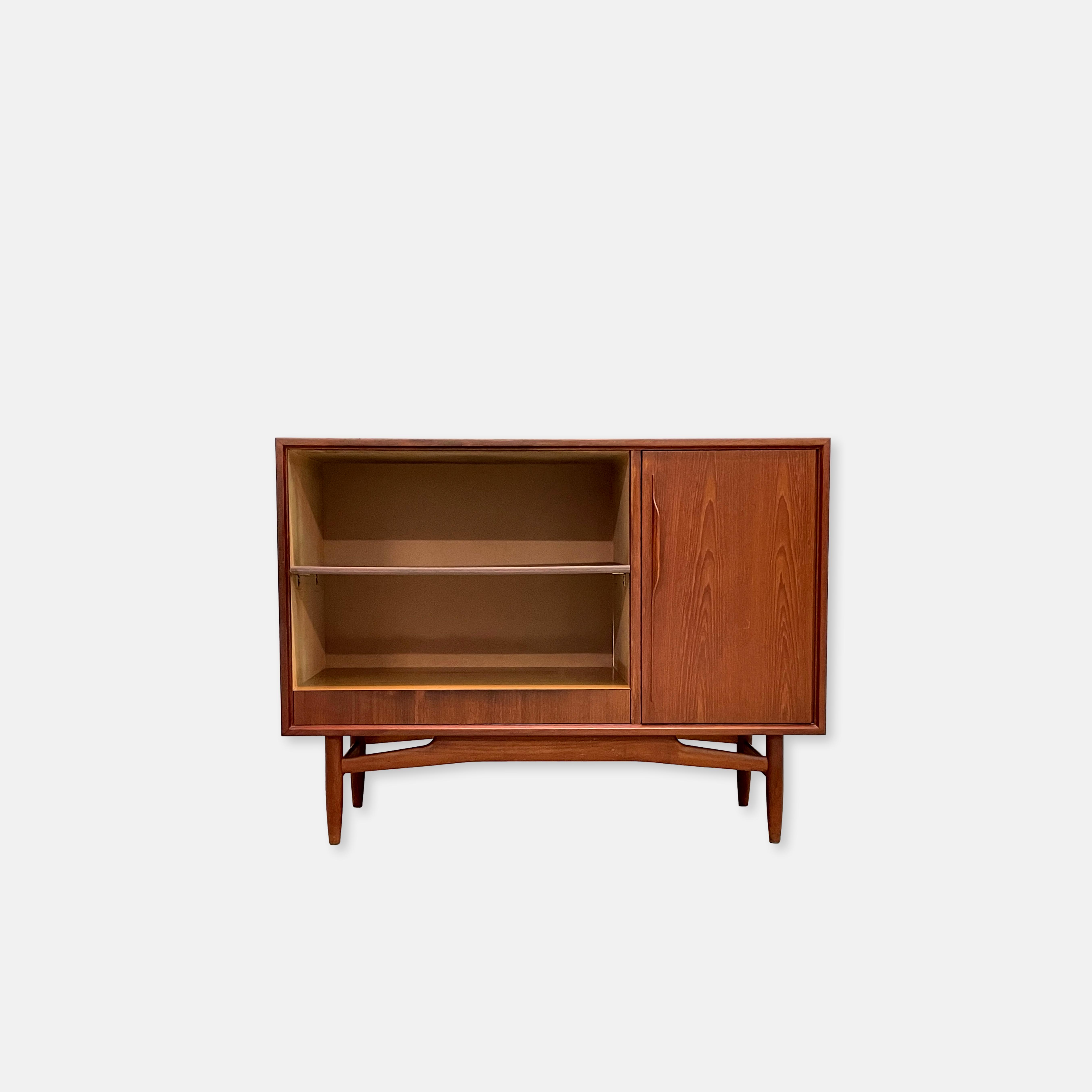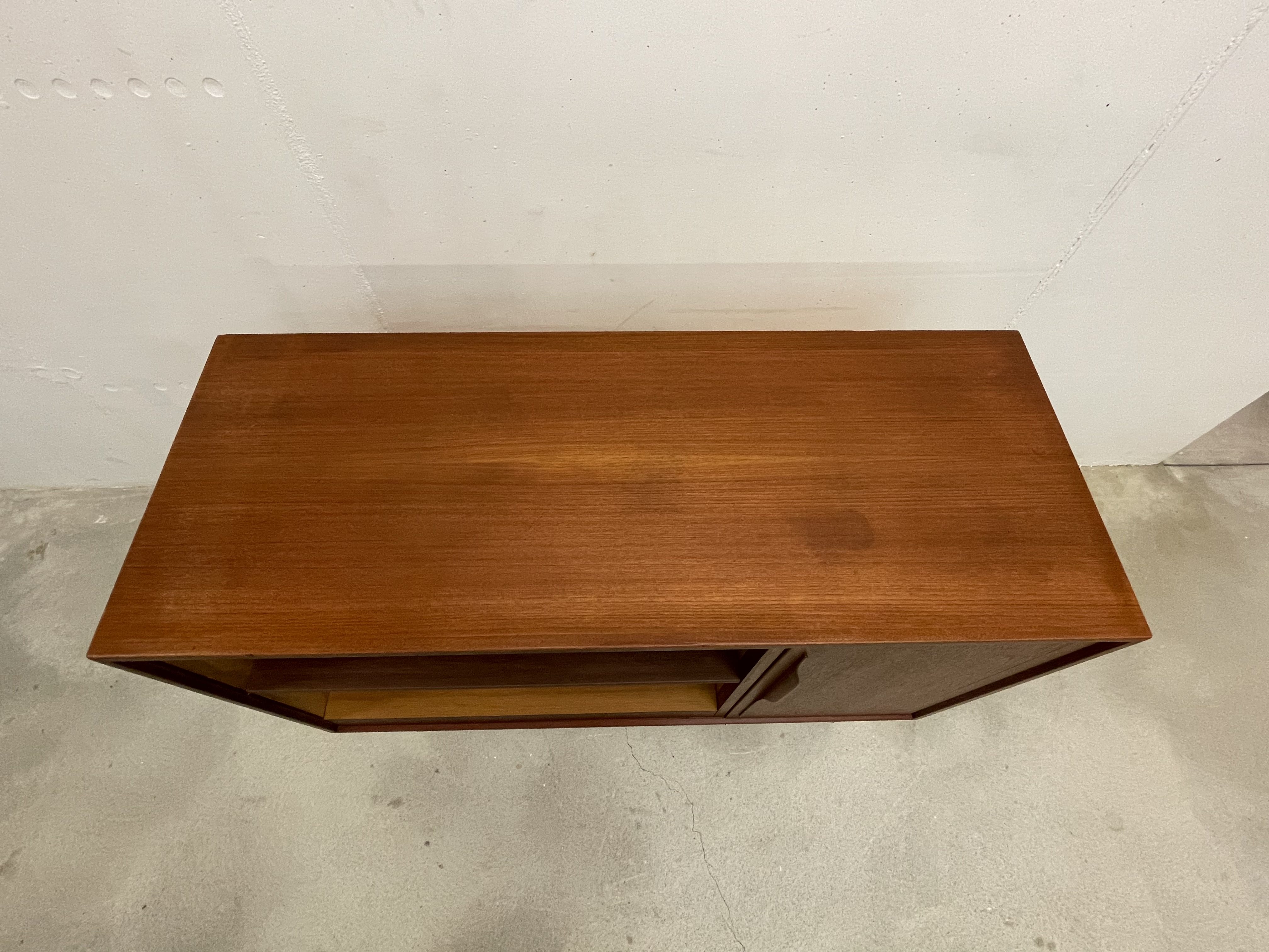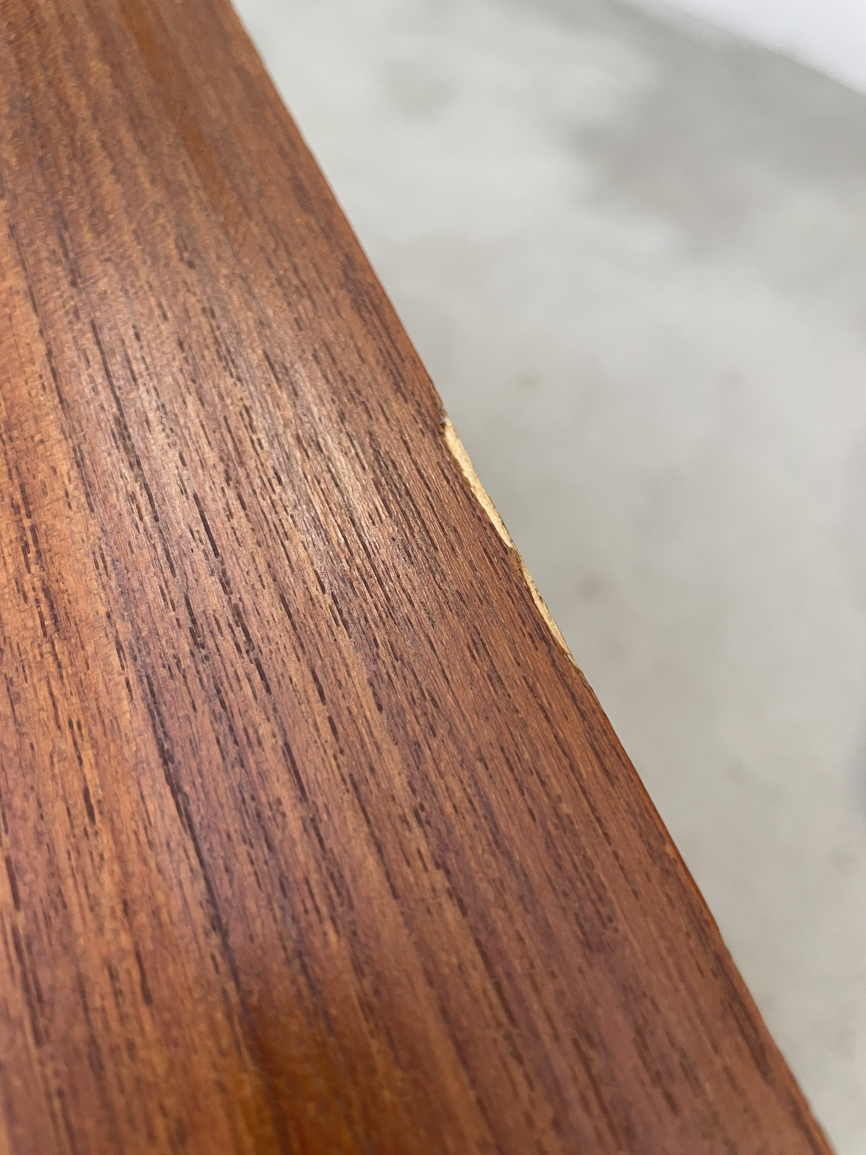 Produit venduSideboard de style scandinave du fabricant suisse Swissteak. Le sideboard fait de prime abord bonne figure, car l’extérieur est assez joli et en bon état, mis à part quelques traces d’utilisation. L’intérieur a part contre un peu plus souffert! La porte s’ouvre sur un compartiment dont il reste le support pour un tiroir, mais pas de tiroir… il y a cependant un tablar amovible en bois aggloméré (pas d’origine) en guise de séparation. La partie ouverte a également un arrangement assez fantaisiste: le fond rehaussé est fixe mais n’est pas d’origine. Il reste assez bien réalisé et en harmonie avec l’ensemble, mais sa fonction m’échappe (par contre il crée une cachette secrète à l’arrière 🤫). Le tablar dans la partie ouverte n’est pas d’origine et légèrement mal plat. Dans cette partie ouverte, le fond, qui a été découpé, est mal ajusté et laisse une fine ouverture apparaître.