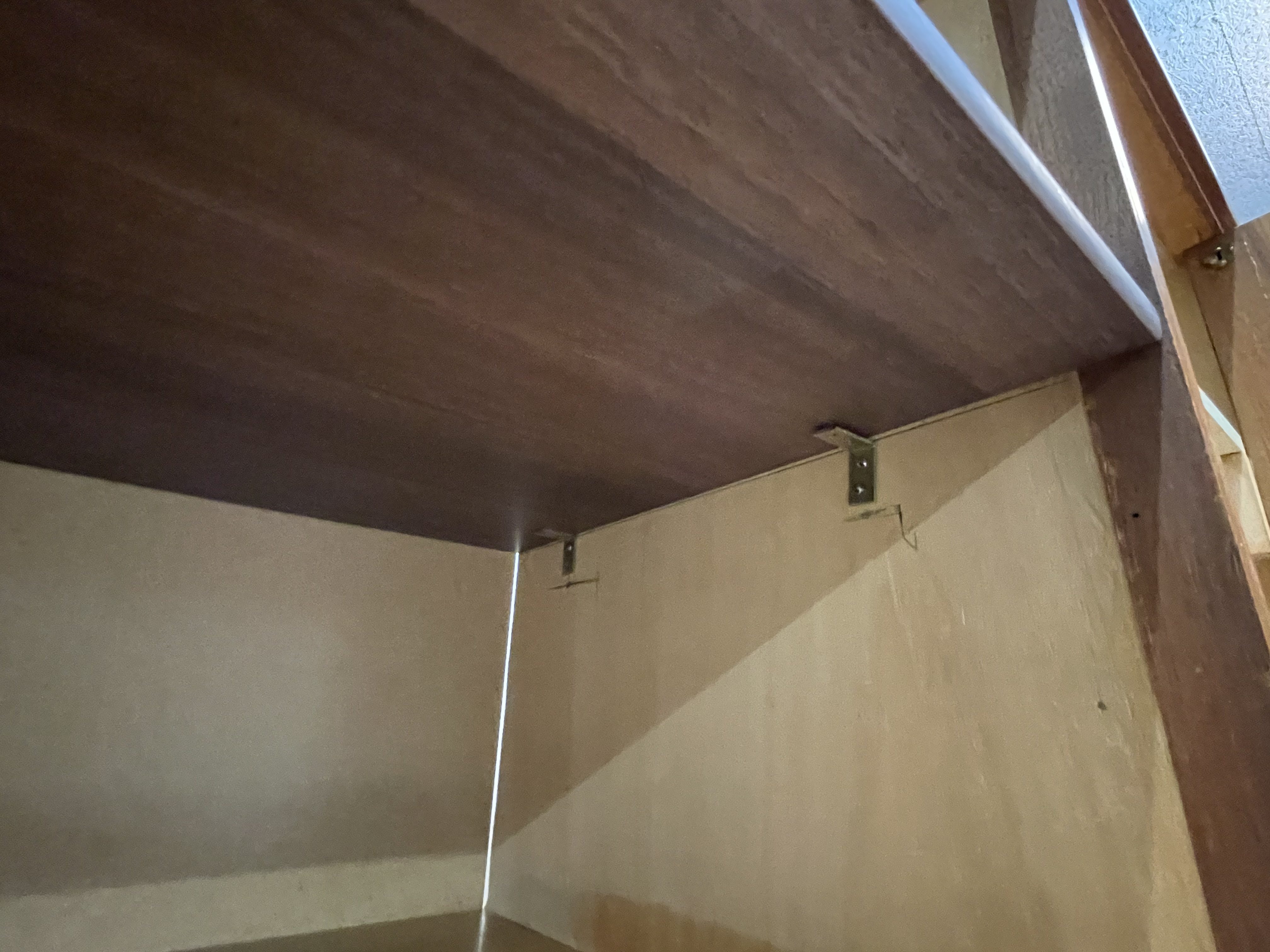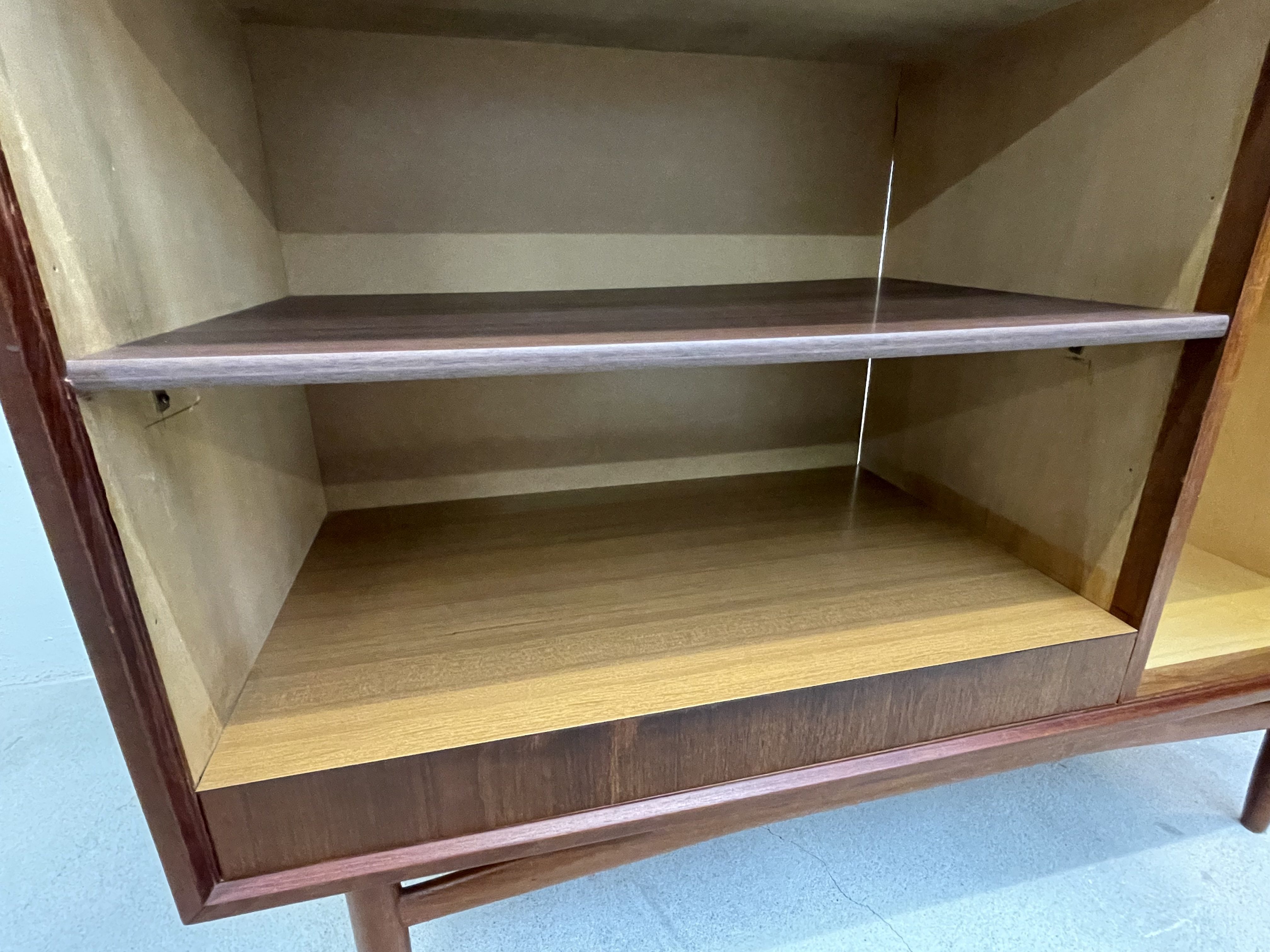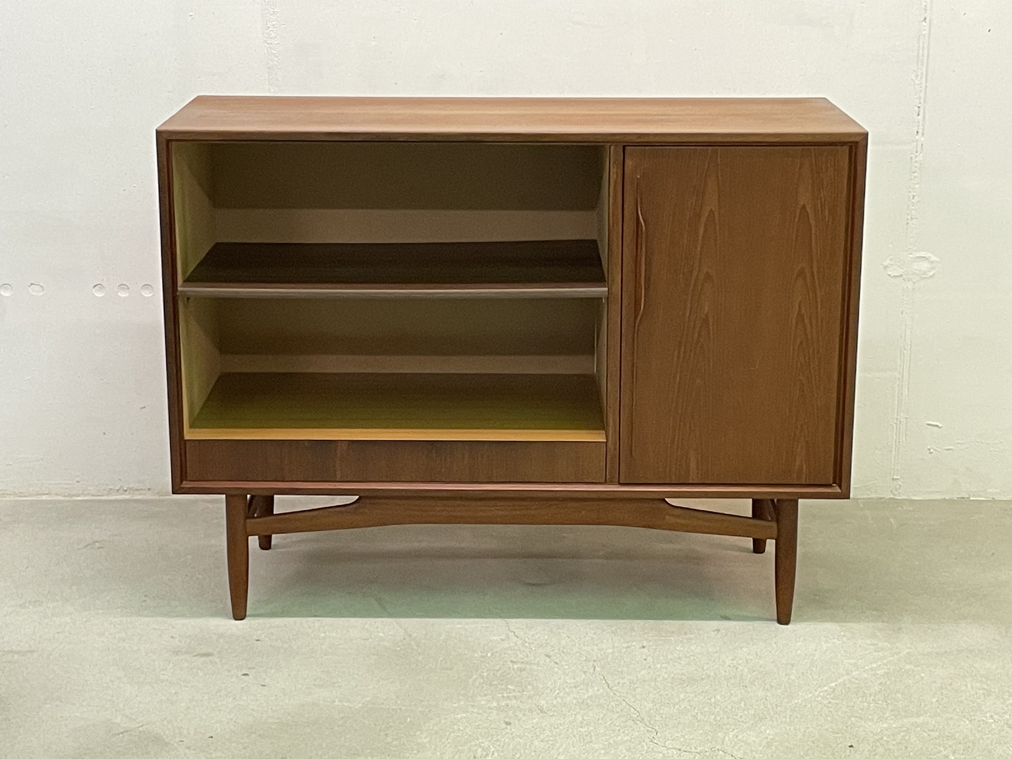 Produit venduSideboard de style scandinave du fabricant suisse Swissteak. Le sideboard fait de prime abord bonne figure, car l’extérieur est assez joli et en bon état, mis à part quelques traces d’utilisation. L’intérieur a part contre un peu plus souffert! La porte s’ouvre sur un compartiment dont il reste le support pour un tiroir, mais pas de tiroir… il y a cependant un tablar amovible en bois aggloméré (pas d’origine) en guise de séparation. La partie ouverte a également un arrangement assez fantaisiste: le fond rehaussé est fixe mais n’est pas d’origine. Il reste assez bien réalisé et en harmonie avec l’ensemble, mais sa fonction m’échappe (par contre il crée une cachette secrète à l’arrière 🤫). Le tablar dans la partie ouverte n’est pas d’origine et légèrement mal plat. Dans cette partie ouverte, le fond, qui a été découpé, est mal ajusté et laisse une fine ouverture apparaître.