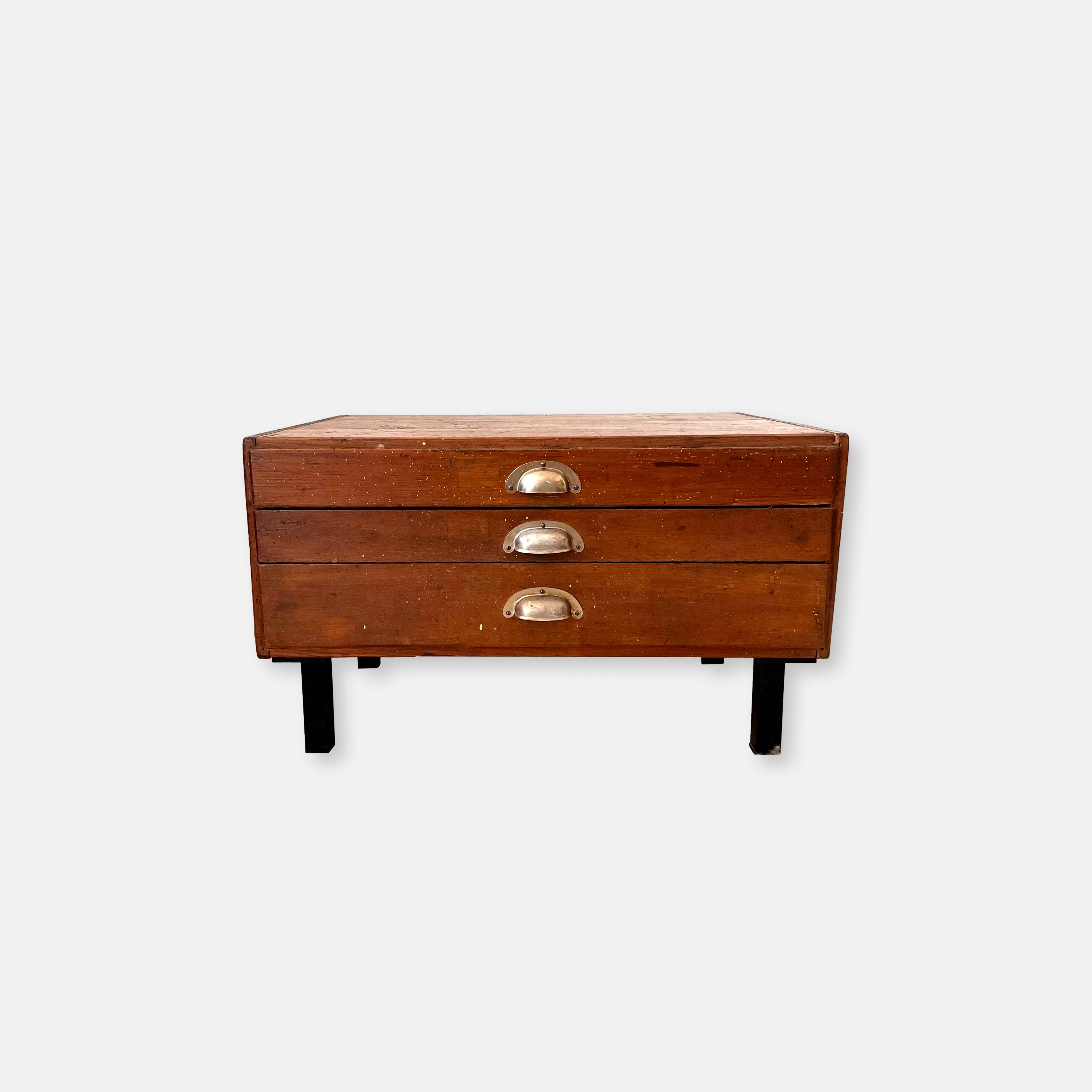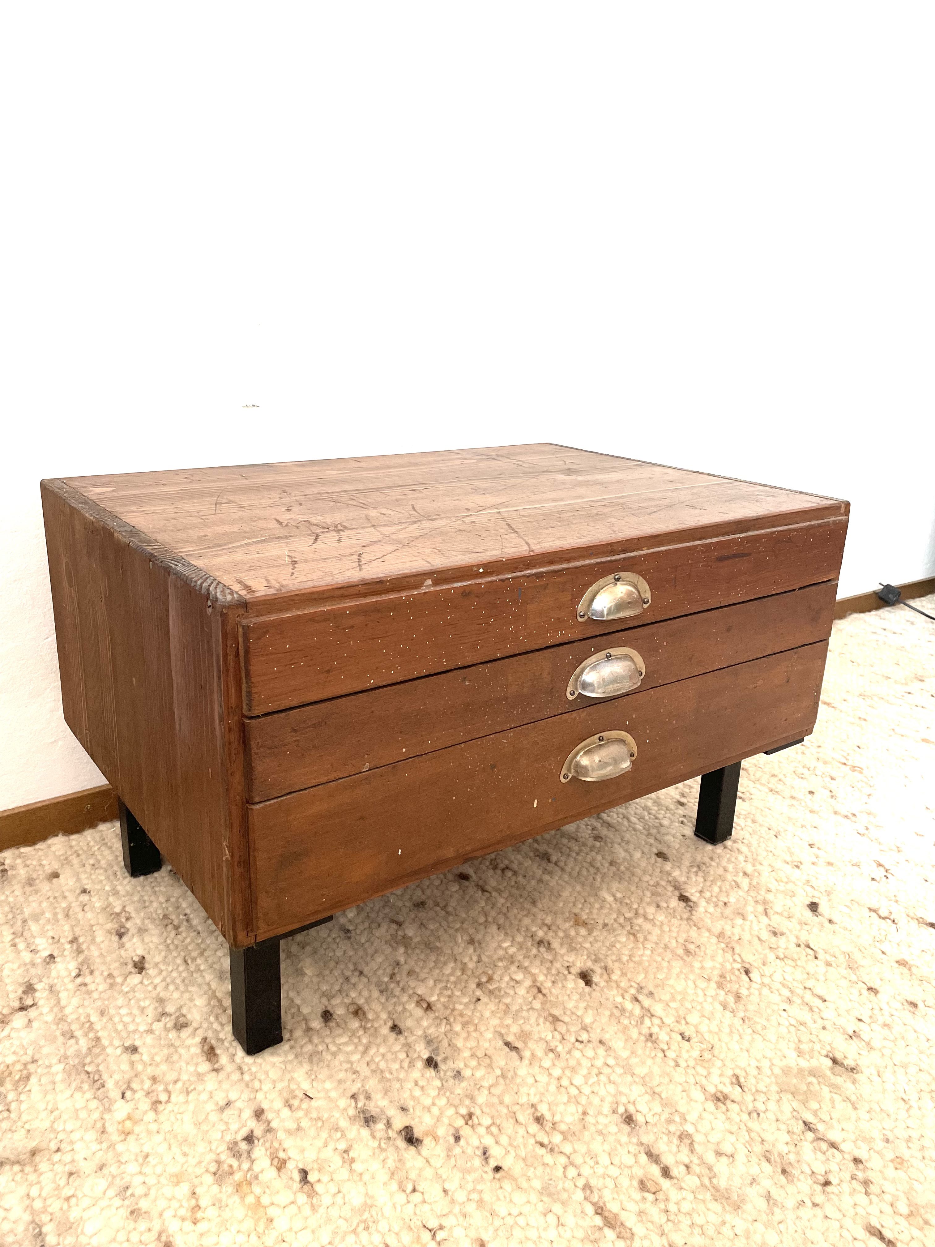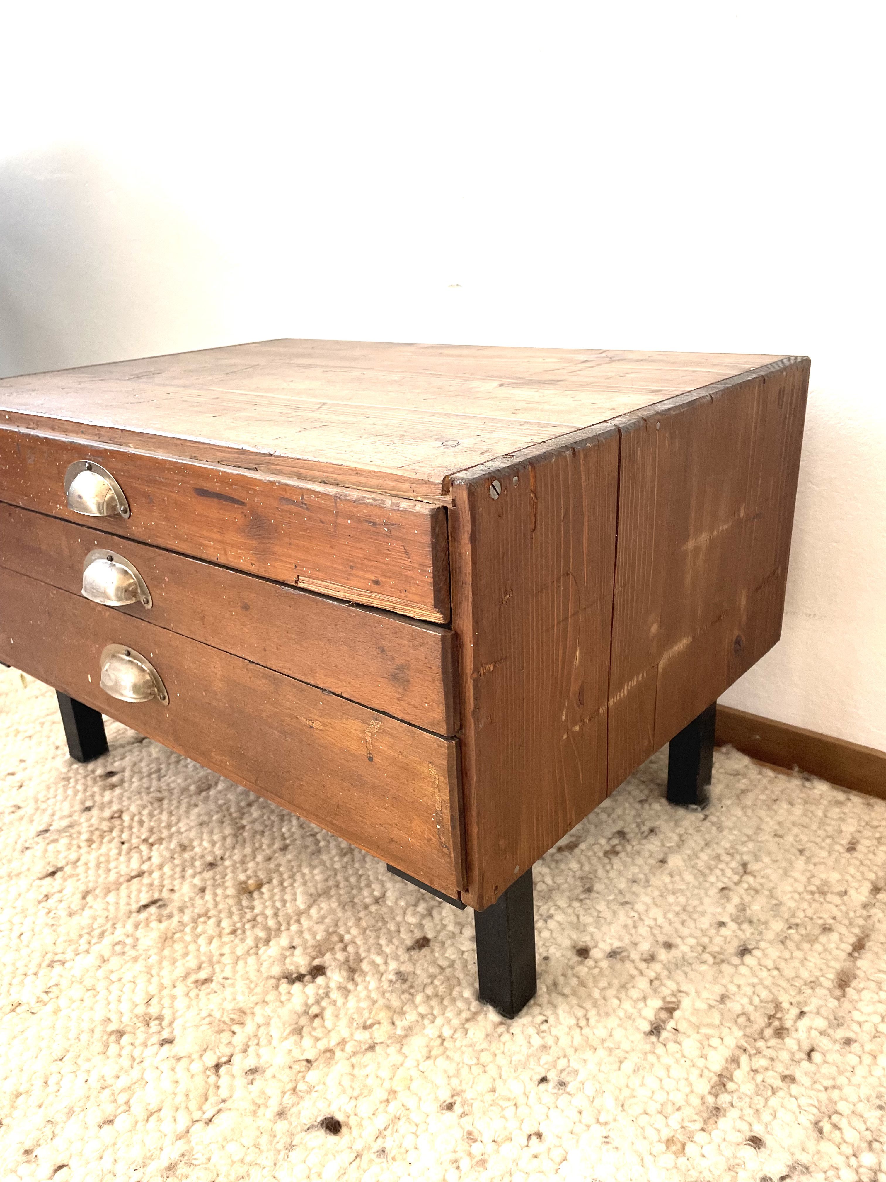Produit venduAncien meuble 3 tiroirs d’outillage détourné en petite table de chevet, ou bout de canapé avec 4 pieds en métal vintage.