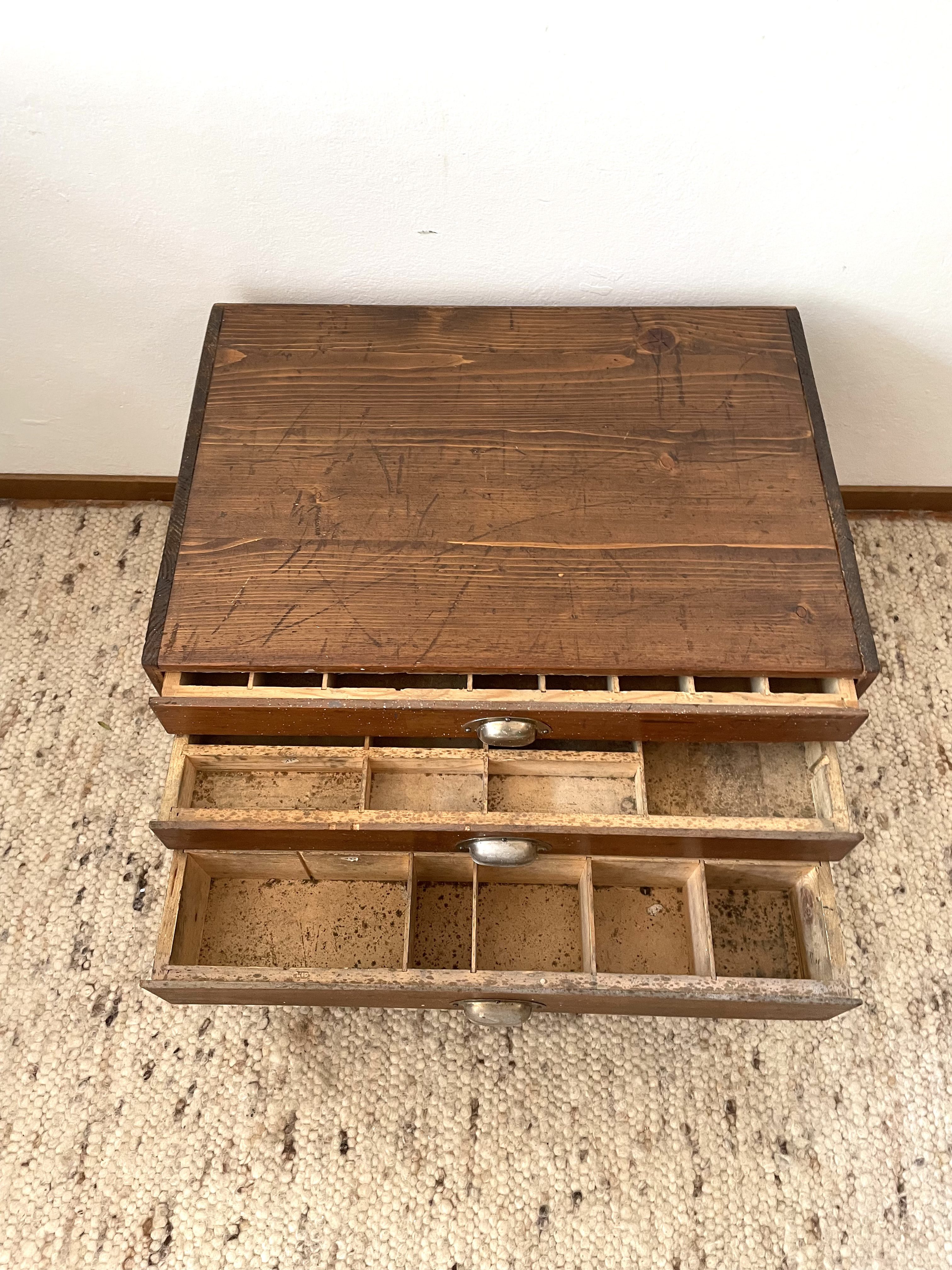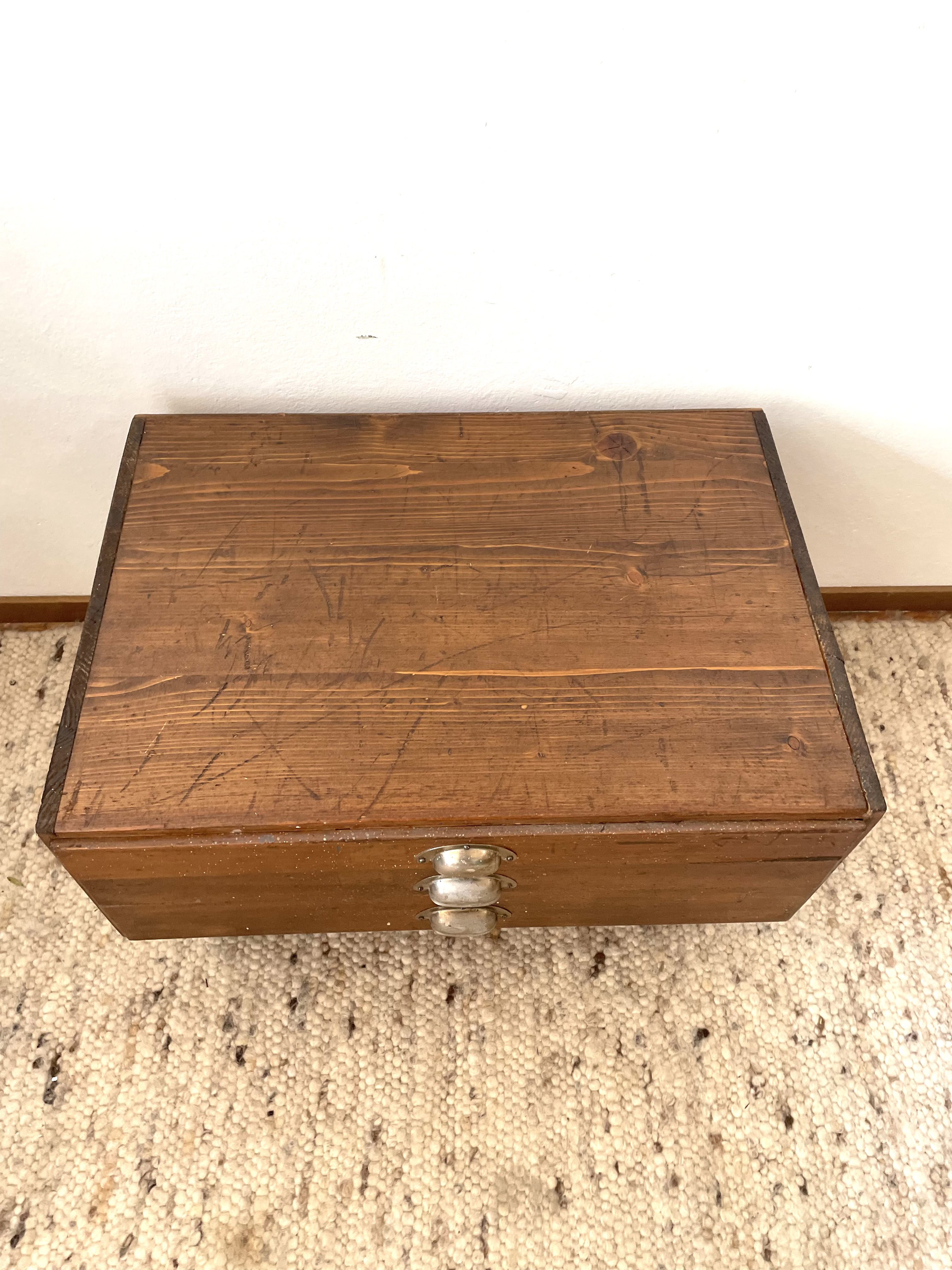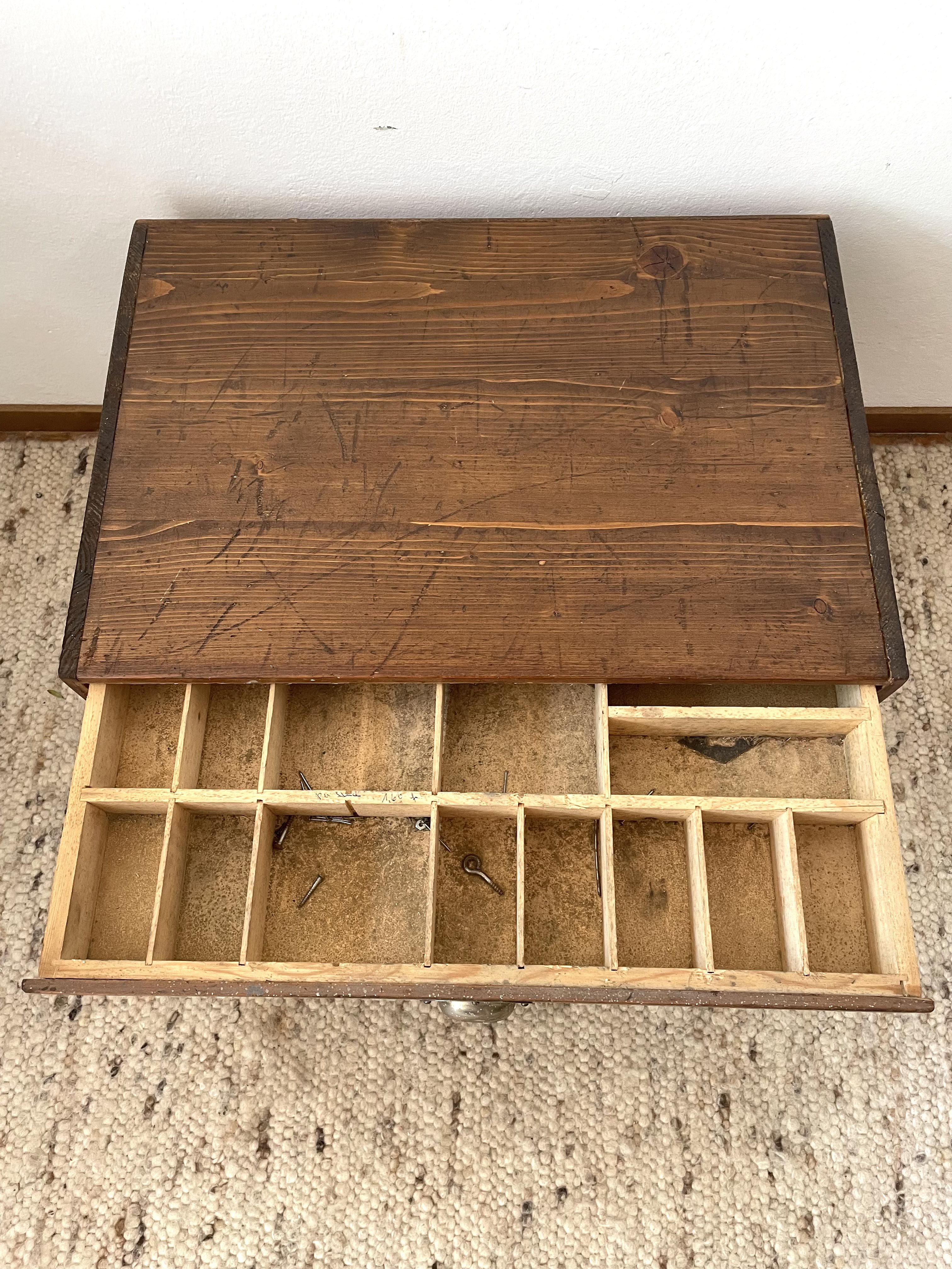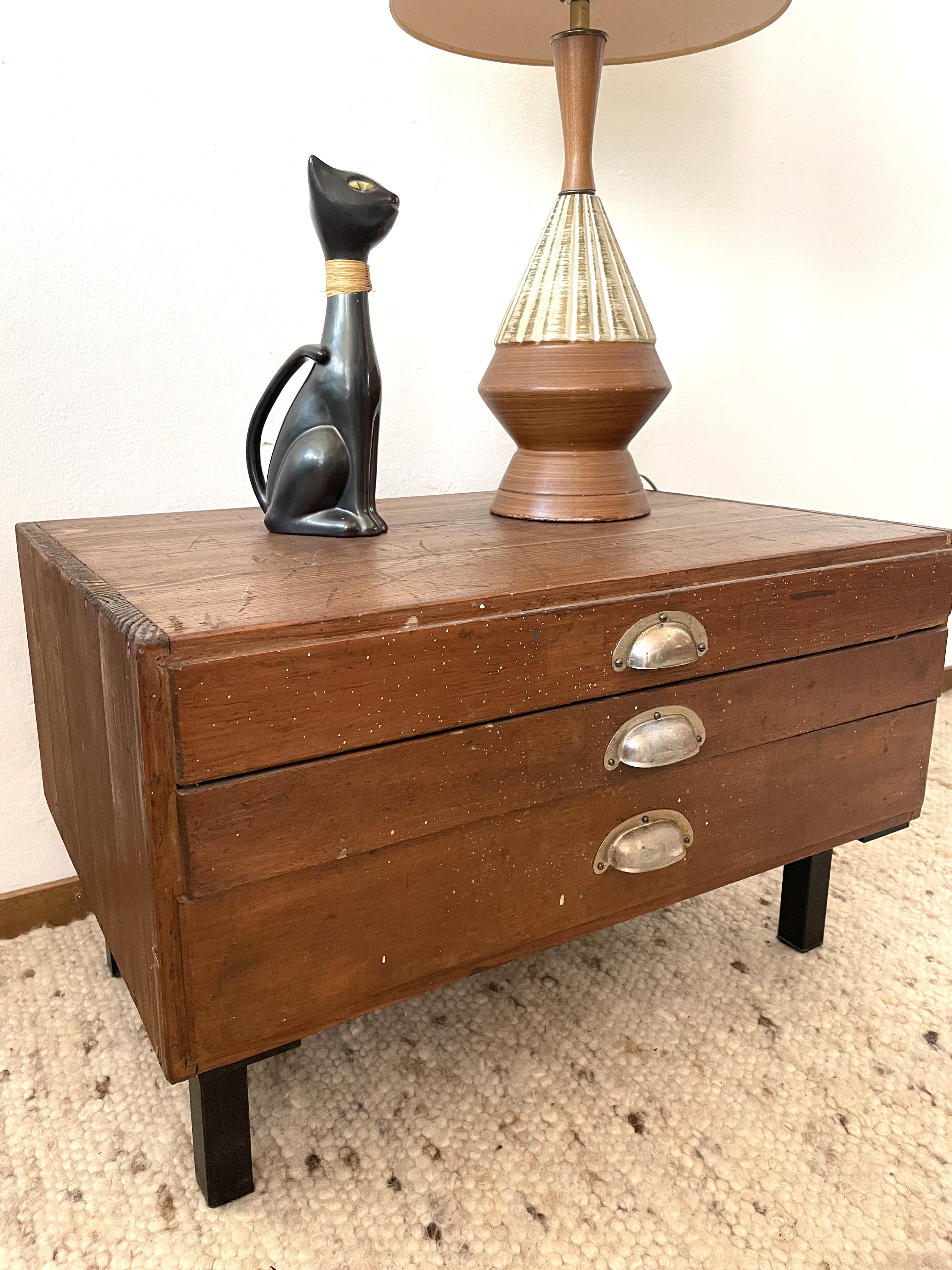 Produit venduAncien meuble 3 tiroirs d’outillage détourné en petite table de chevet, ou bout de canapé avec 4 pieds en métal vintage.
