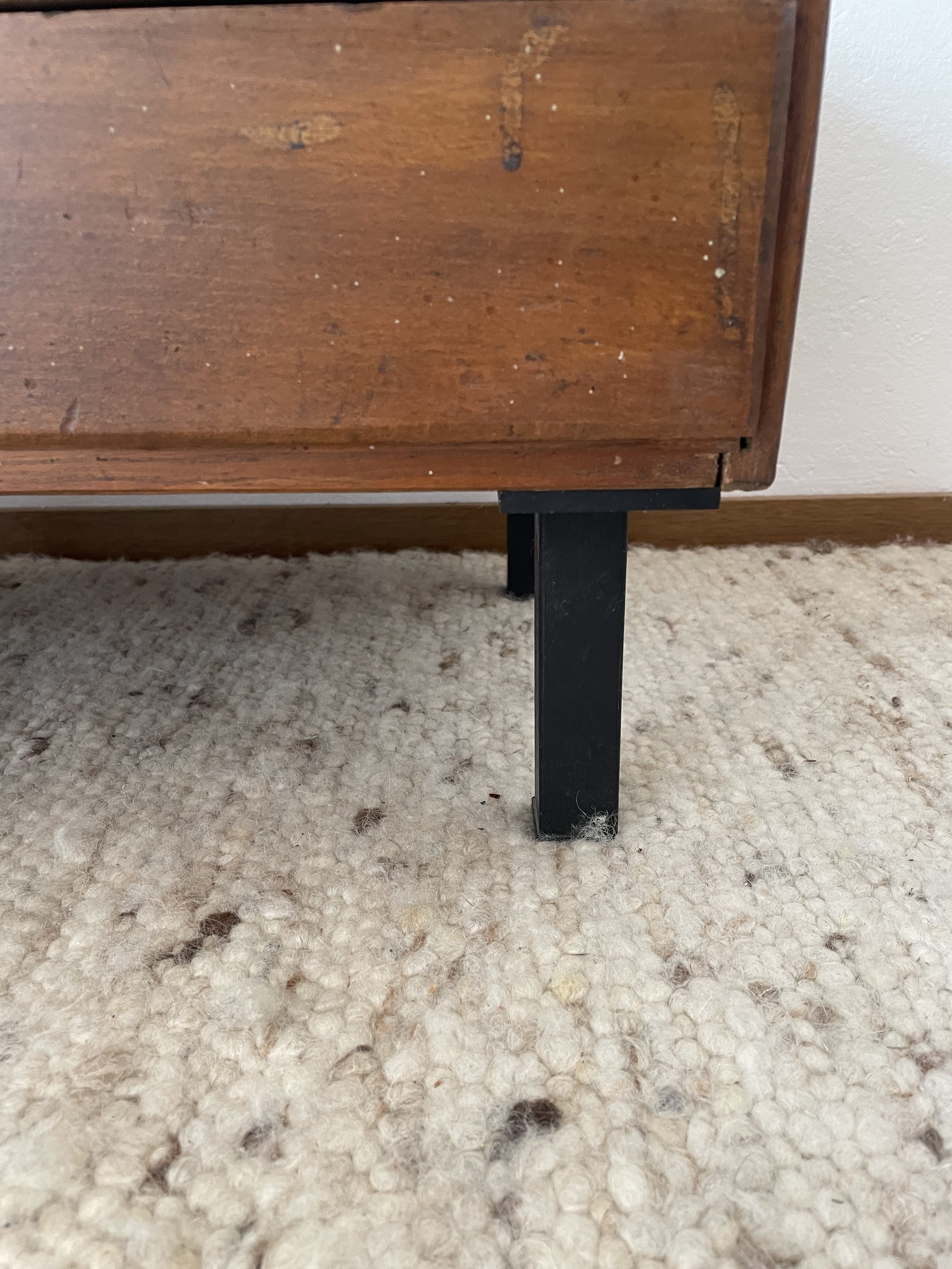 Le bois a été nettoyé puis grossièrement poncé et reteinté.