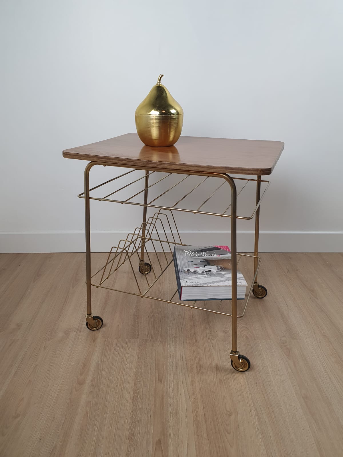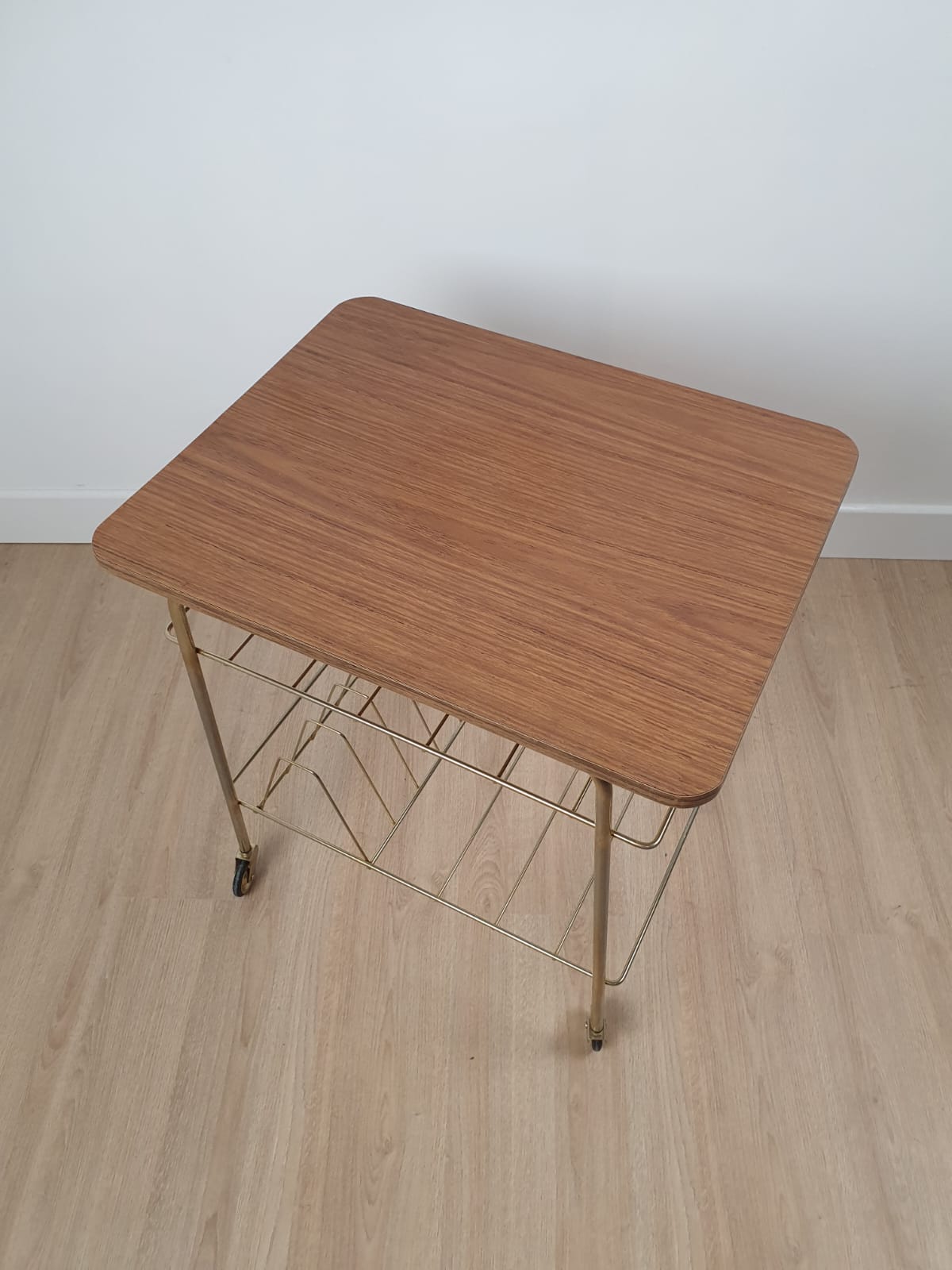 Produit venduMeuble d’appoint en laiton et formica à roulettes des années 60