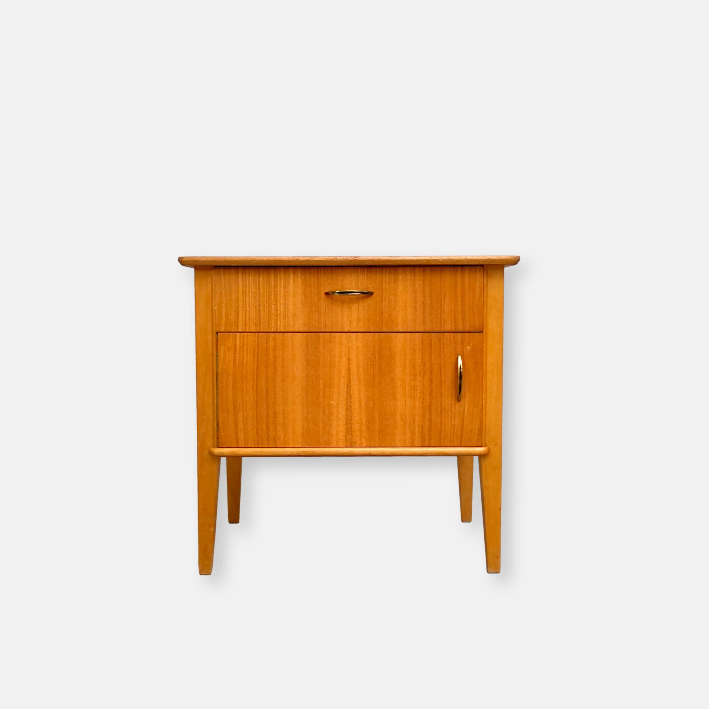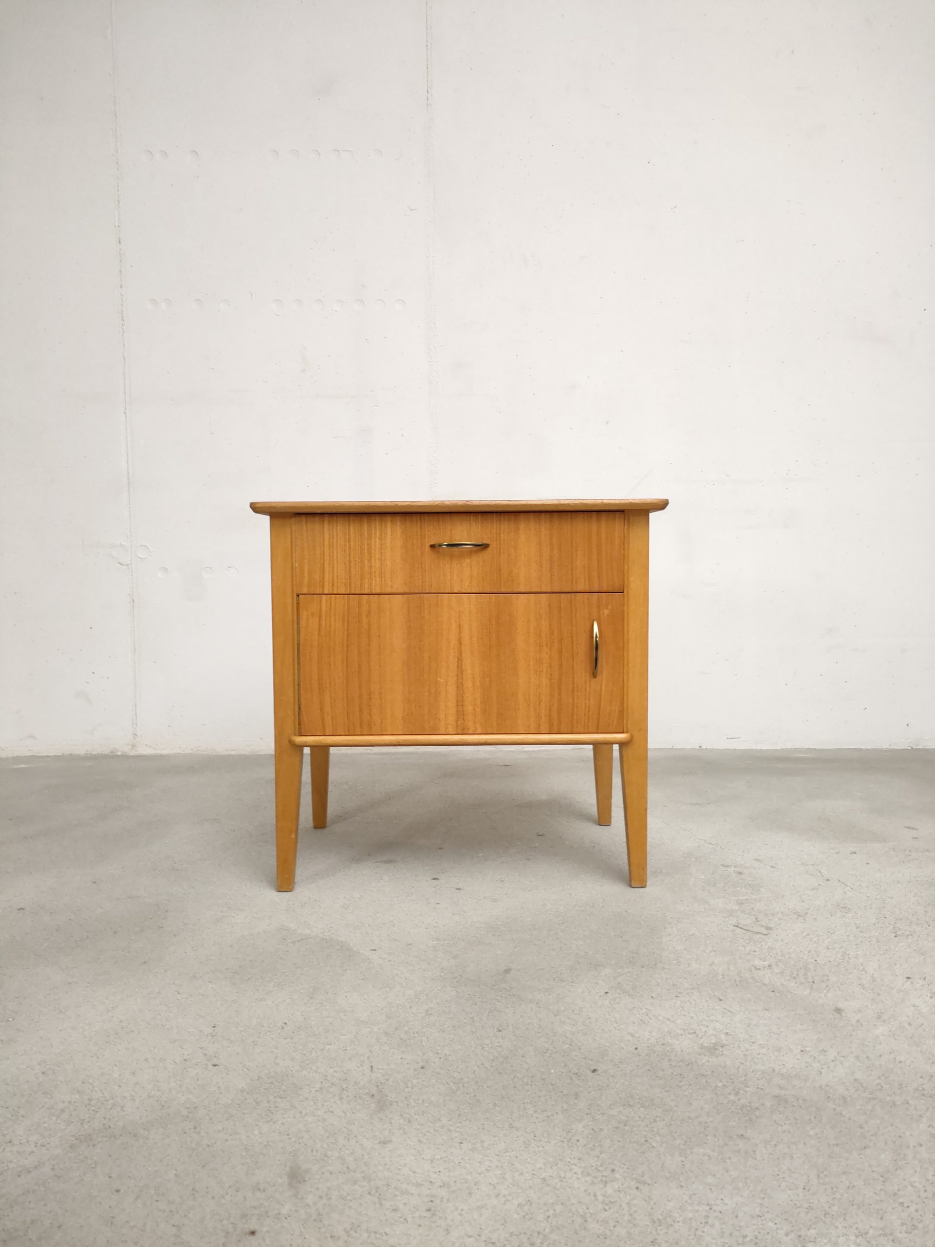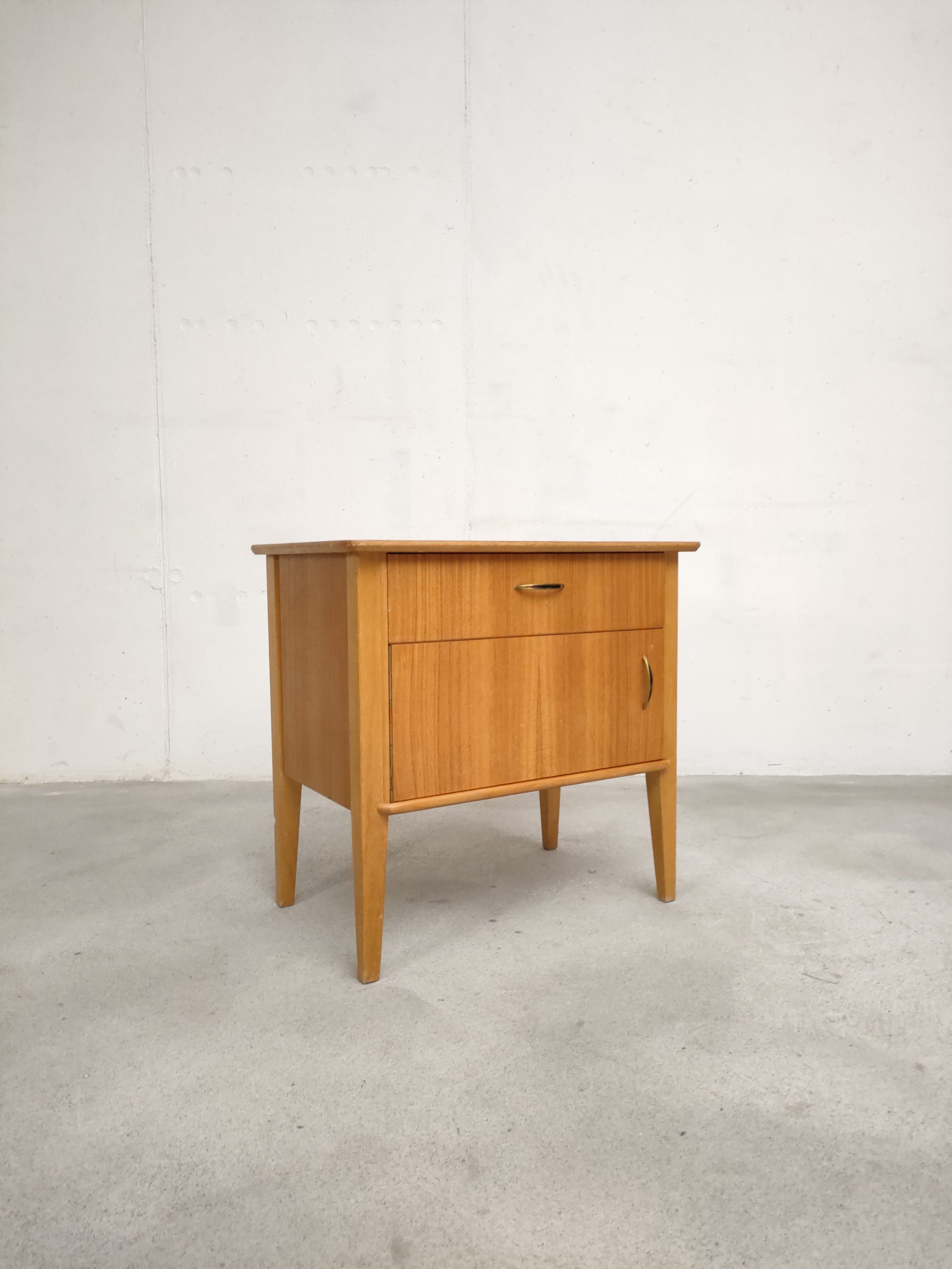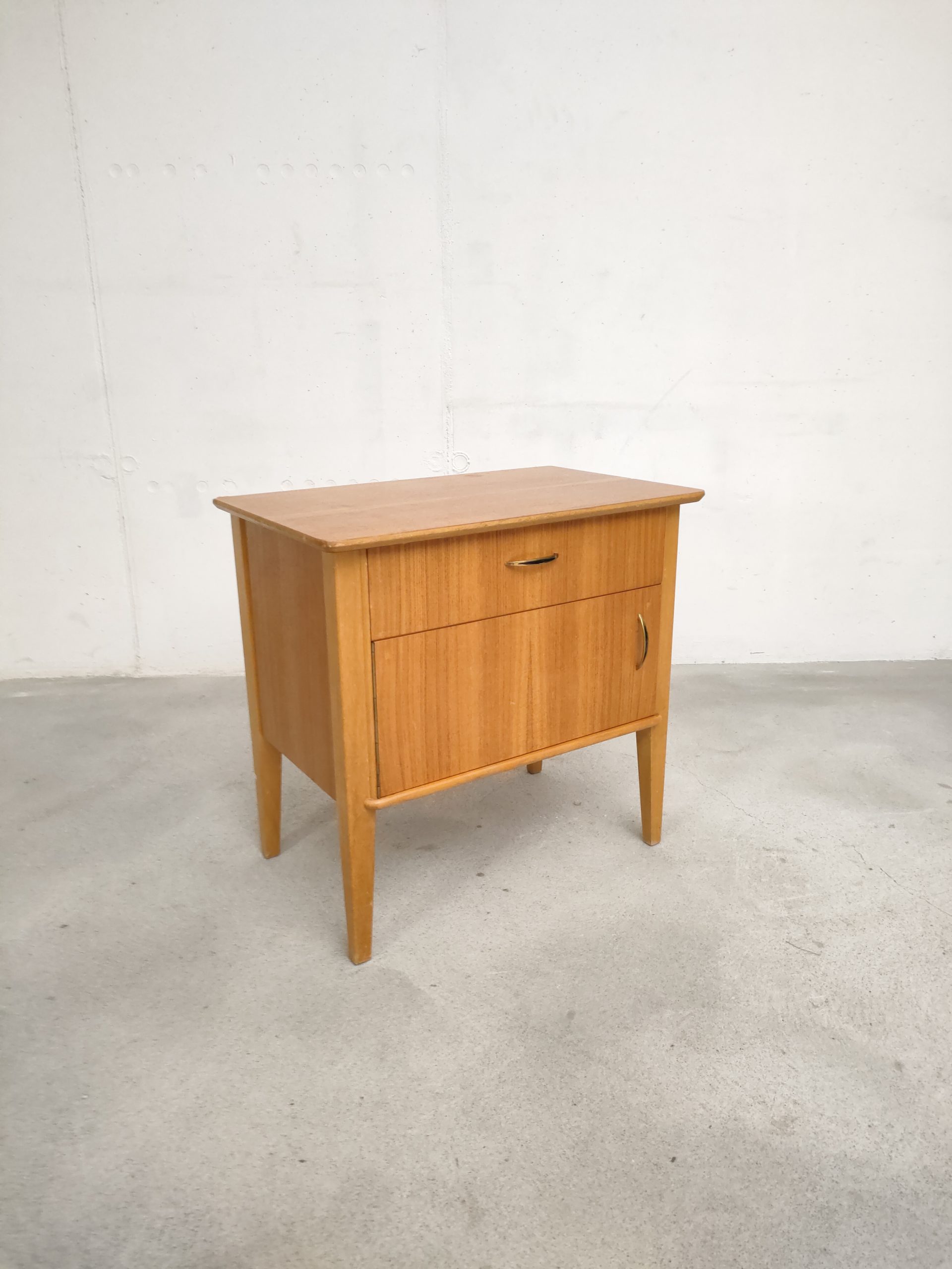 Produit venduTable de nuit vintage doté d’un tiroir et d’un espace de rangement avec porte avec poignées en métal doré. Plusieurs traces d’usure et d temps sont présentes (voir photos) mais le meuble est stable et solide.