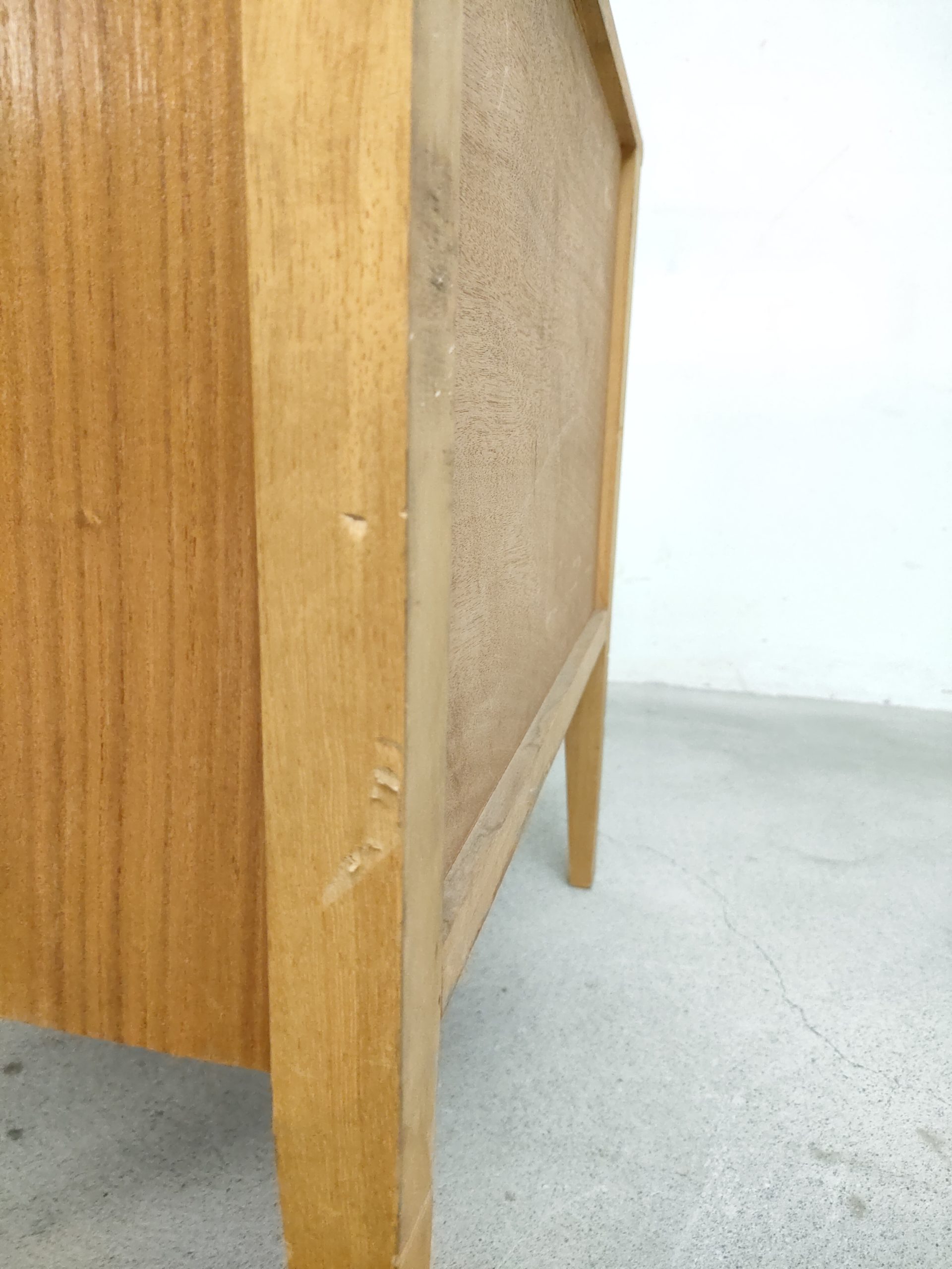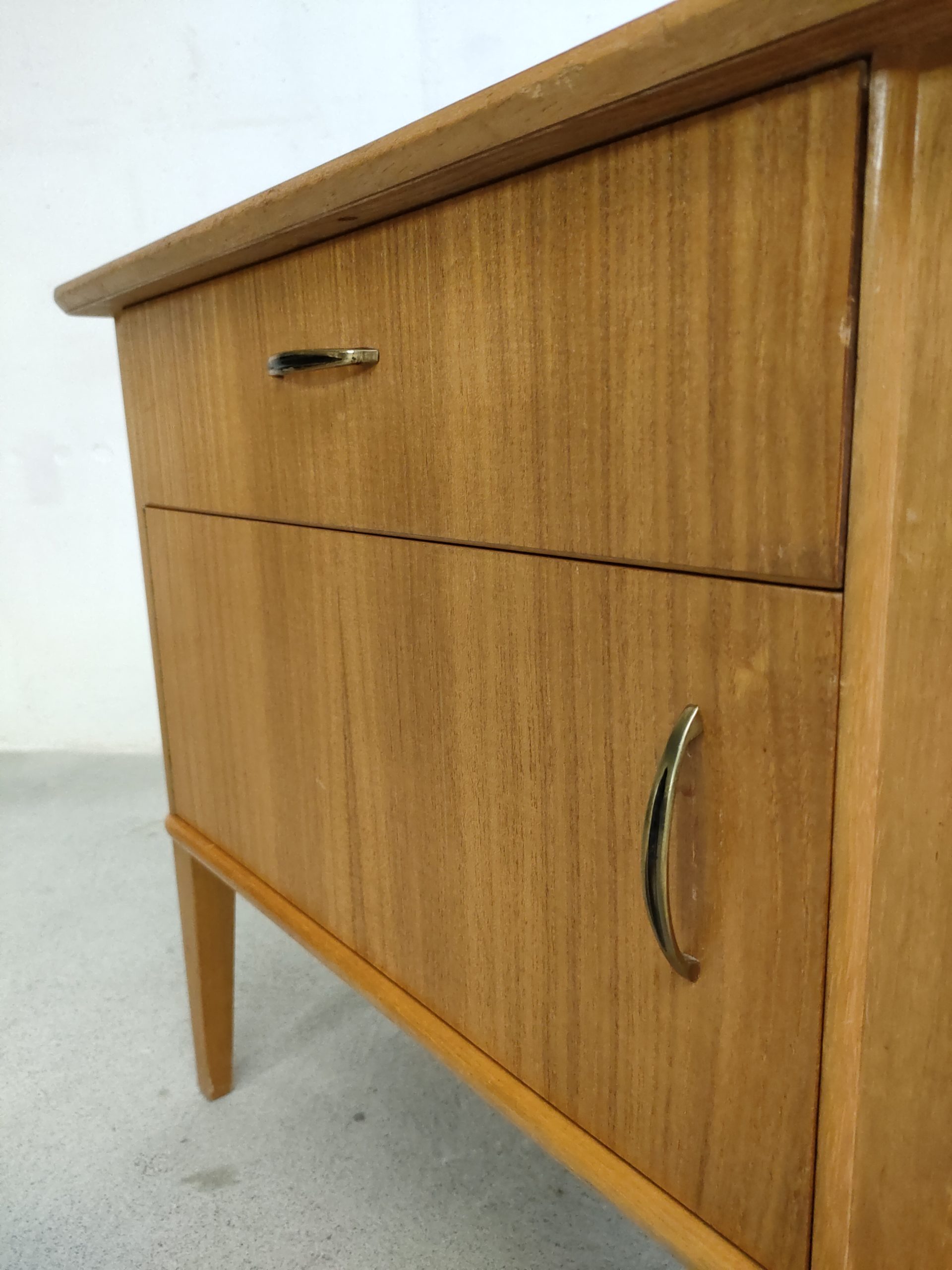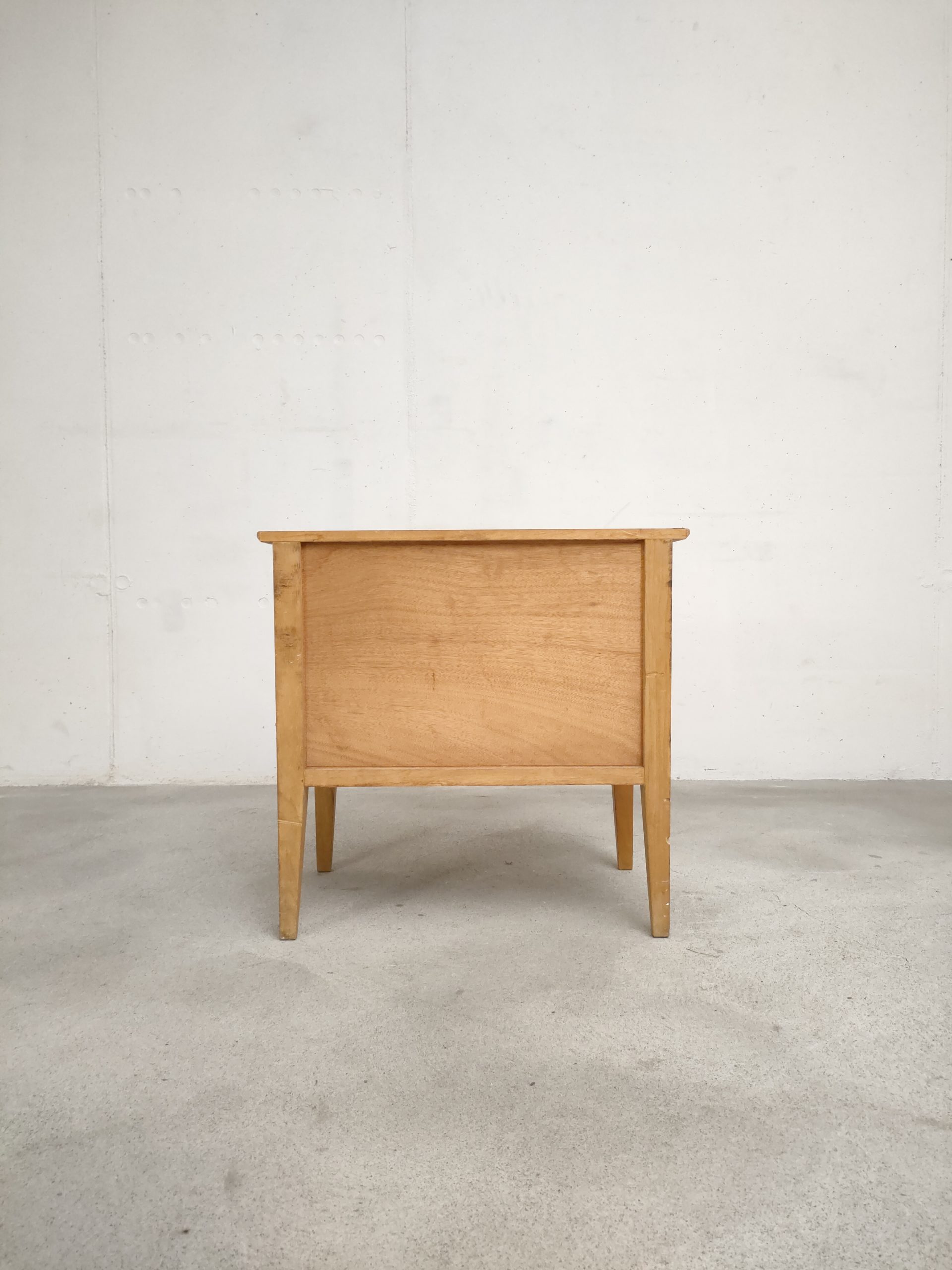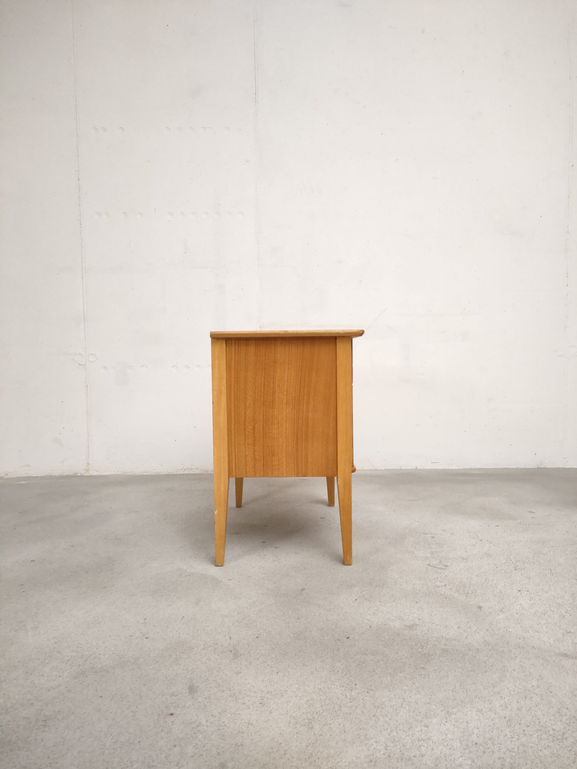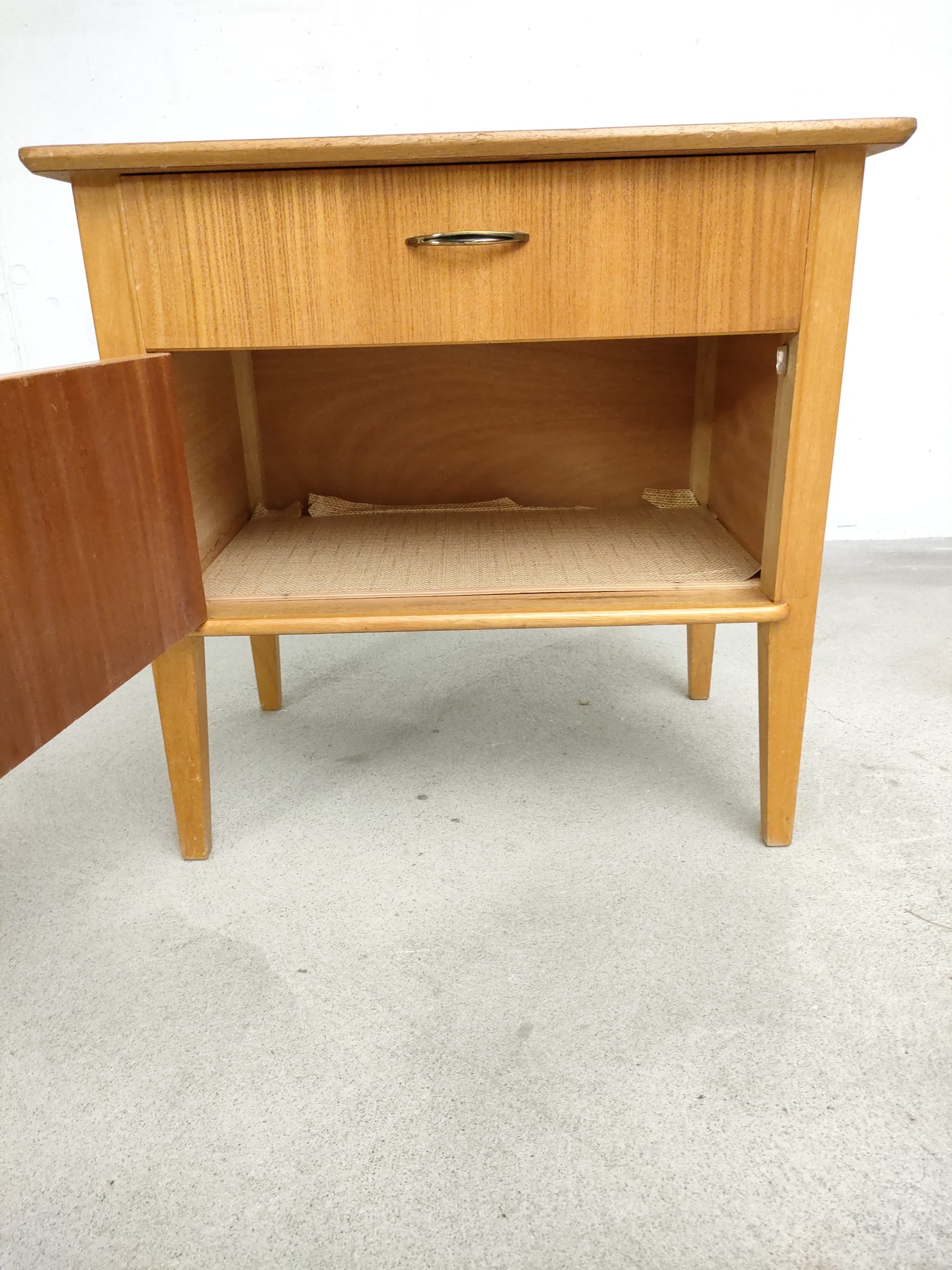 Produit venduTable de nuit vintage doté d’un tiroir et d’un espace de rangement avec porte avec poignées en métal doré. Plusieurs traces d’usure et d temps sont présentes (voir photos) mais le meuble est stable et solide.