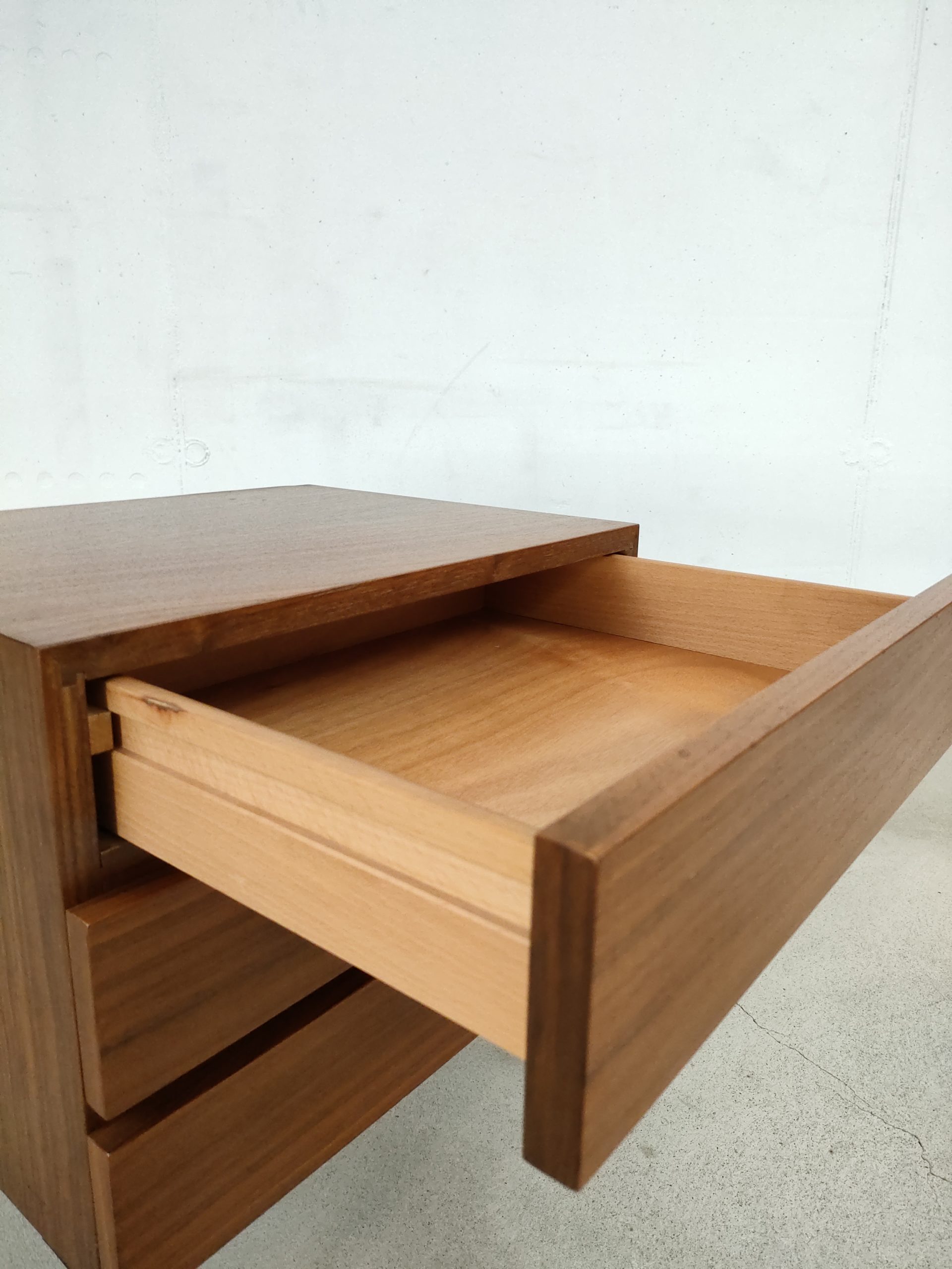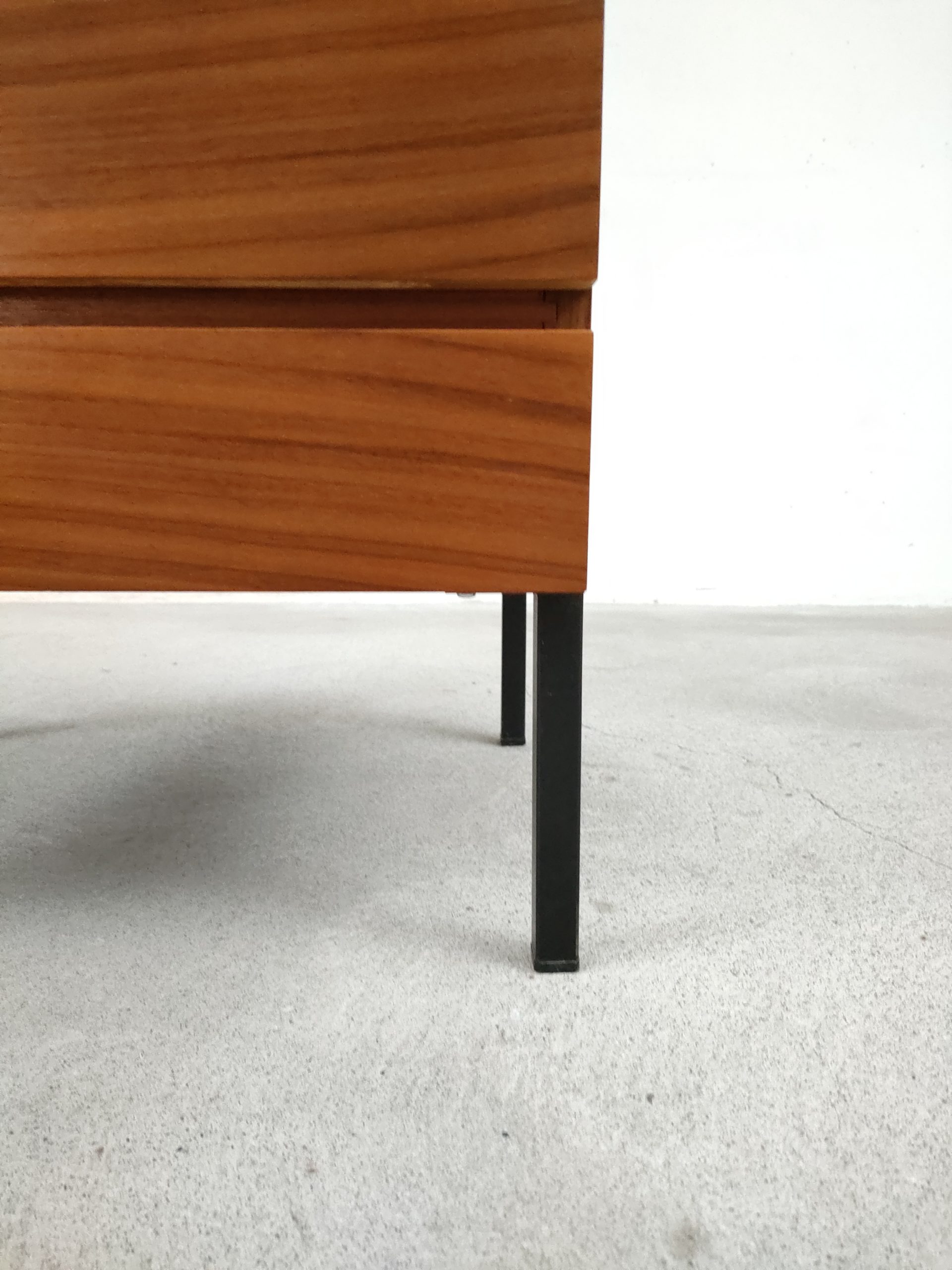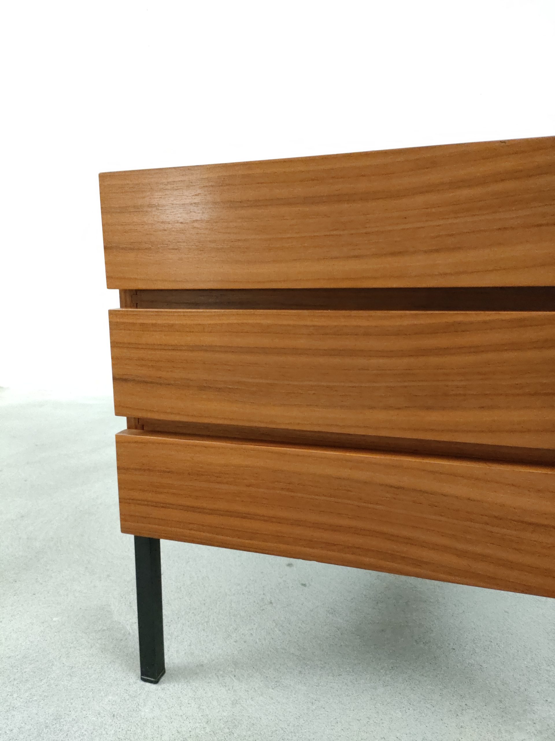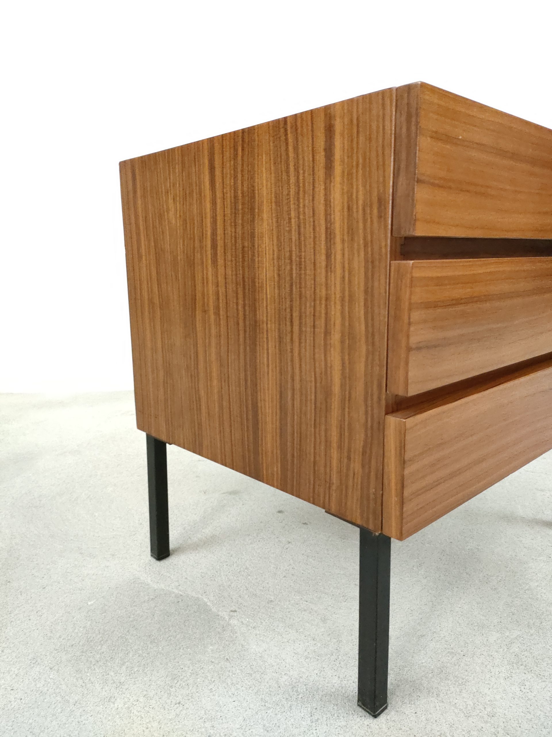Table de nuit vintage en bois avec pieds en métal noir. Dotée de trois tiroirs, elle peut aussi être utilisée comme petit meuble de rangement. Quelques traces d’usure sur le bois (voir photos). Stable et solide et très élégante avec ses lignes minimalistes.