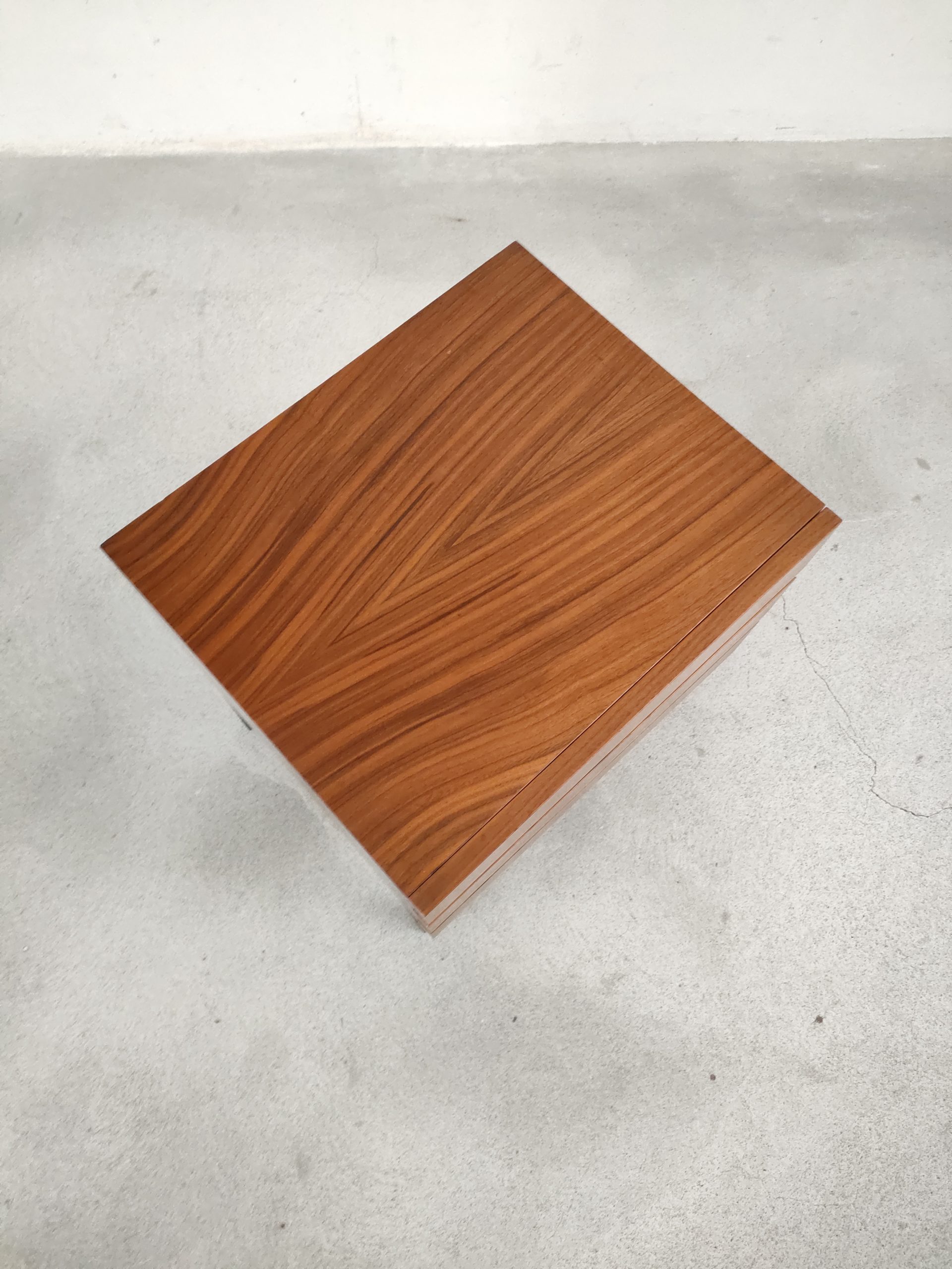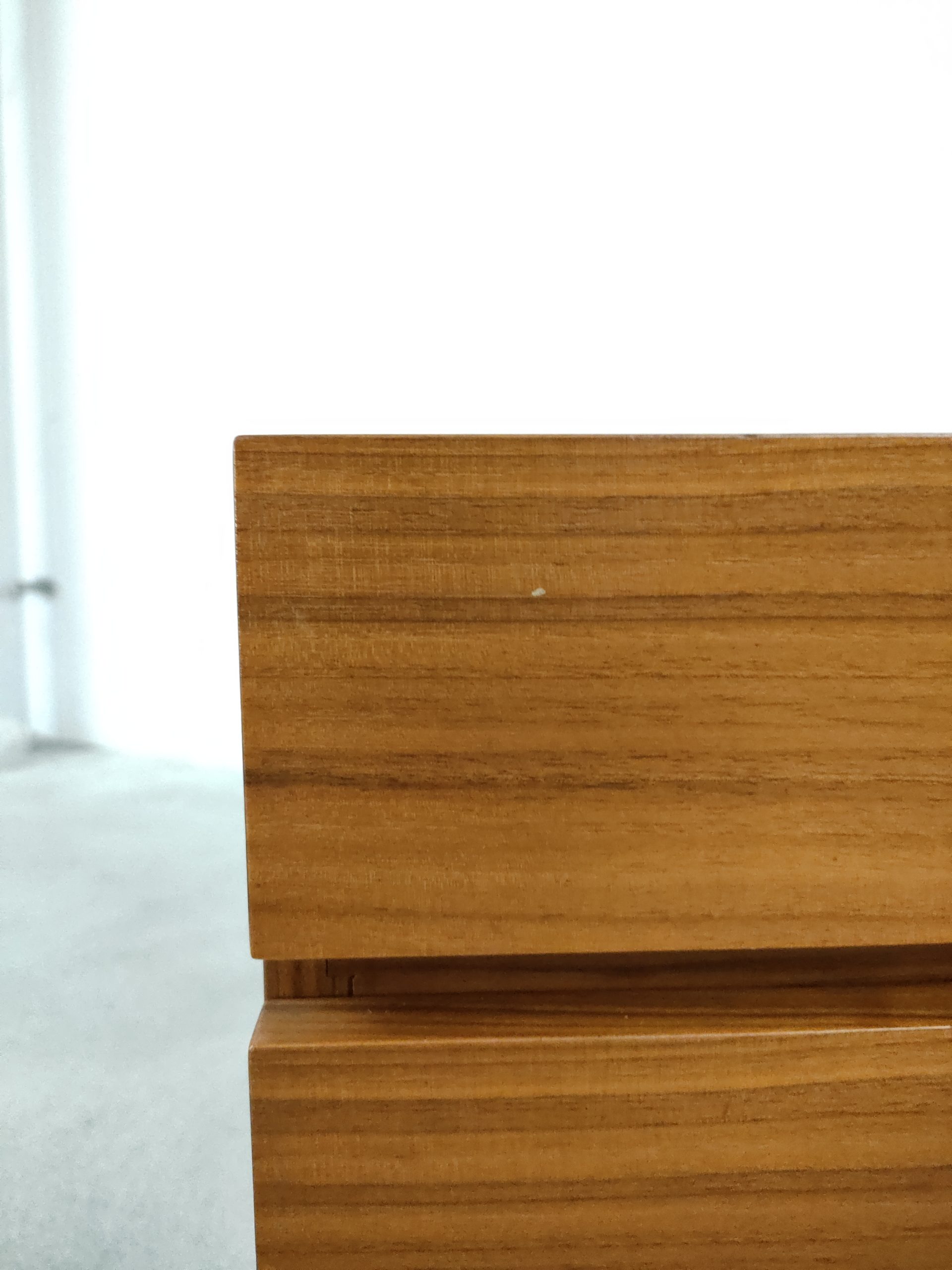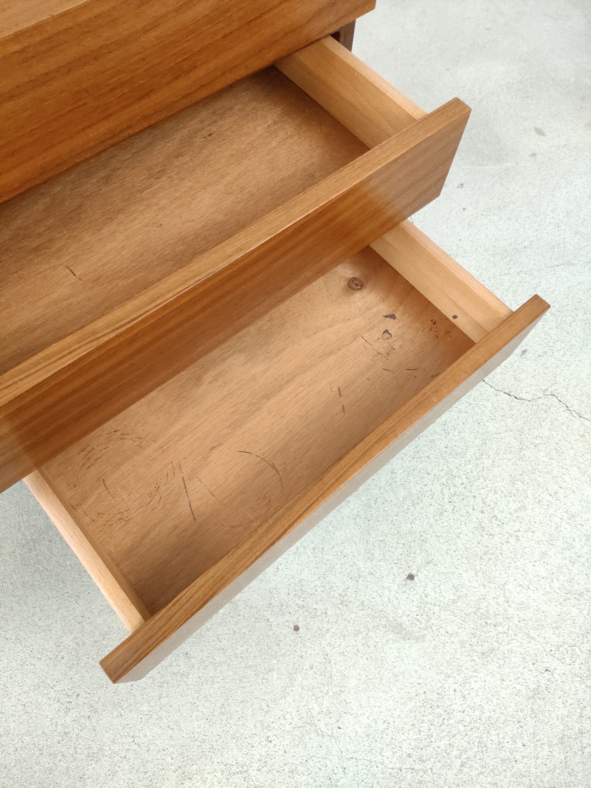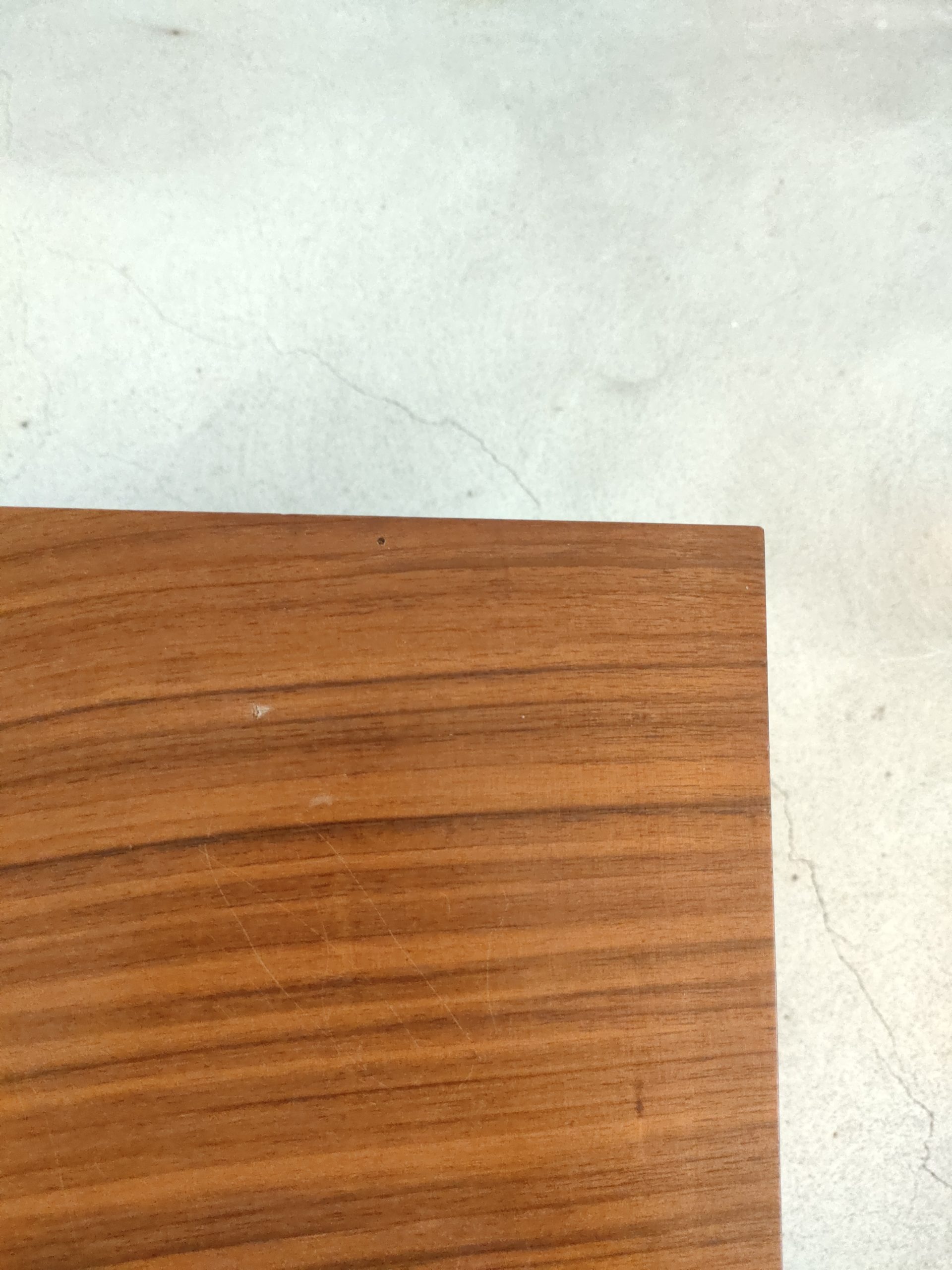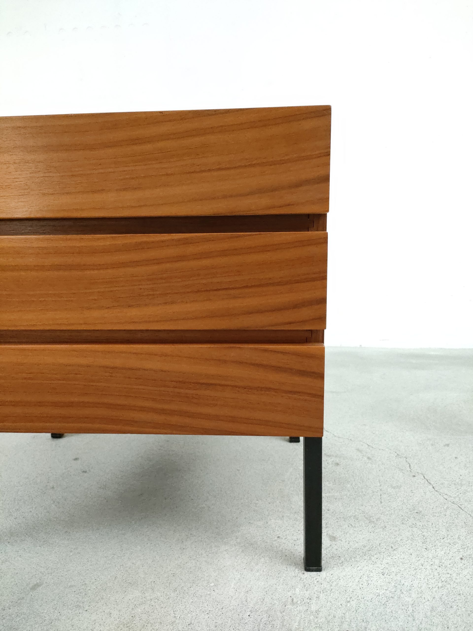 Table de nuit vintage en bois avec pieds en métal noir. Dotée de trois tiroirs, elle peut aussi être utilisée comme petit meuble de rangement. Quelques traces d’usure sur le bois (voir photos). Stable et solide et très élégante avec ses lignes minimalistes.