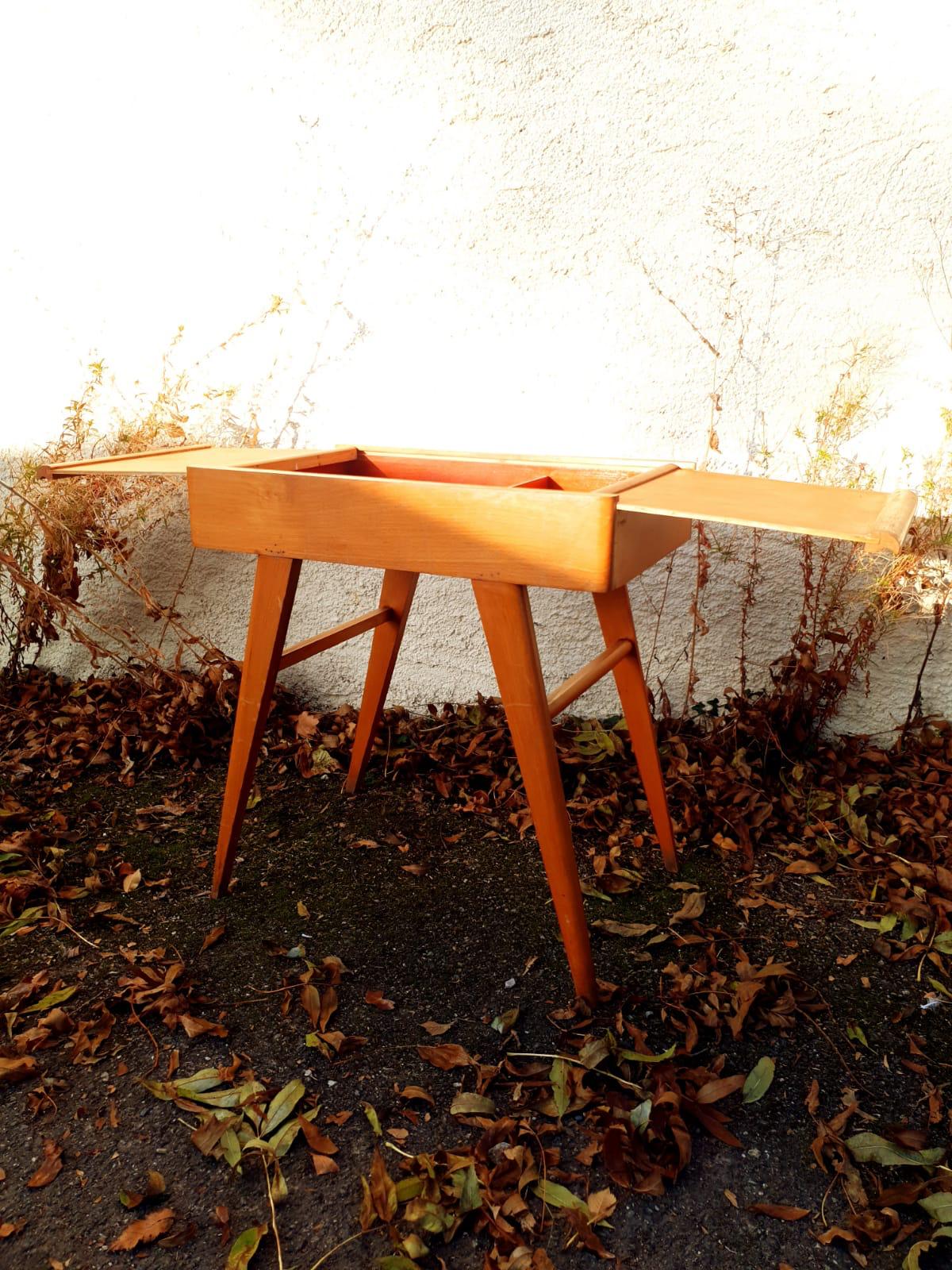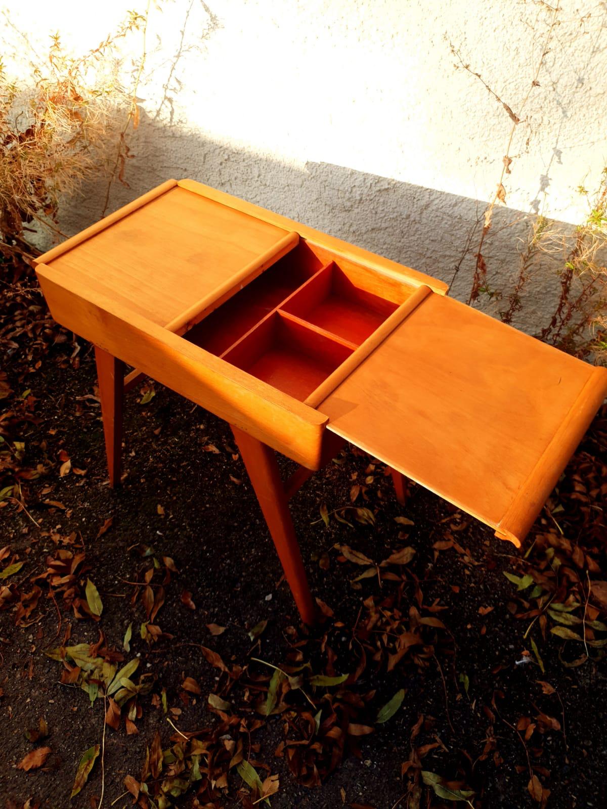 Travailleuse ou meuble d’appoint des années 60 en bois avec rangements.