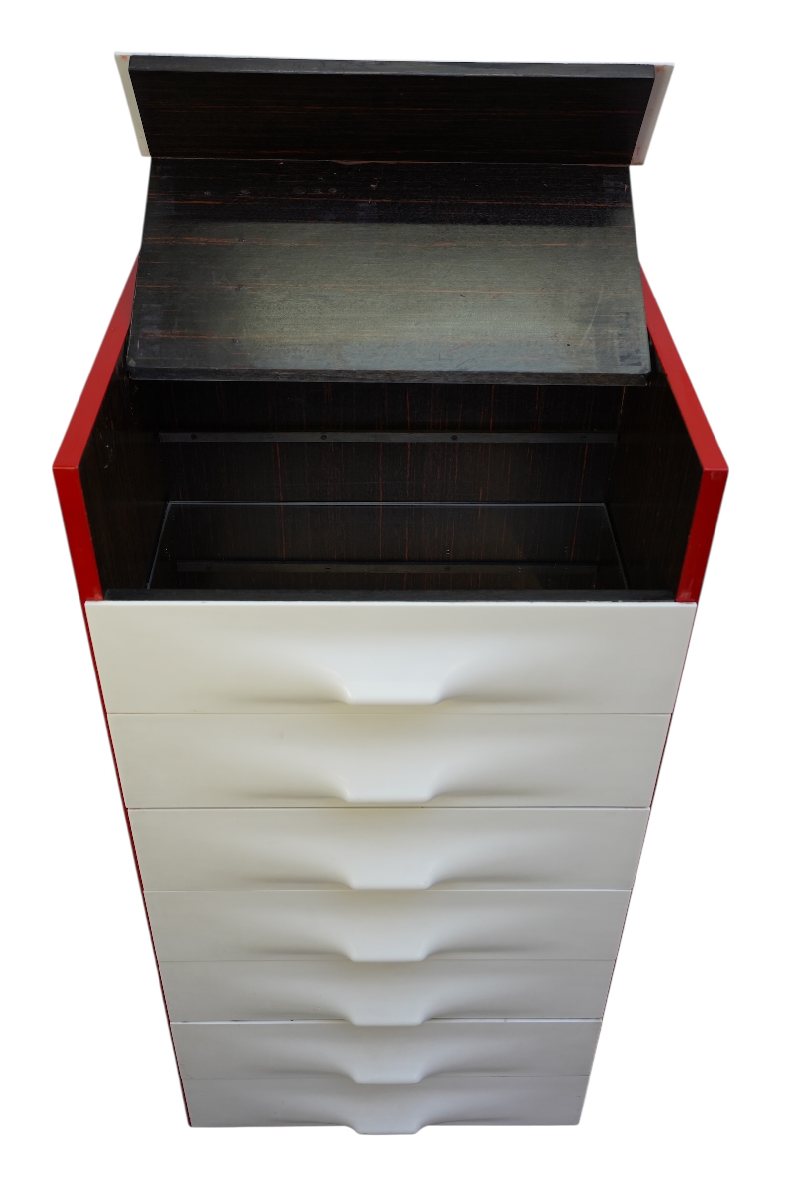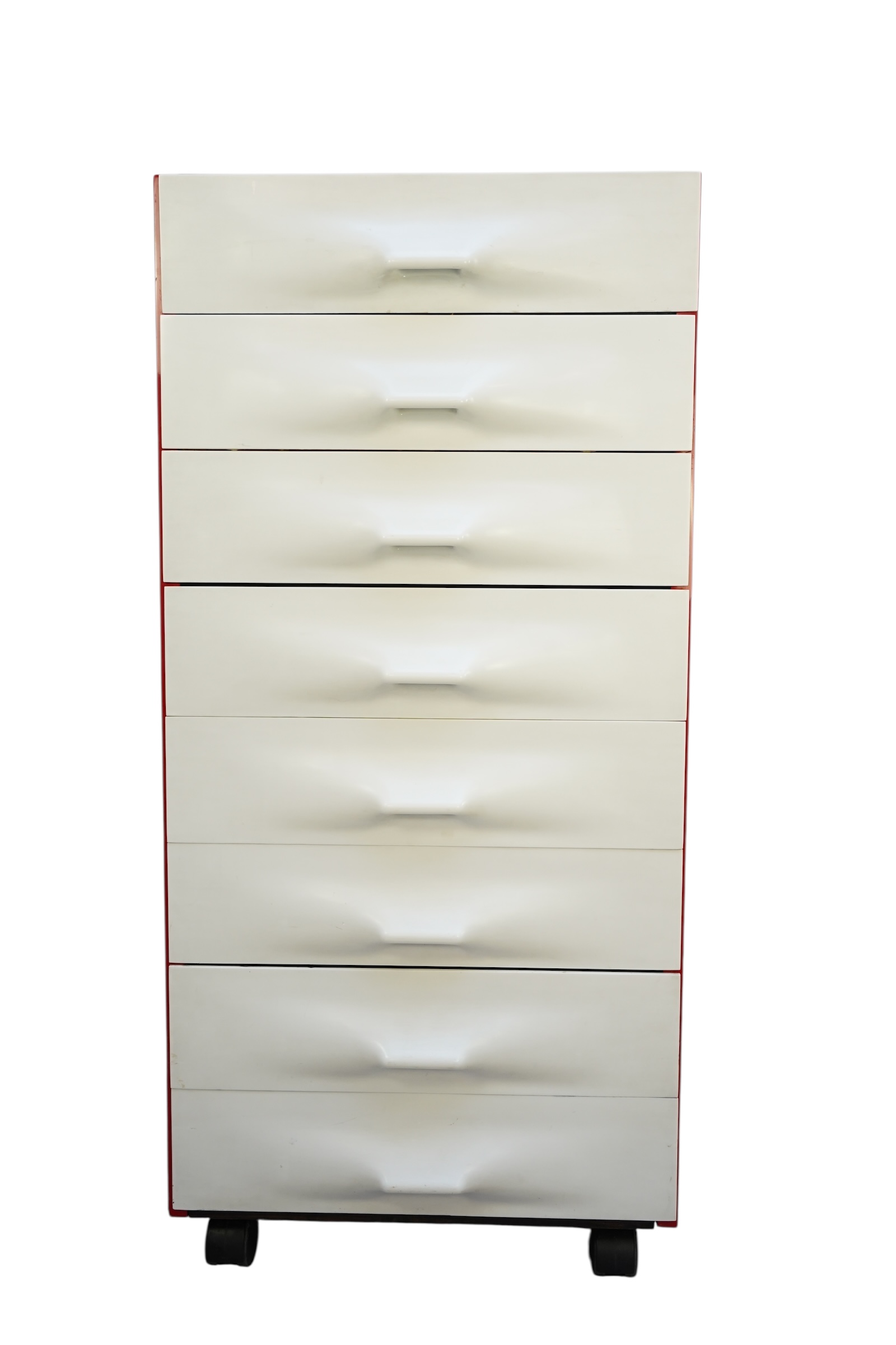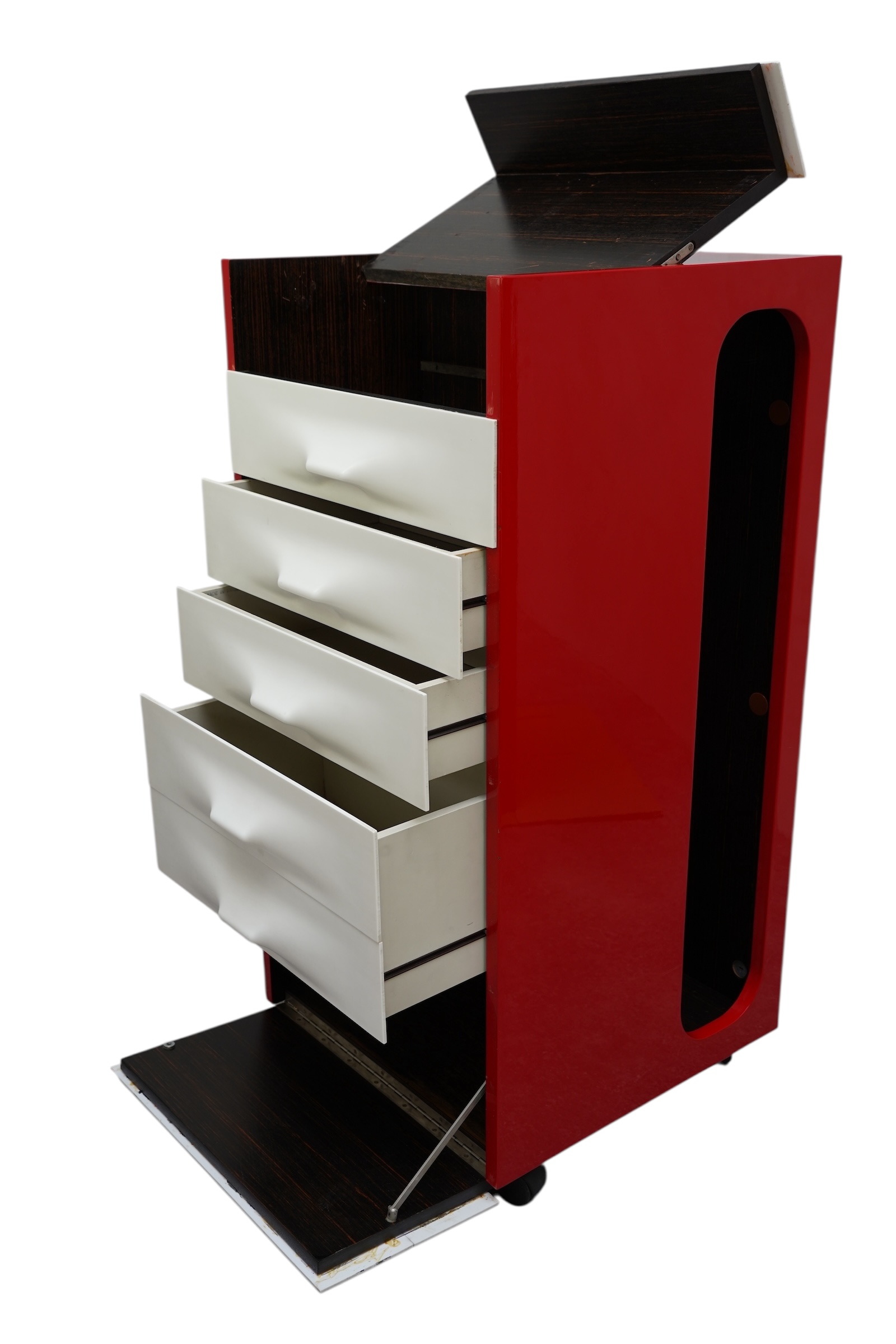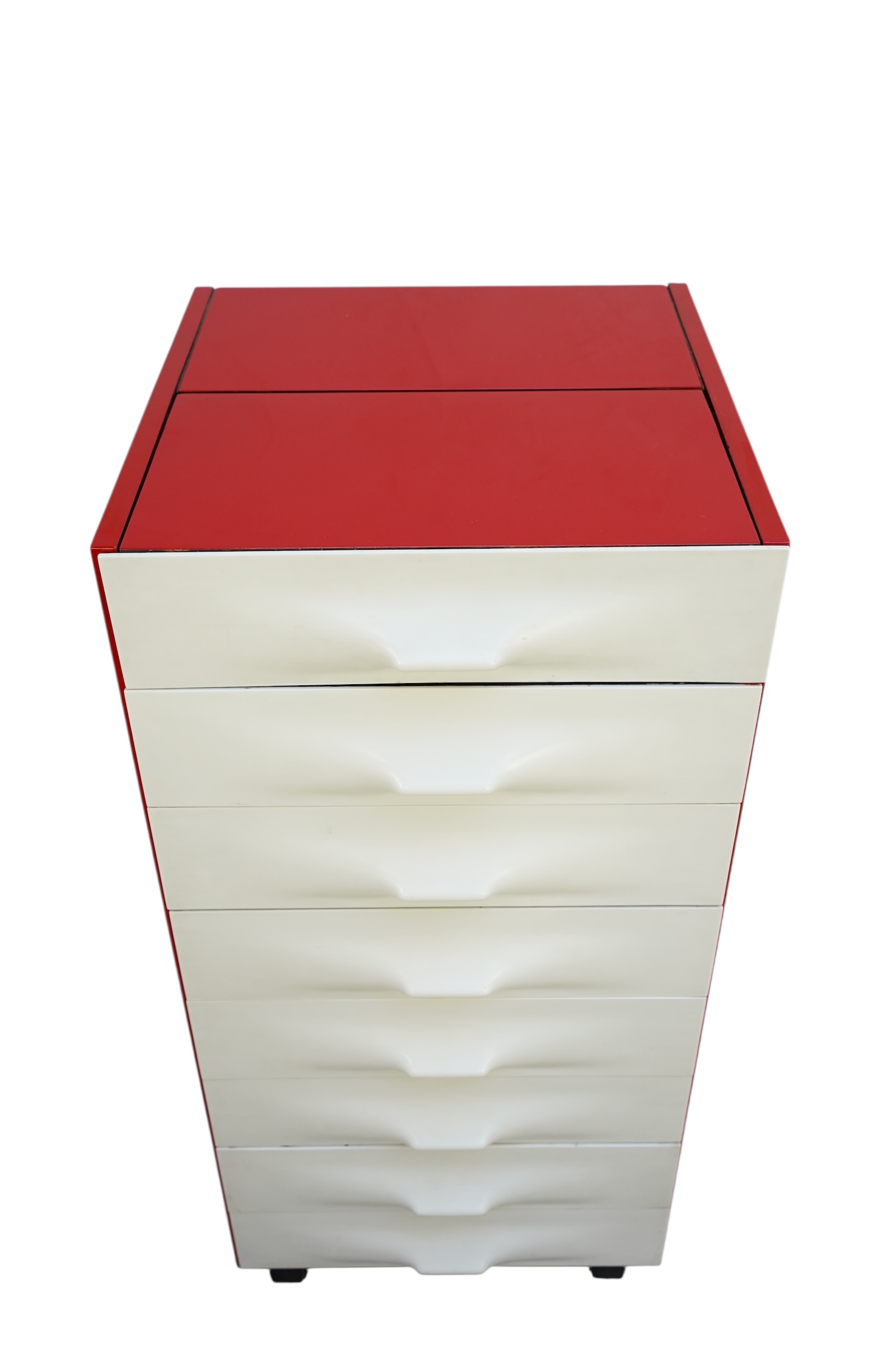 Unité mobile de rangement, Valet-semainier en bois stratifié et methacrylène laqué de couleur rouge munie de 8 façades en plastique moulé blanc. Cette coiffeuse offre divers espaces de rangement le tiroir supérieur révele un miroir et un casier, puis 4 tiroirs coulissants, un double tiroir, et un espace à ouverture horizontale. Ce meuble sur roulette dispose sur la partie latérale d’une penderie. Cette merveille de Raymond Loewy fut conçue pour la CEI (Compagnie d’Esthétique Industrielle) en 1980’s. Edition : DOUBINSKY FRERES.
