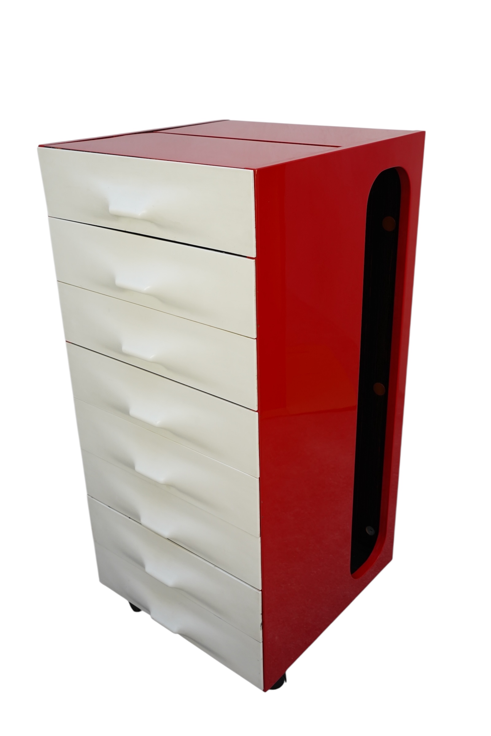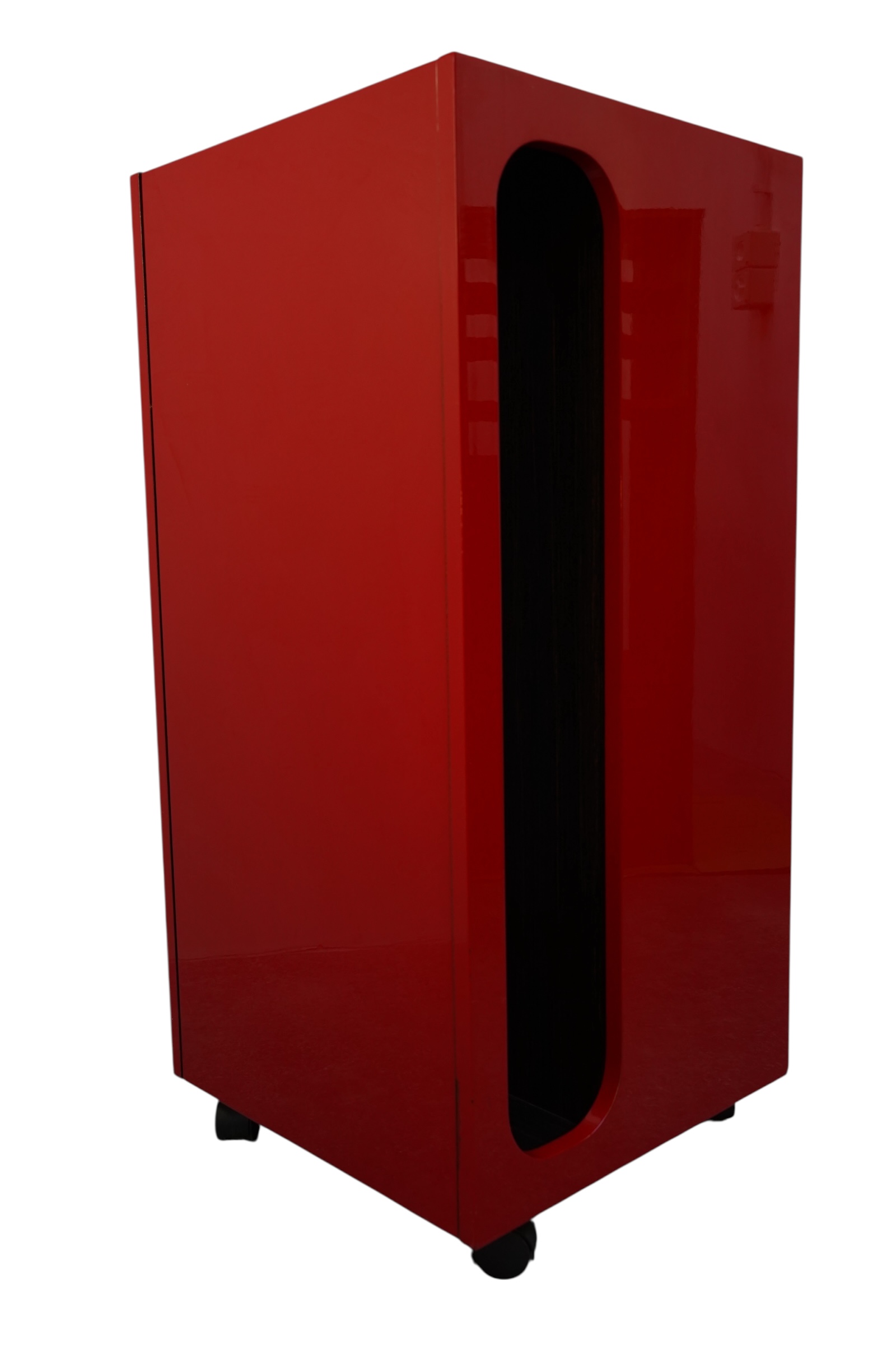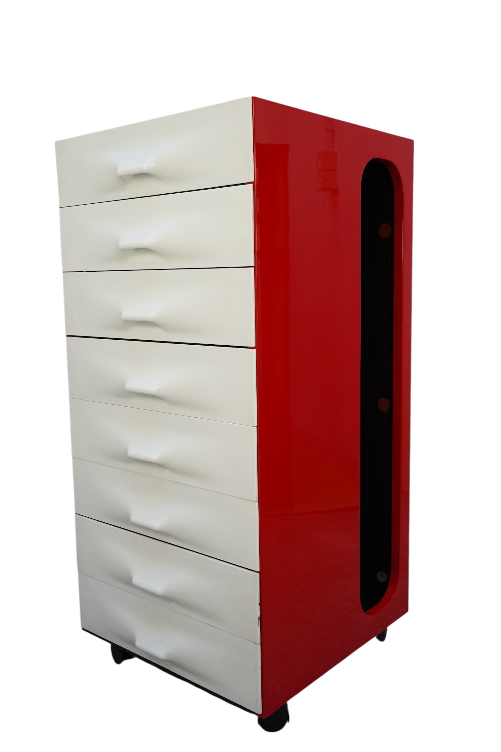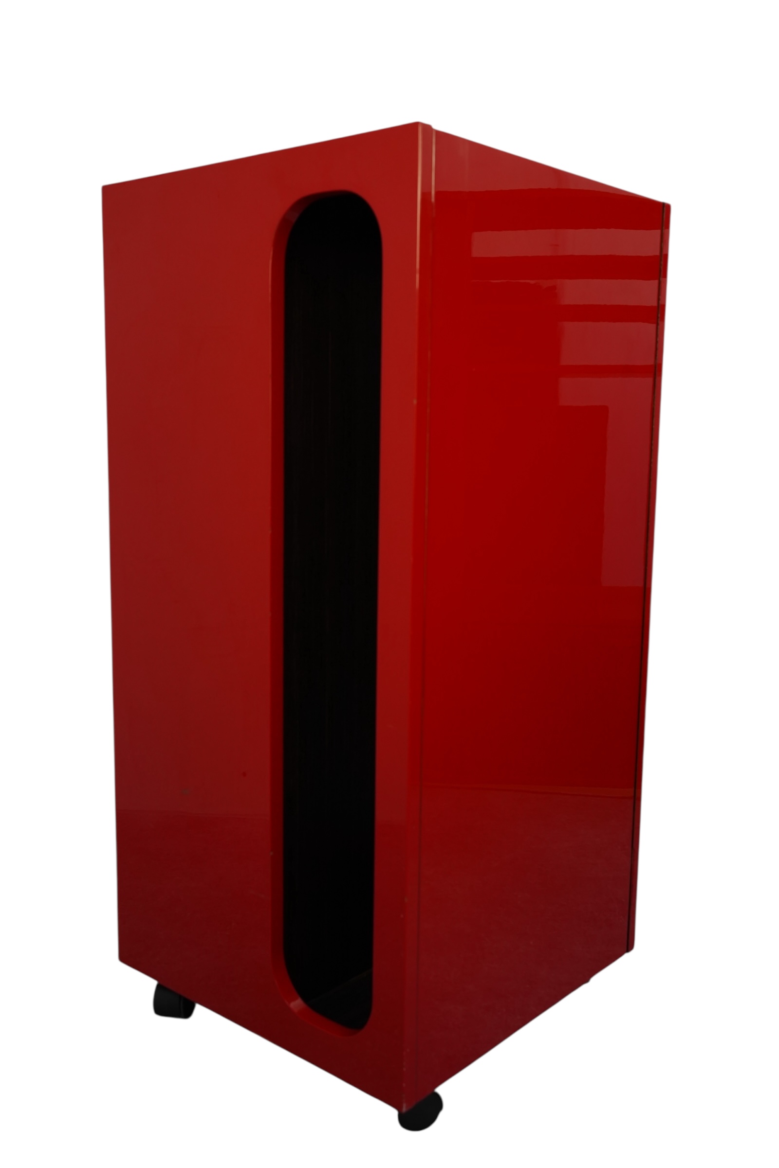 Unité mobile de rangement, Valet-semainier en bois stratifié et methacrylène laqué de couleur rouge munie de 8 façades en plastique moulé blanc. Cette coiffeuse offre divers espaces de rangement le tiroir supérieur révele un miroir et un casier, puis 4 tiroirs coulissants, un double tiroir, et un espace à ouverture horizontale. Ce meuble sur roulette dispose sur la partie latérale d’une penderie. Cette merveille de Raymond Loewy fut conçue pour la CEI (Compagnie d’Esthétique Industrielle) en 1980’s. Edition : DOUBINSKY FRERES.