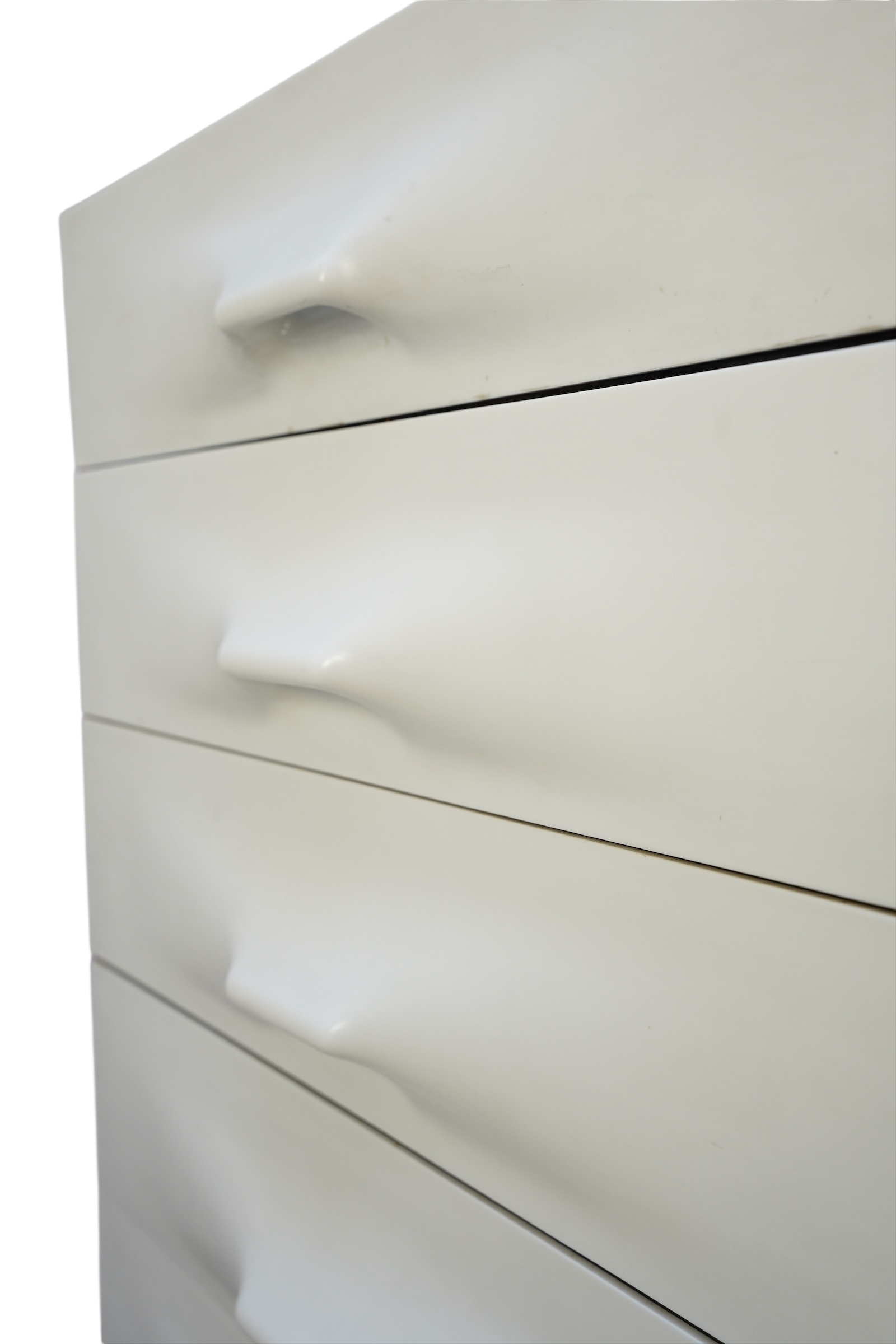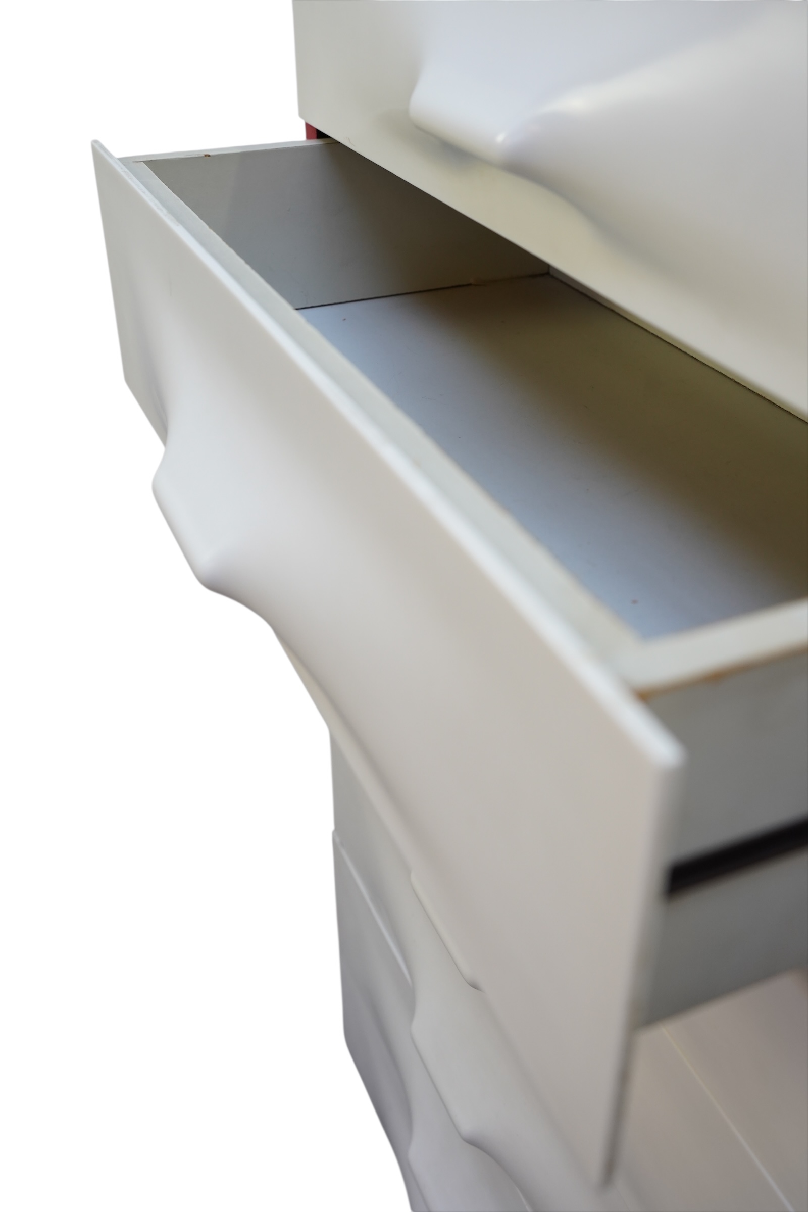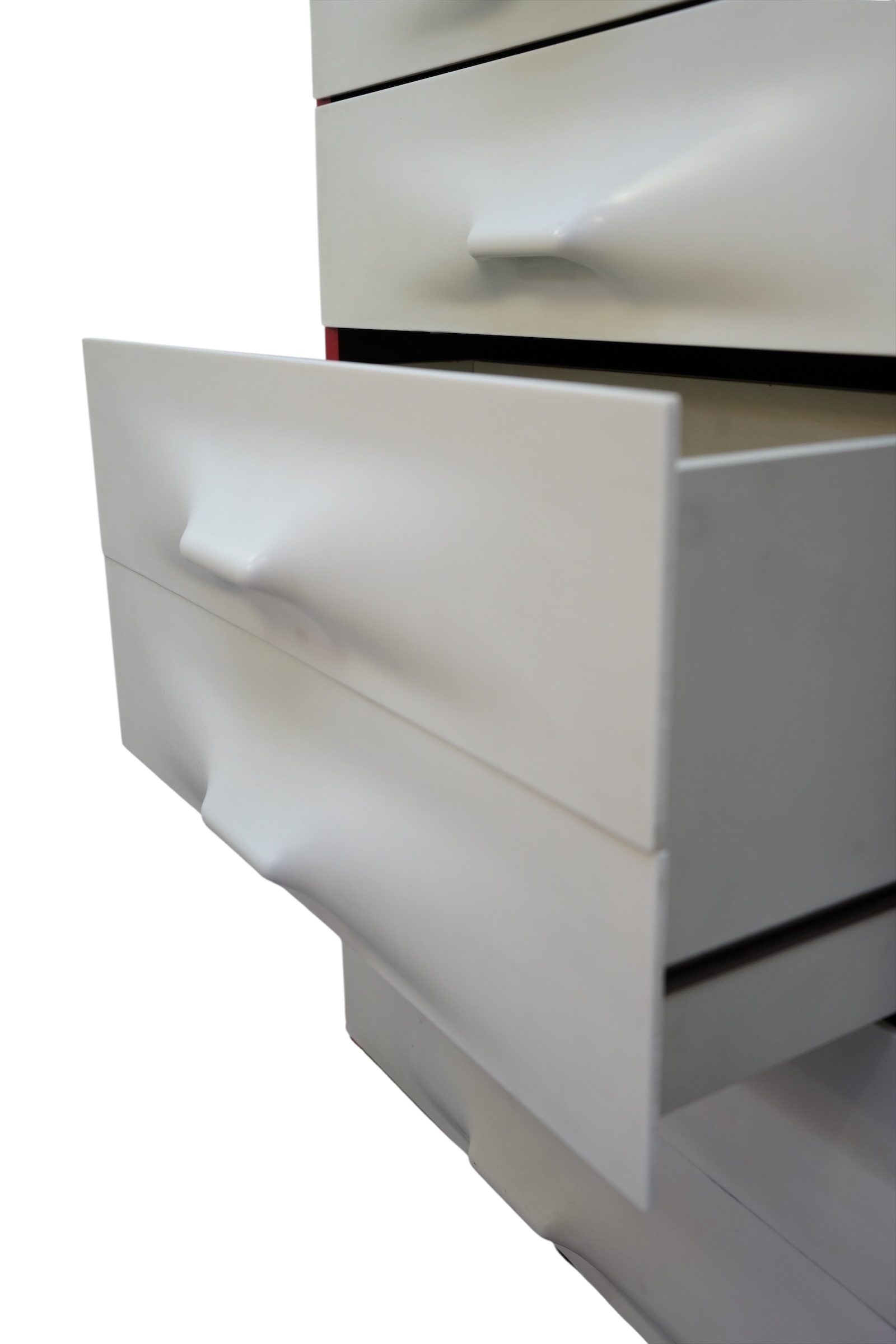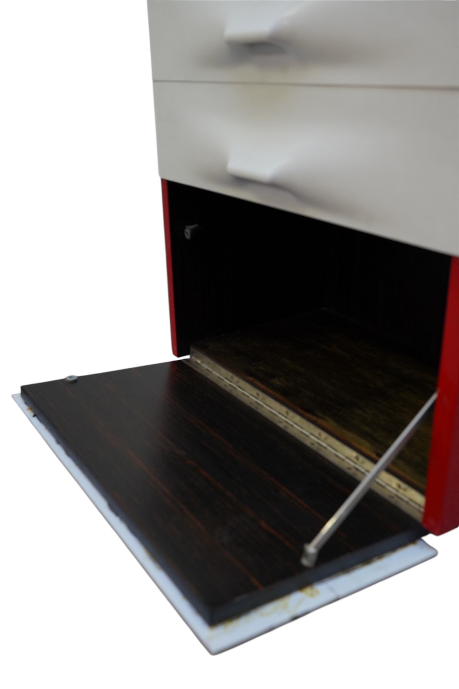Unité mobile de rangement, Valet-semainier en bois stratifié et methacrylène laqué de couleur rouge munie de 8 façades en plastique moulé blanc. Cette coiffeuse offre divers espaces de rangement le tiroir supérieur révele un miroir et un casier, puis 4 tiroirs coulissants, un double tiroir, et un espace à ouverture horizontale. Ce meuble sur roulette dispose sur la partie latérale d’une penderie. Cette merveille de Raymond Loewy fut conçue pour la CEI (Compagnie d’Esthétique Industrielle) en 1980’s. Edition : DOUBINSKY FRERES.