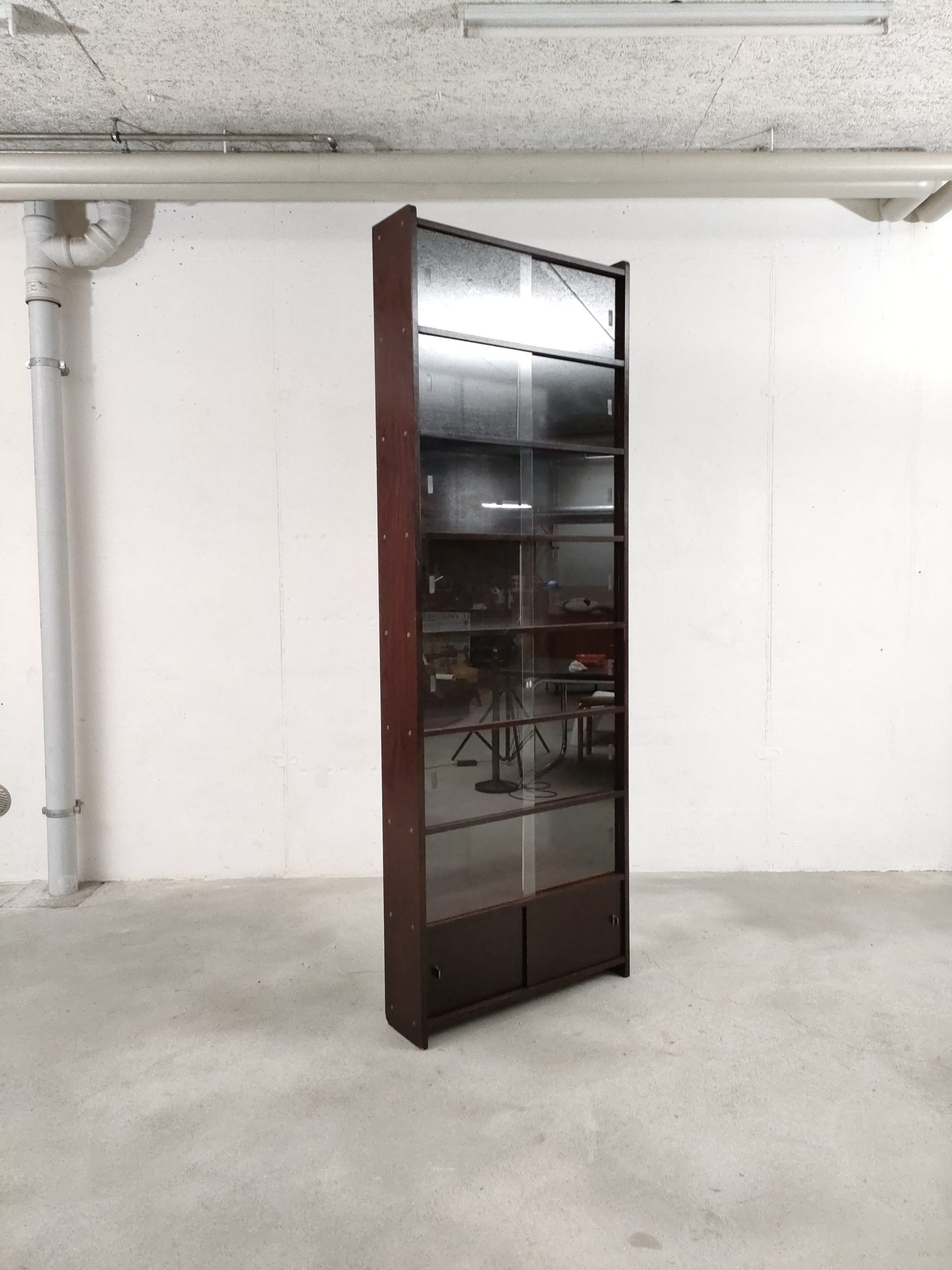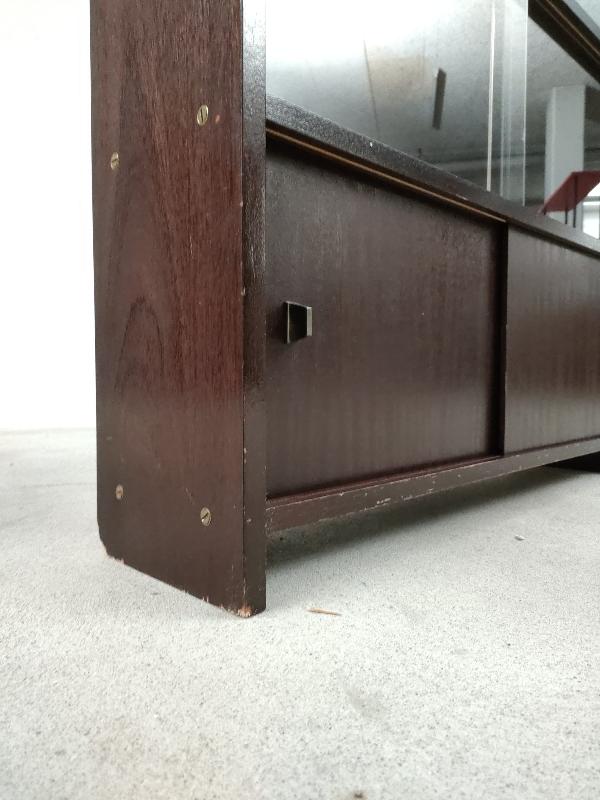 Produit venduVitrine vintage en bois avec 8 espaces de rangement (un avec portes coulissantes en bois et 7 avec portes coulissantes en verre). Des légères traces d’usure sur les bois (voir photos).