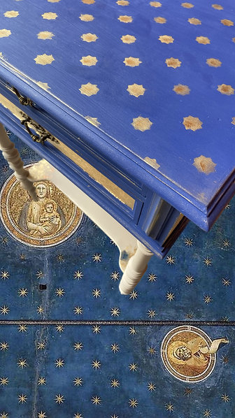 Petit meuble à tiroirs et pieds bobines relooké en inspiration à la Cappella degli Scrovegni de Padoue peinte par le maître Giotto.