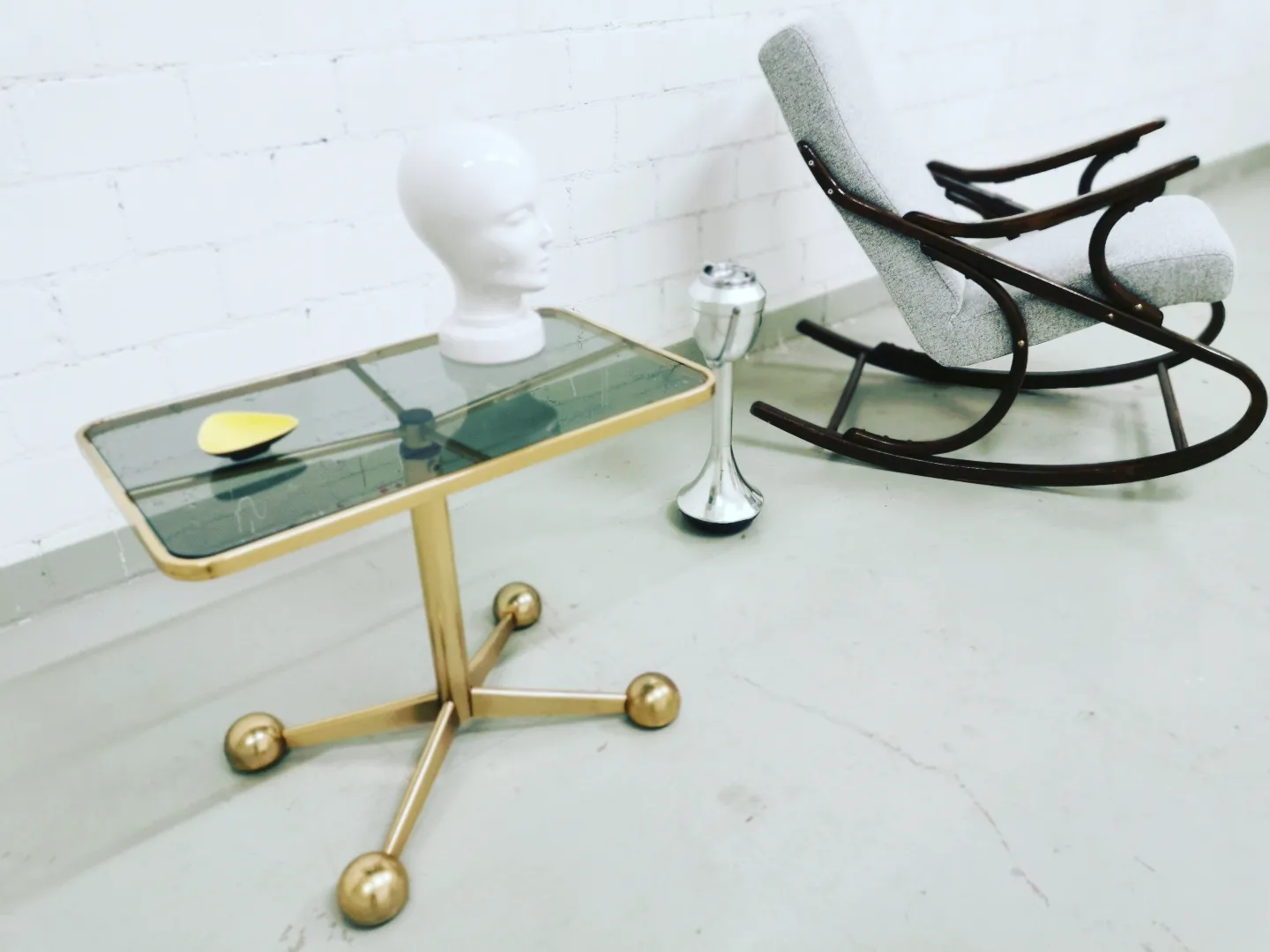 Table d’appoint Allegri Parma en laiton et design magnifique. Les pieds sont des caractéristiques typiques du designer, avec du verre teinté. Réglable en hauteur. Traces d’usure selon les photos sinon en bon état.