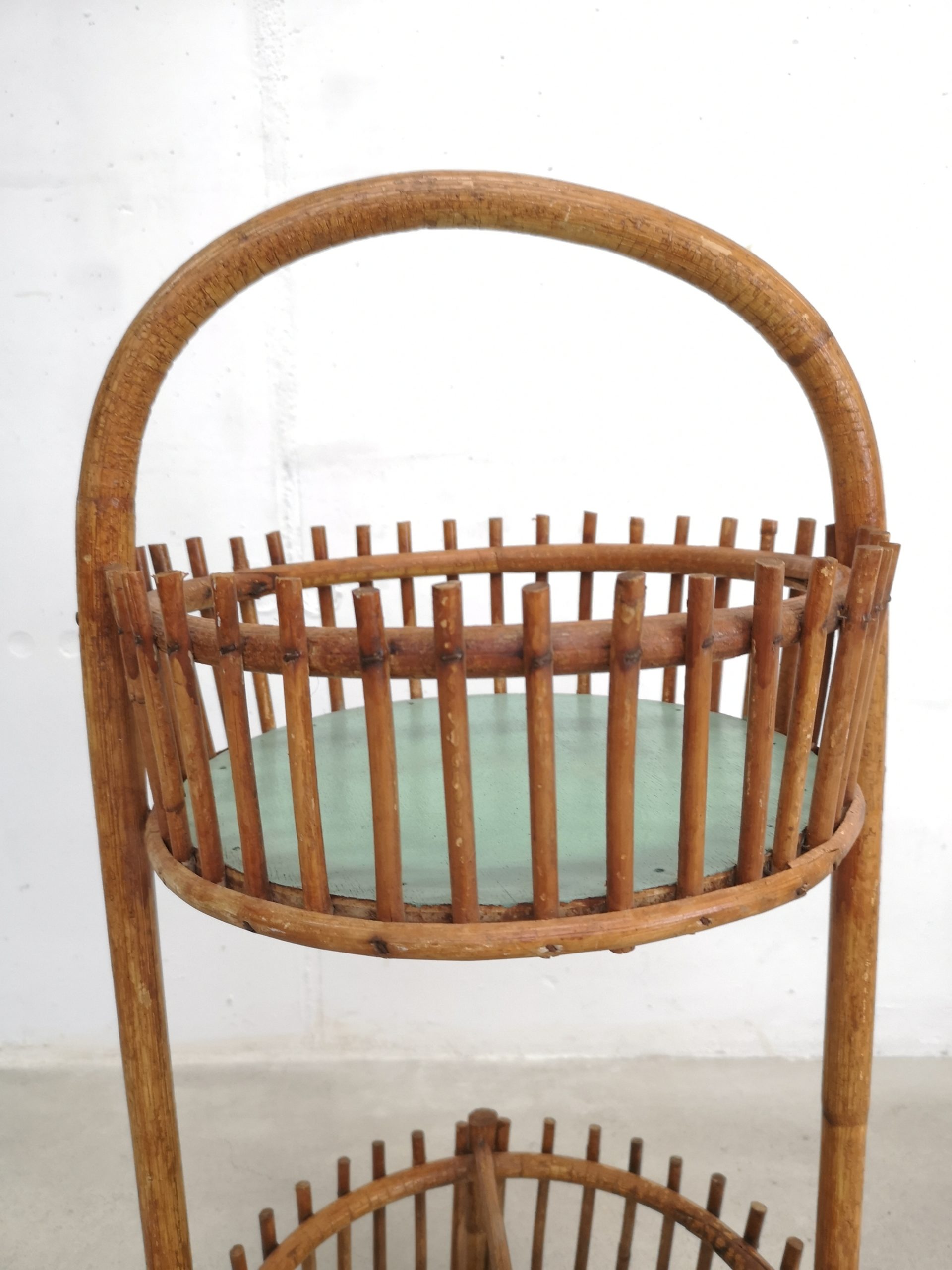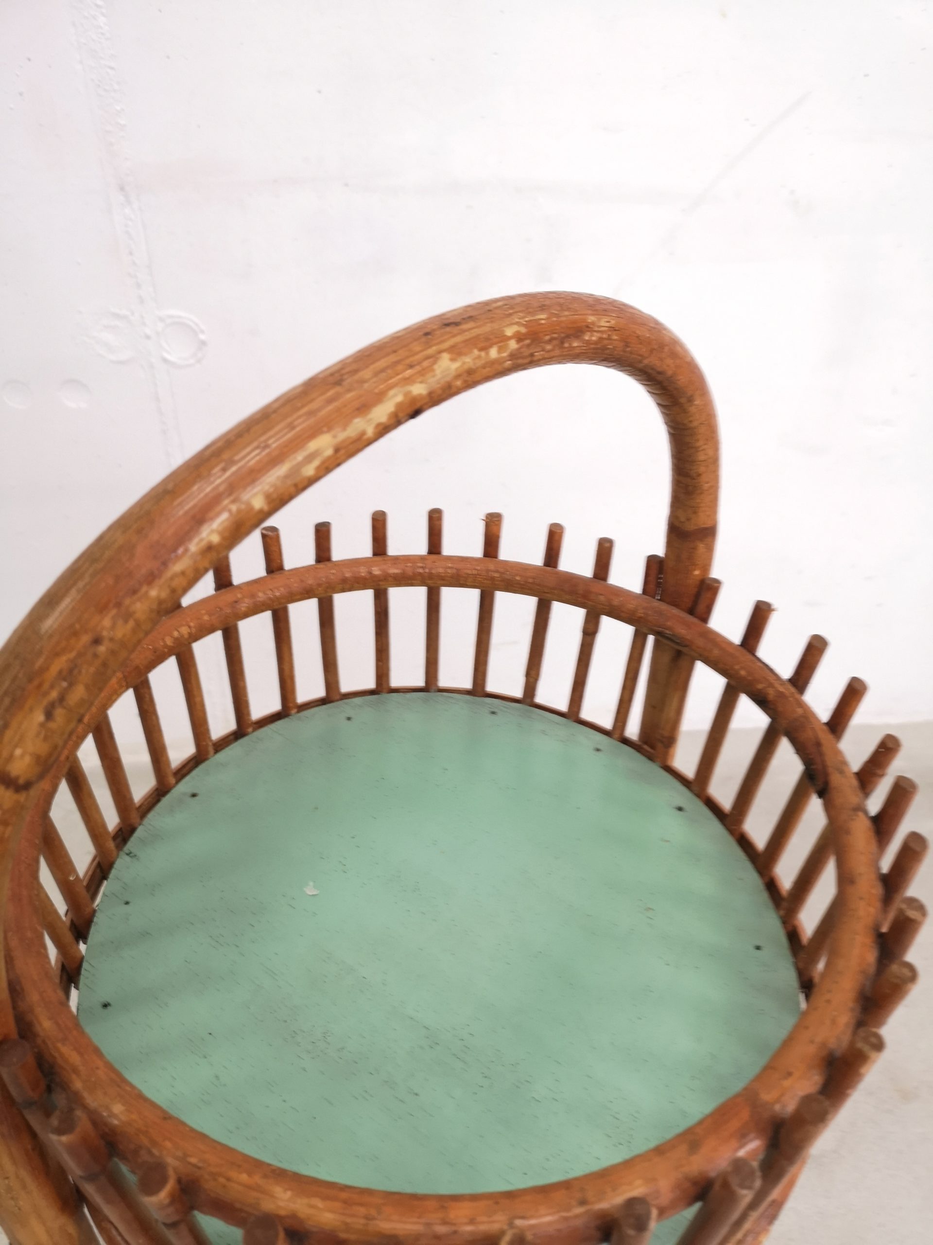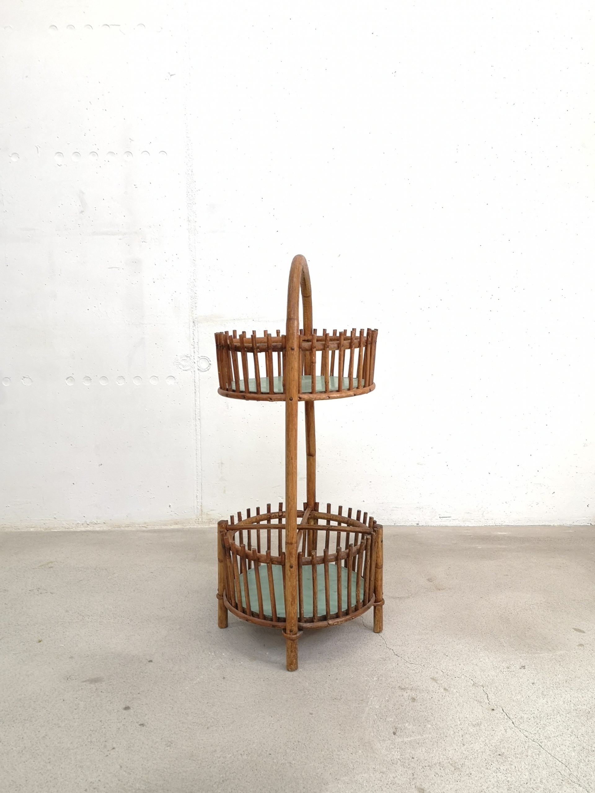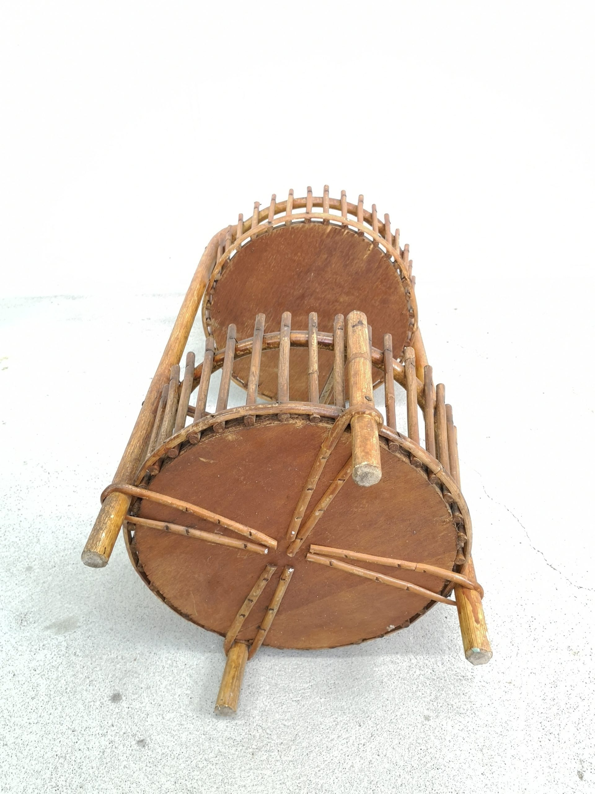 Produit venduBar en rotin doté d’une anse pour le transport et de 2 espaces pour ranger les verres (partie supérieure) et les bouteilles (partie inférieure). Sont présentes quelques traces du temps et d’utilisation visibles sur les photos. Stable et fonctionnel.