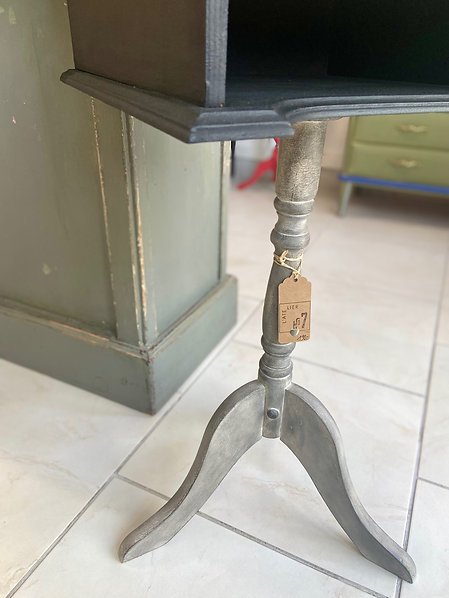 Meuble d’appoint unique, relooké en noir, blanc et gris, plateau décoré avec motif au chablon, effet patiné. Avec un tiroir ouvert, idéal pour être utilisé en table de nuit ou à côté du canapé par exemple.