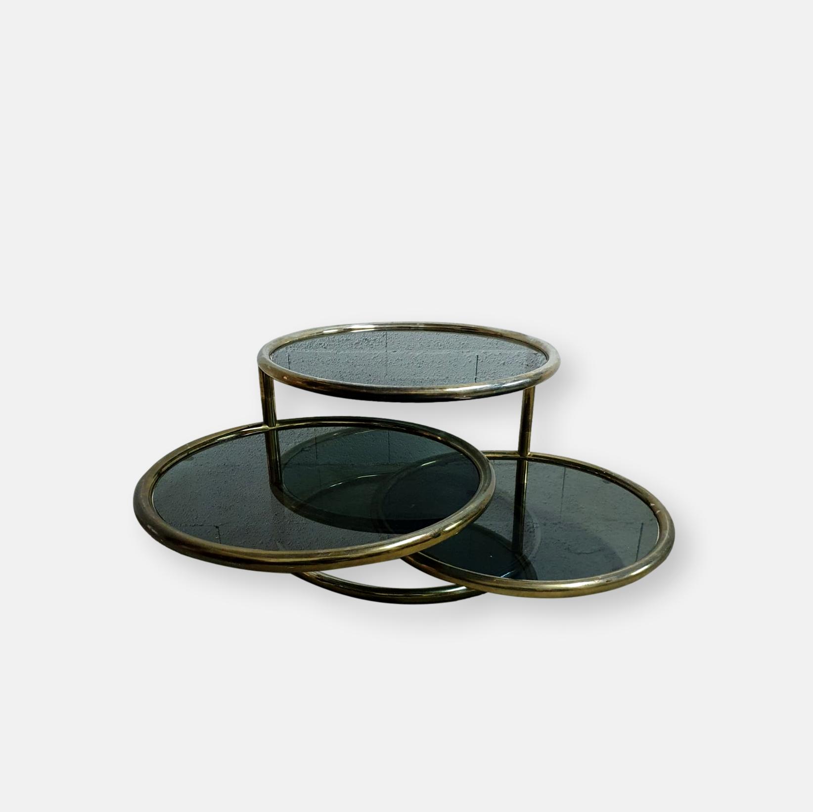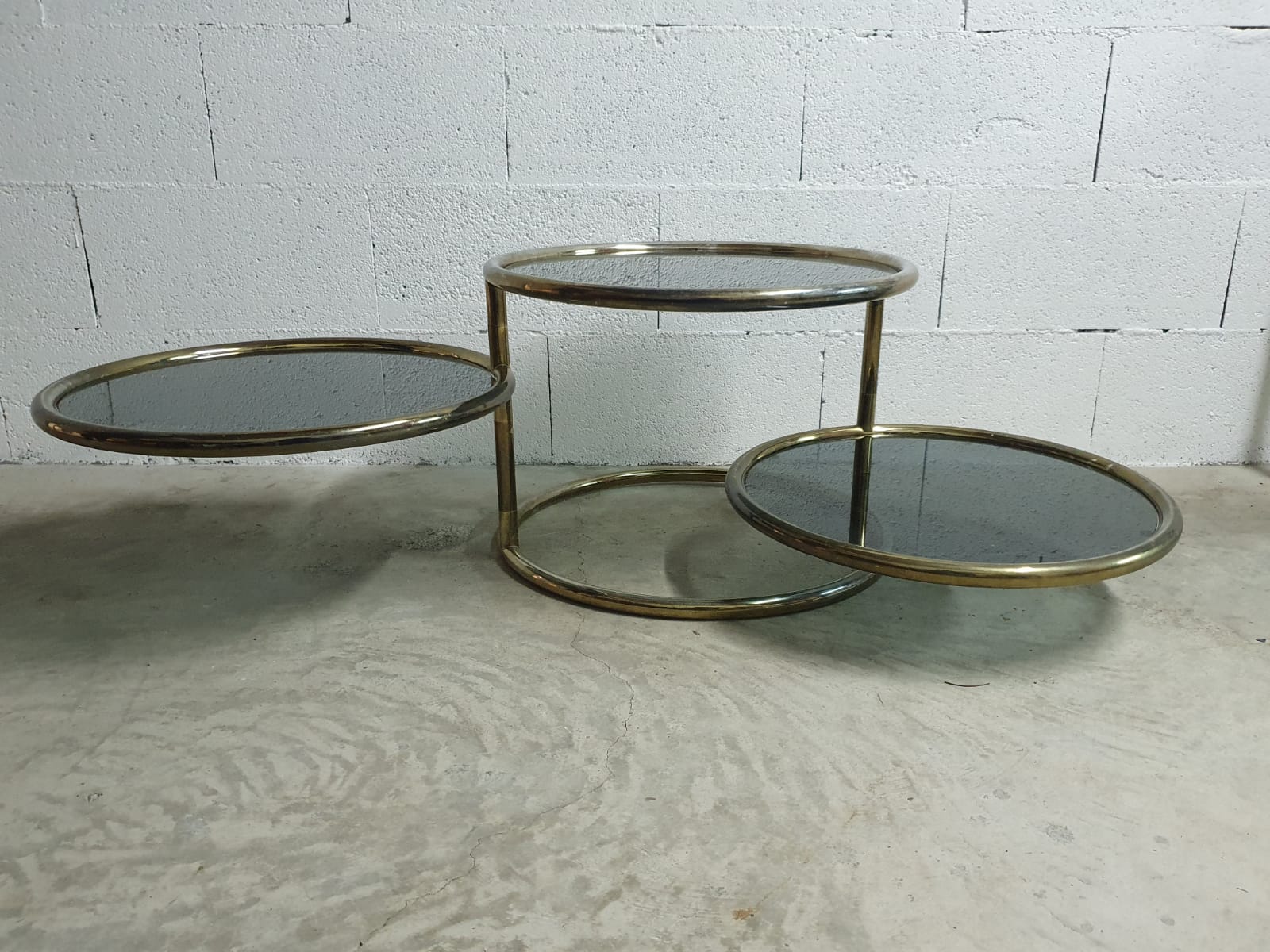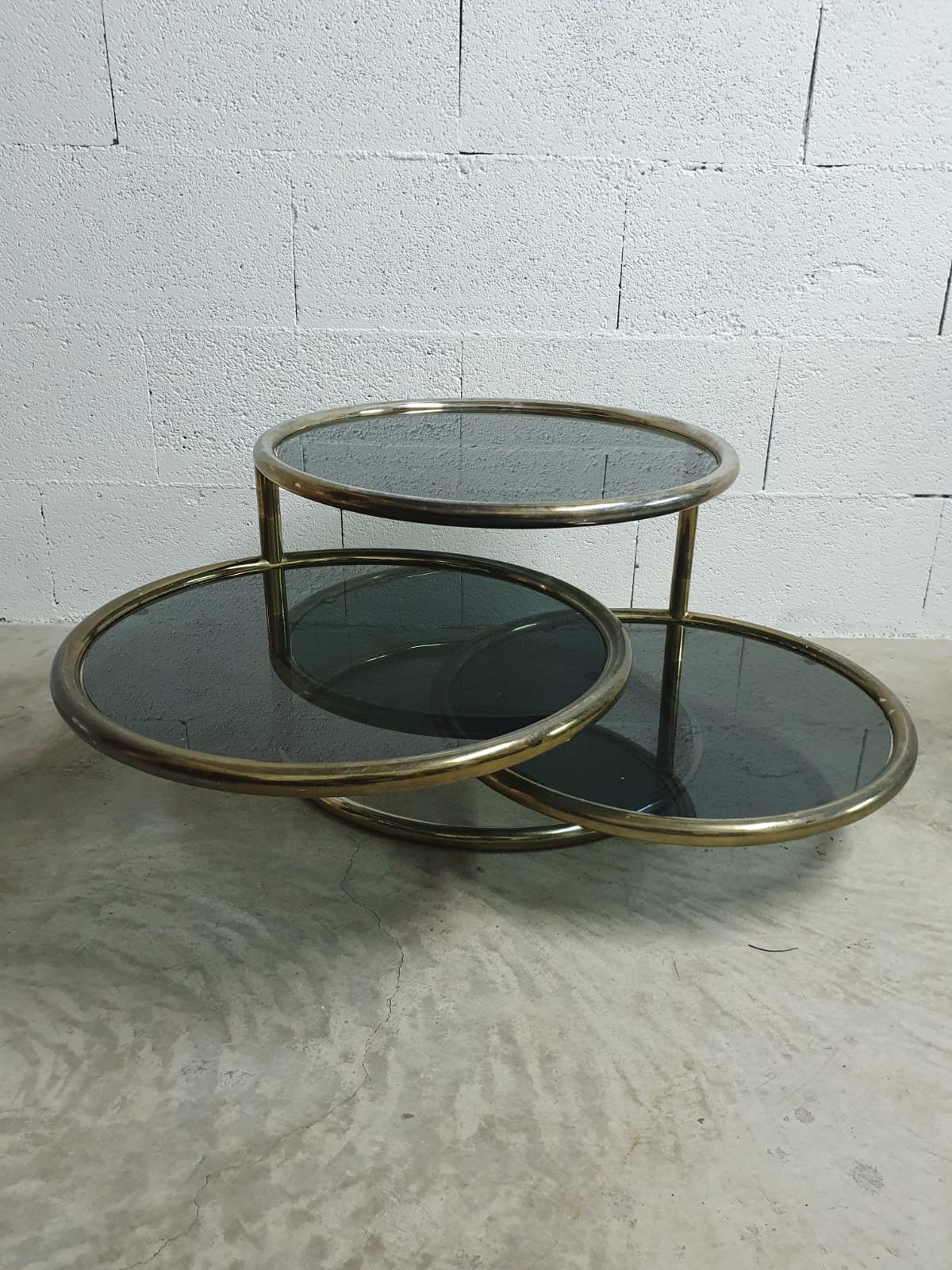 Produit venduTable basse circulaire 1970s avec trois plateaux pivotants en verre fumé et structure en métal doré.