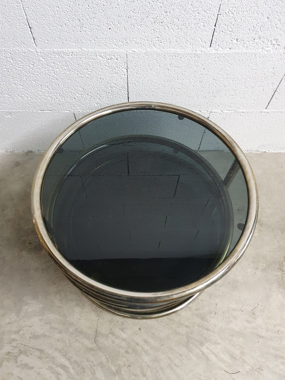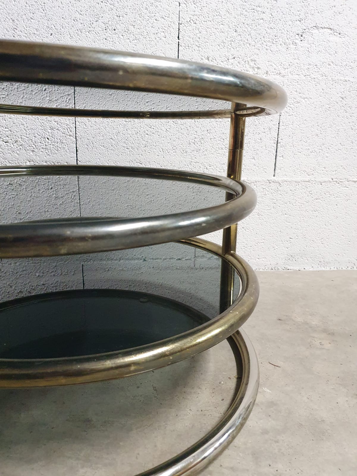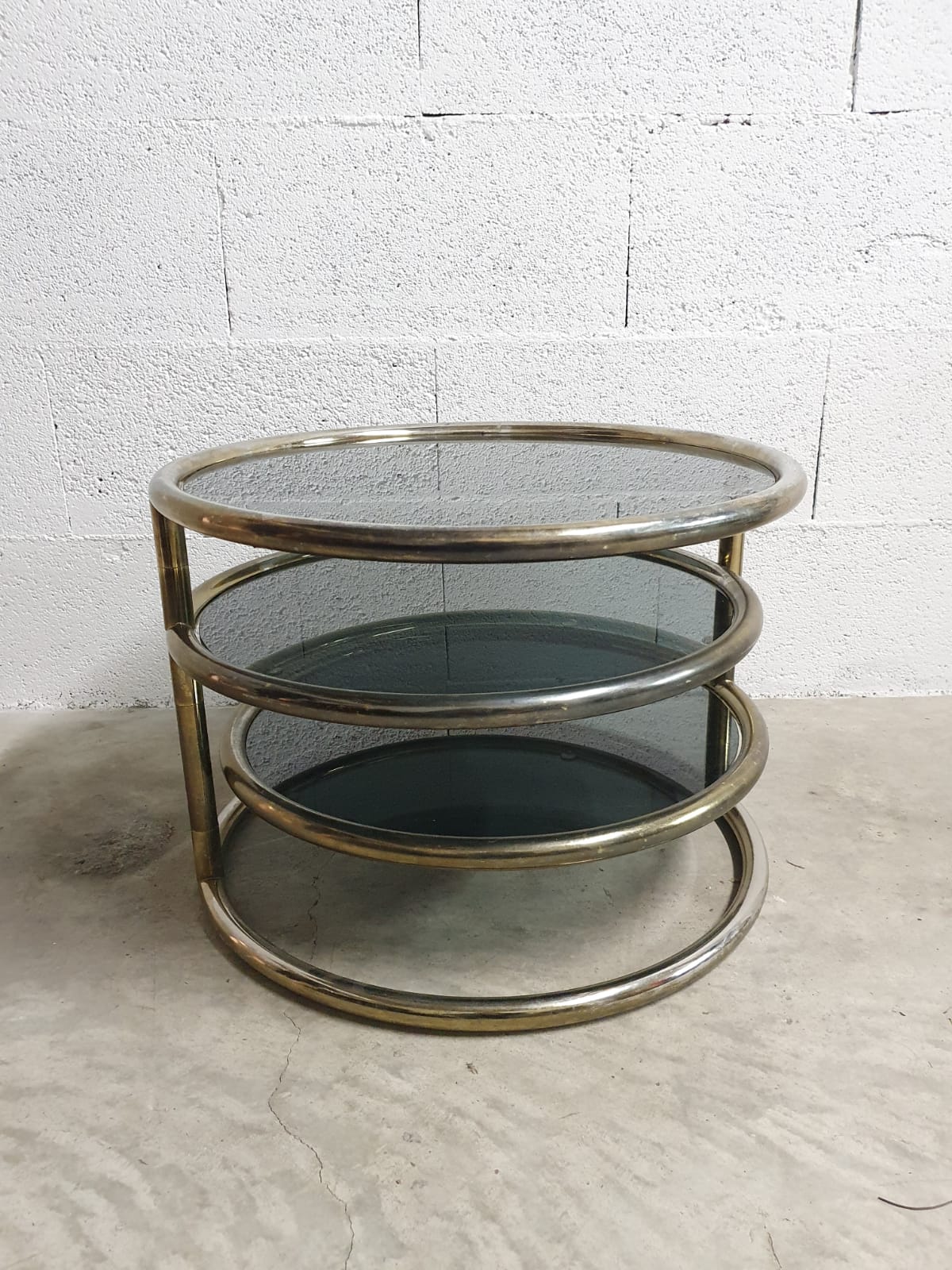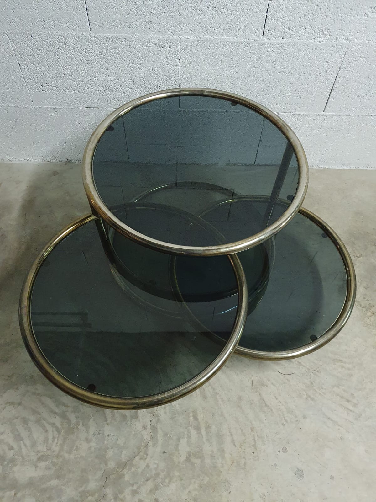 Produit venduTable basse circulaire 1970s avec trois plateaux pivotants en verre fumé et structure en métal doré.