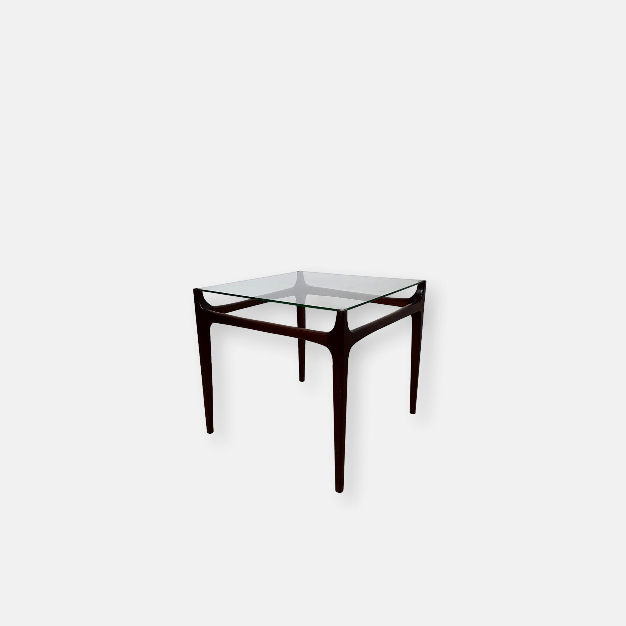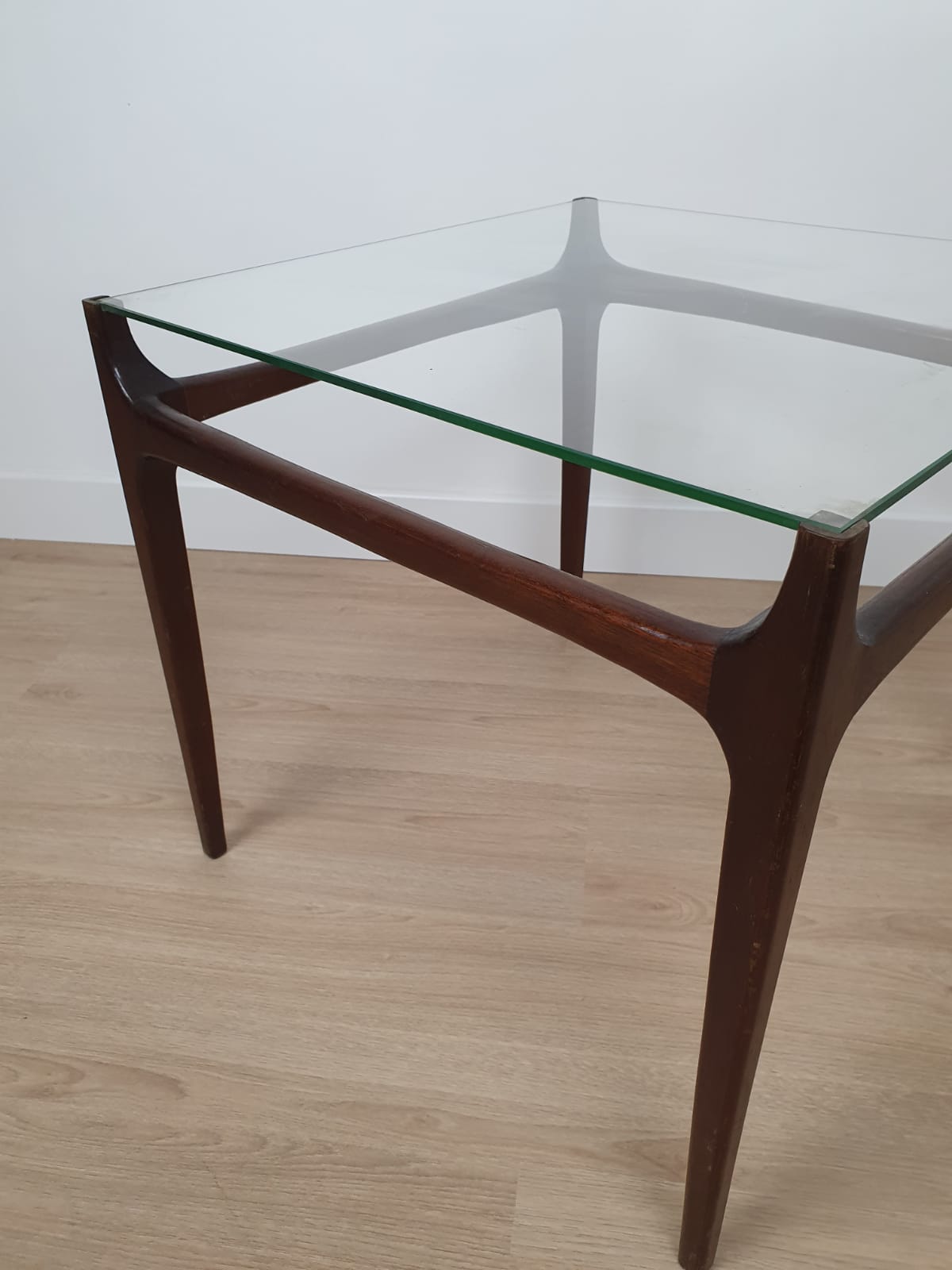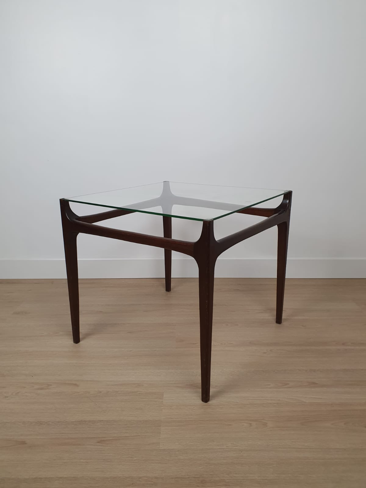 Table basse/d’appoint scandinave des années 60 avec structure en bois et plateau en verre.
