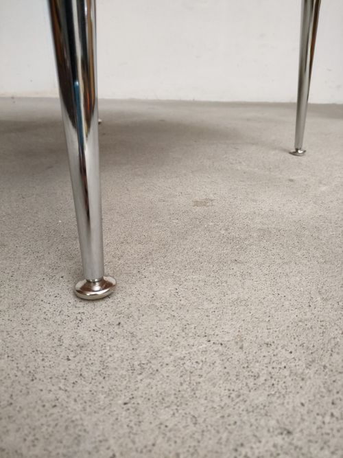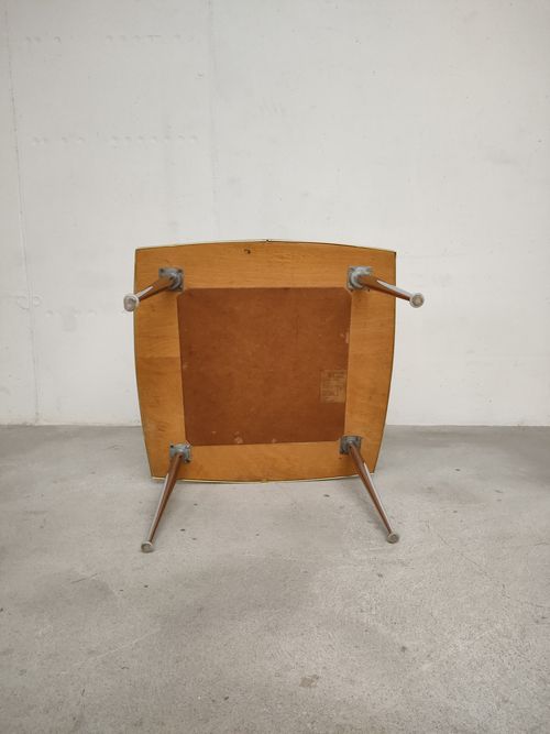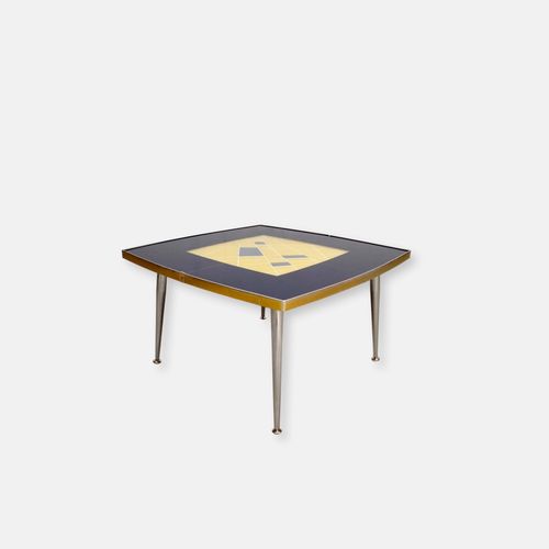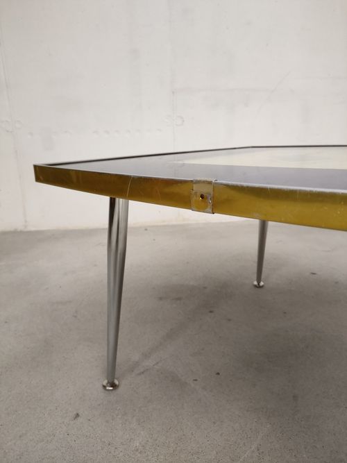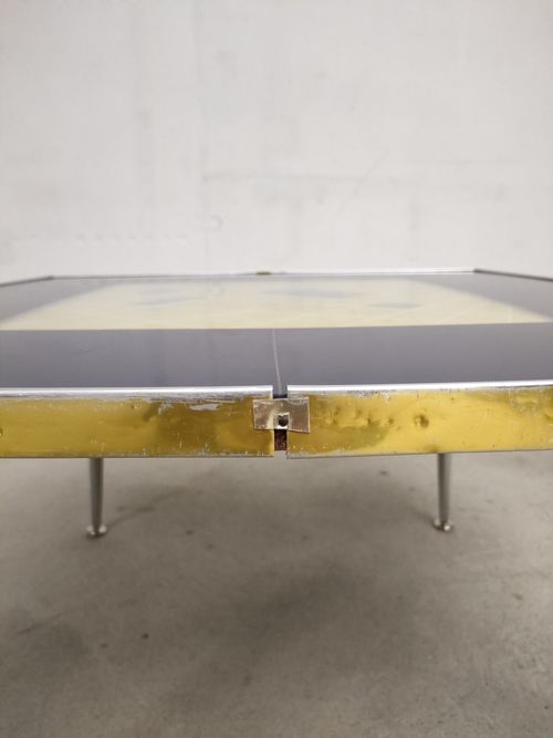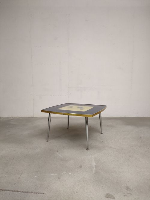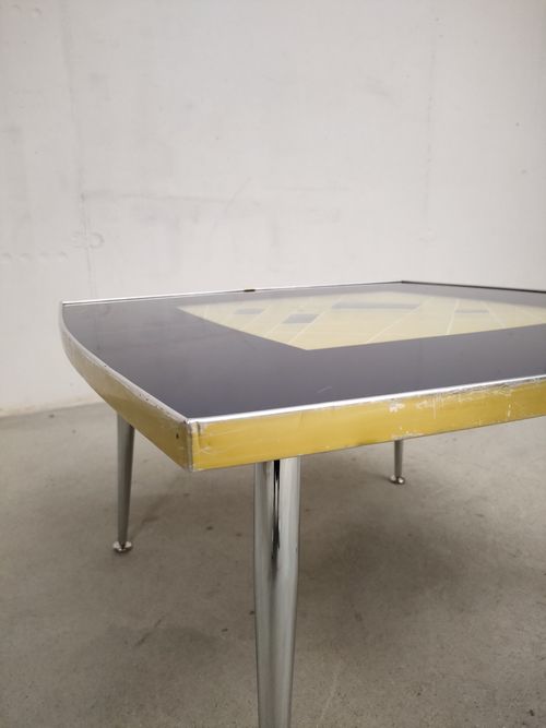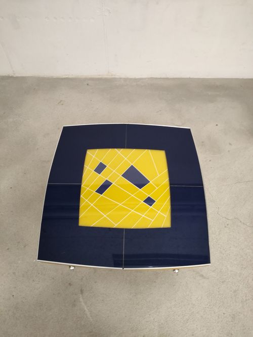 Produit venduTable basse vintage avec piètement et bords du plateau en métal et plateau en verre avec motif géométrique bleu et jaune. Produite en Allemagne. Quelques traces sur le plateau sont présentes et la dorure des bords est parfois manquante (voir photos).