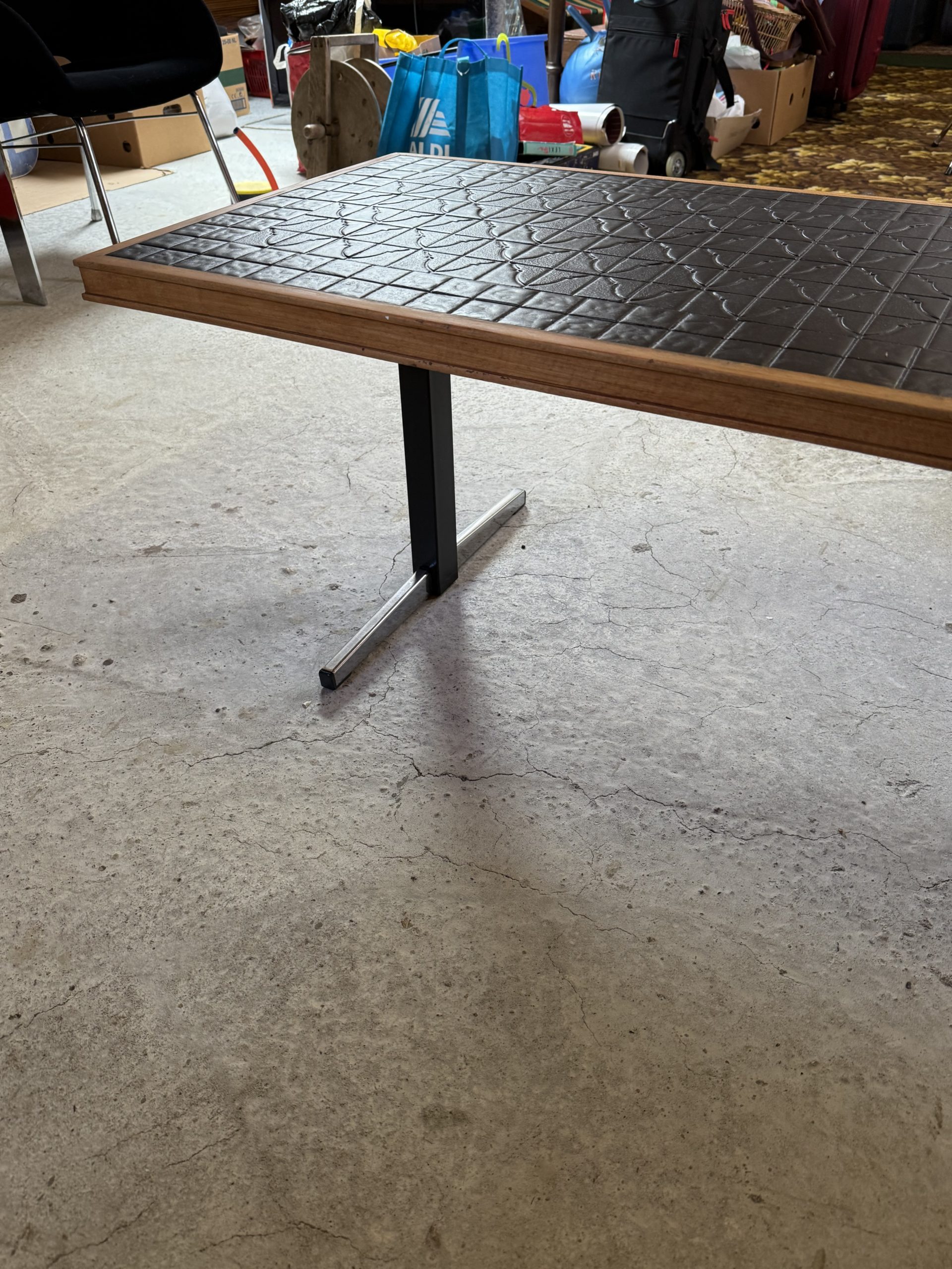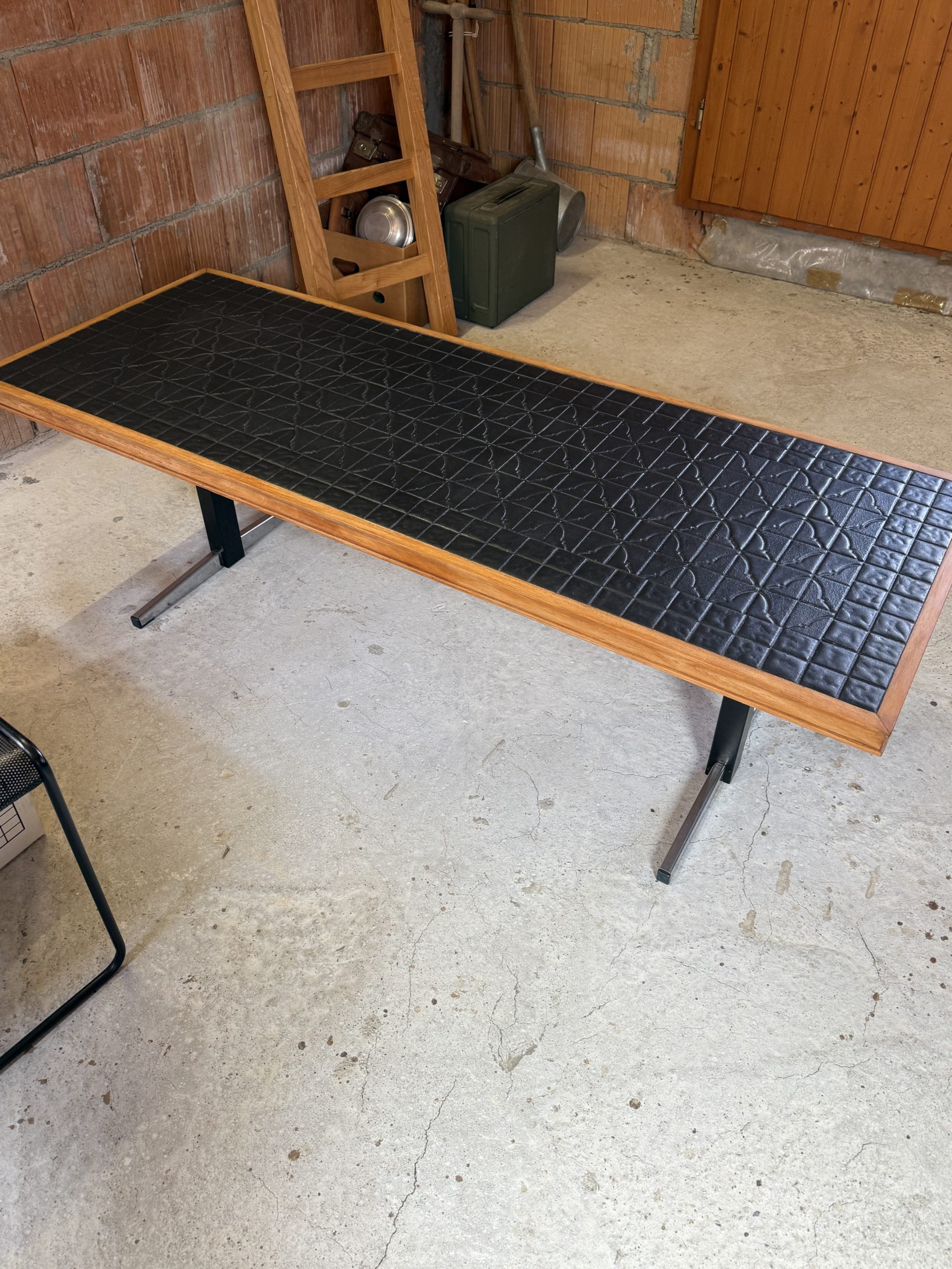Une très belle table de salon des années 70. Les pieds sont en métal noir et chrom, très stable. Il a un plateau en carreaux peints en noir avec les bords en bois.