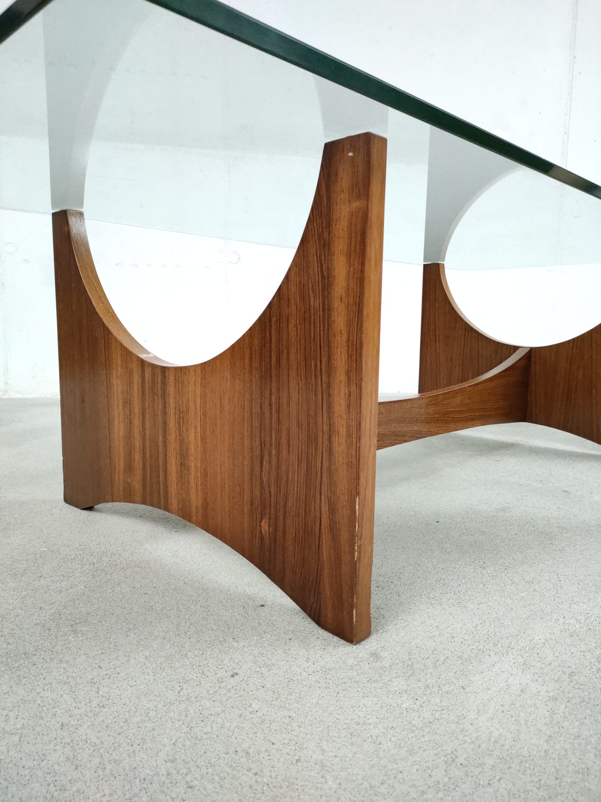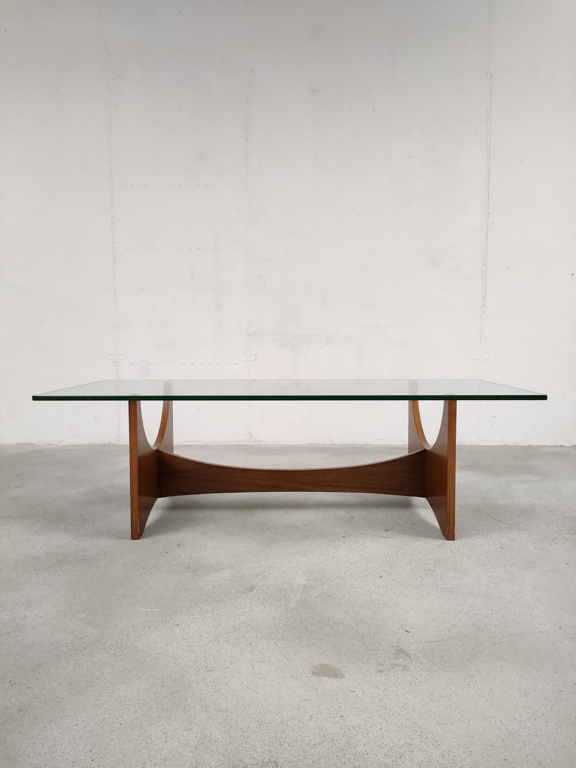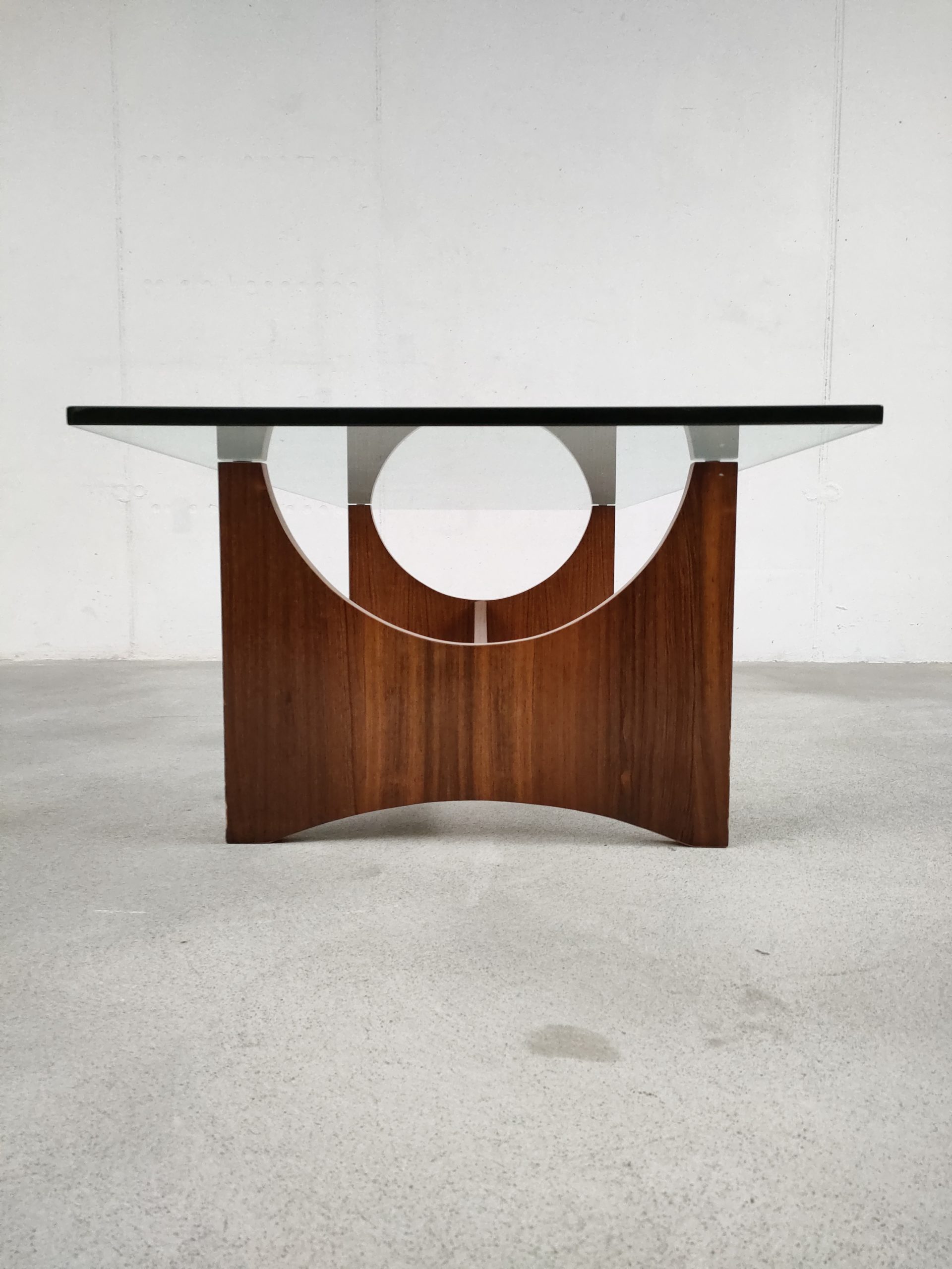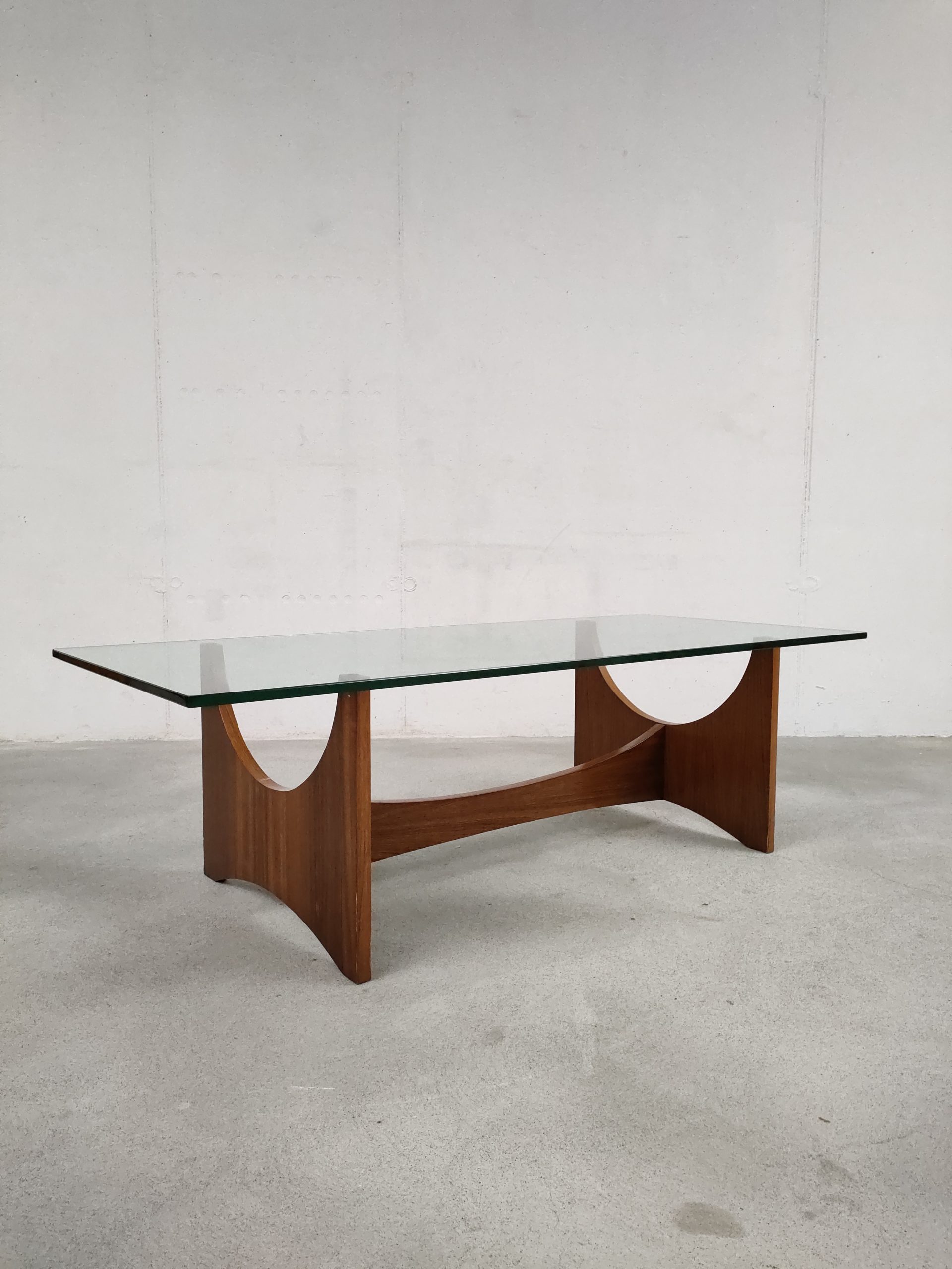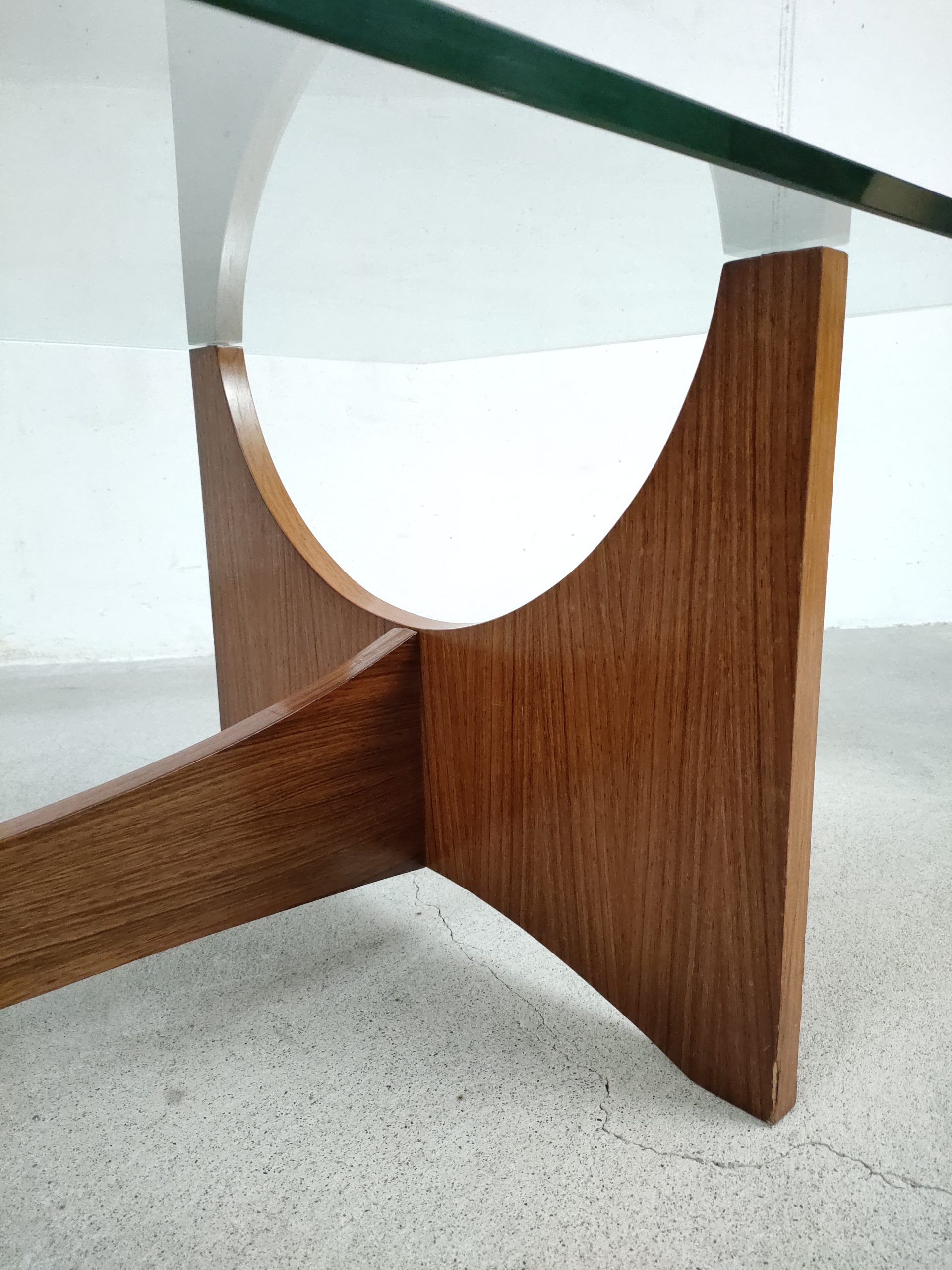Produit venduTable basse avec elegant piétement en bois et plateau en verre. Quelques traces d’usure sur le bois (voir photos). Des légères rayures sont présentes sur le plateau mais sont difficiles à montrer sur photo. La table est stable et solide et très élégante.