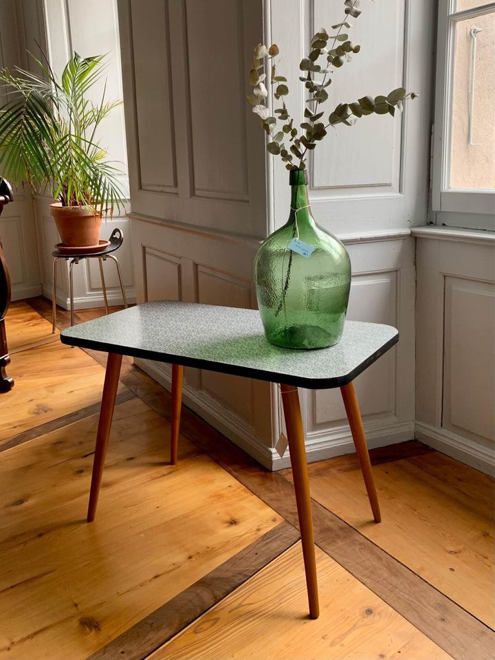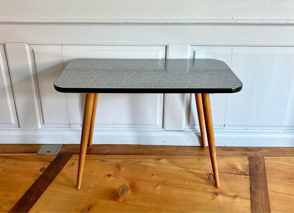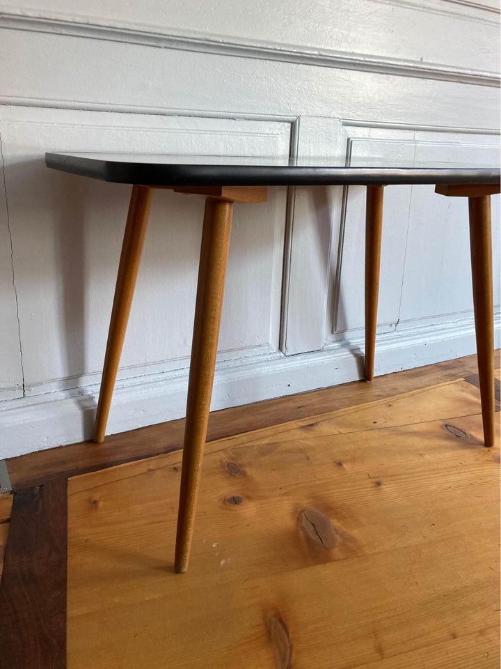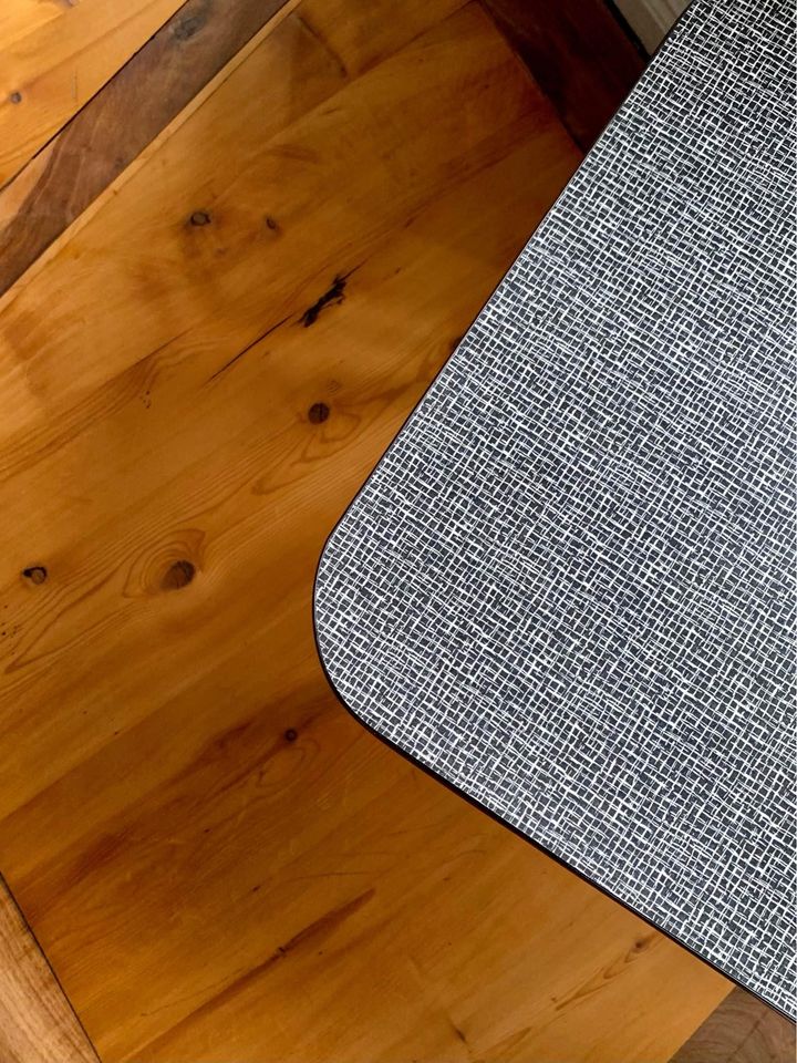 Produit venduTable basse vintage avec pieds compas en bois et plateau avec revêtement en formica de couleur noir et blanc, petit quadrillage