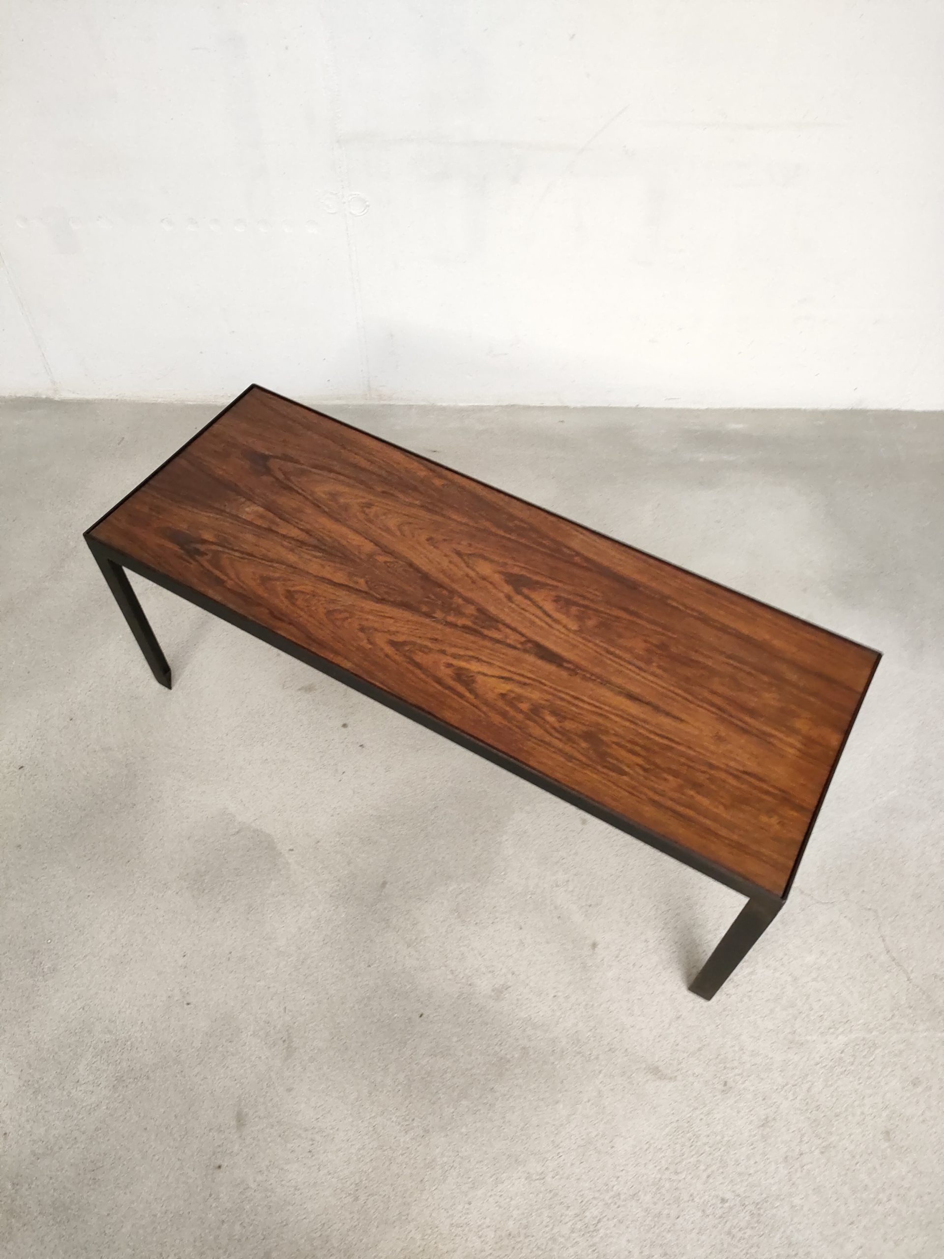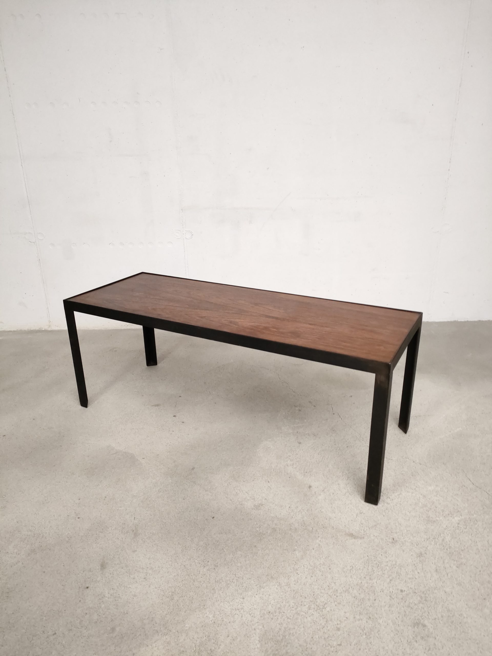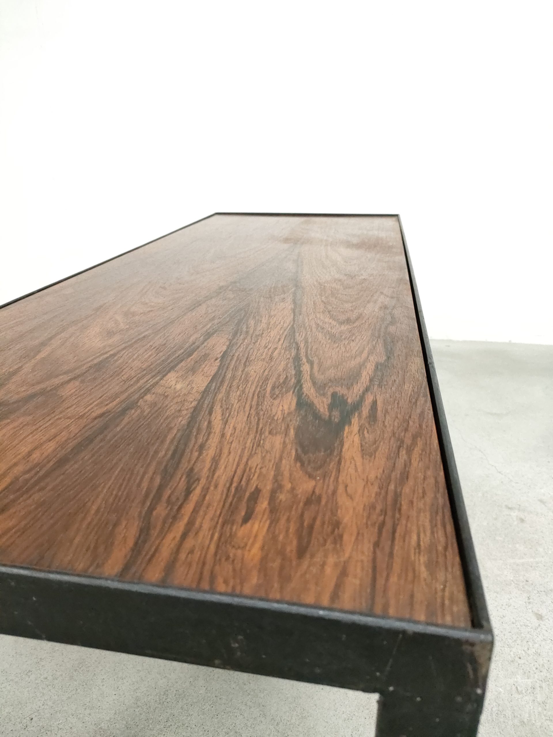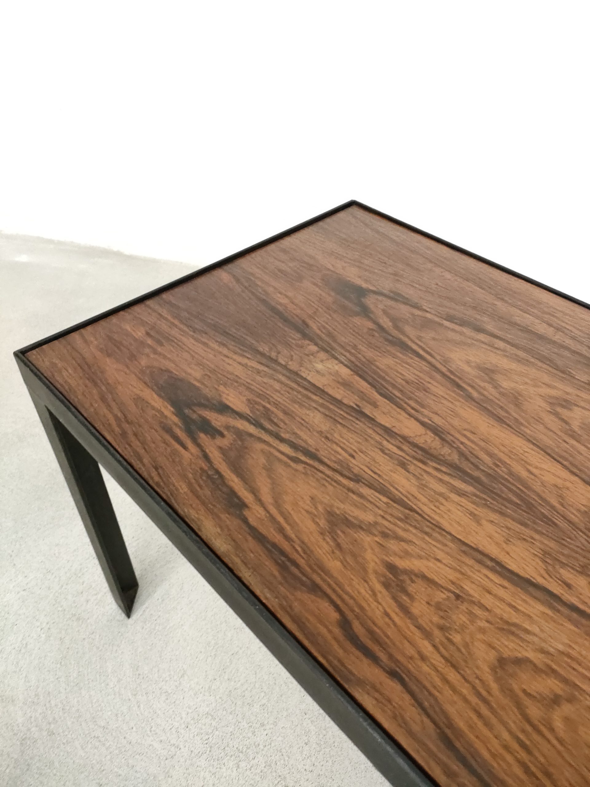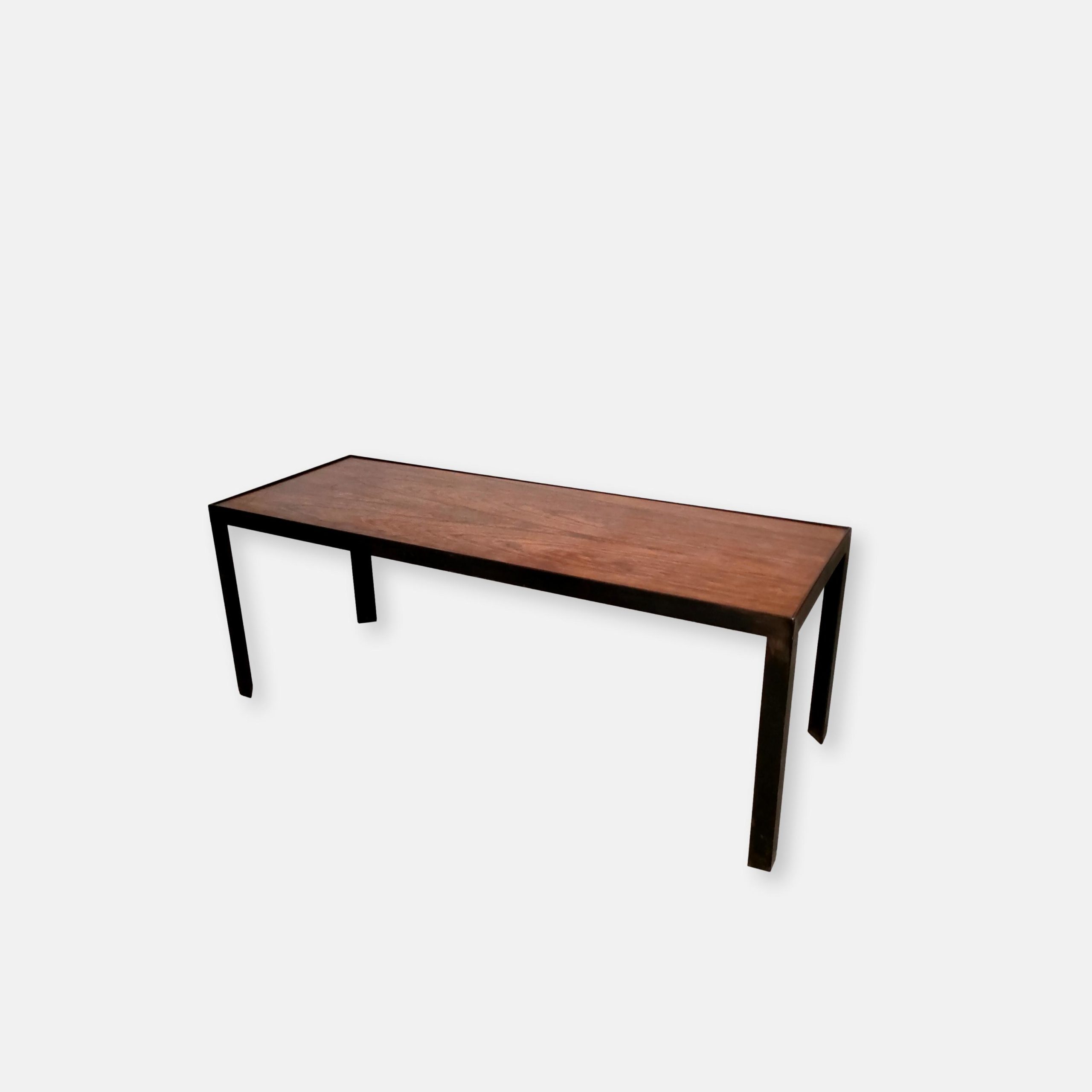 Produit venduTable basse vintage avec piètement en métal noir et plateau en palissandre. Quelques traces d’usure sur le métal, la table est stable et solide et parfaitement fonctionnelle.