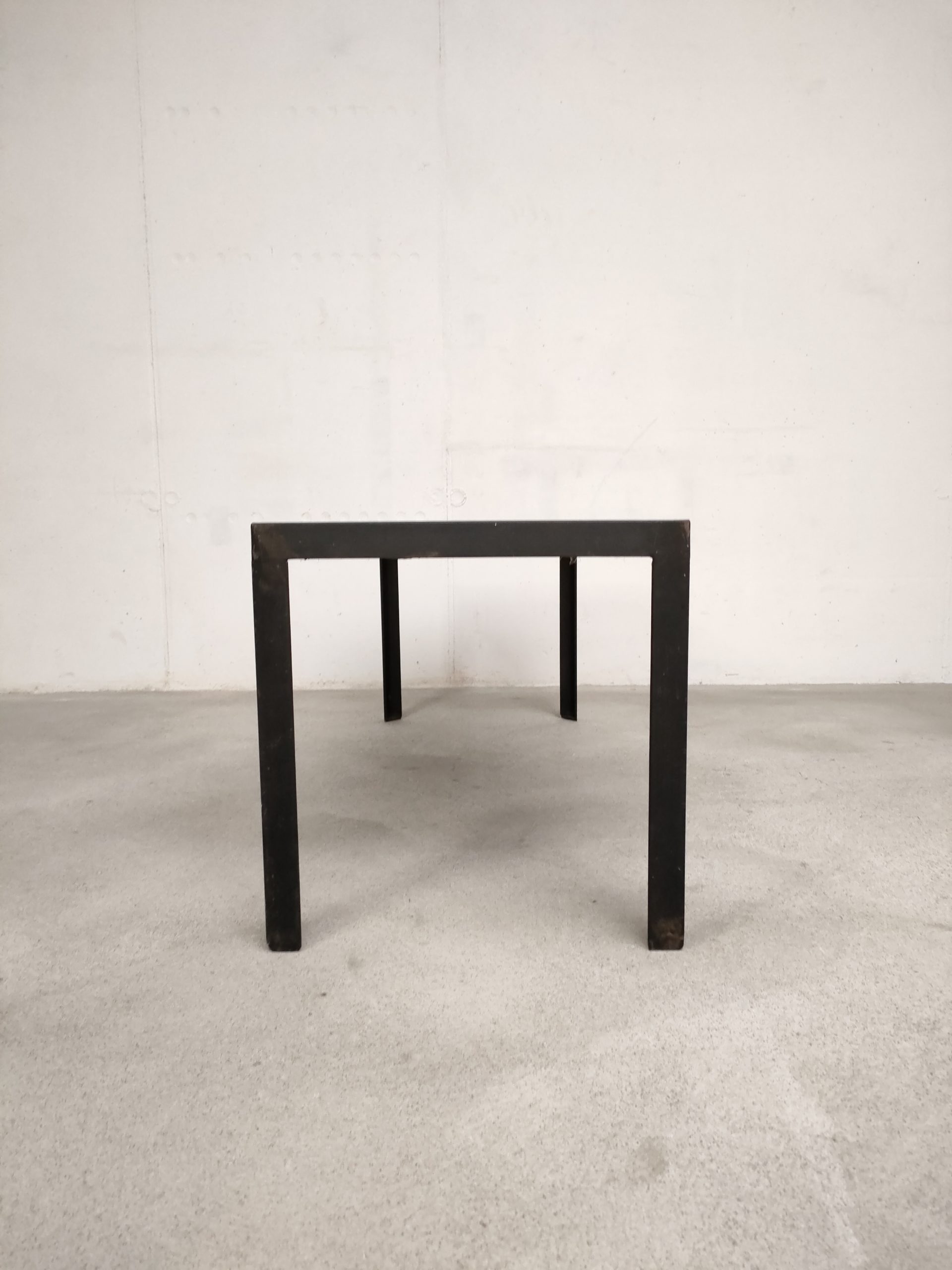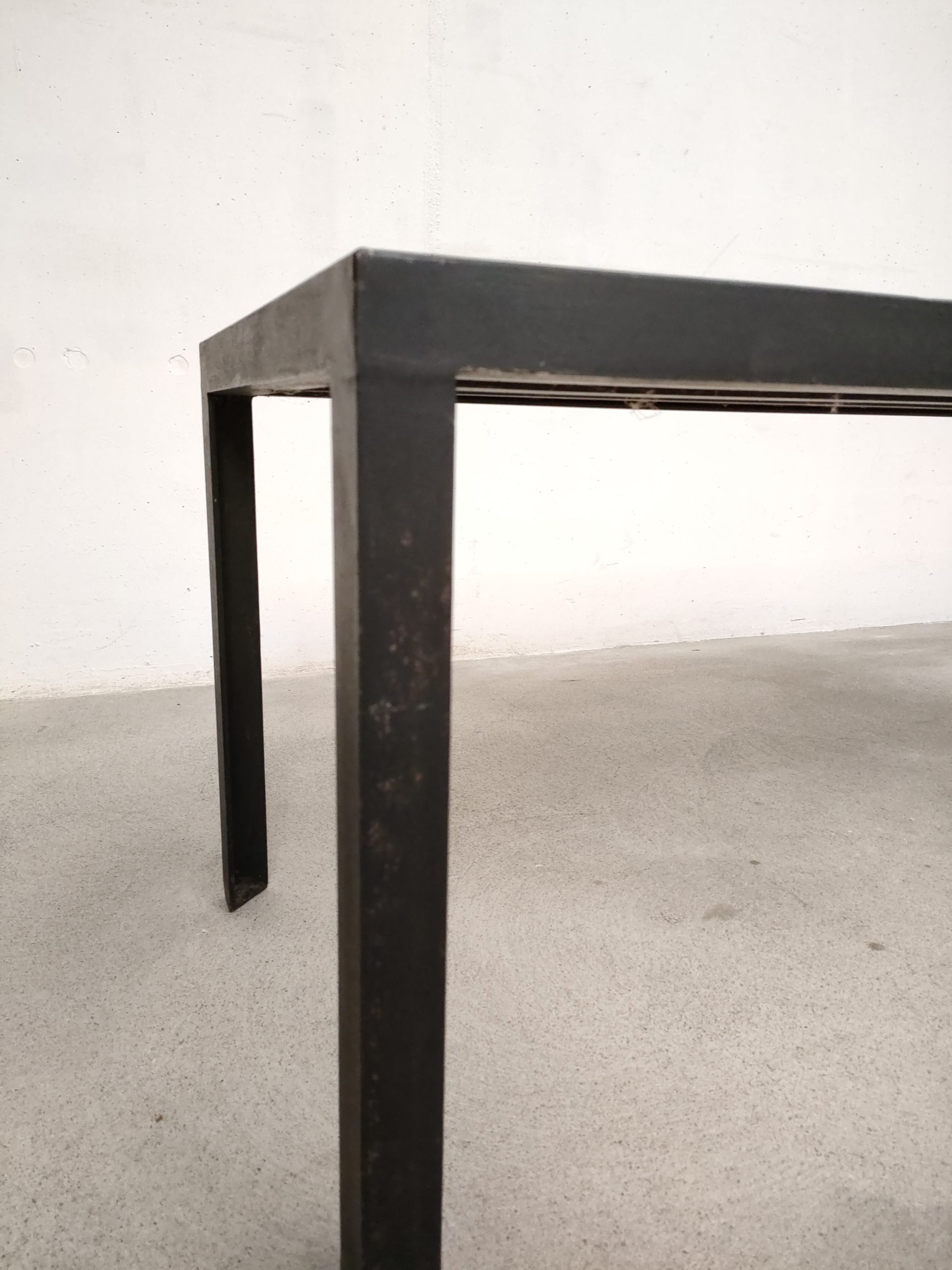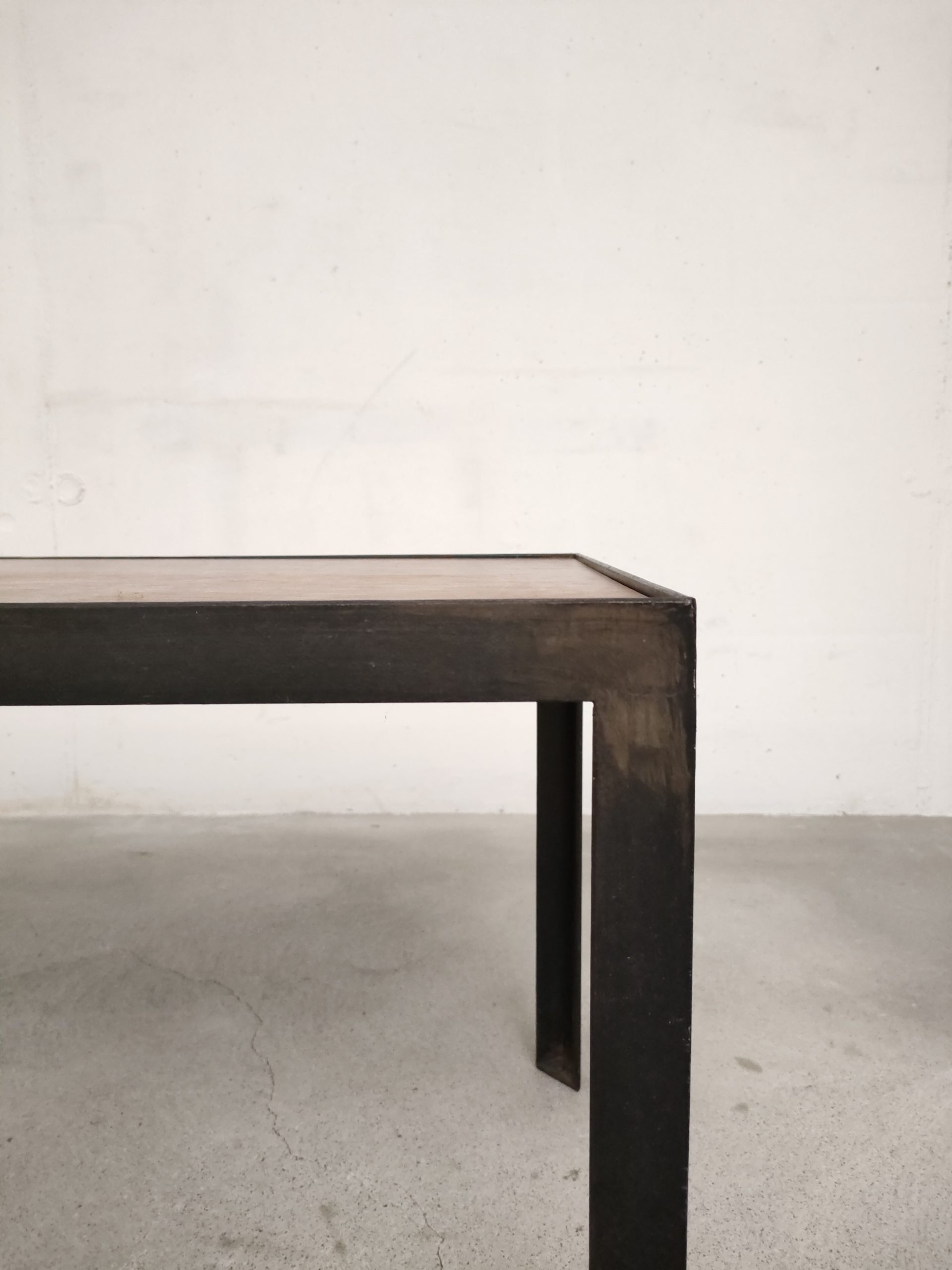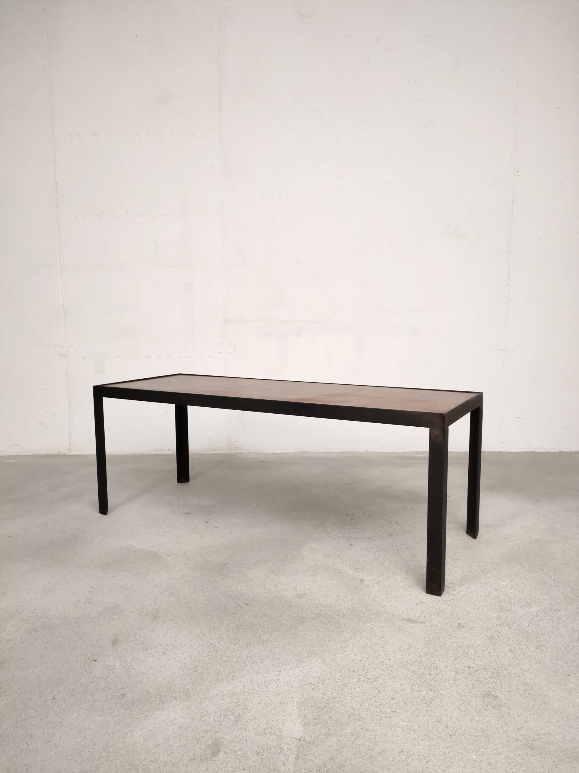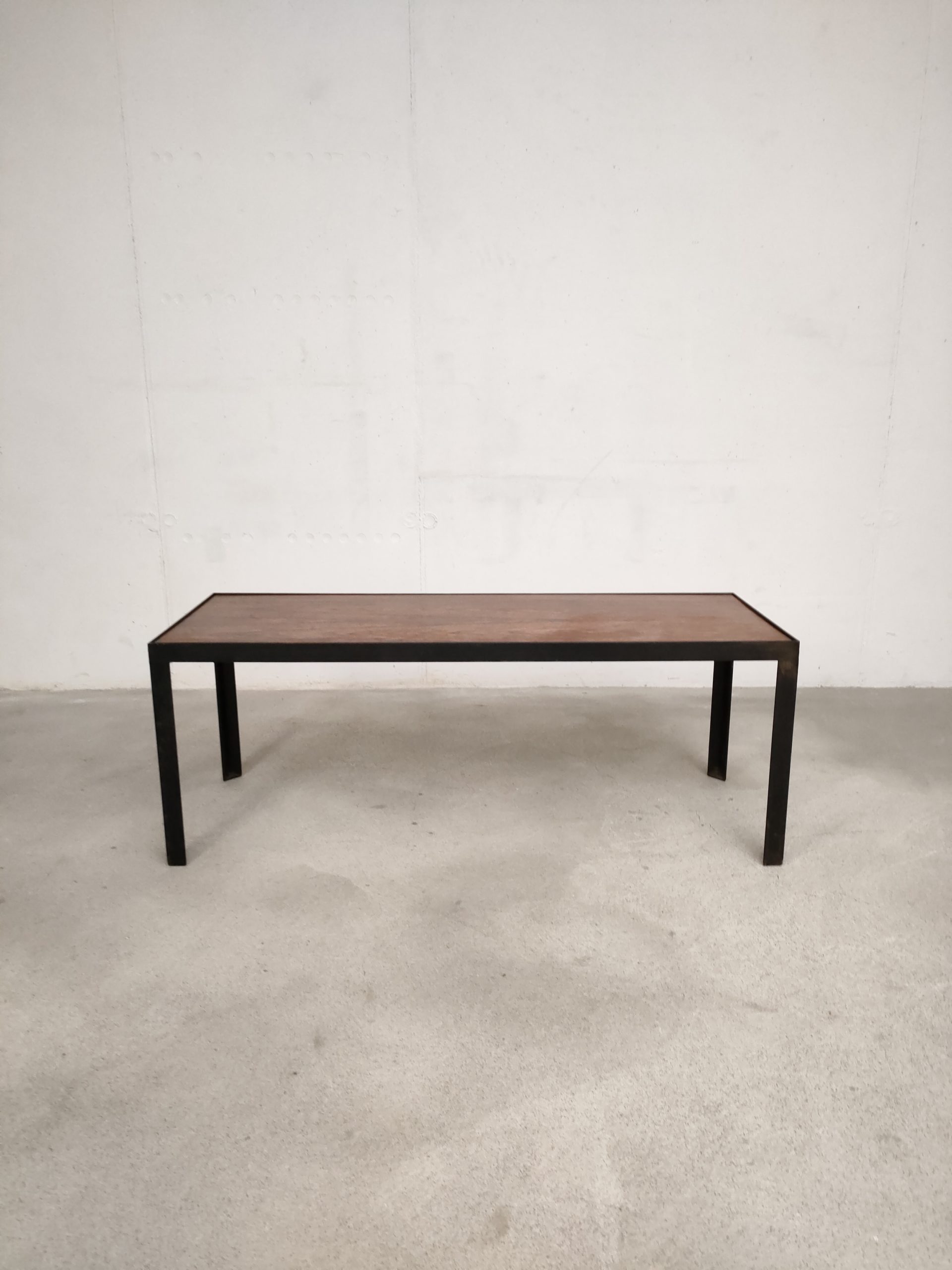 Produit venduTable basse vintage avec piètement en métal noir et plateau en palissandre. Quelques traces d’usure sur le métal, la table est stable et solide et parfaitement fonctionnelle.