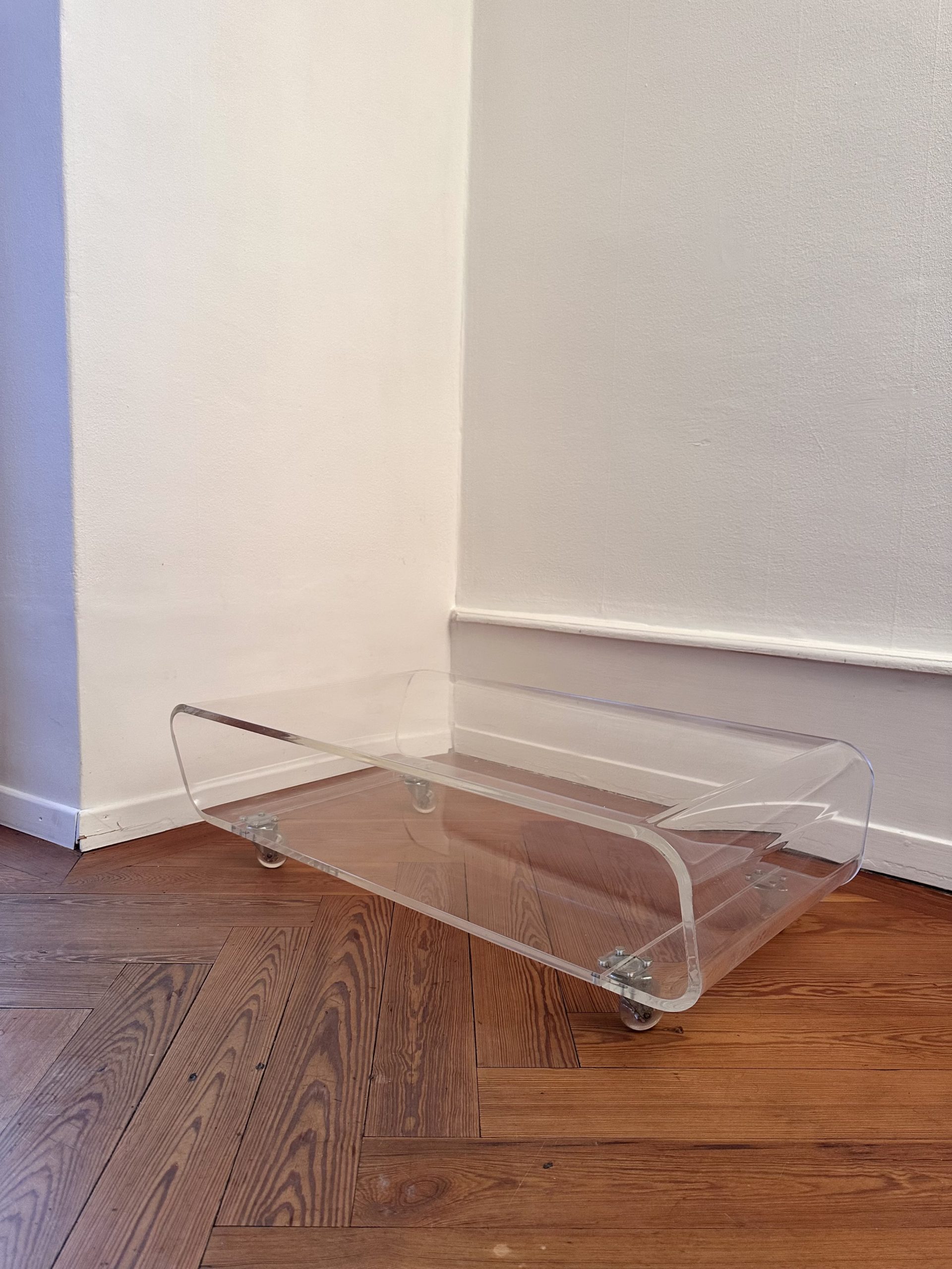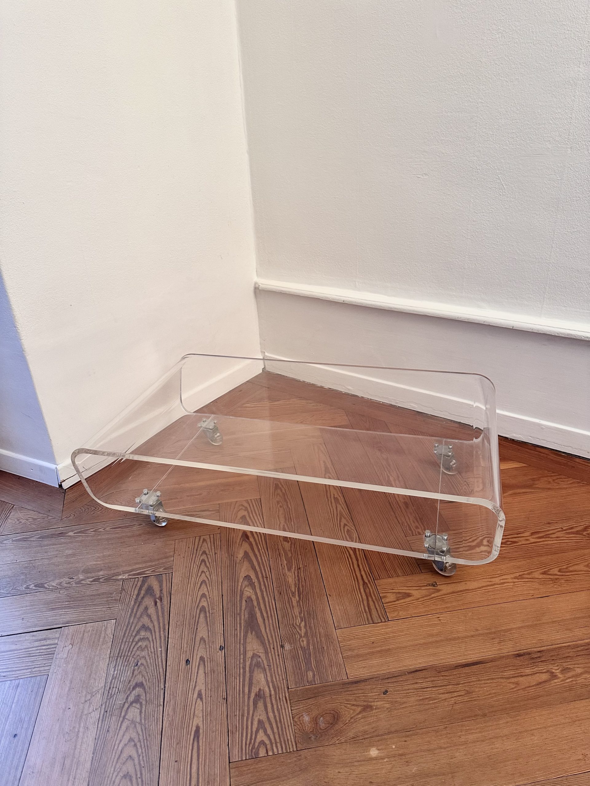 Montée sur quatre roulettes pivotantes, la table est facilement déplaçable et s’adapte aussi bien à un usage de table basse qu’à un support hi-fi ou audiovisuel. L’esthétique est typique du mobilier en plexiglas de la fin du XXe siècle, fonctionnel, mobile et visuellement léger.