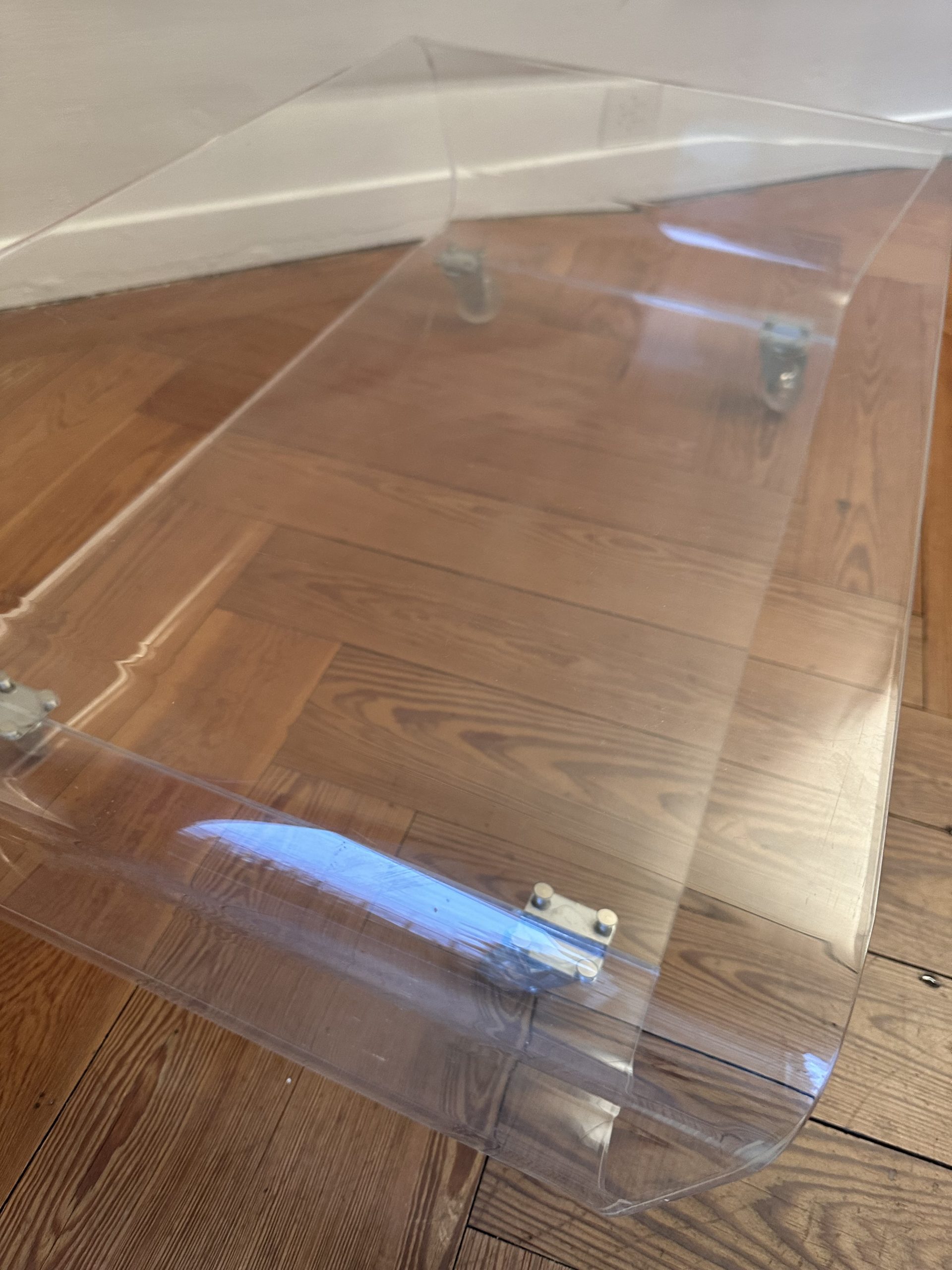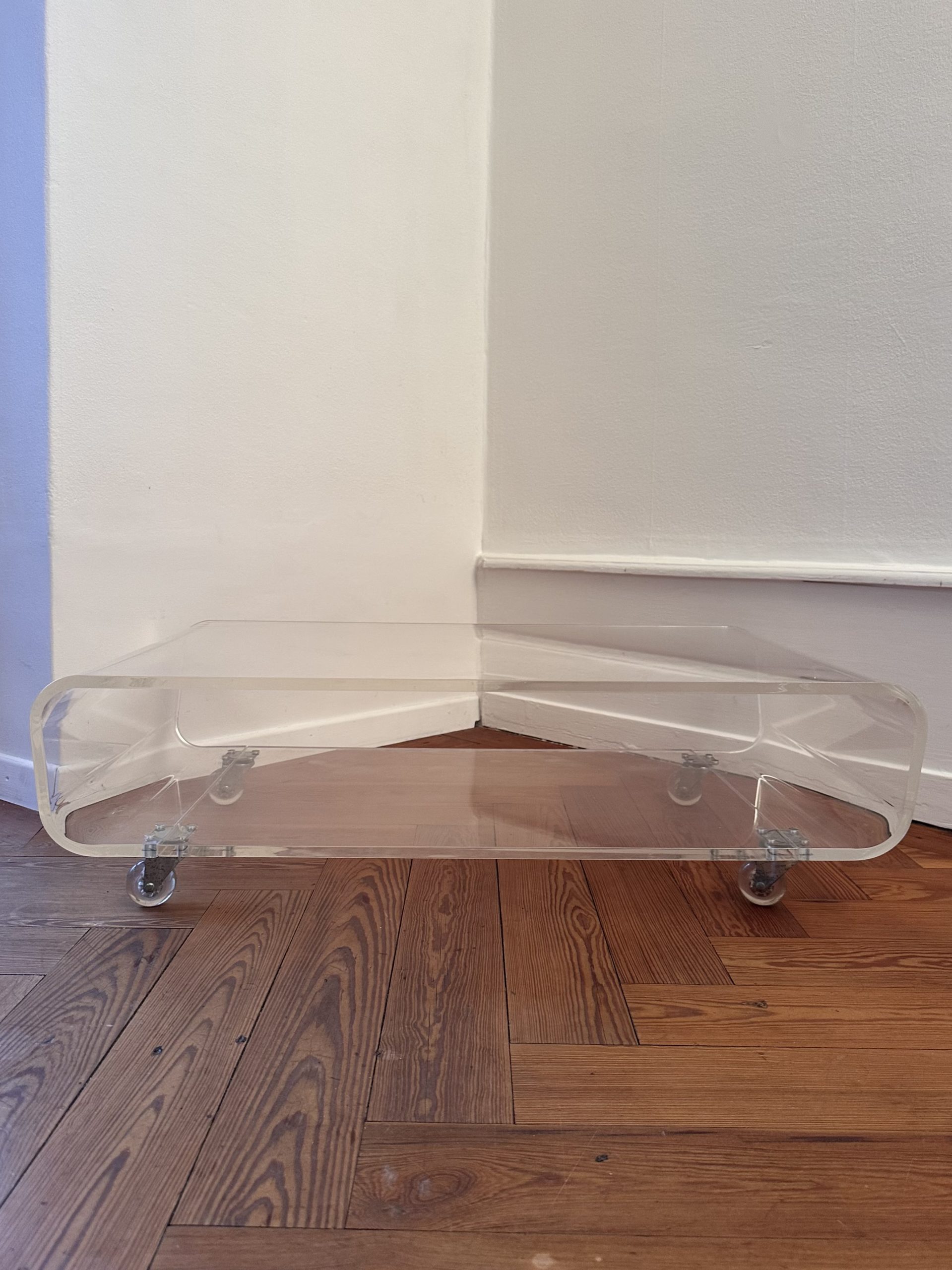 Table basse en plexiglas transparent, design moderniste tardif, datable des années 1970–1980.