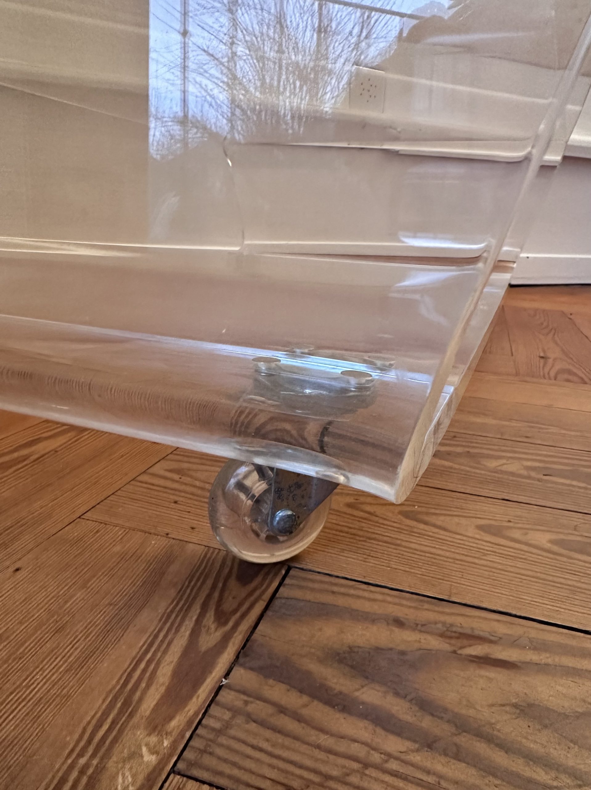 La composition repose sur un plateau principal aux courbes continues, posé sur une base rectangulaire discrète intégrant les roulettes. Cette articulation crée un équilibre visuel entre légèreté et stabilité, tout en conservant une lecture simple et fluide de l’objet. La transparence totale met en valeur les volumes, les épaisseurs de matière et le jeu des lignes sans alourdir l’ensemble.