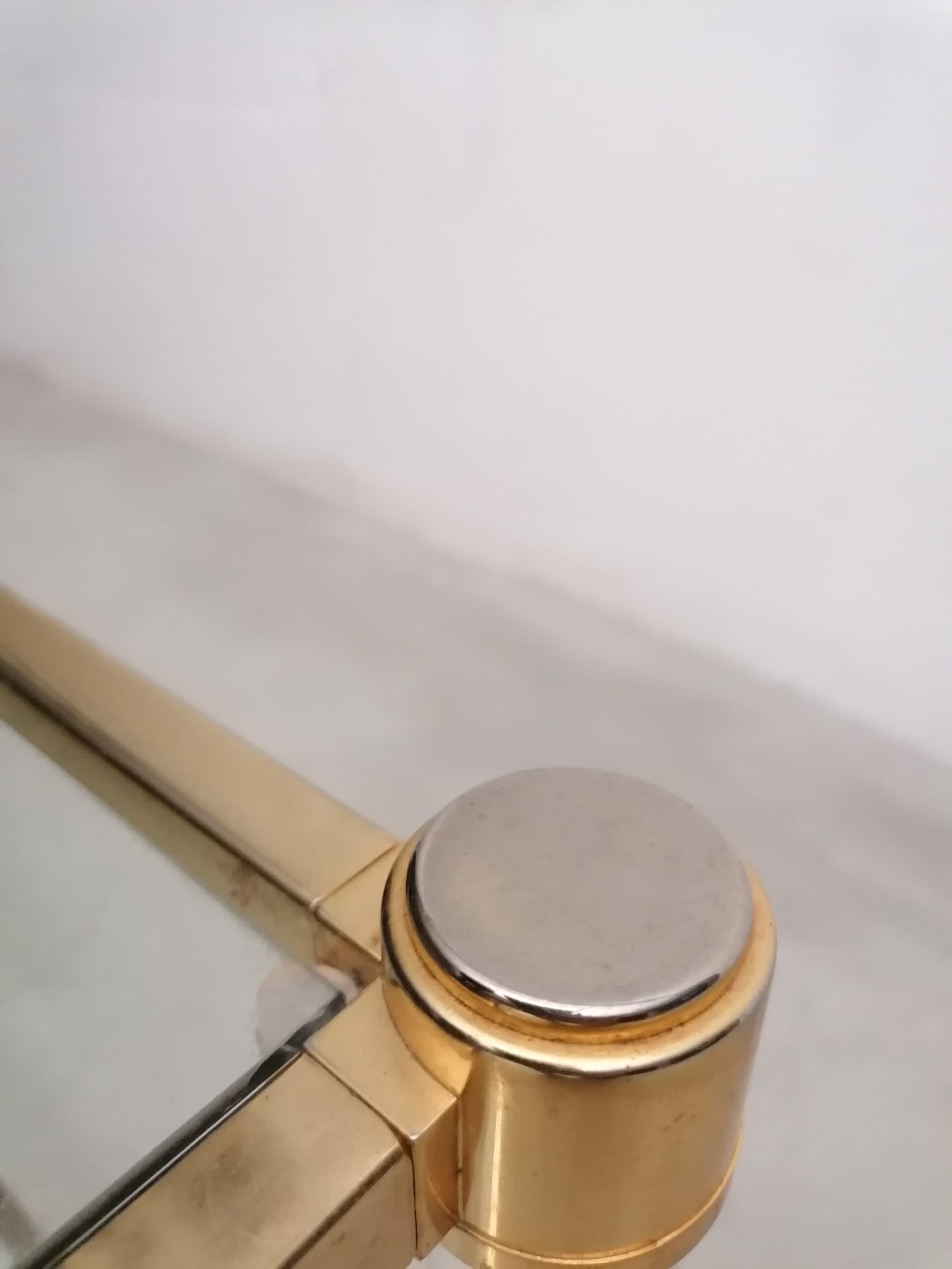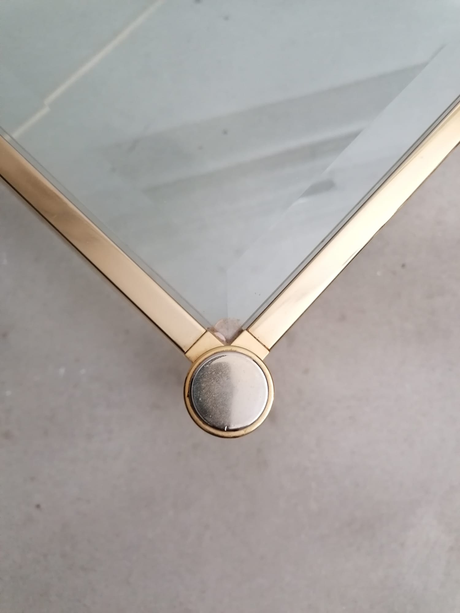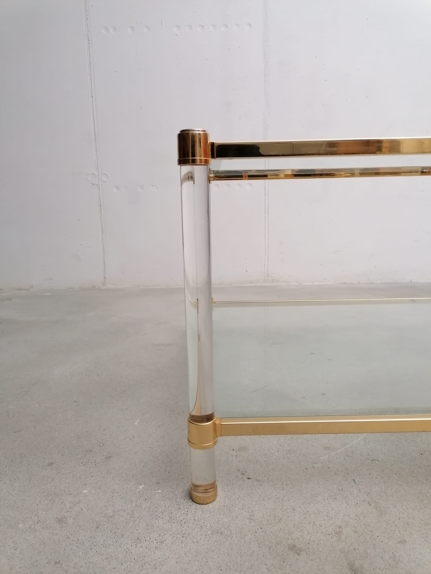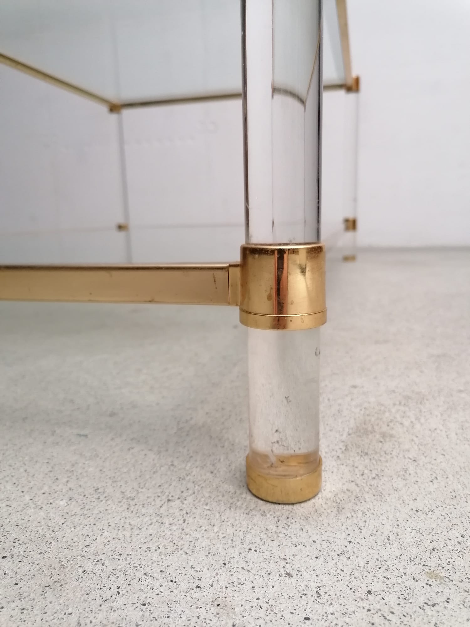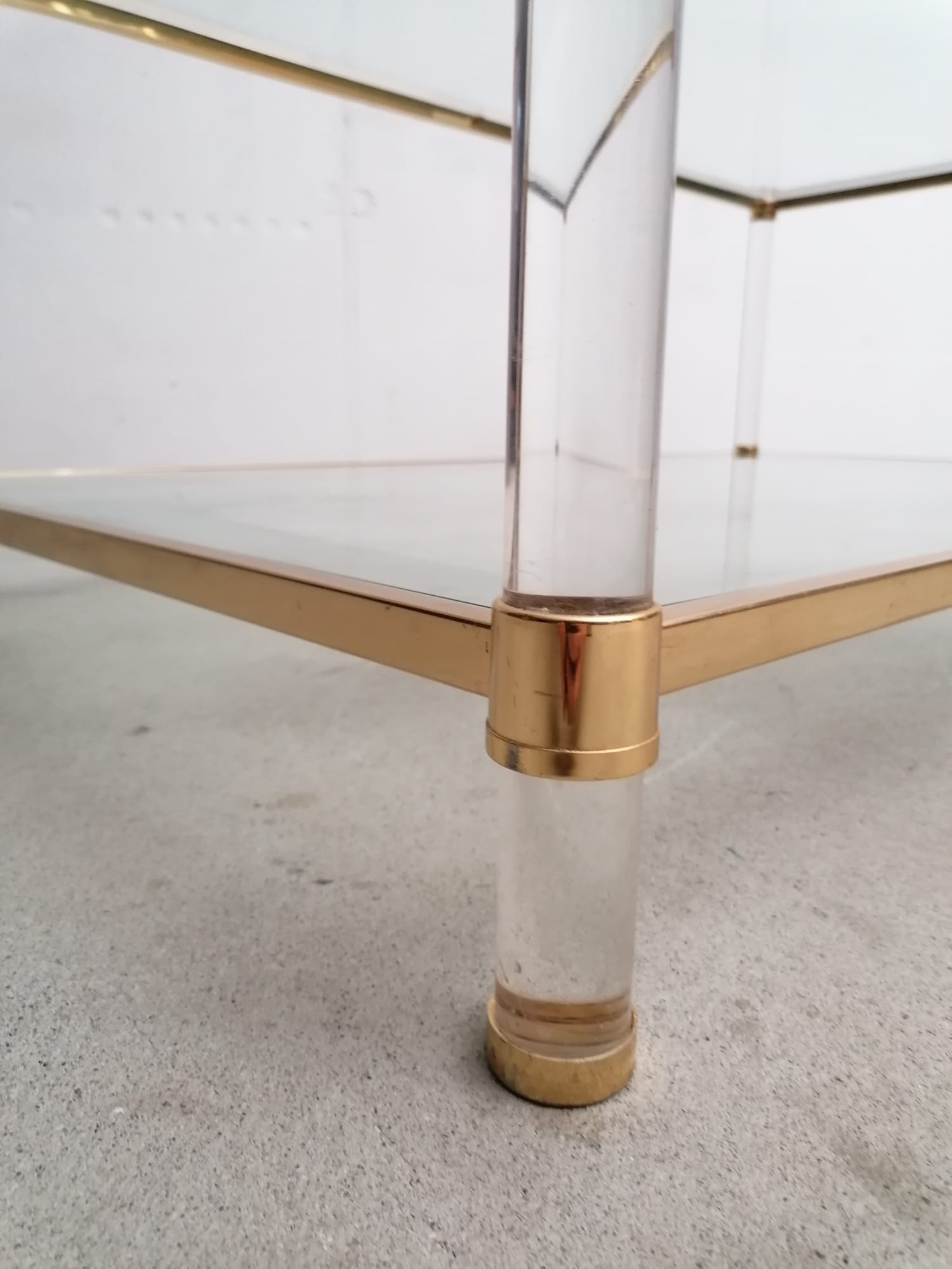 Produit venduSuperbe table basse avec structure en métal doré, pieds en plexiglass et plateau en verre.