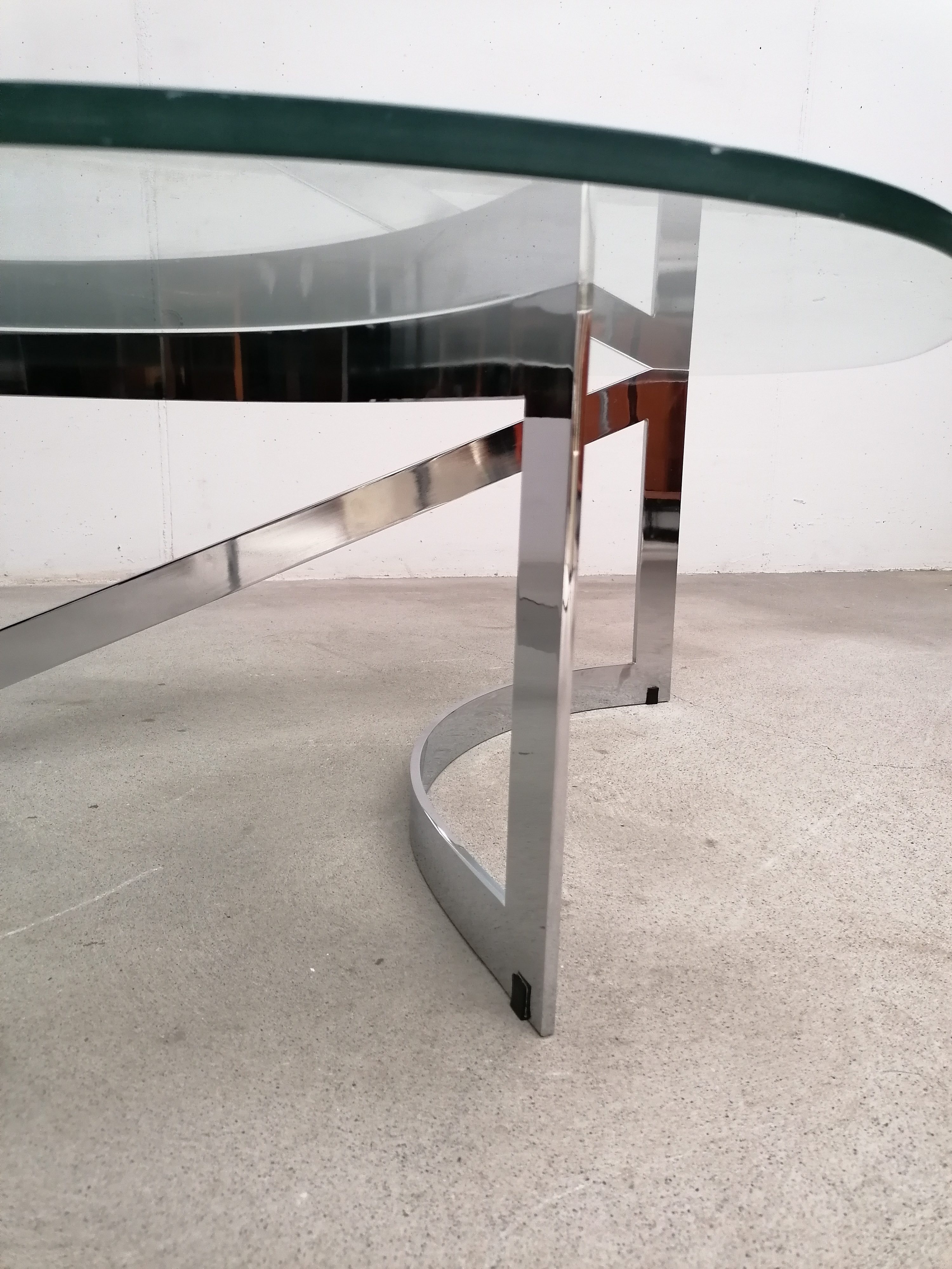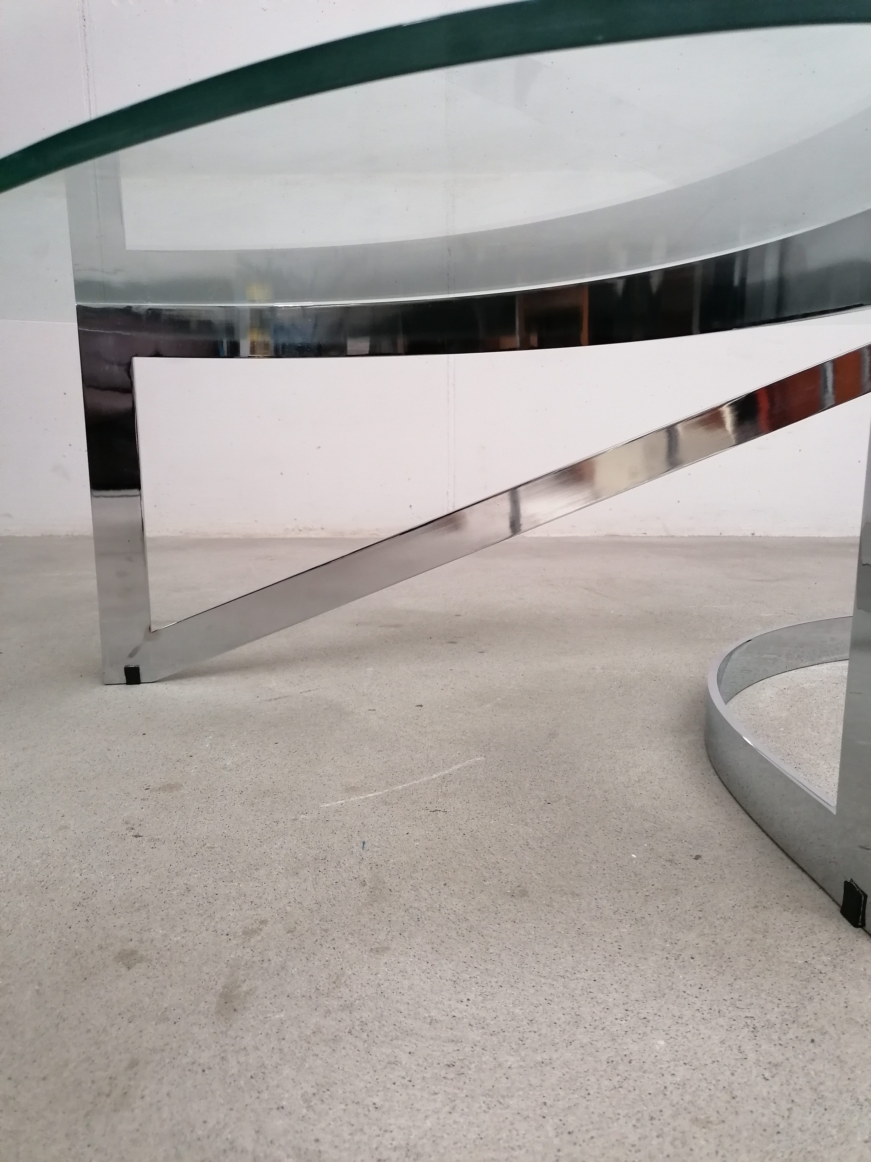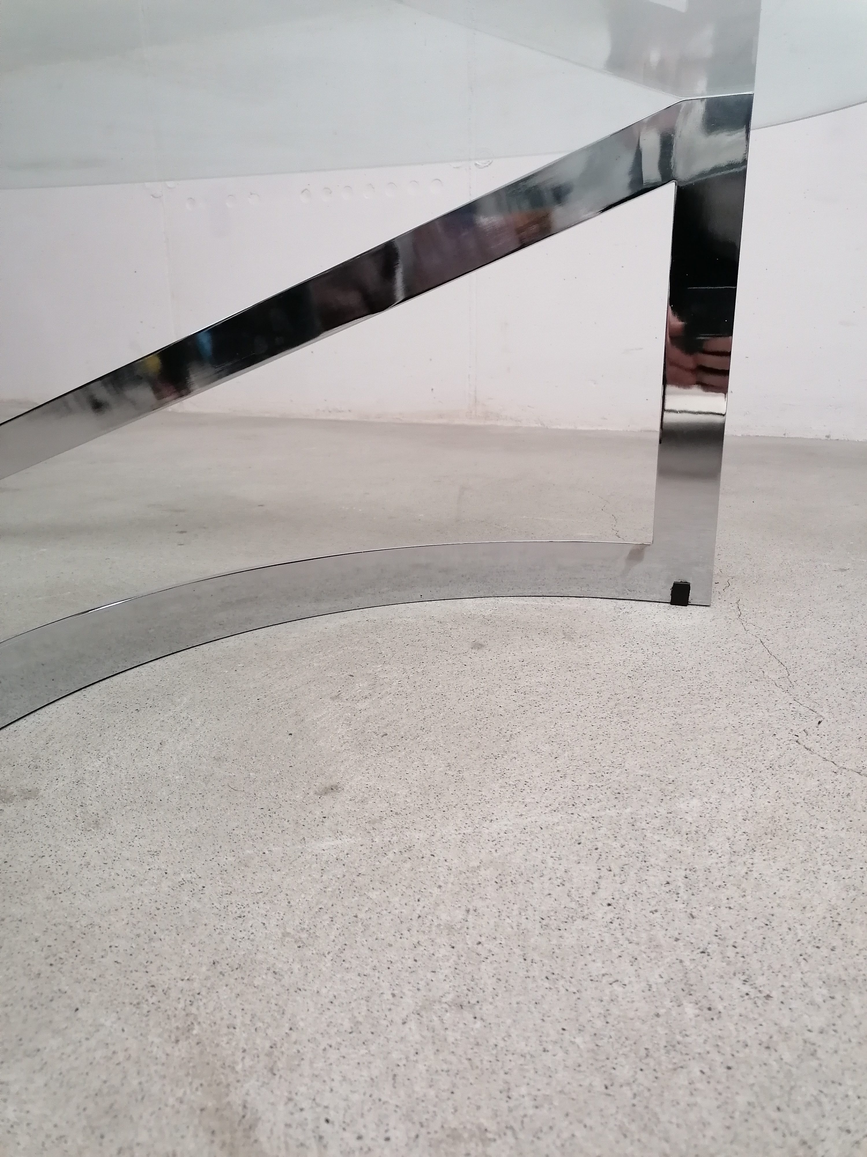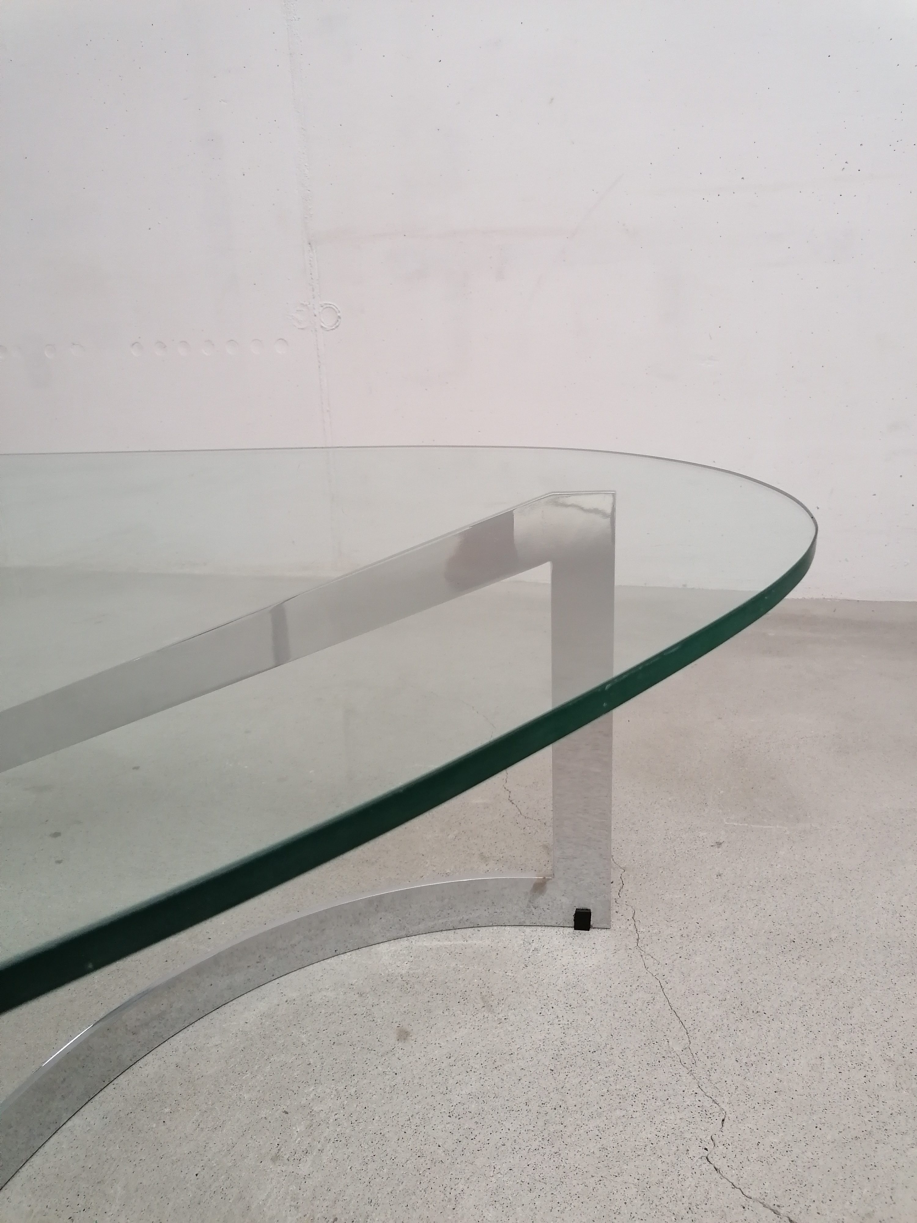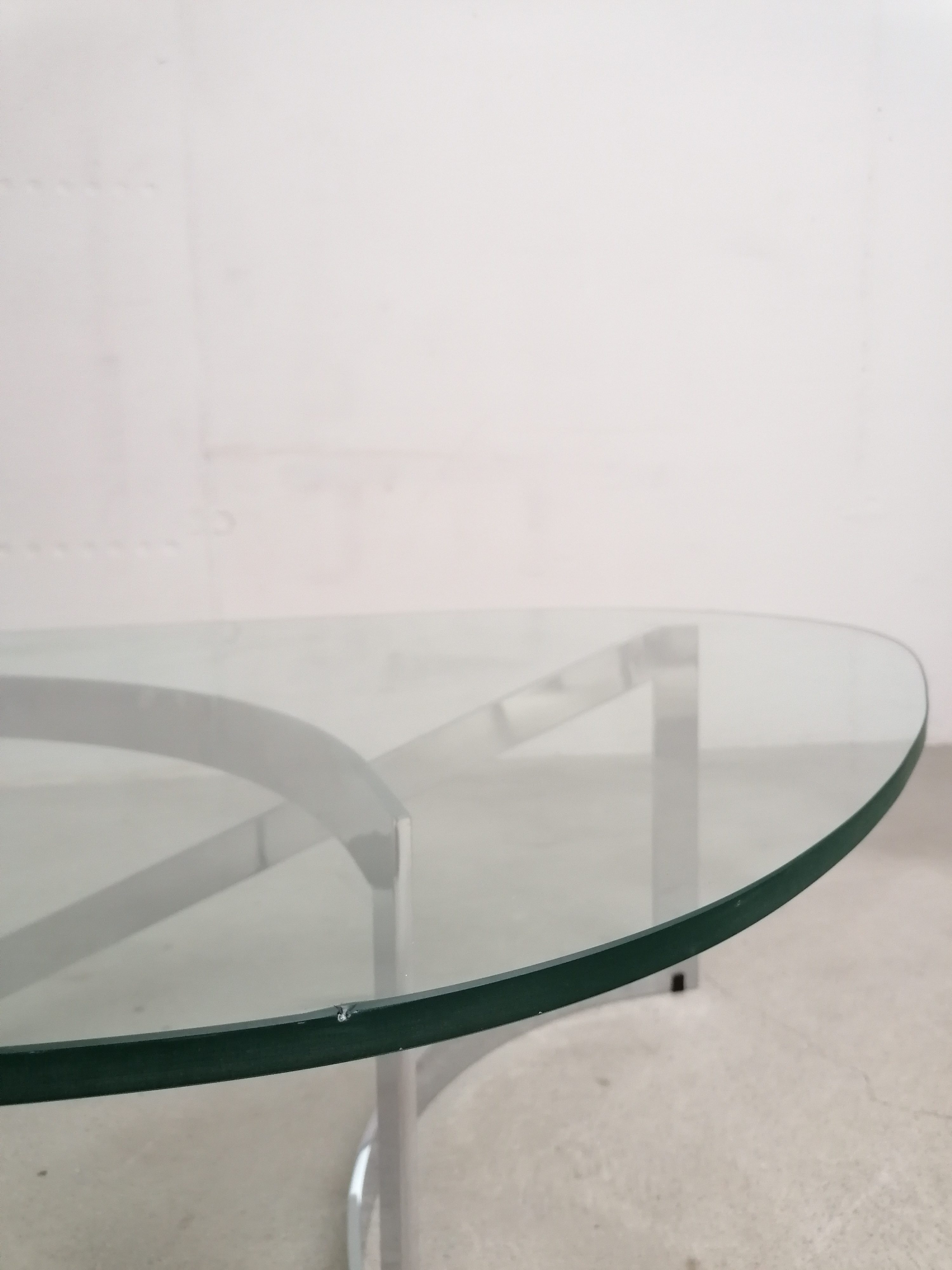 Produit venduTable basse constituée d’un piètement en lame d’acier chromé et d’un plateau en verre. Un petit éclats très discret est présent en bordure du verre. Quelques légères traces d’usage sur le verre. Plateau assez lourd.